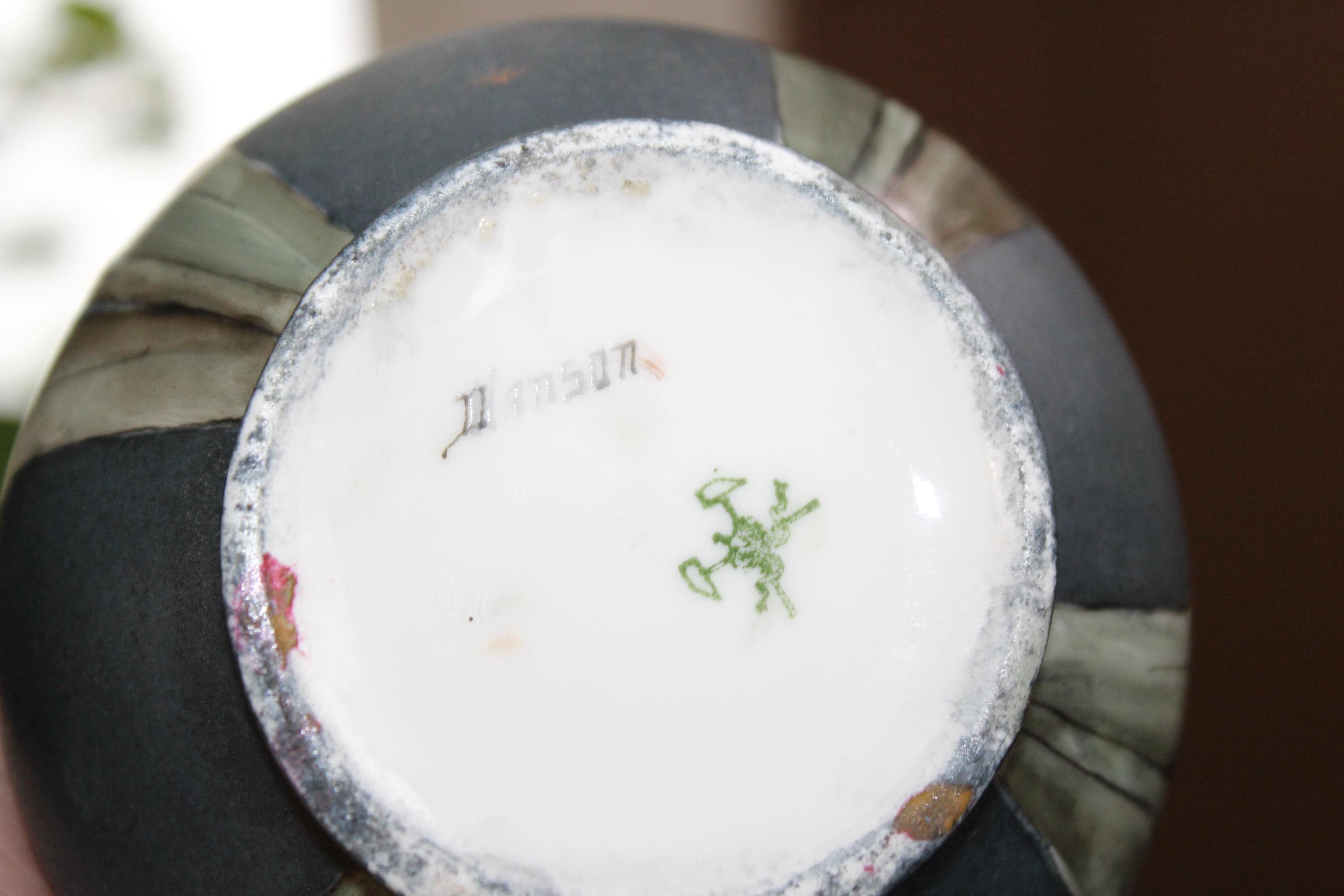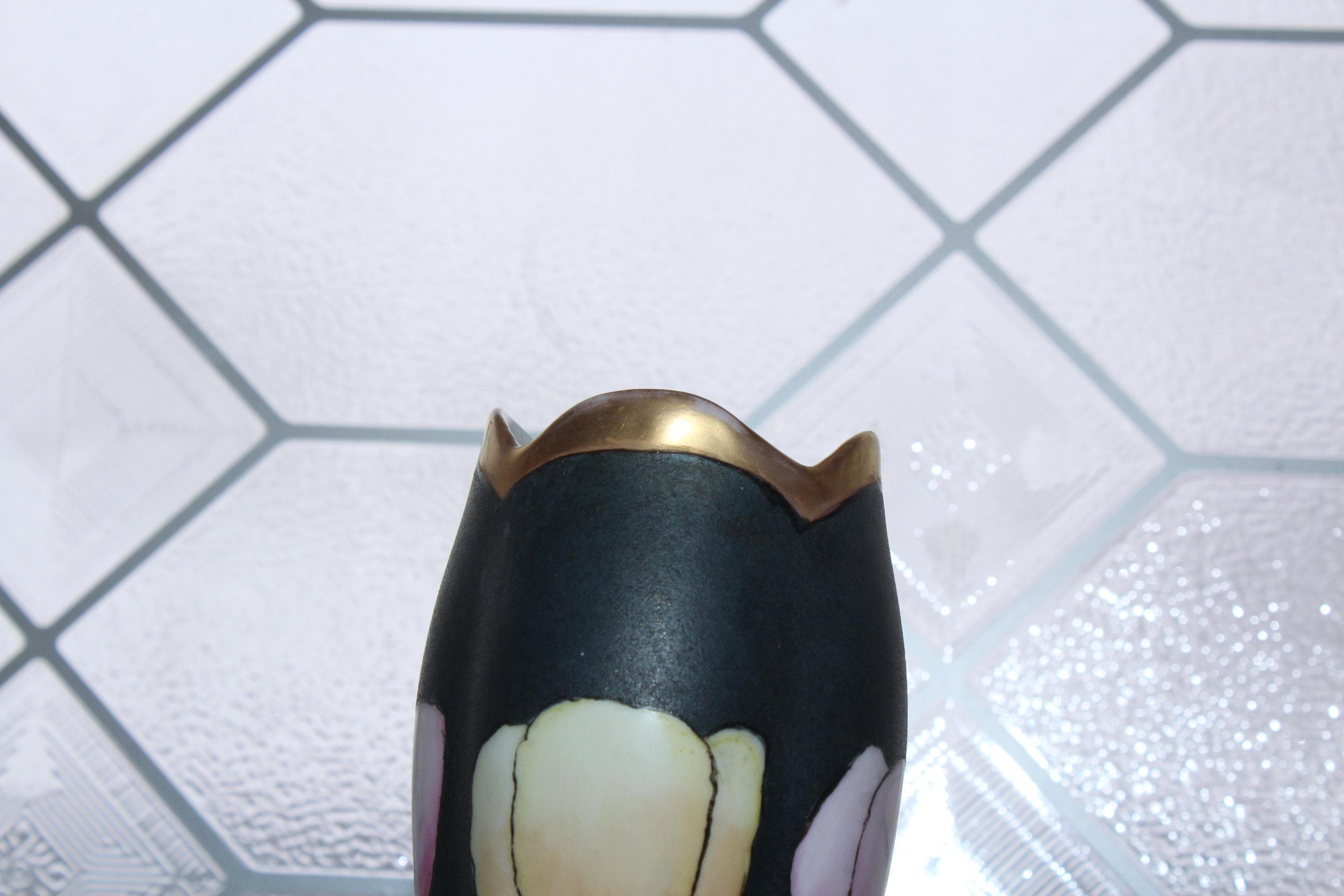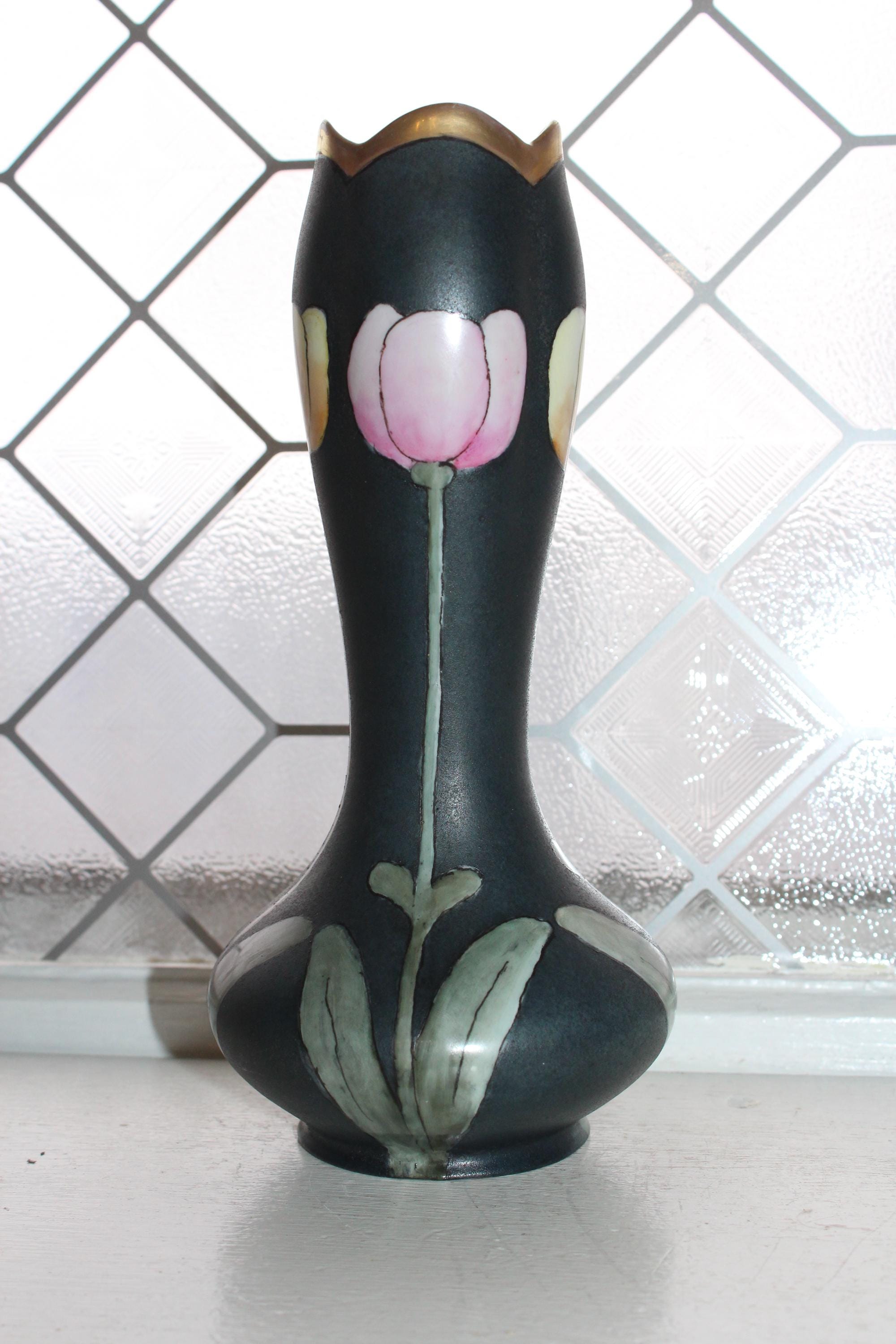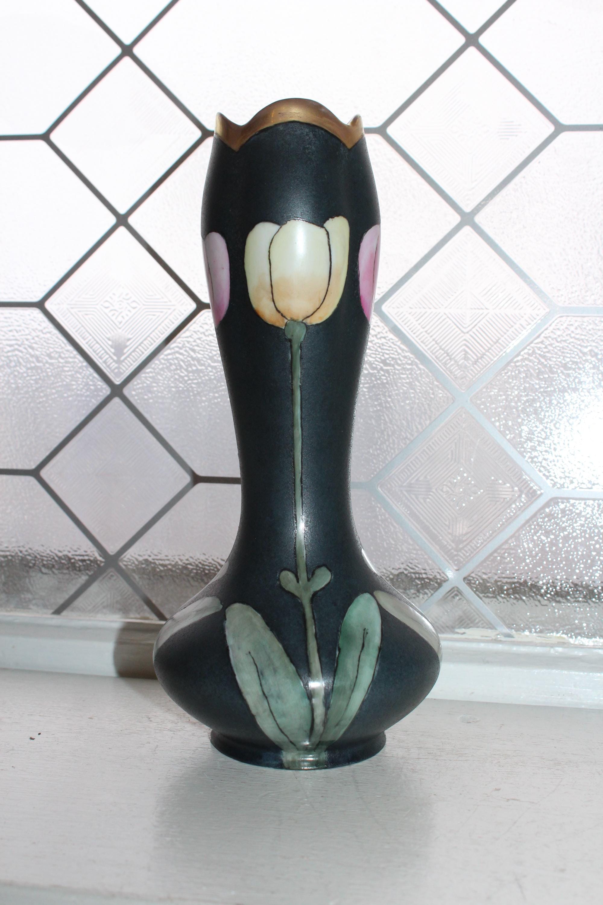 Scarce antique 19th century Art Nouveau Czech Fischer & Mieg Pirkenhammer pottery vase, hand painted with pink and yellow tulips on a black matte glaze base, artist signed Hanson. It is in excellent condition, measures 8 1/2" high and has no chips or cracks. Enjoy!