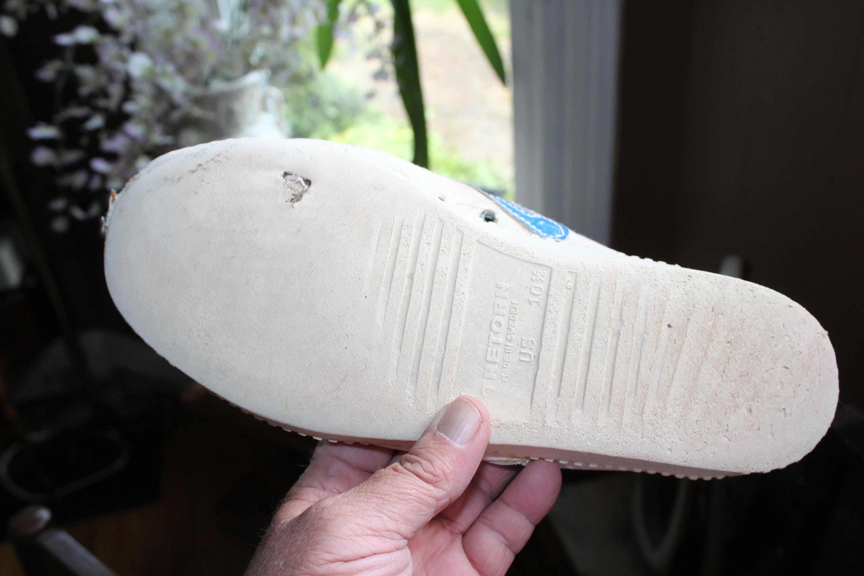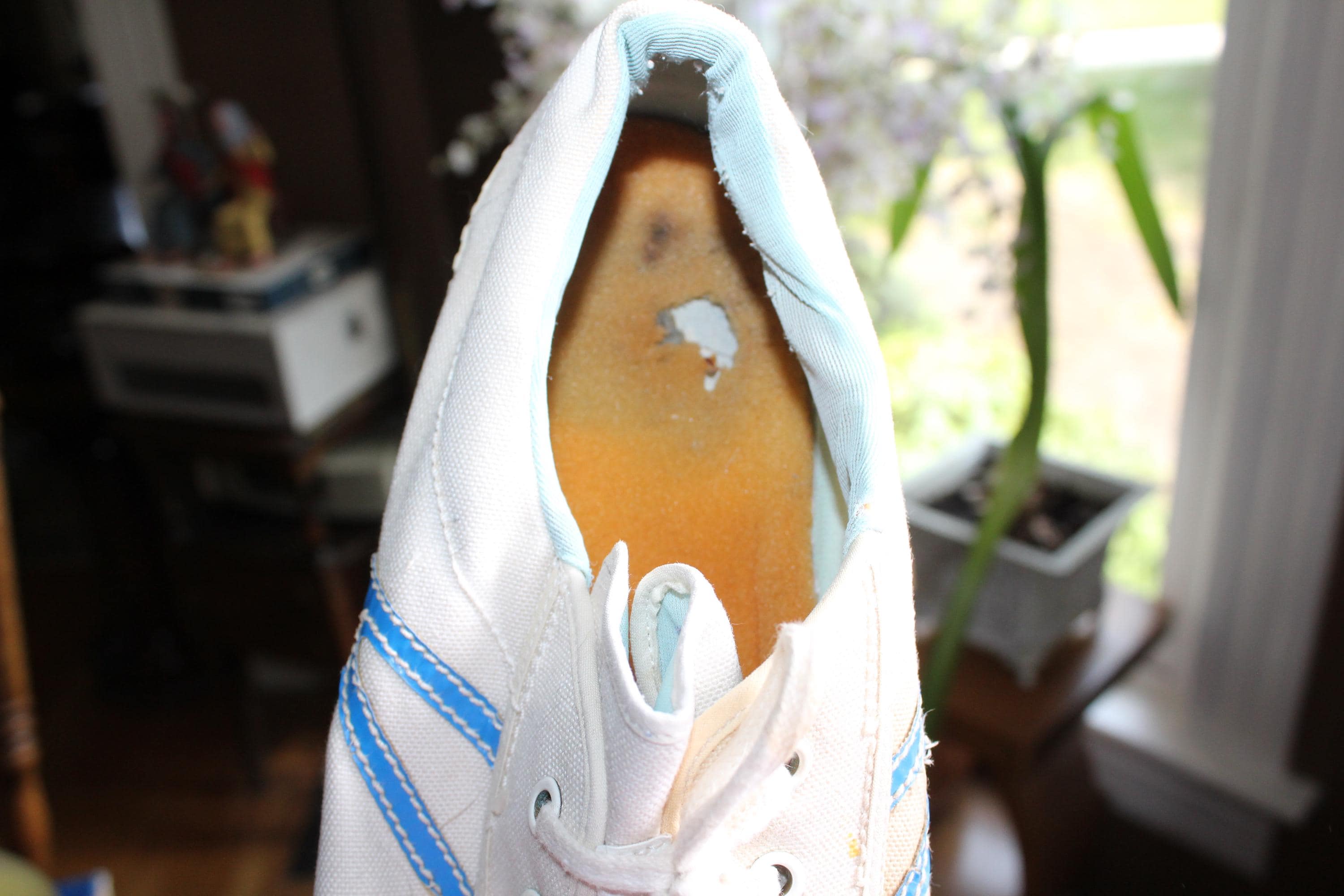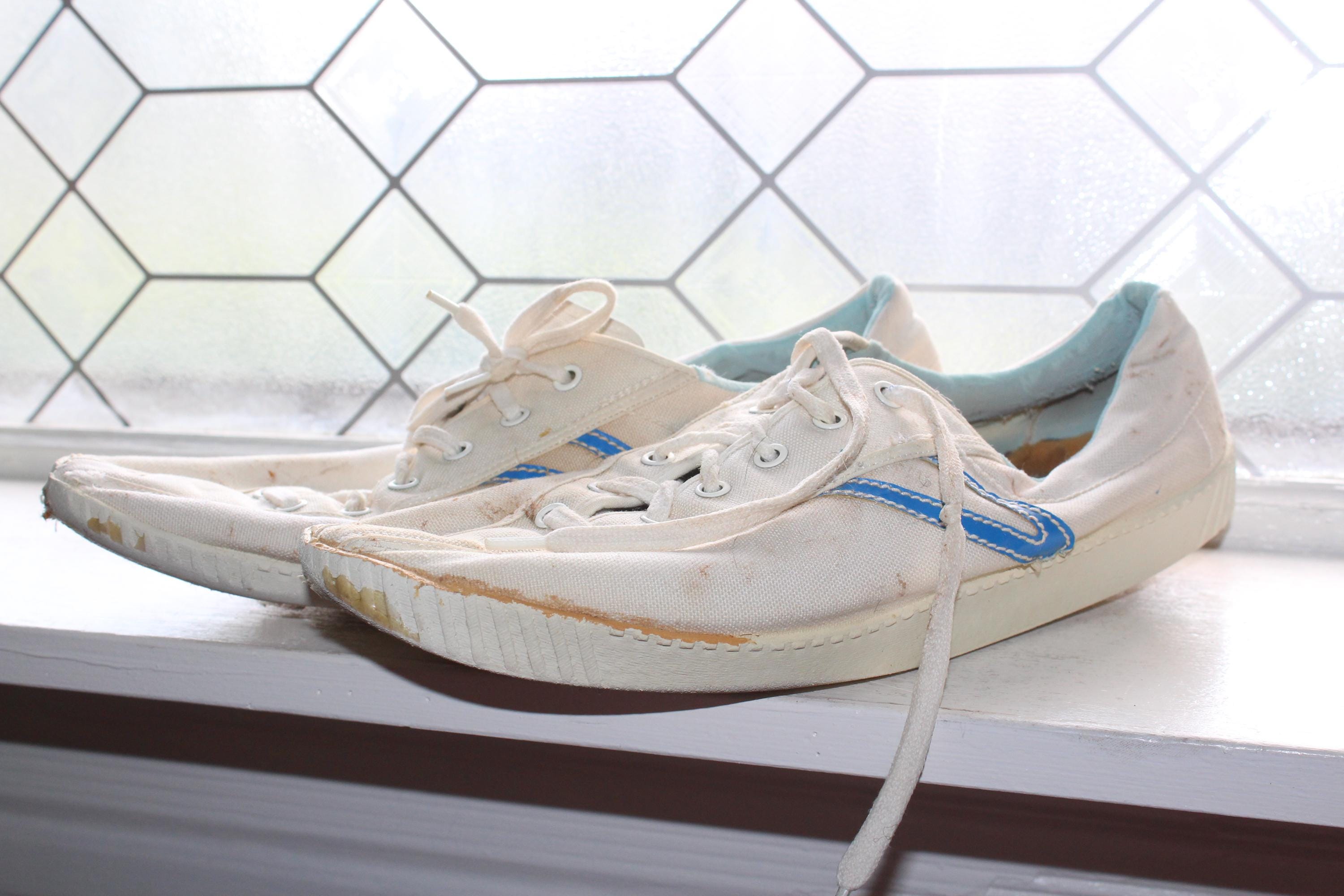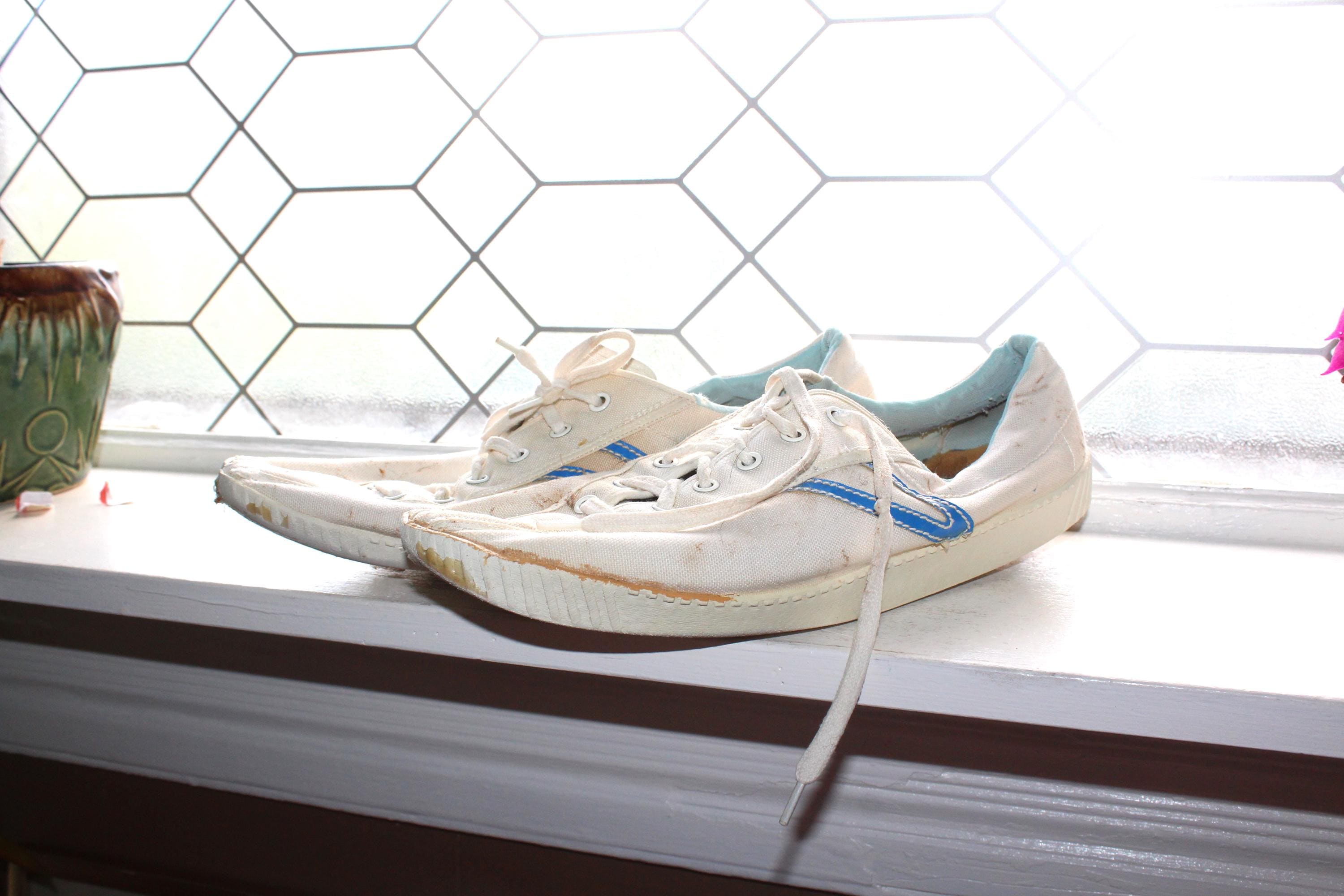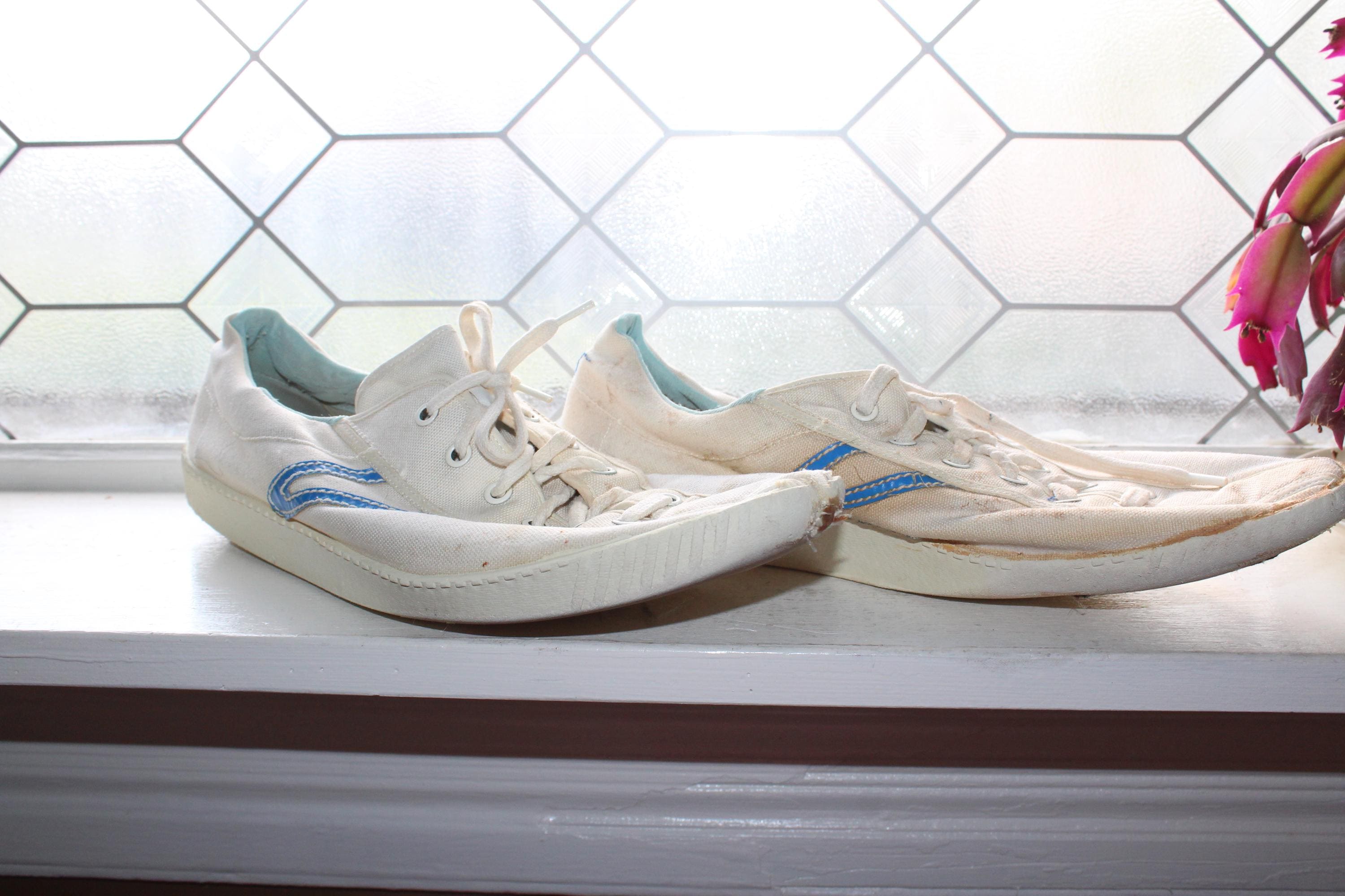 Vintage Tretorn Nylite men's white canvas sneakers with blue, size 10 1/2, in poor condition. I just love the look of these shoes! Lots of wear as shown in the photos. Enjoy!