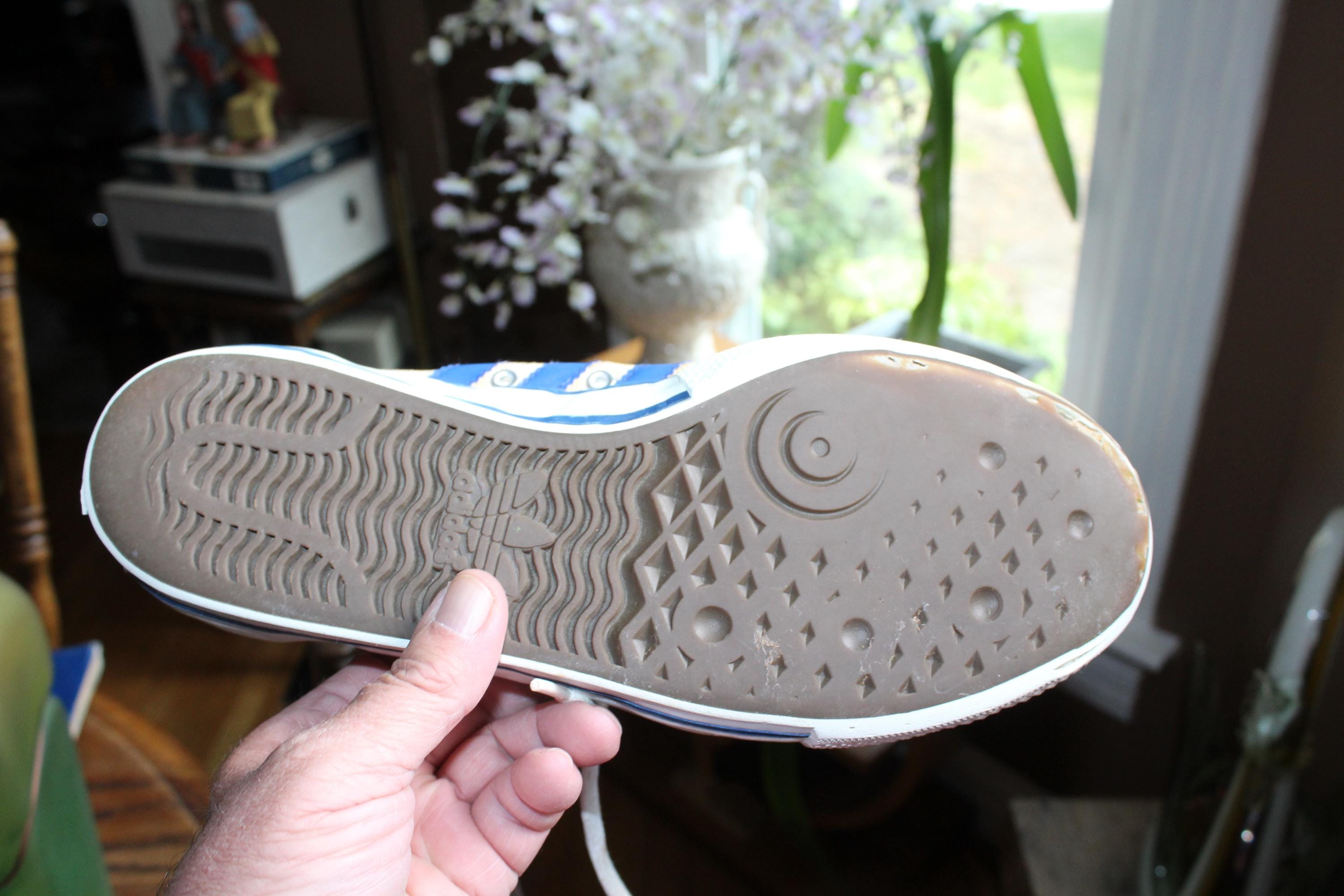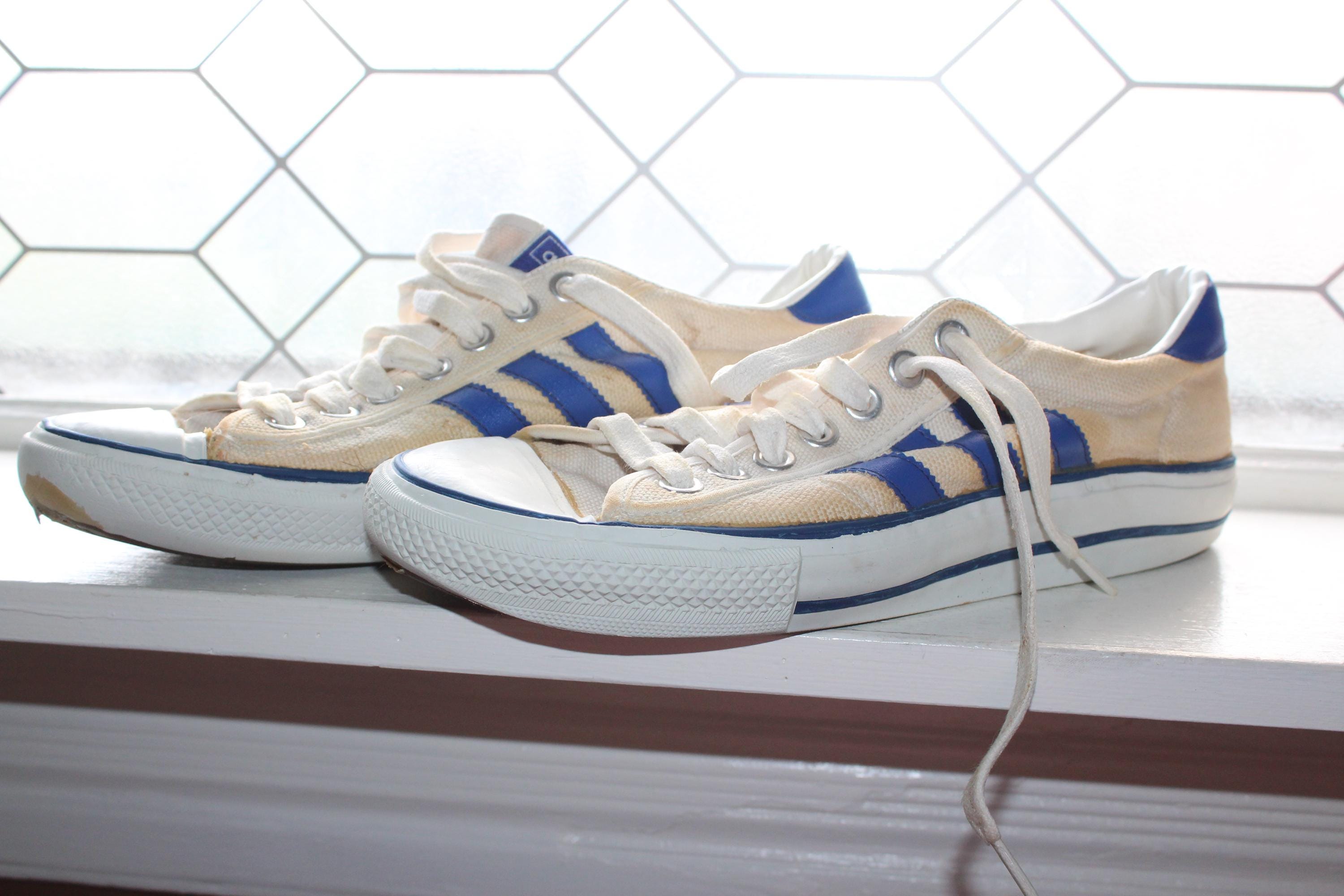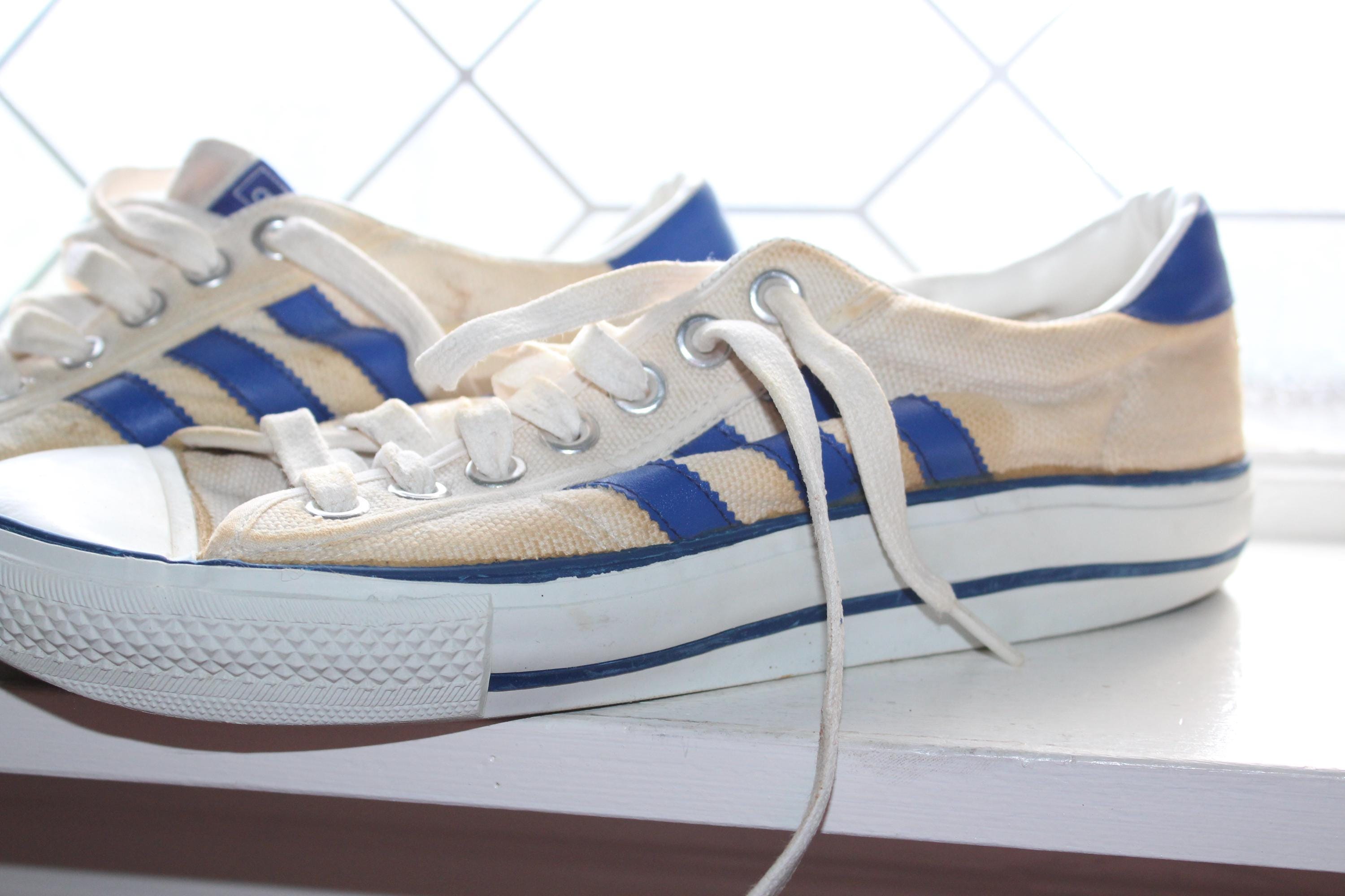This is a pair of vintage 1970s Adidas Shooting Star low-top canvas sneakers with blue stripes, size 10 1/2, in fair condition. I just love the look of these shoes! Lots of wear as shown in the photos. Enjoy!