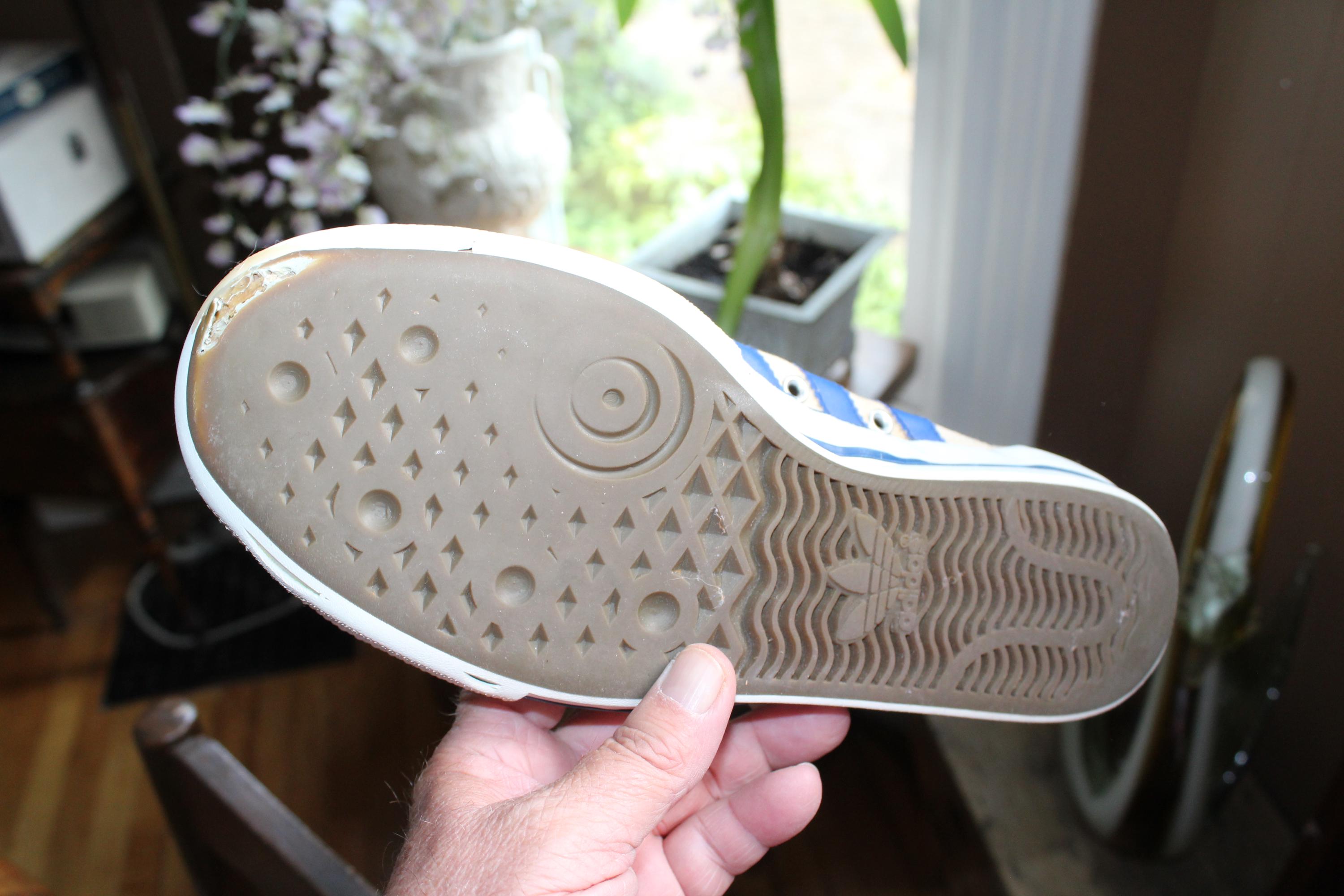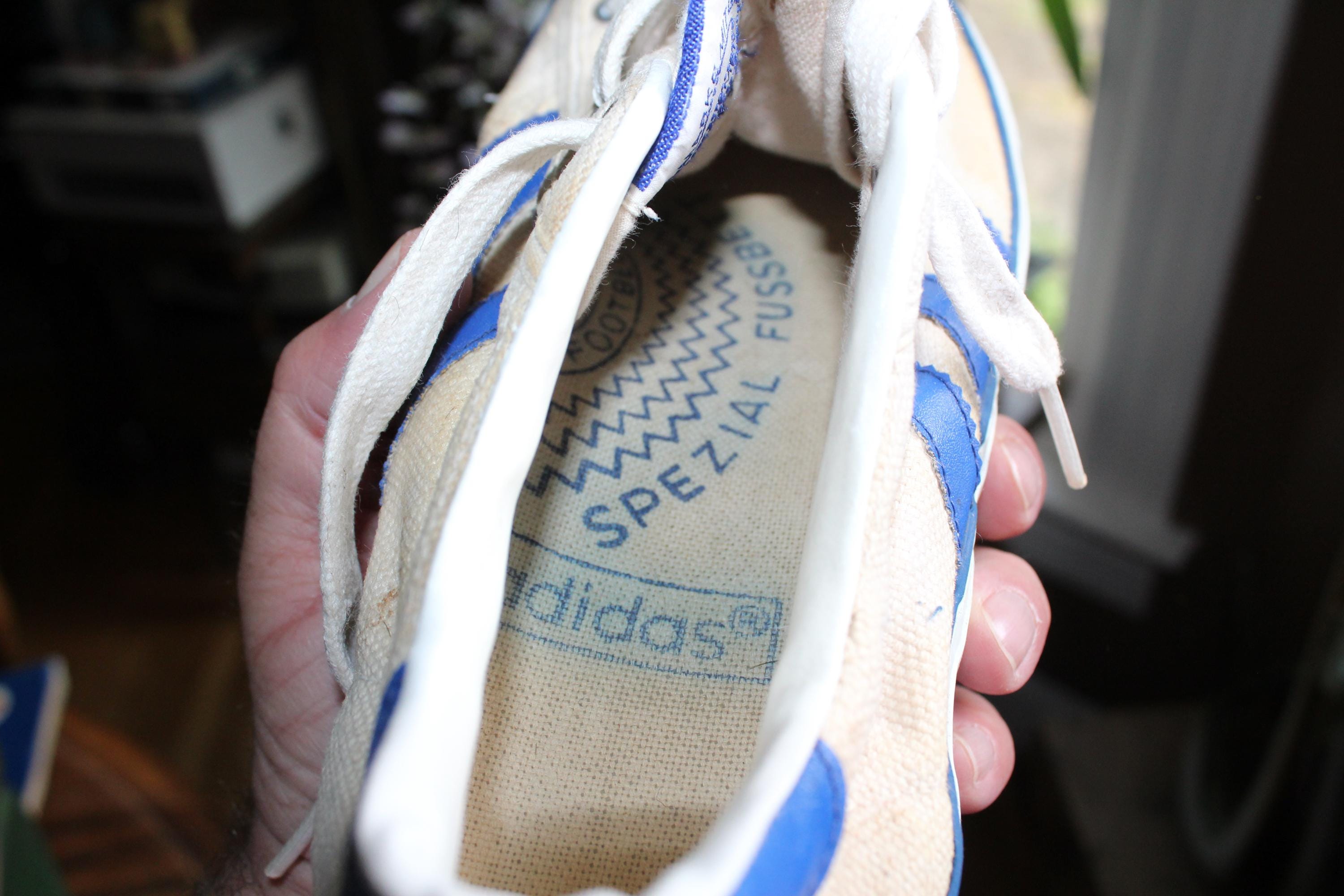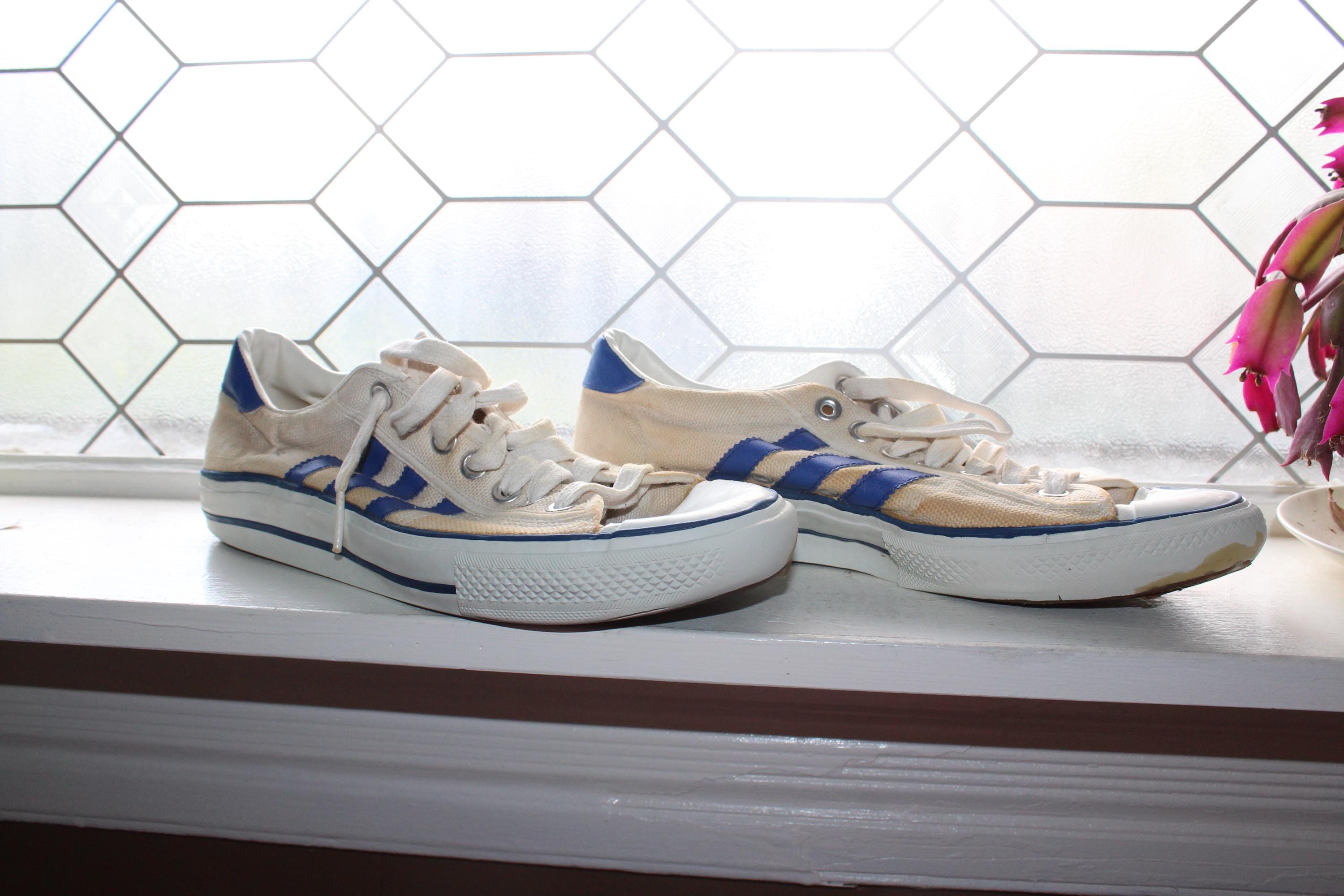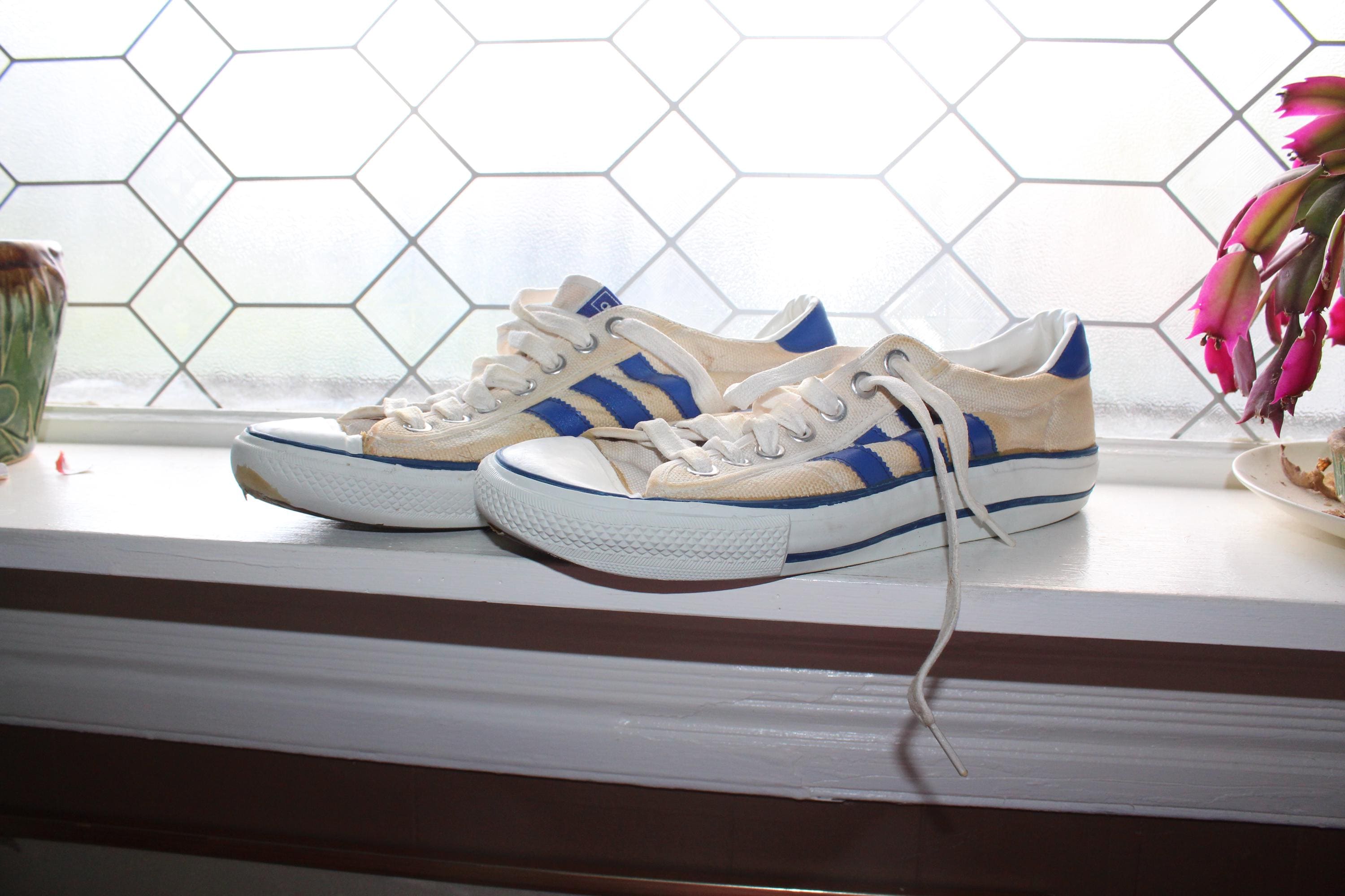This is a pair of vintage 1970s Adidas Shooting Star low-top canvas sneakers with blue stripes, size 10 1/2, in fair condition. I just love the look of these shoes! Lots of wear as shown in the photos. Enjoy!