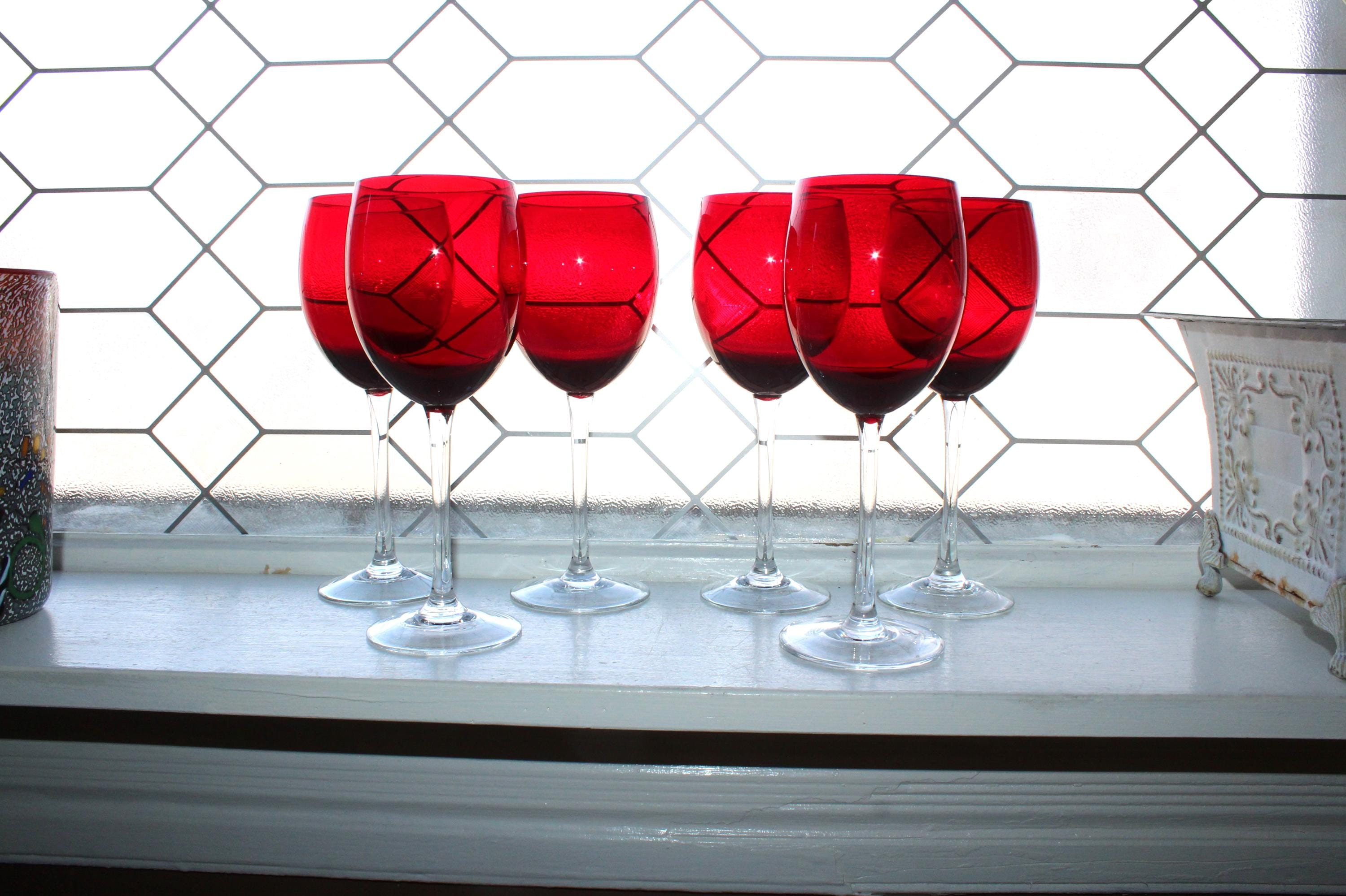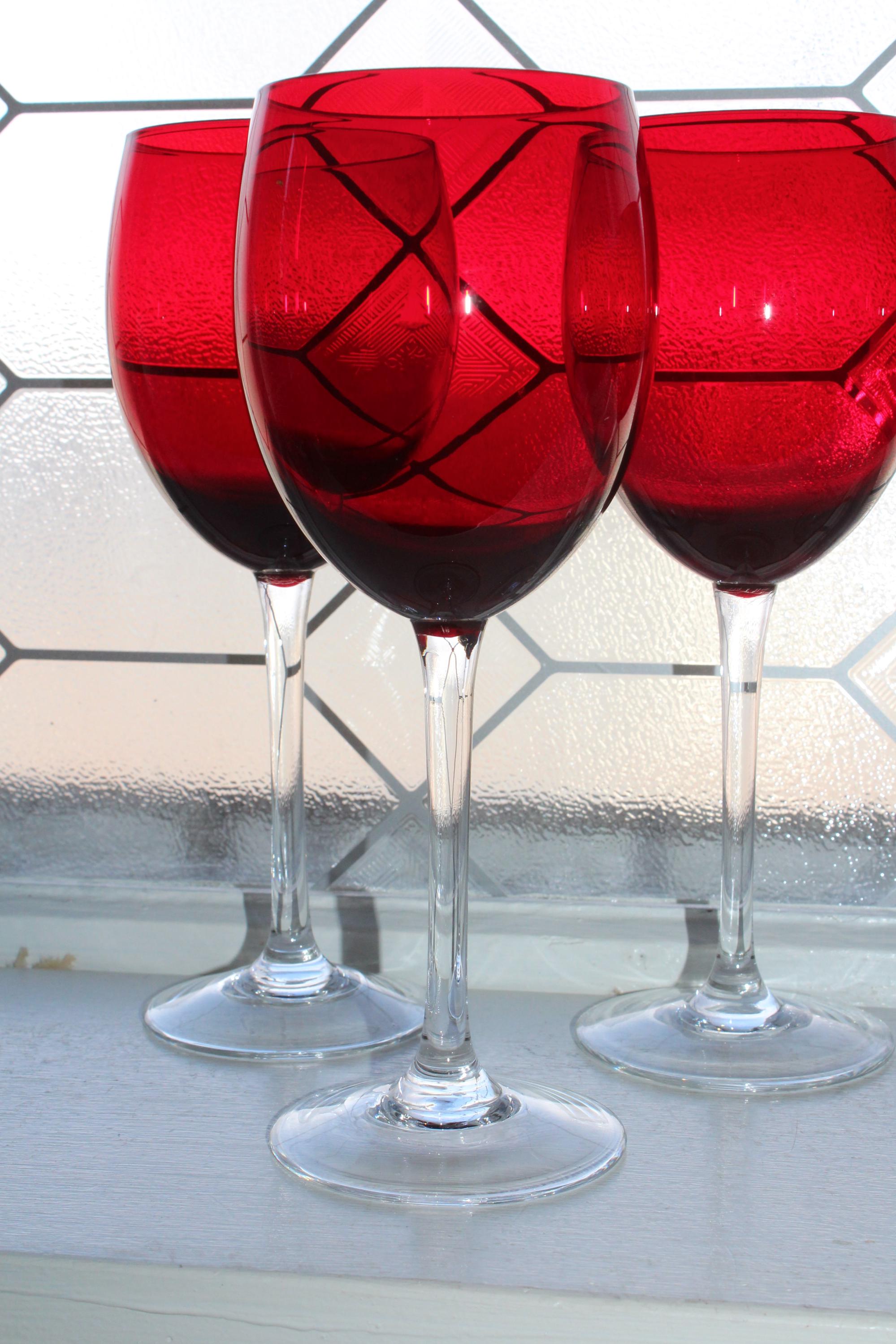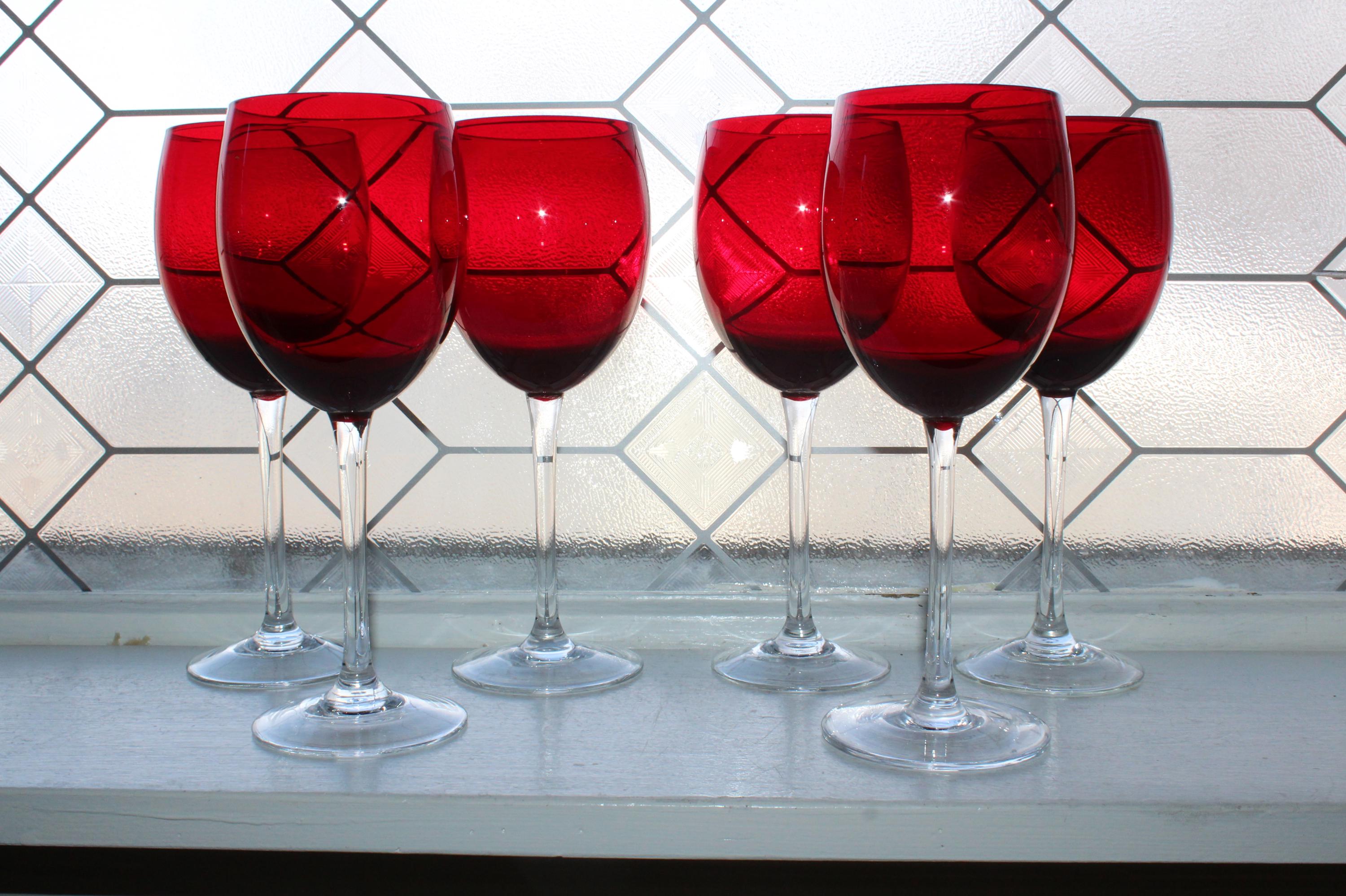 Set of 6 vintage holiday ruby red with clear stem wine glasses, in excellent condition. Each one measures 8 1/2" high. No chips or cracks, perfect for use or display. I also have a set of 4 available in a separate listing. Enjoy!