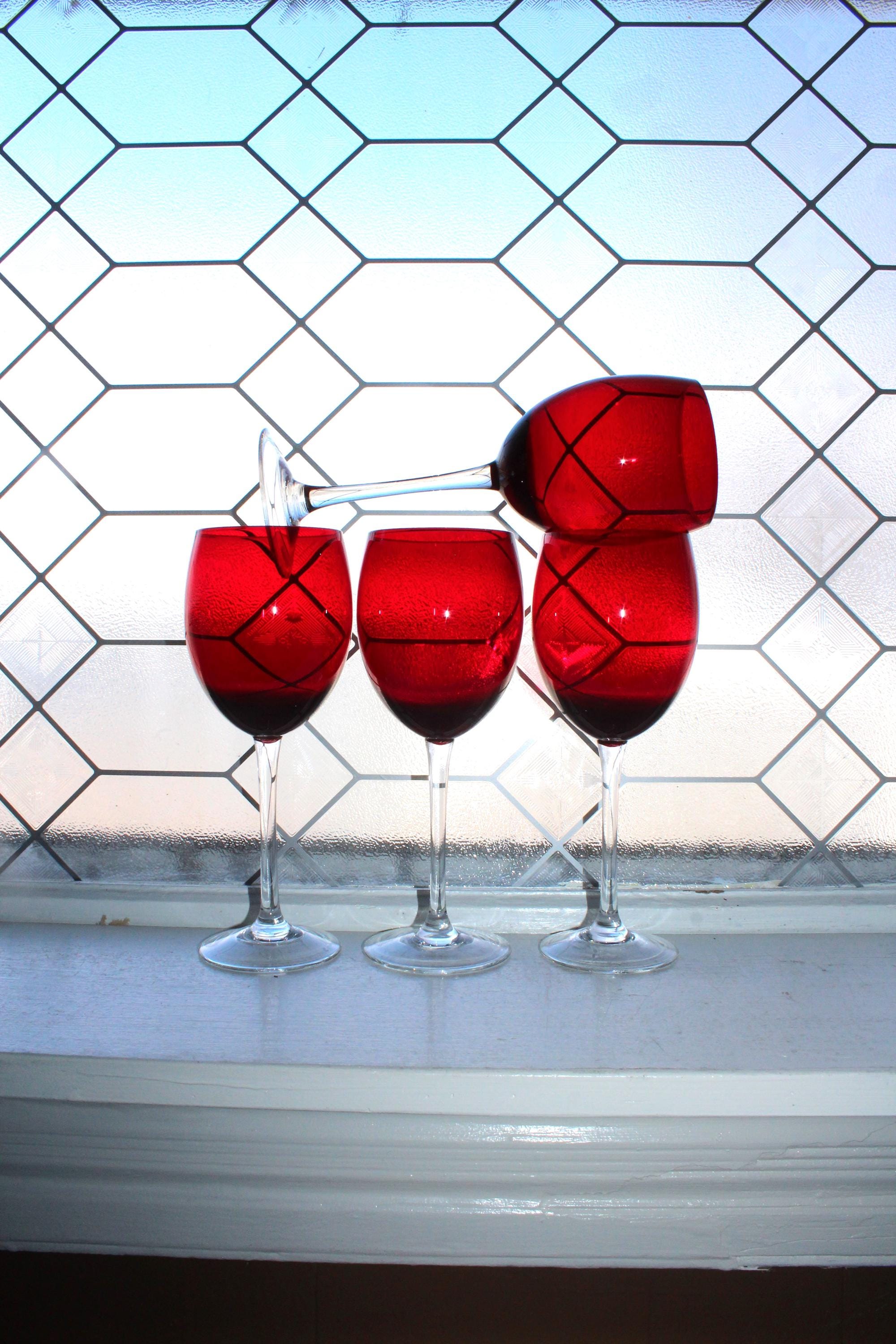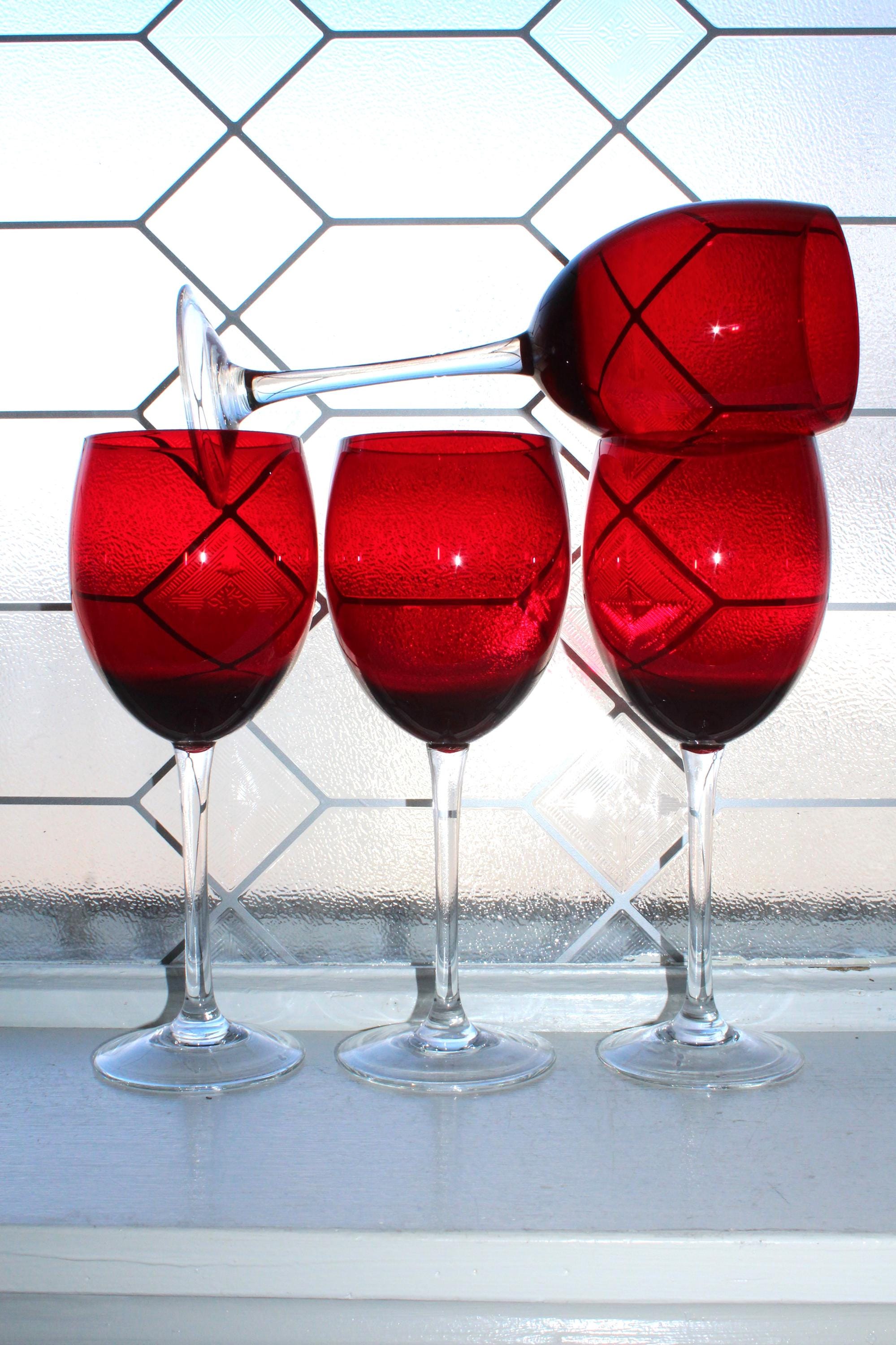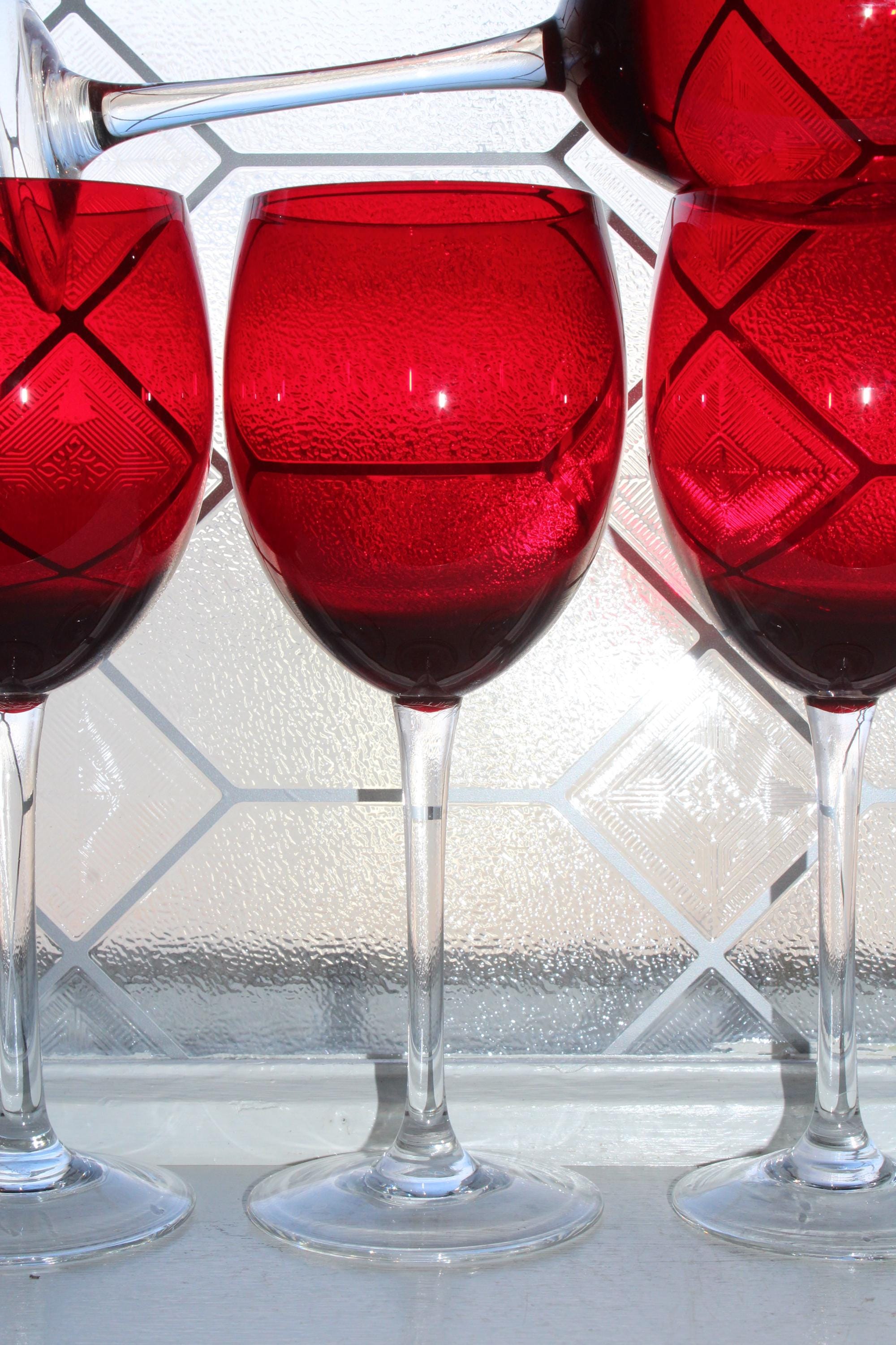 Set of 4 vintage holiday ruby red with clear stem wine glasses, in excellent condition. Each one measures 8 1/2" high. No chips or cracks, perfect for use or display. I also have a set of 6 available in a separate listing. Enjoy!