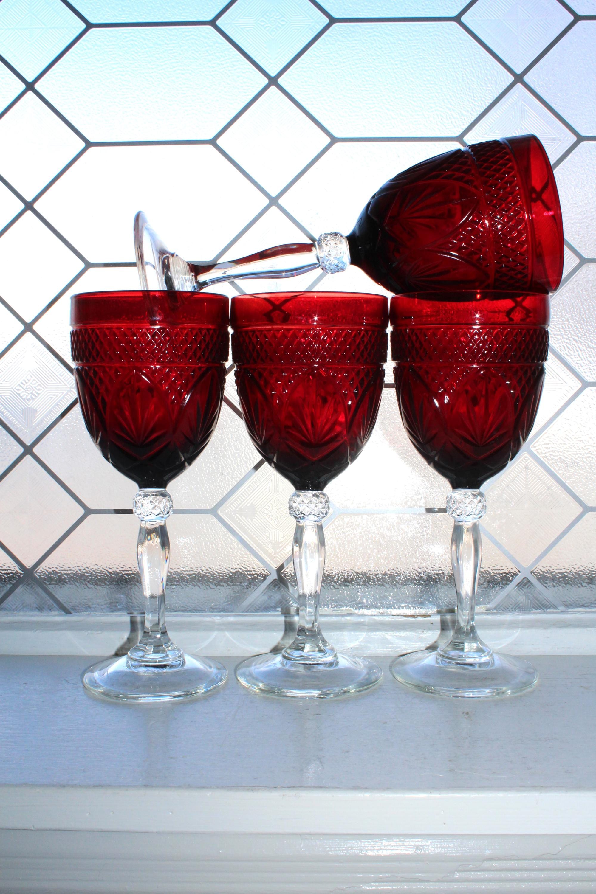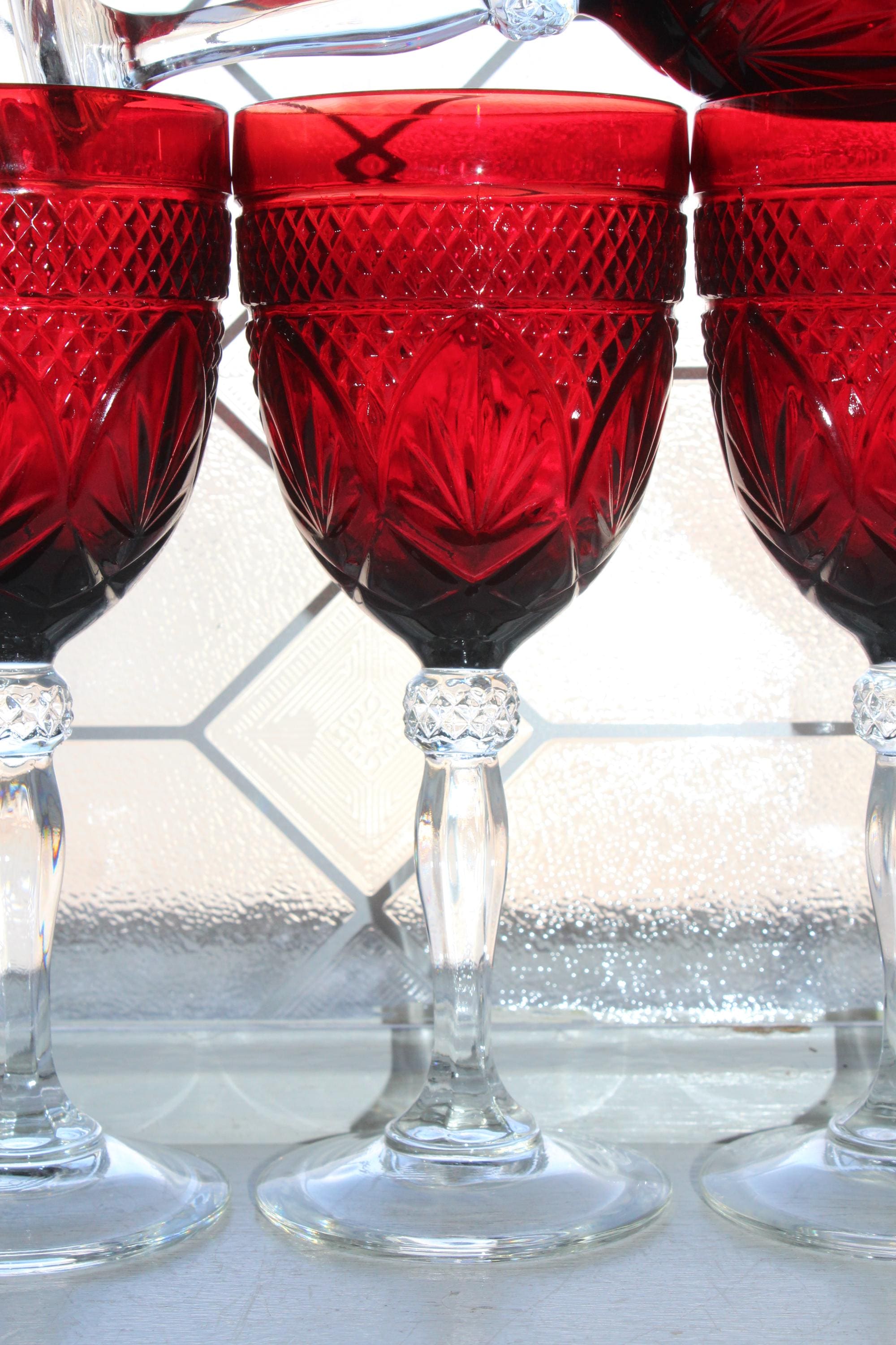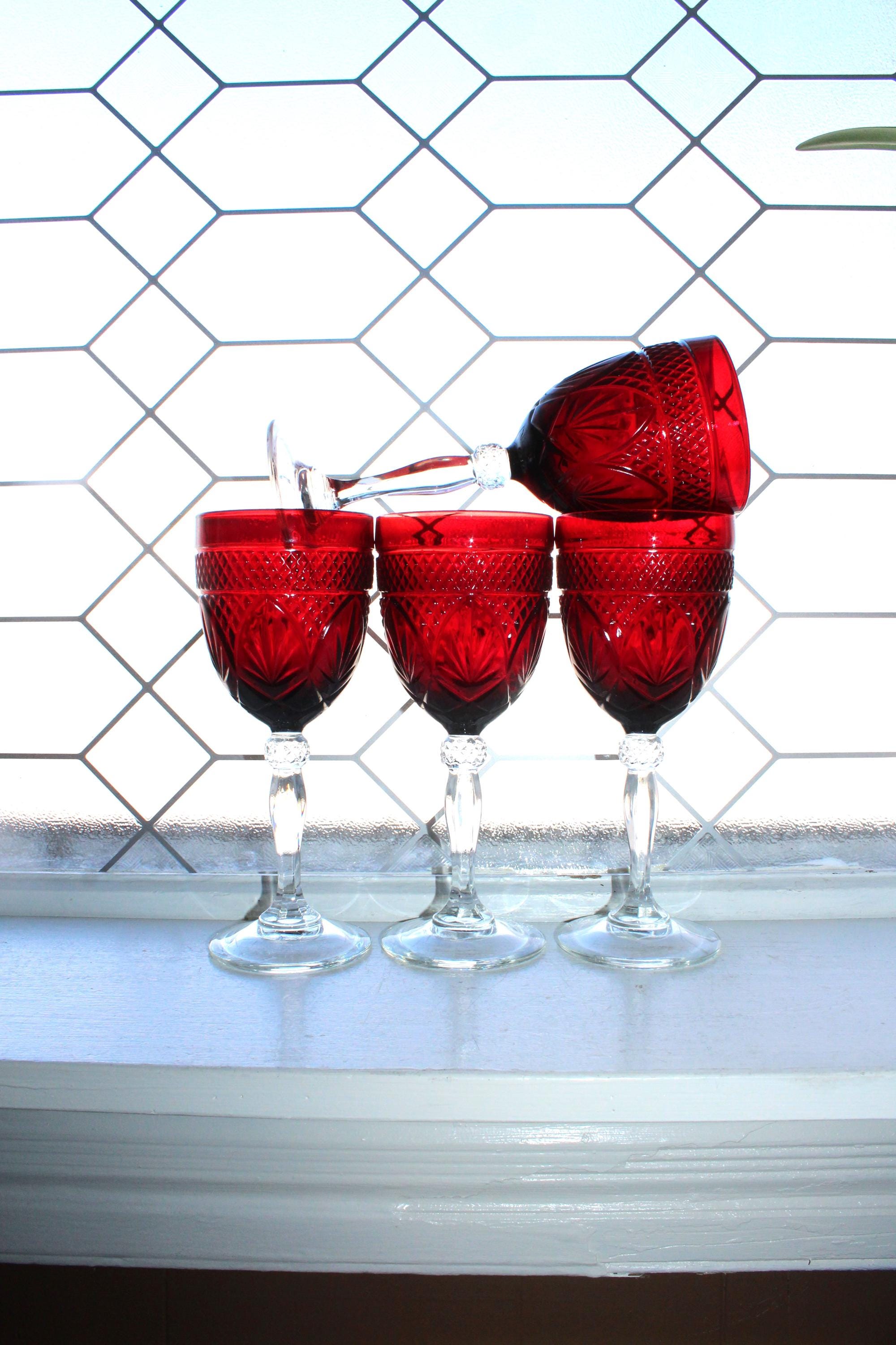 Set of 4 vintage Cristal d'Arques Durand gothic Antique Ruby red wine or water goblets, in excellent condition. Each one measures 8" high. THERE ARE 3 SETS OF 4 AVAILABLE VIA THE DROP DOWN BOX. Enjoy!