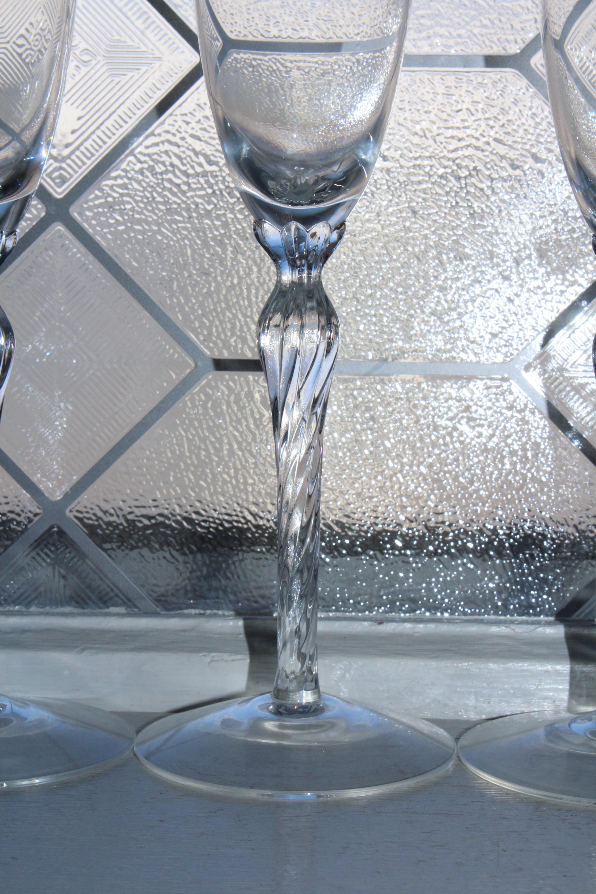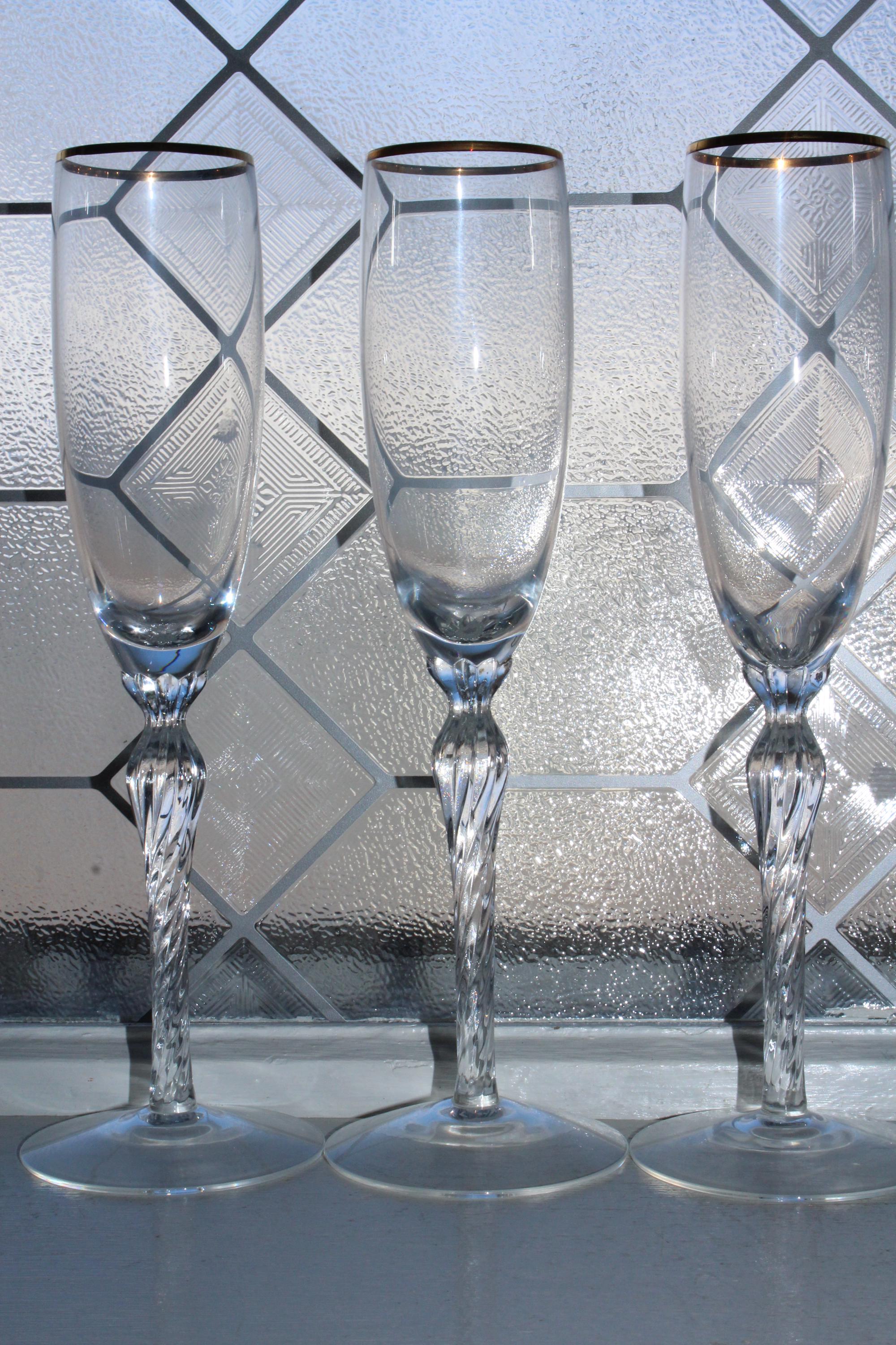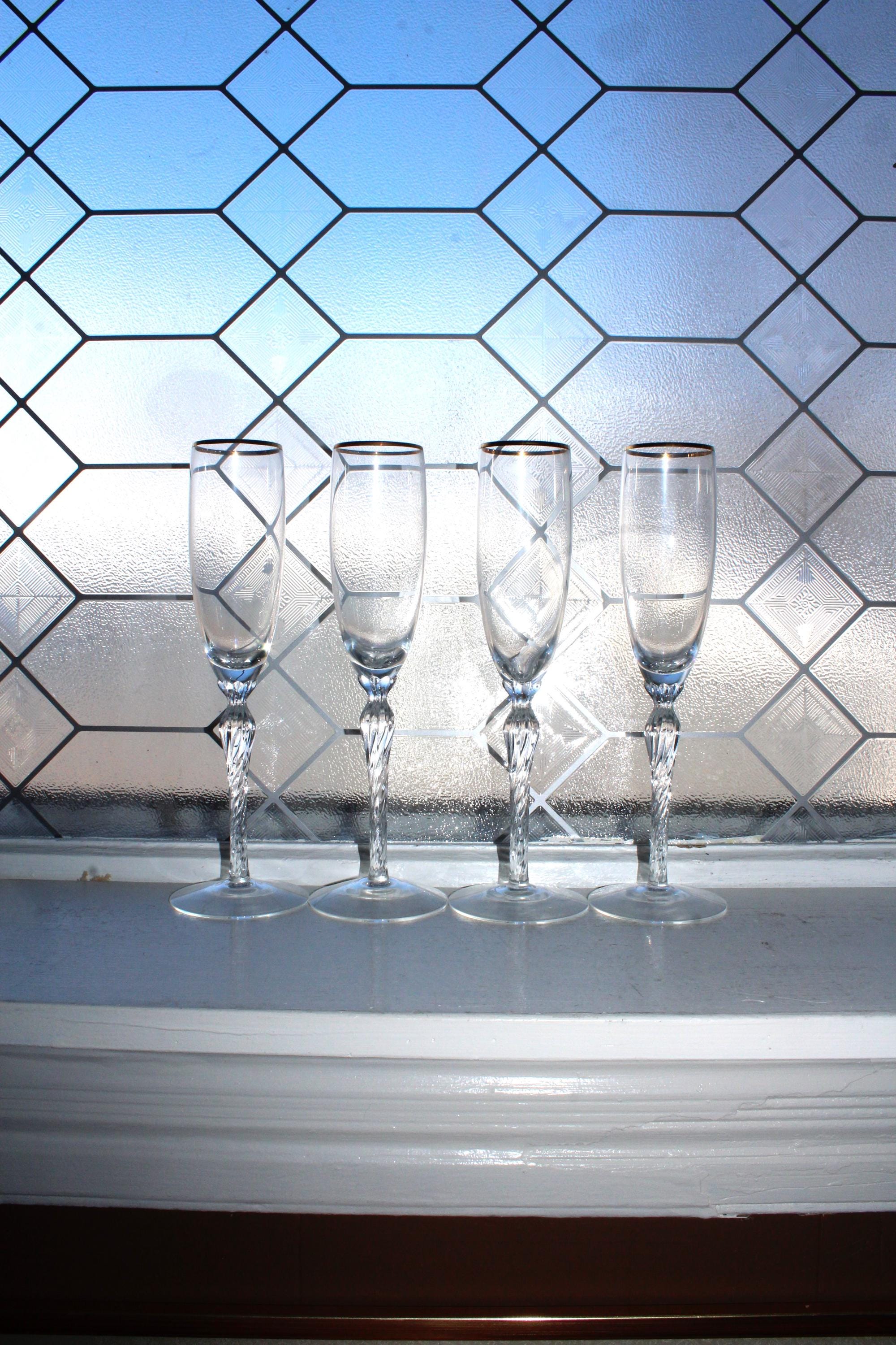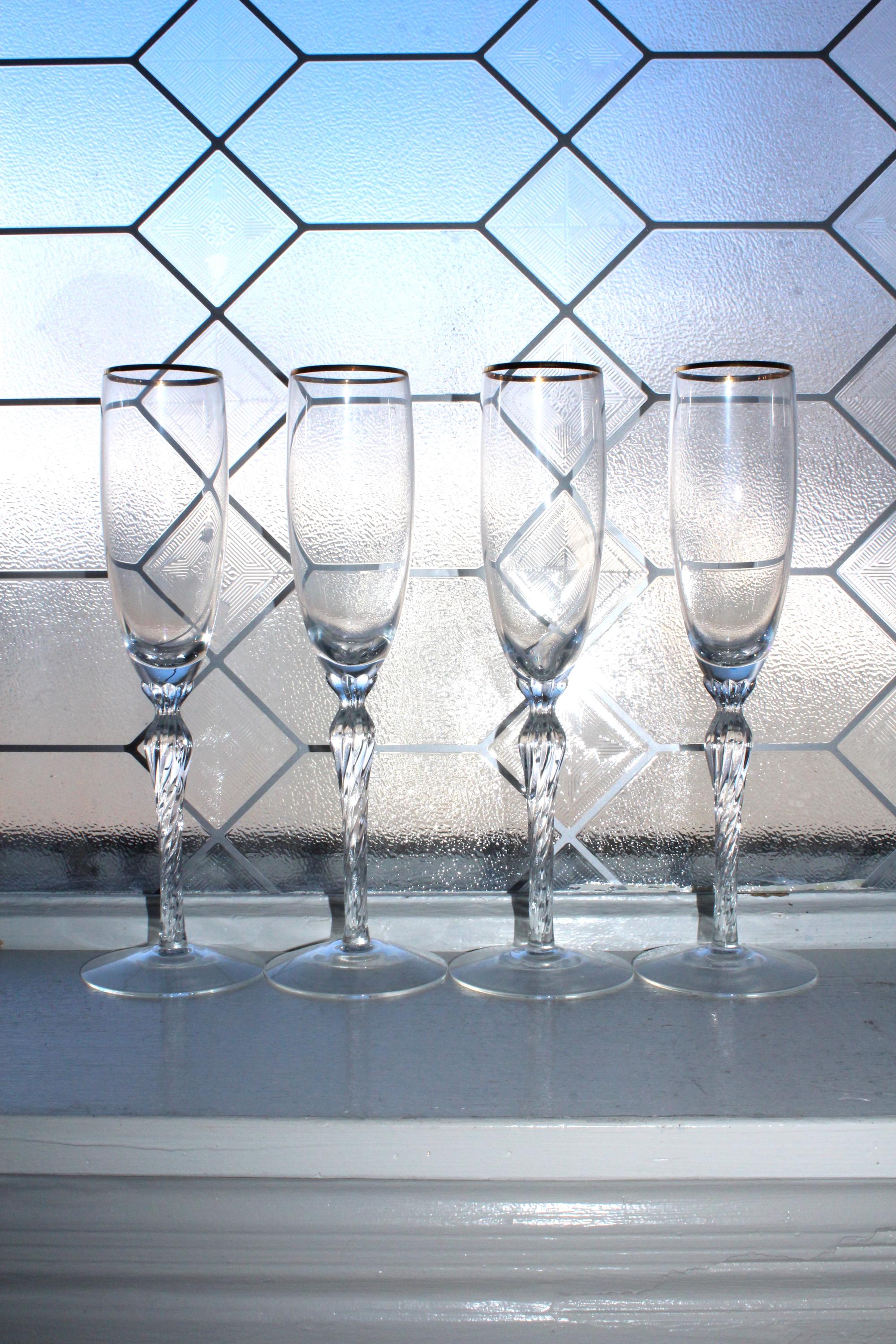 Set of 4 vintage 1980s Lenox crystal Monroe champagne flutes with gold rims, in excellent condition. Each of them measures 9 1/4" high. No chips or cracks, perfect for use or display. THERE ARE 2 SETS OF 4 AVAILABLE VIA THE DROP DOWN BOX. Enjoy!