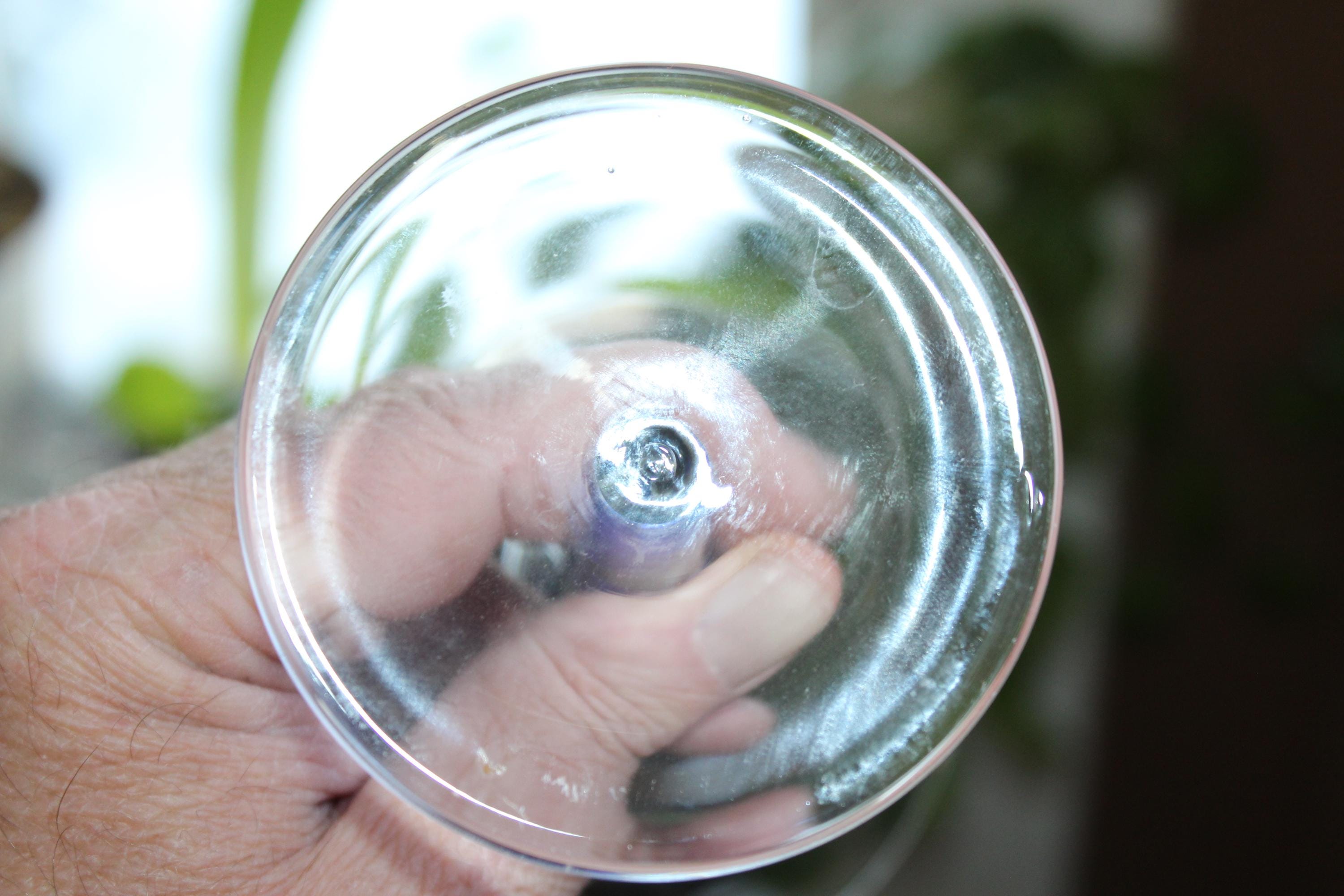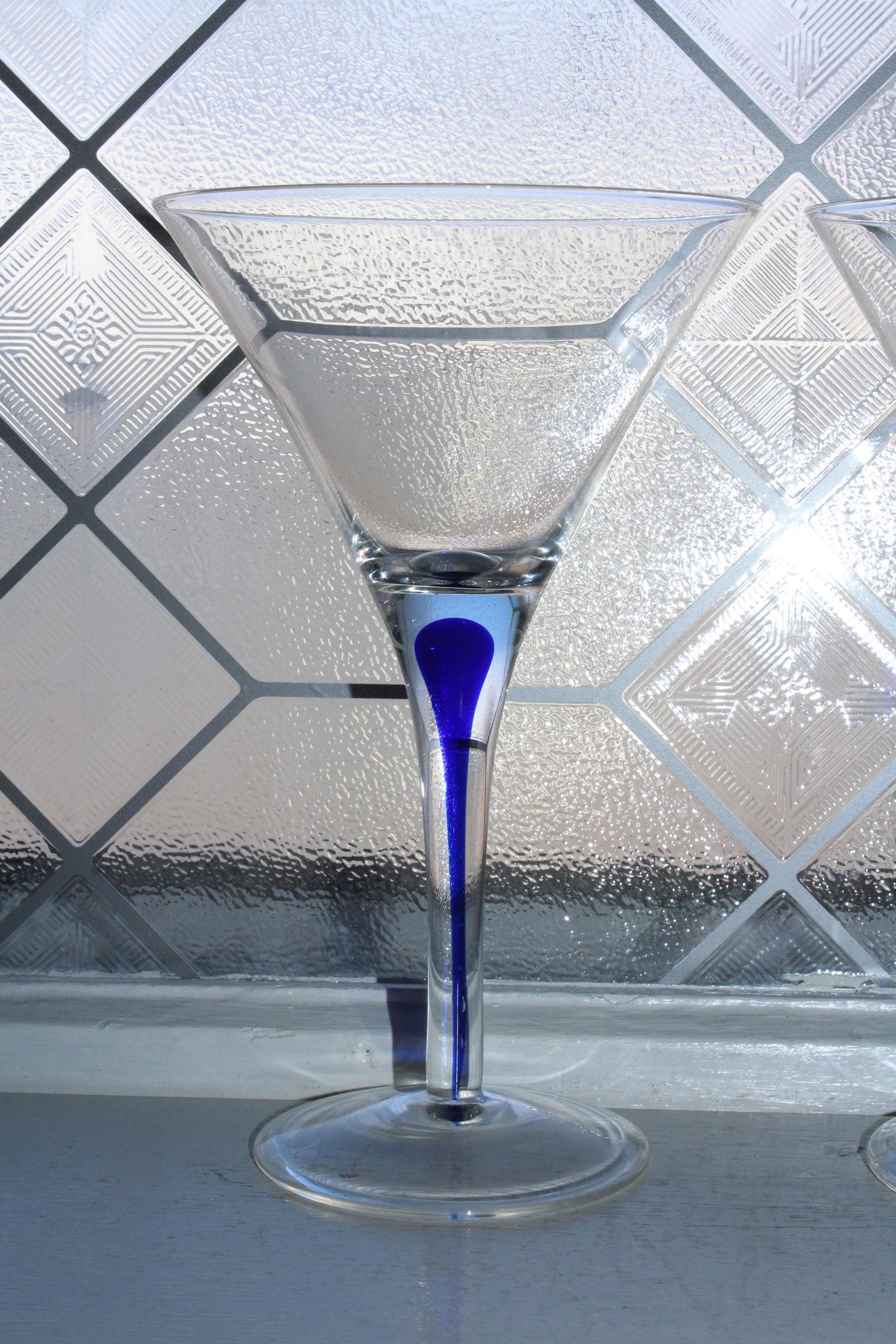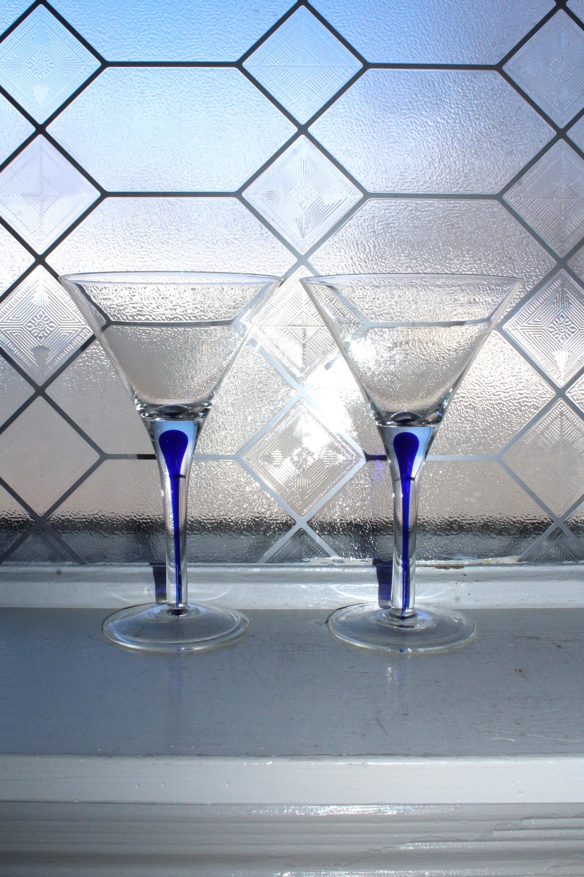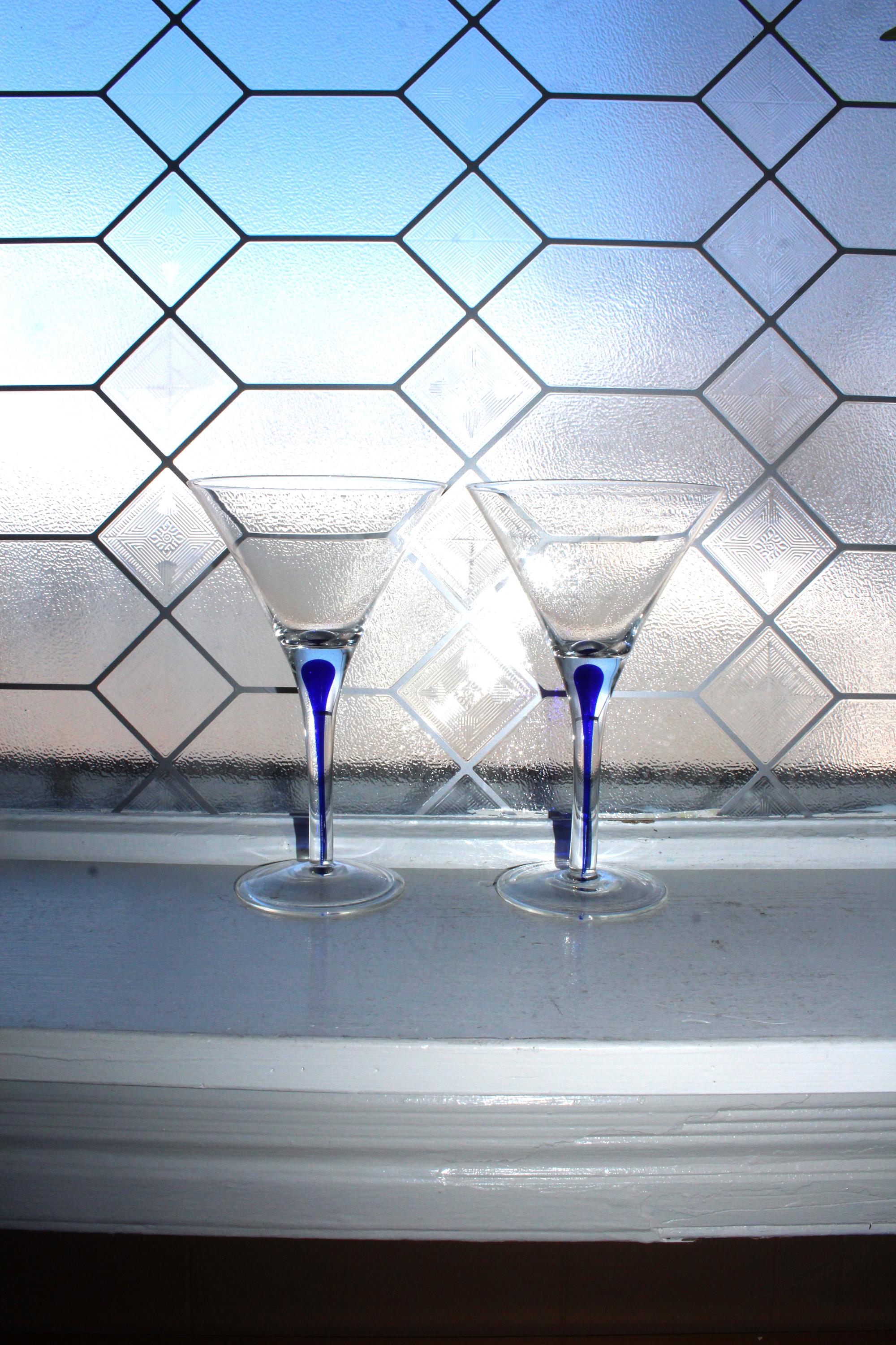 Gorgeous pair of vintage Orrefors Intermezzo martini glasses featuring blue teardrop stems, in excellent condition. Each one measures 7" high x 4 3/8" wide at the rim and has no chips or cracks. Enjoy!