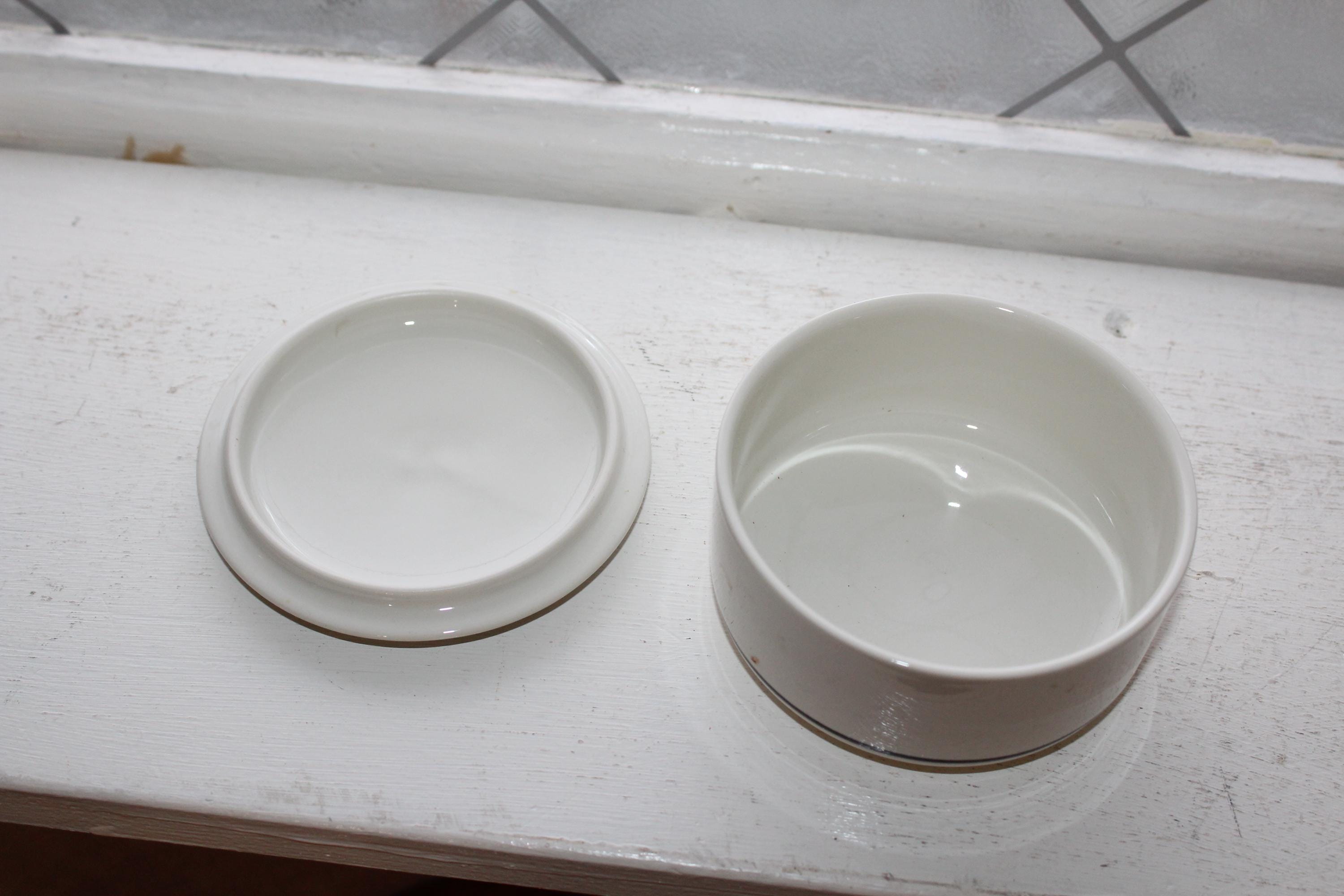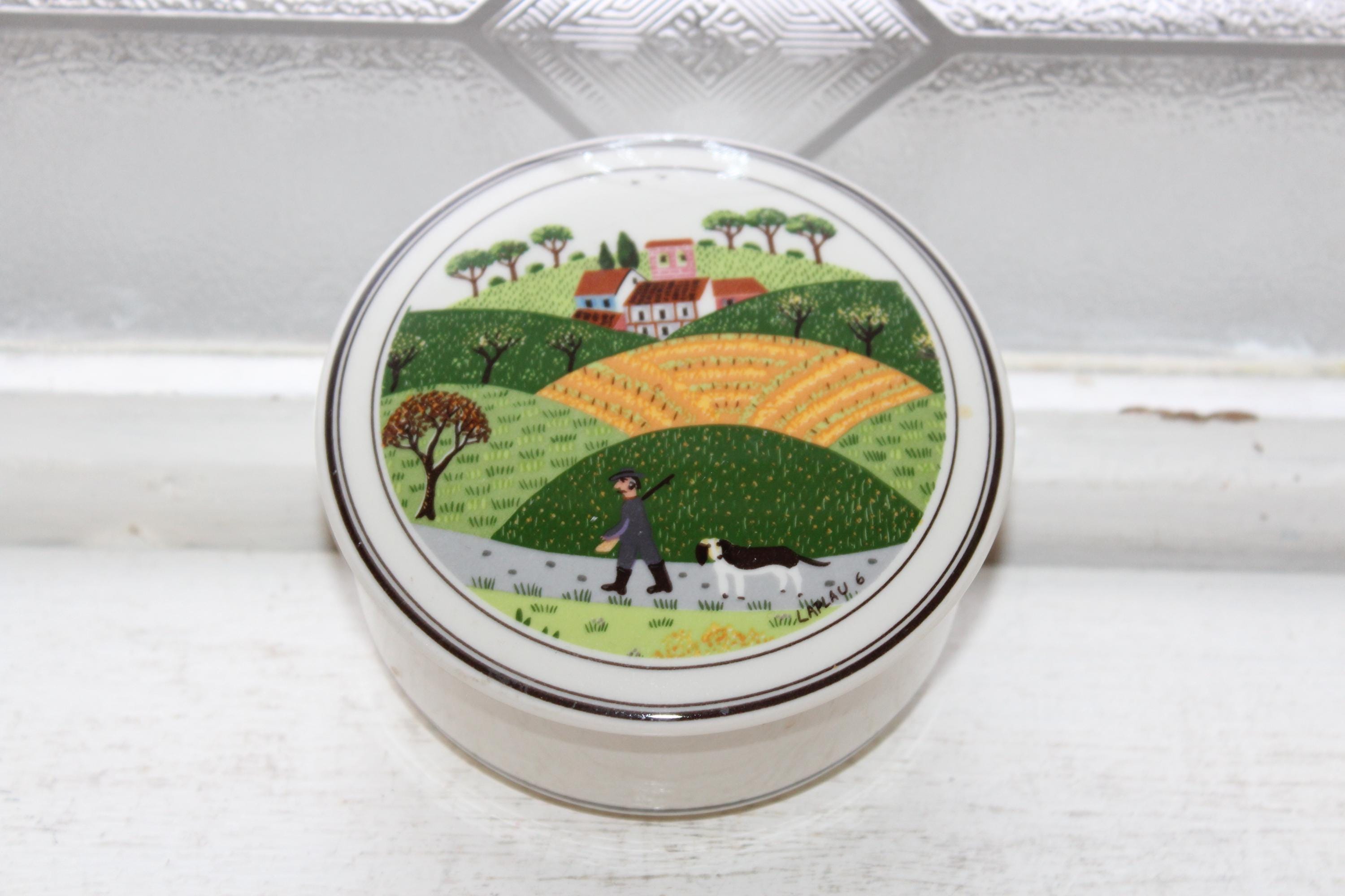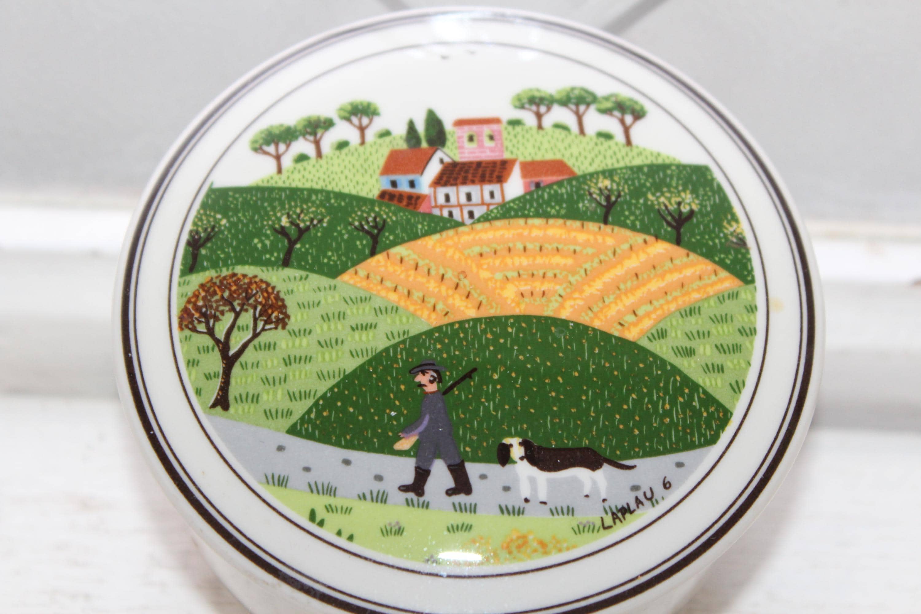 Vintage Villeroy and Boch Naif porcelain trinket box featuring a hunter and dog scene by artist Gérard Laplau, in excellent condition. It measures 2 1/8" high x 4 1/8" wide. No chips, cracks or wear, perfect for use or display. Enjoy!