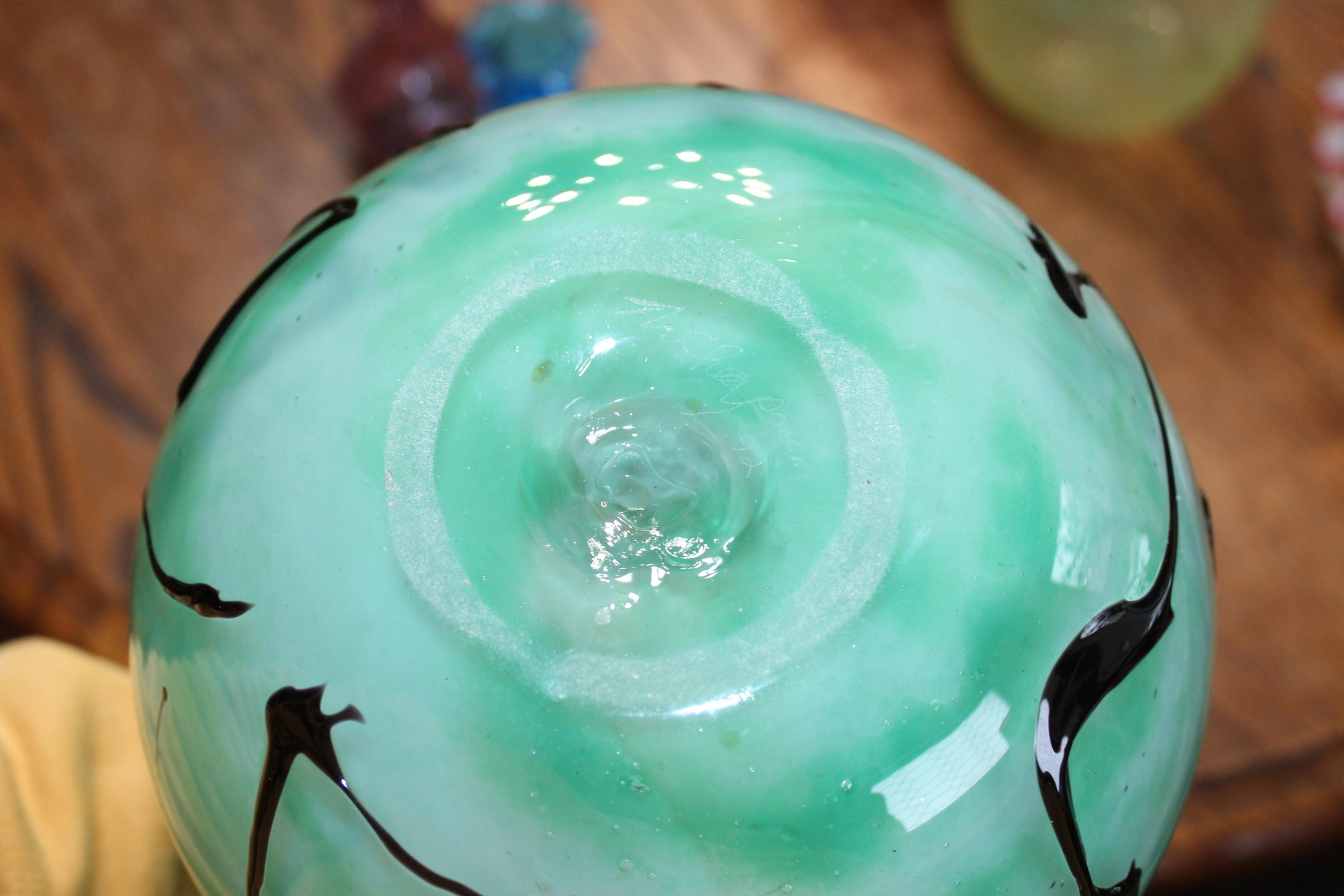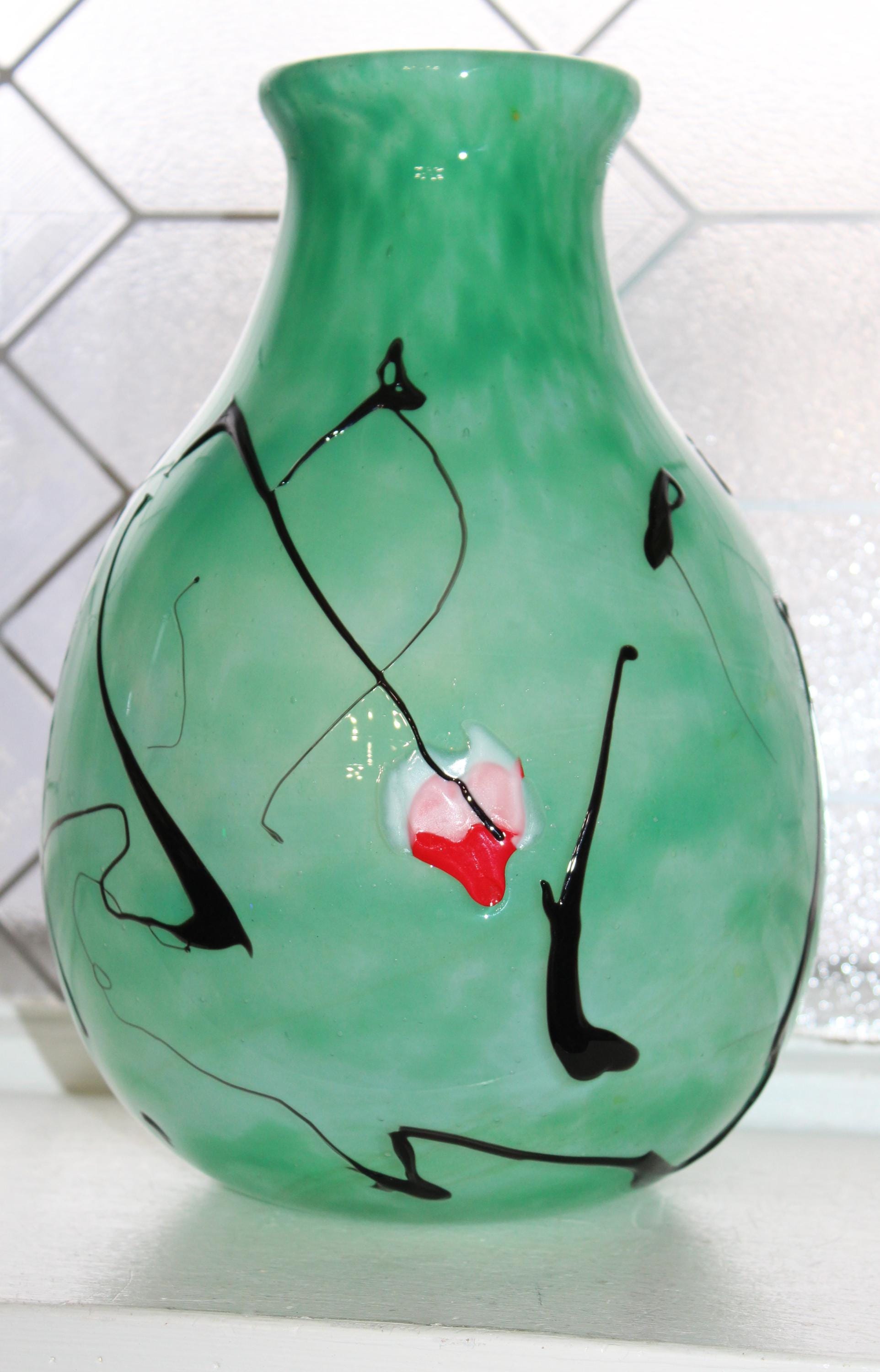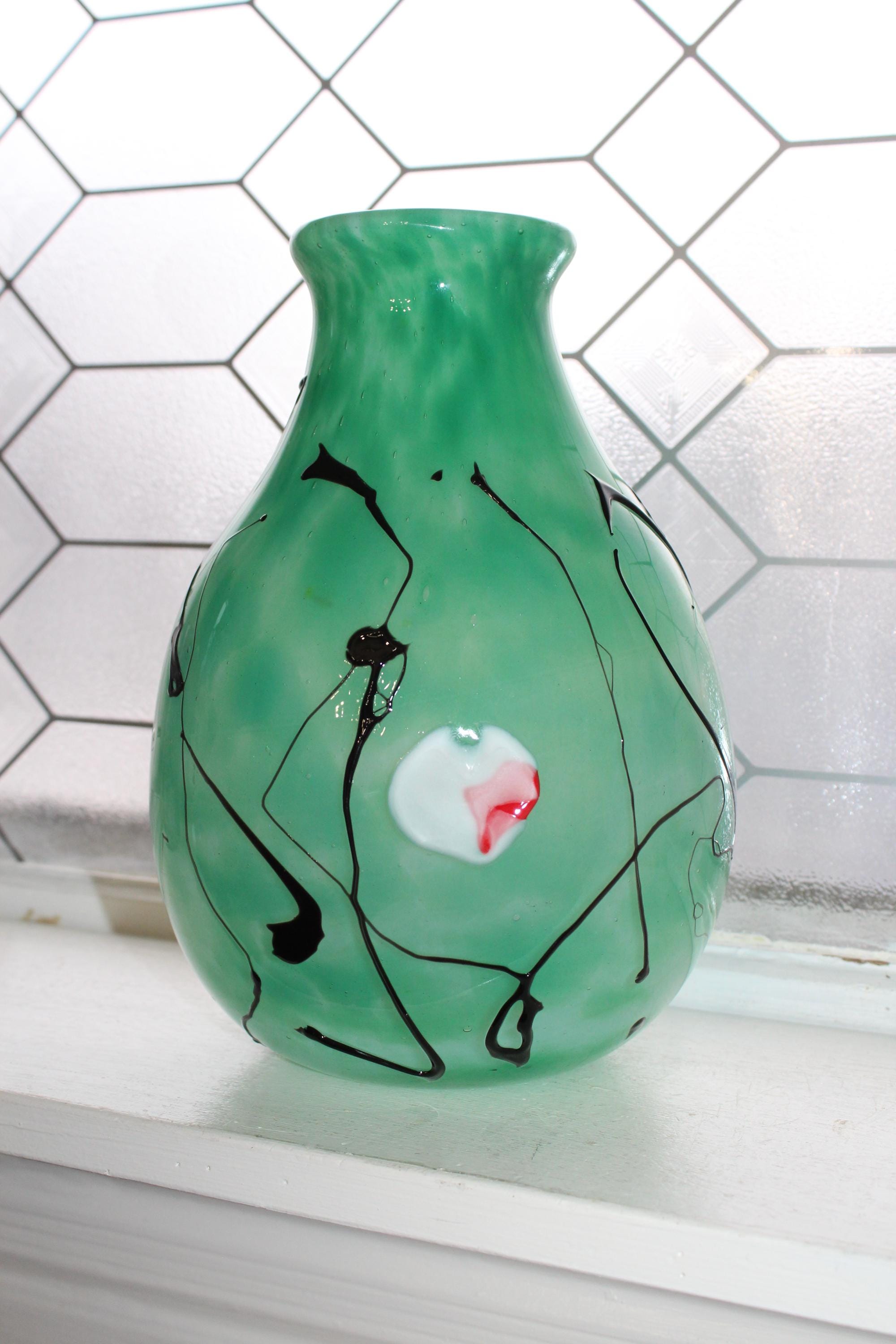 This hanging hearts studio art glass green vase, signed Tom Chapman 1992 of Shiloh Hotglass Studio, is 10" high, weighs 6 3/4 lbs. and is in excellent condition. No chips or cracks, perfect for display. Enjoy!