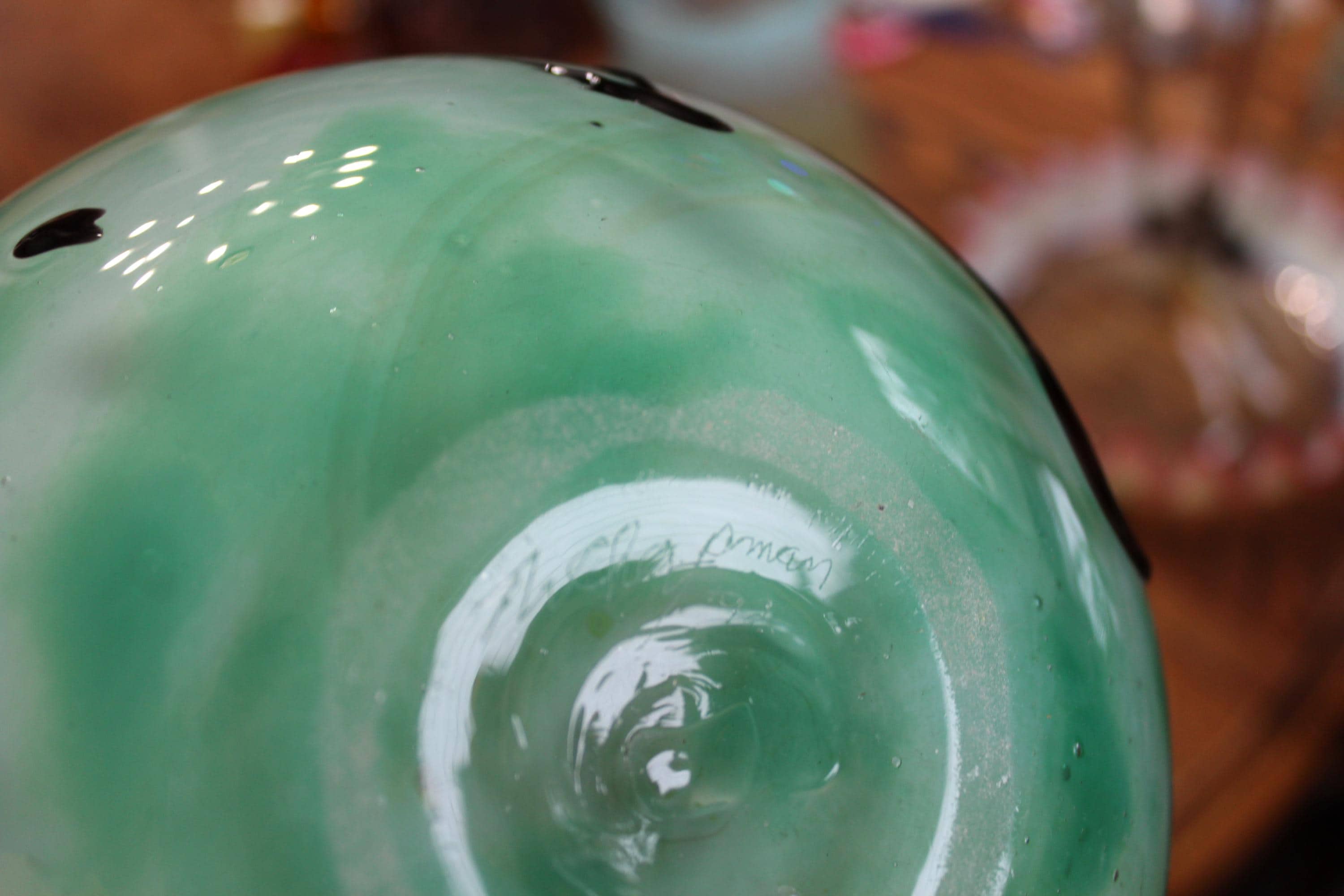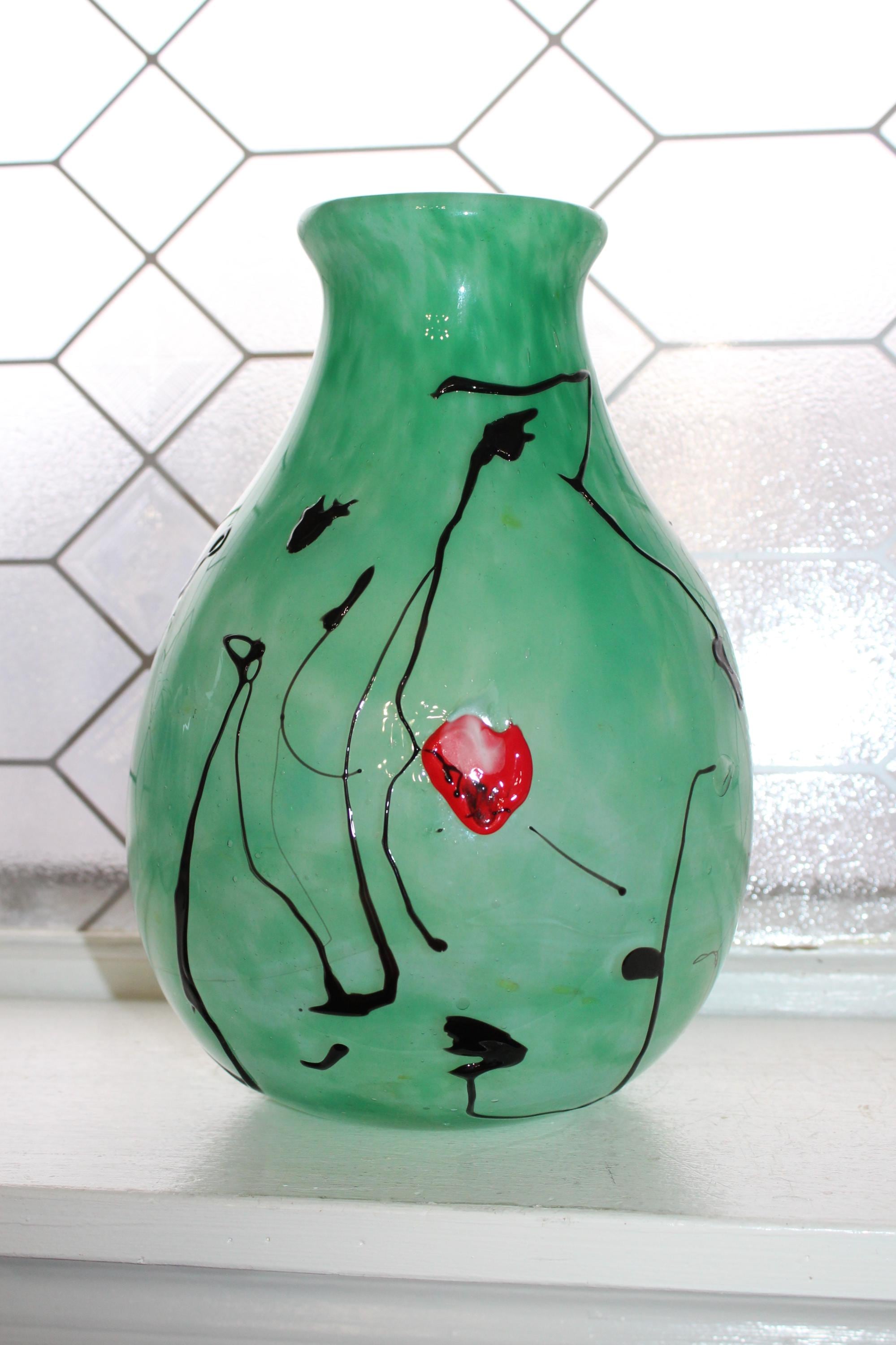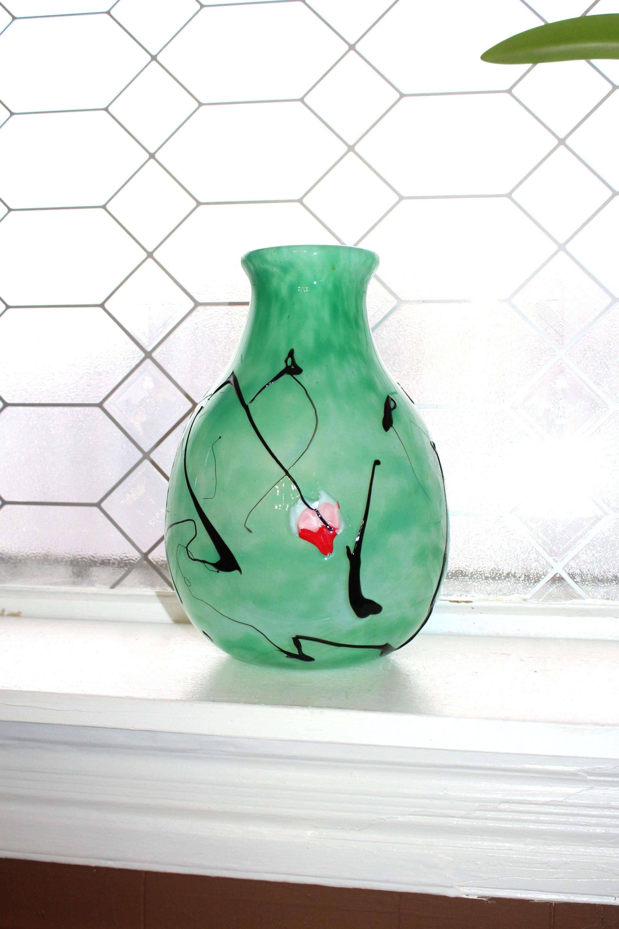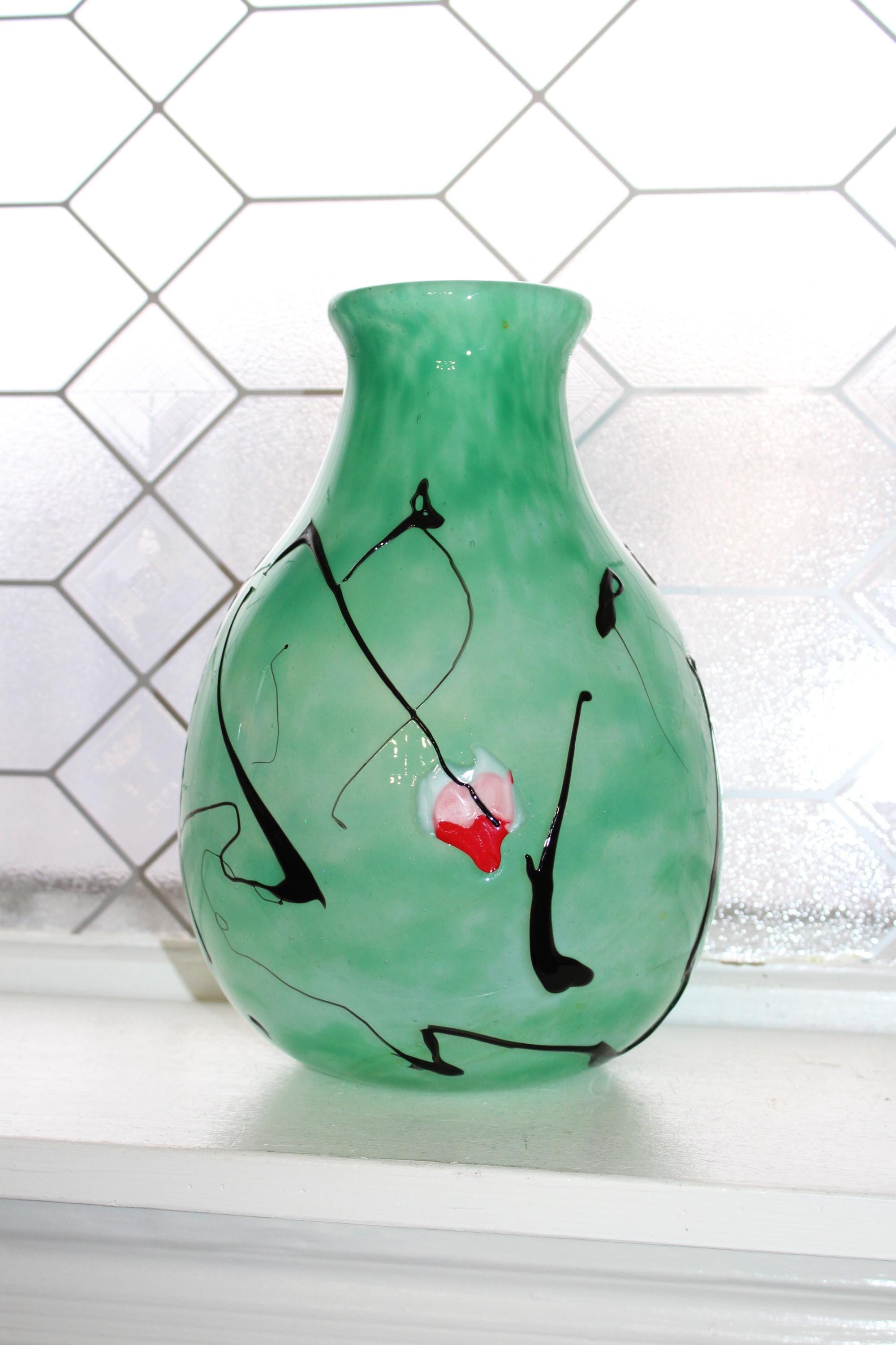 This hanging hearts studio art glass green vase, signed Tom Chapman 1992 of Shiloh Hotglass Studio, is 10" high, weighs 6 3/4 lbs. and is in excellent condition. No chips or cracks, perfect for display. Enjoy!