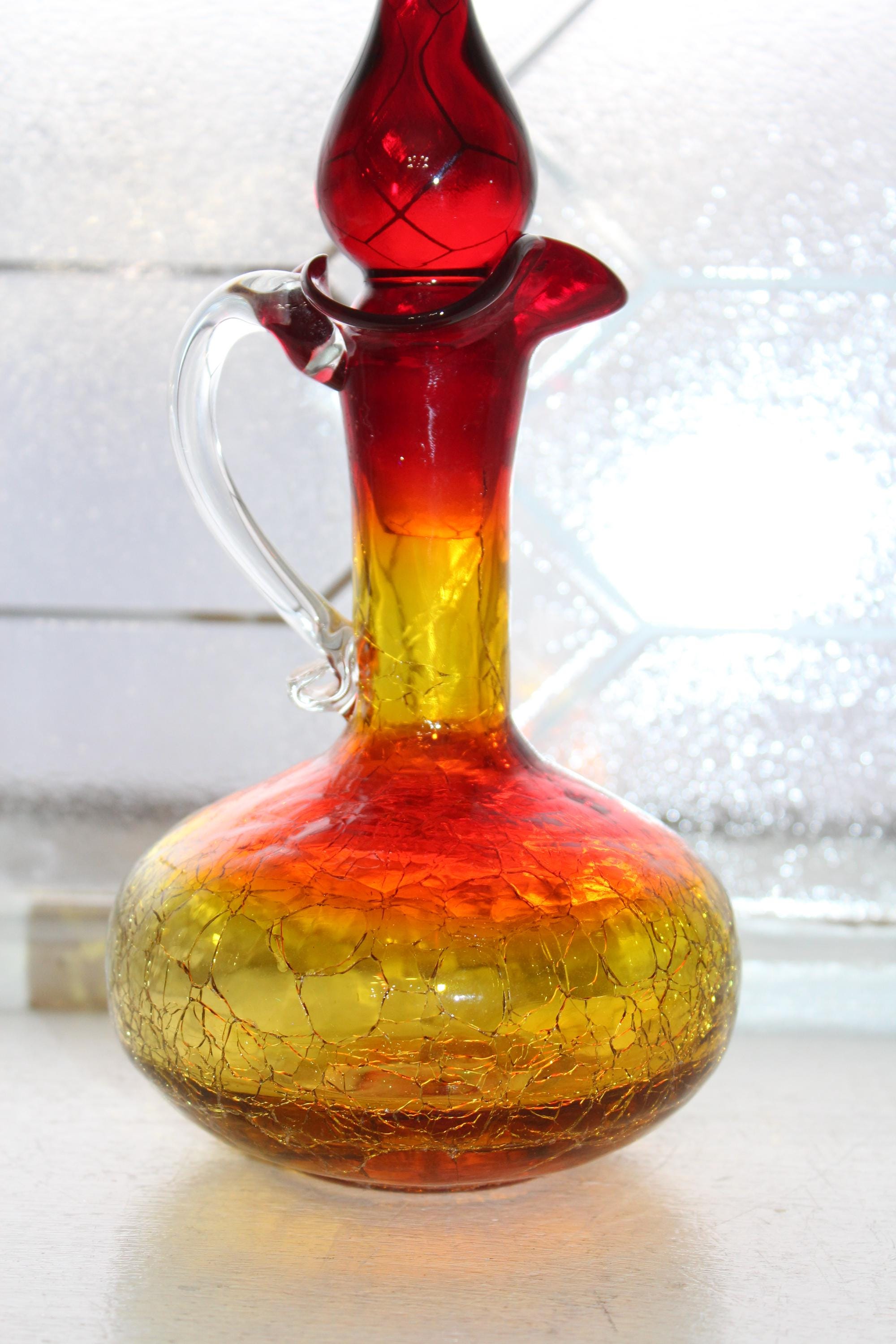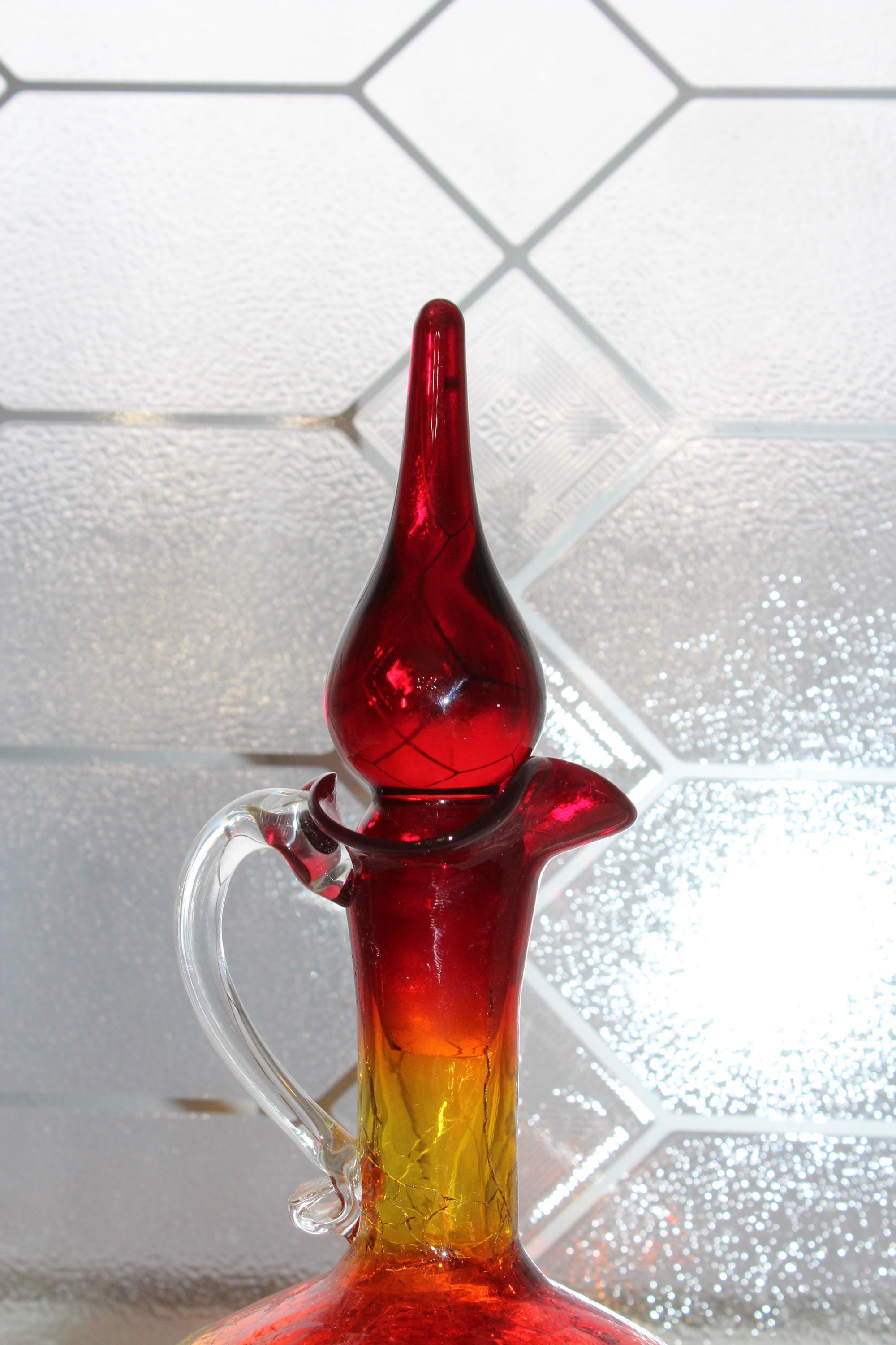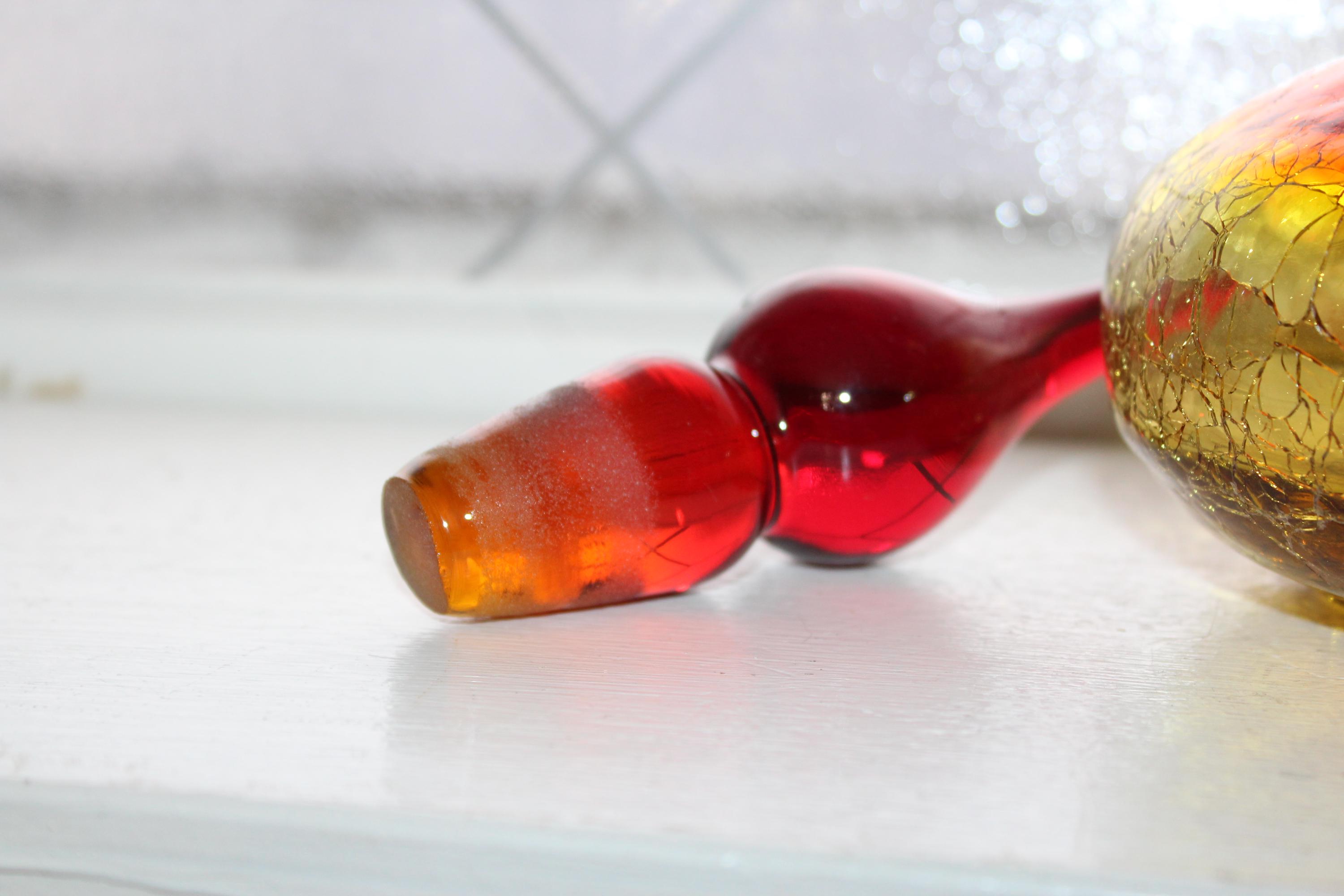 Vintage Mid Century red and yellow amberina crackle glass decanter bottle with teardrop stopper and clear glass applied handle, in excellent condition and perfect for use or display in a Mid Century home. The bottle measures 9 1/2" high to the top of the stopper. No chips or cracks, ready to use and appreciate. Enjoy!