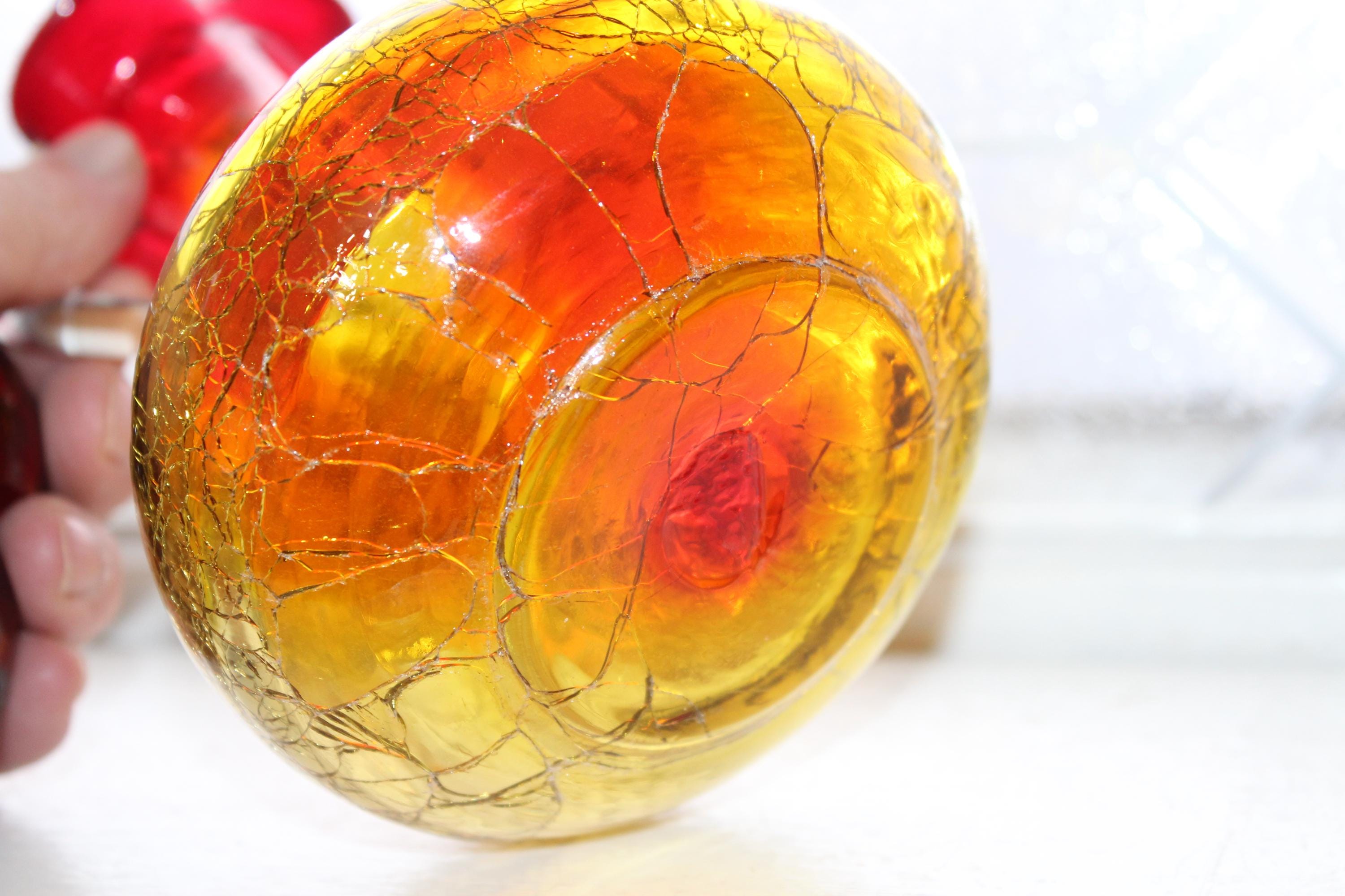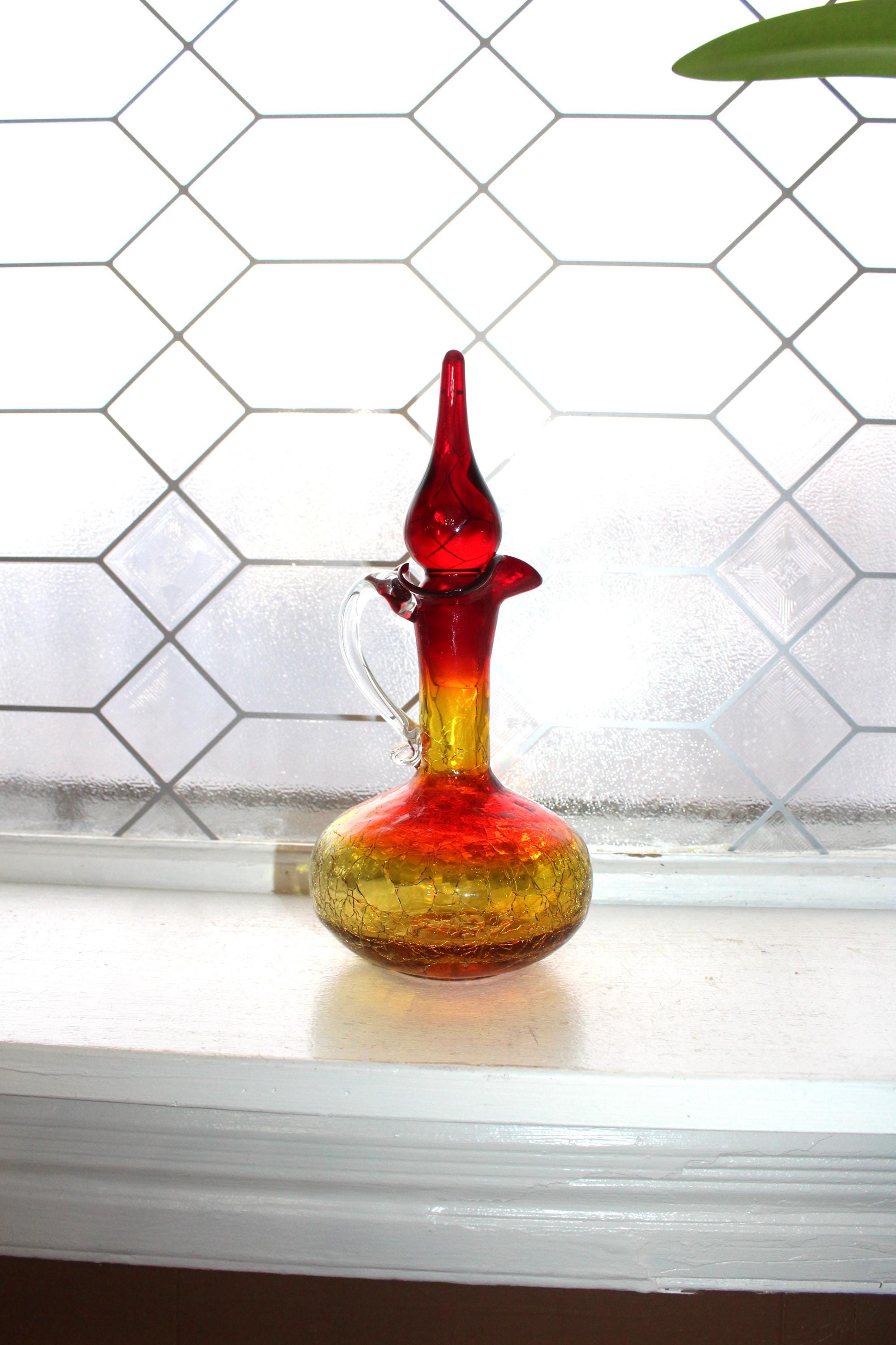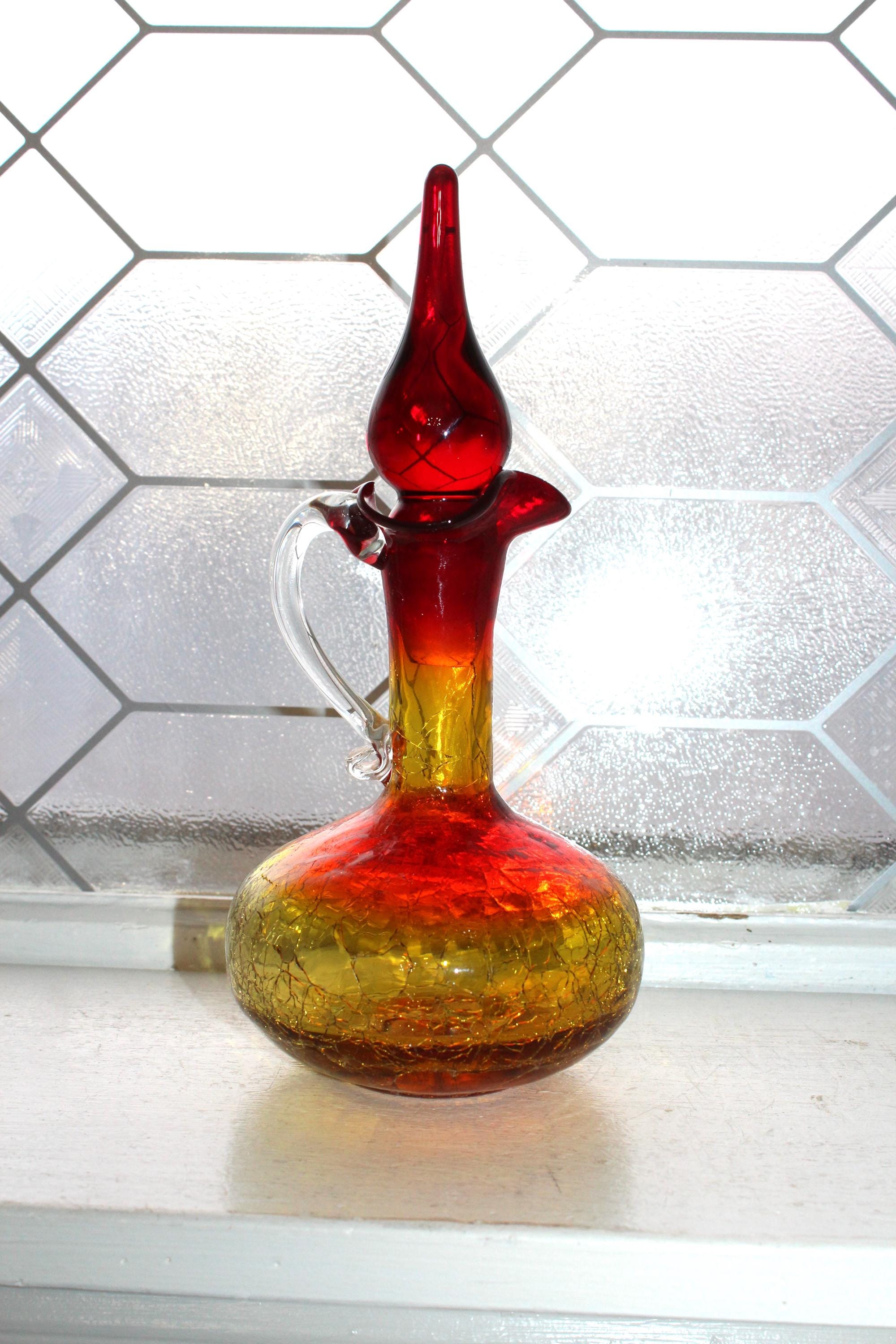 Vintage Mid Century red and yellow amberina crackle glass decanter bottle with teardrop stopper and clear glass applied handle, in excellent condition and perfect for use or display in a Mid Century home. The bottle measures 9 1/2" high to the top of the stopper. No chips or cracks, ready to use and appreciate. Enjoy!
