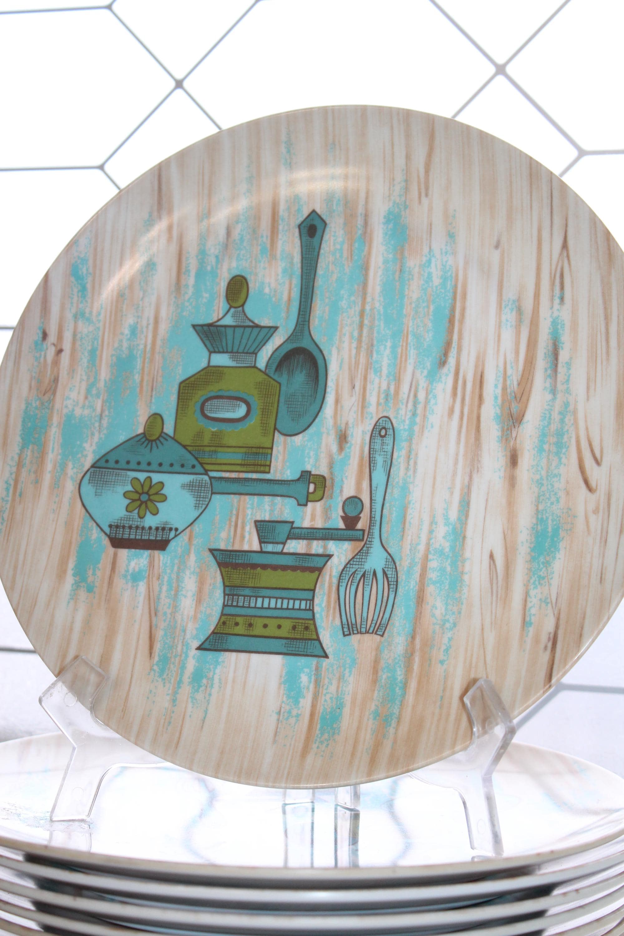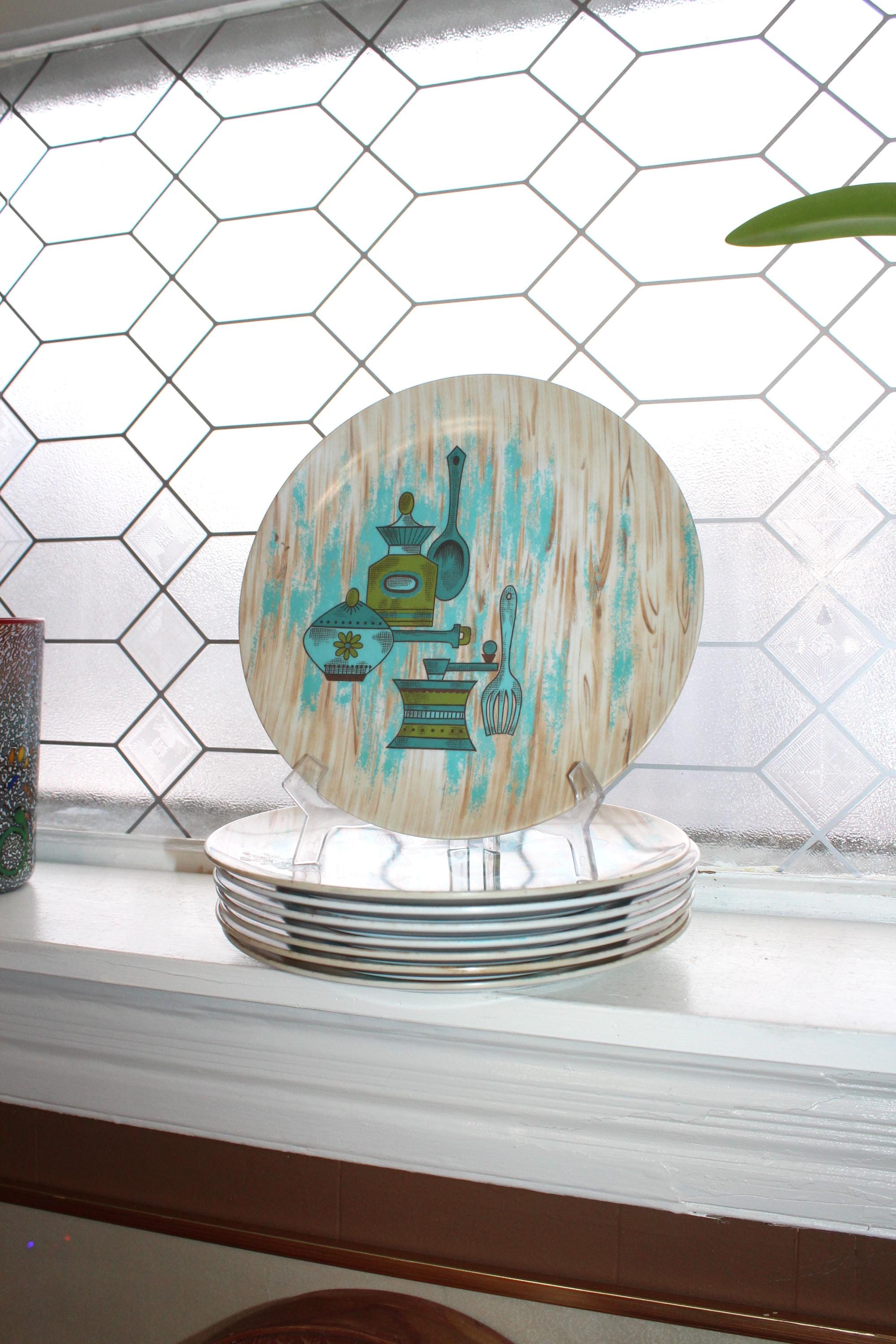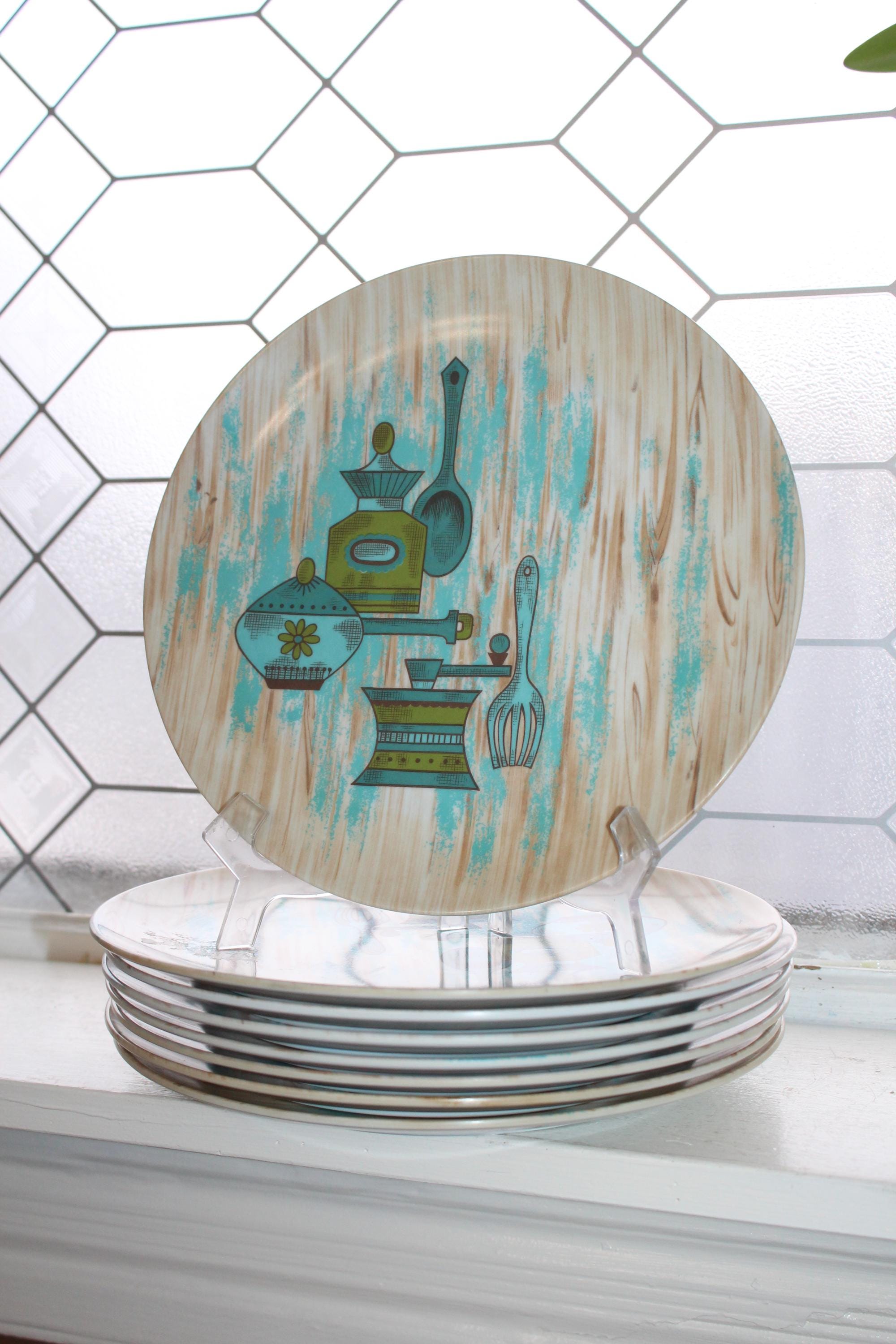 8 vintage Texas Ware melamine dinner plates in a country kitchen pattern, in good condition. The plates measure 10" wide and show age appropriate light wear. They look good and are great for use or display. Enjoy!