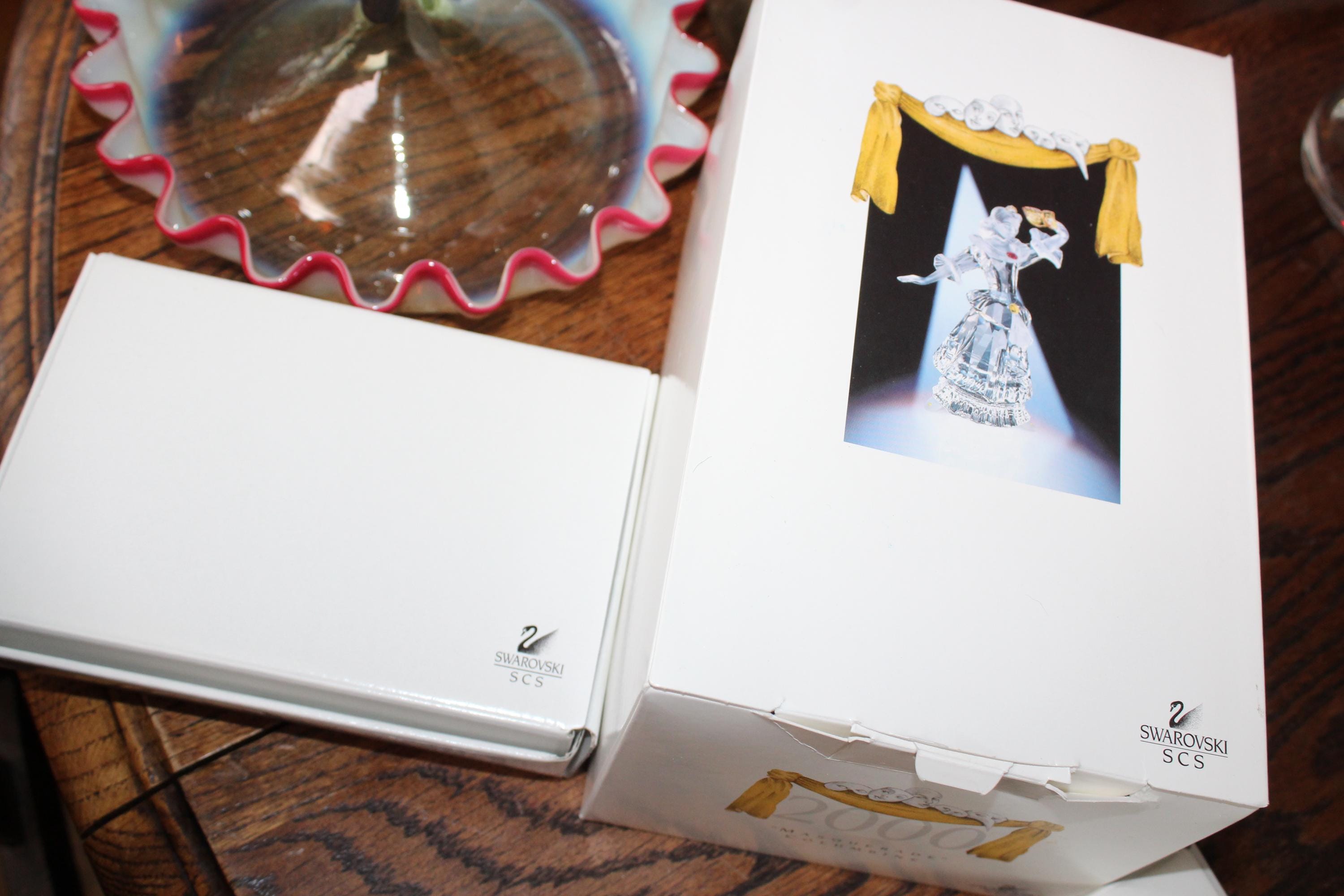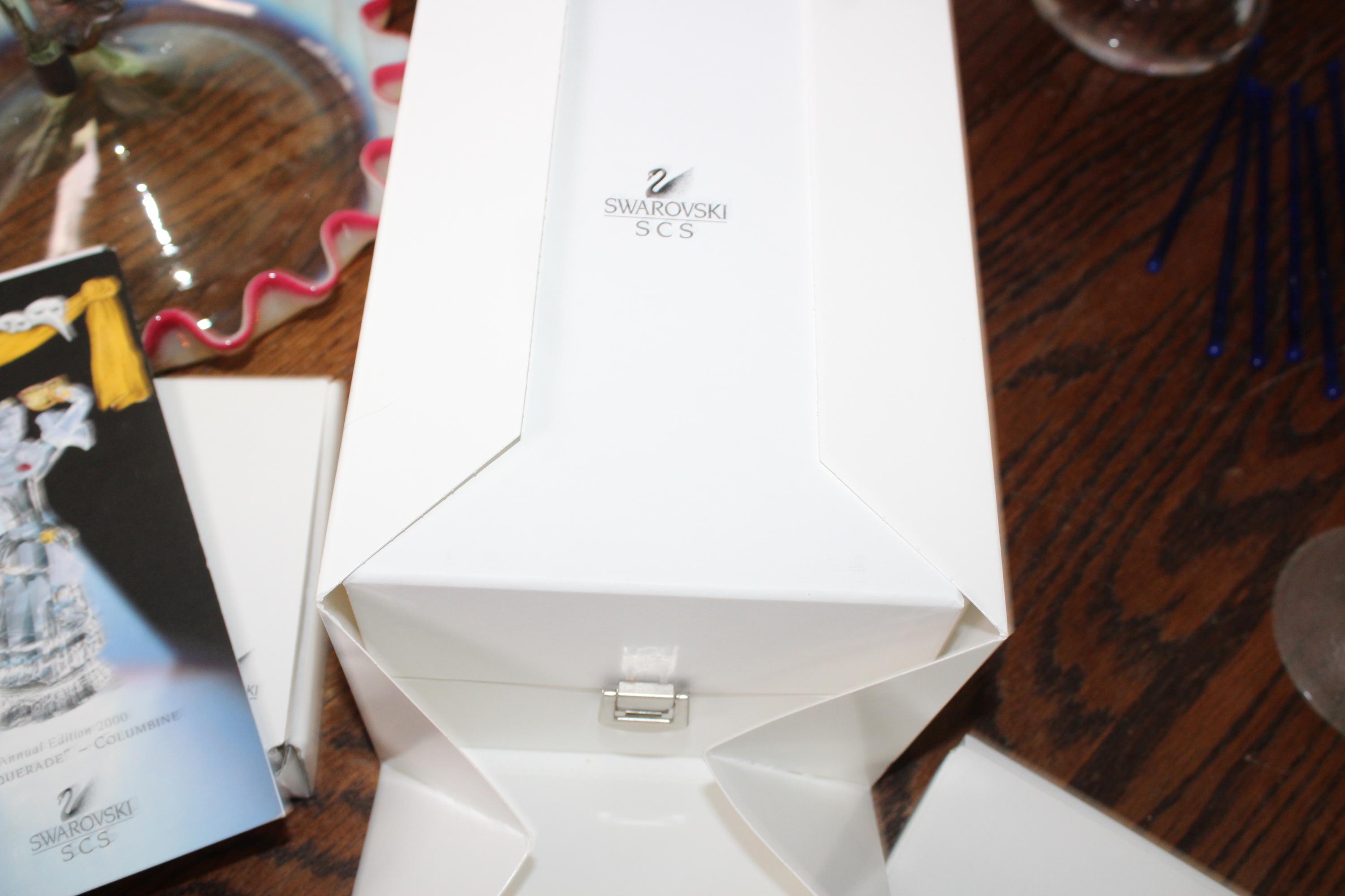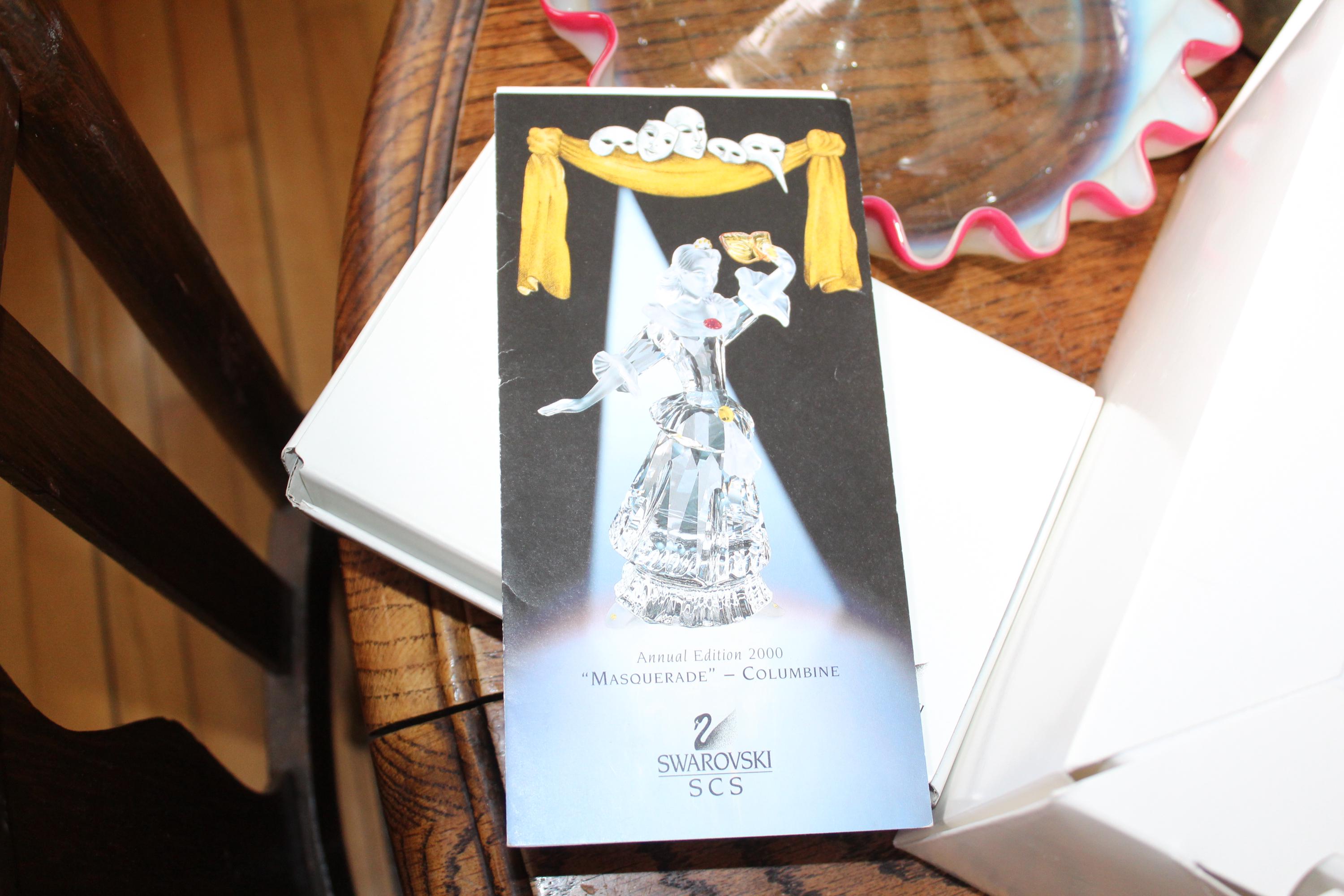 Vintage 2000 Swarovski crystal Masquerade Columbine figurine with stand, papers and original box. It is in mint condition. Enjoy!