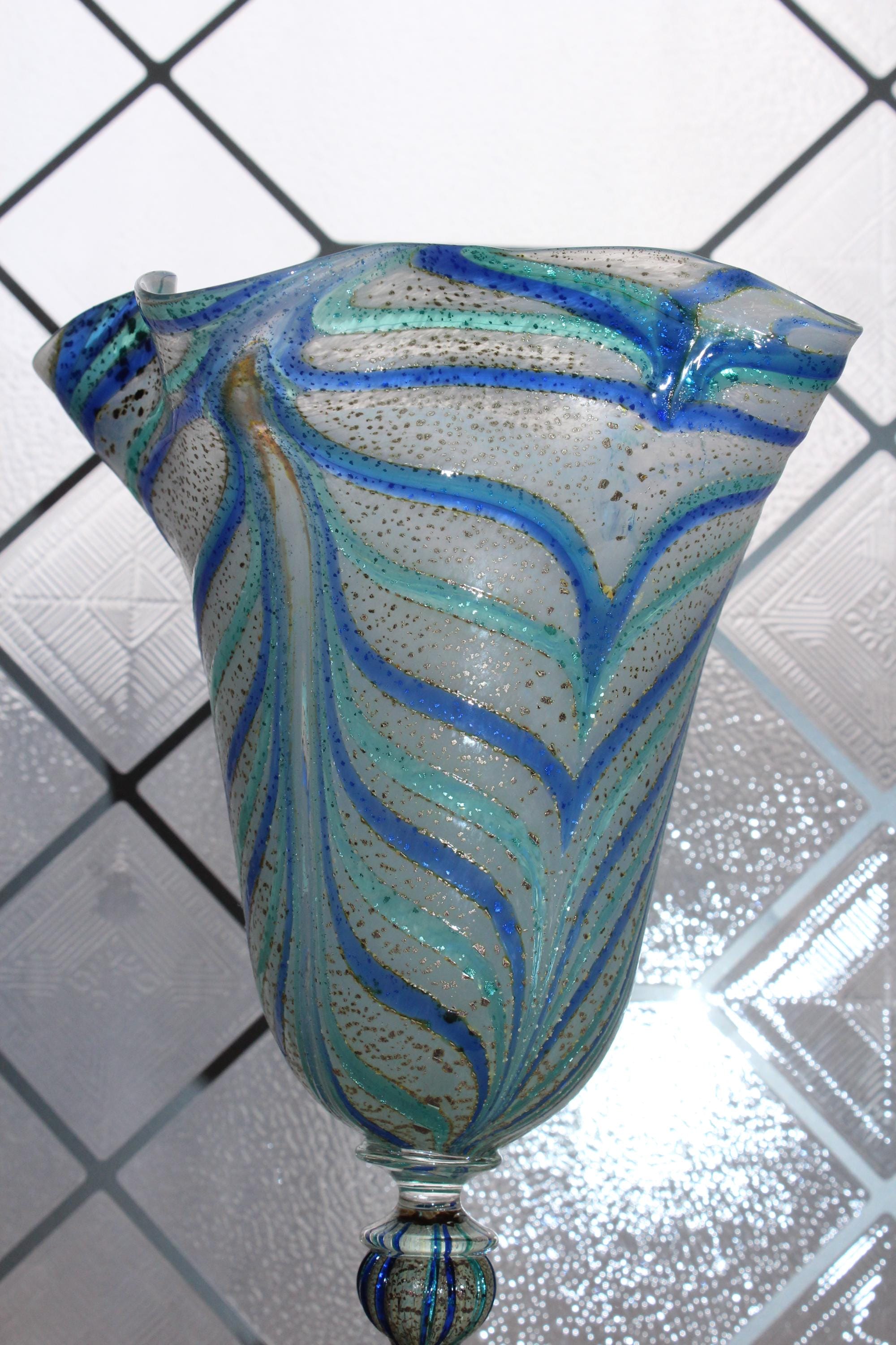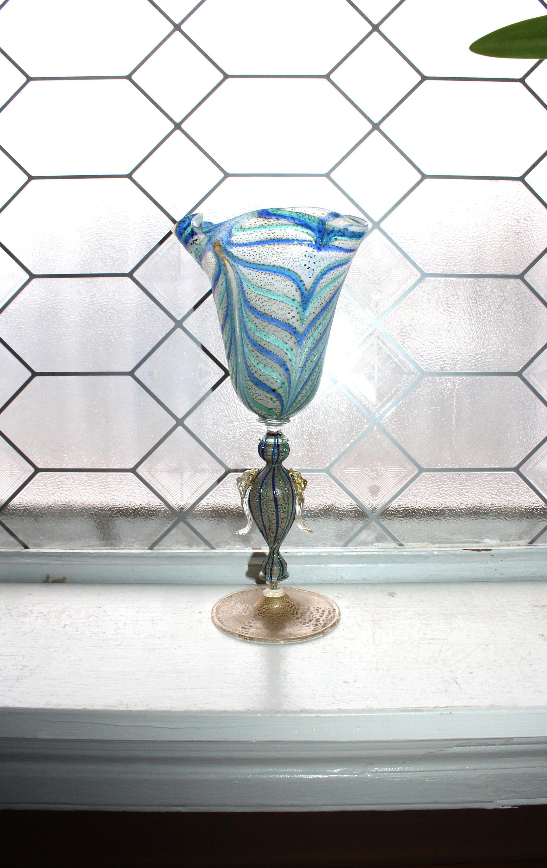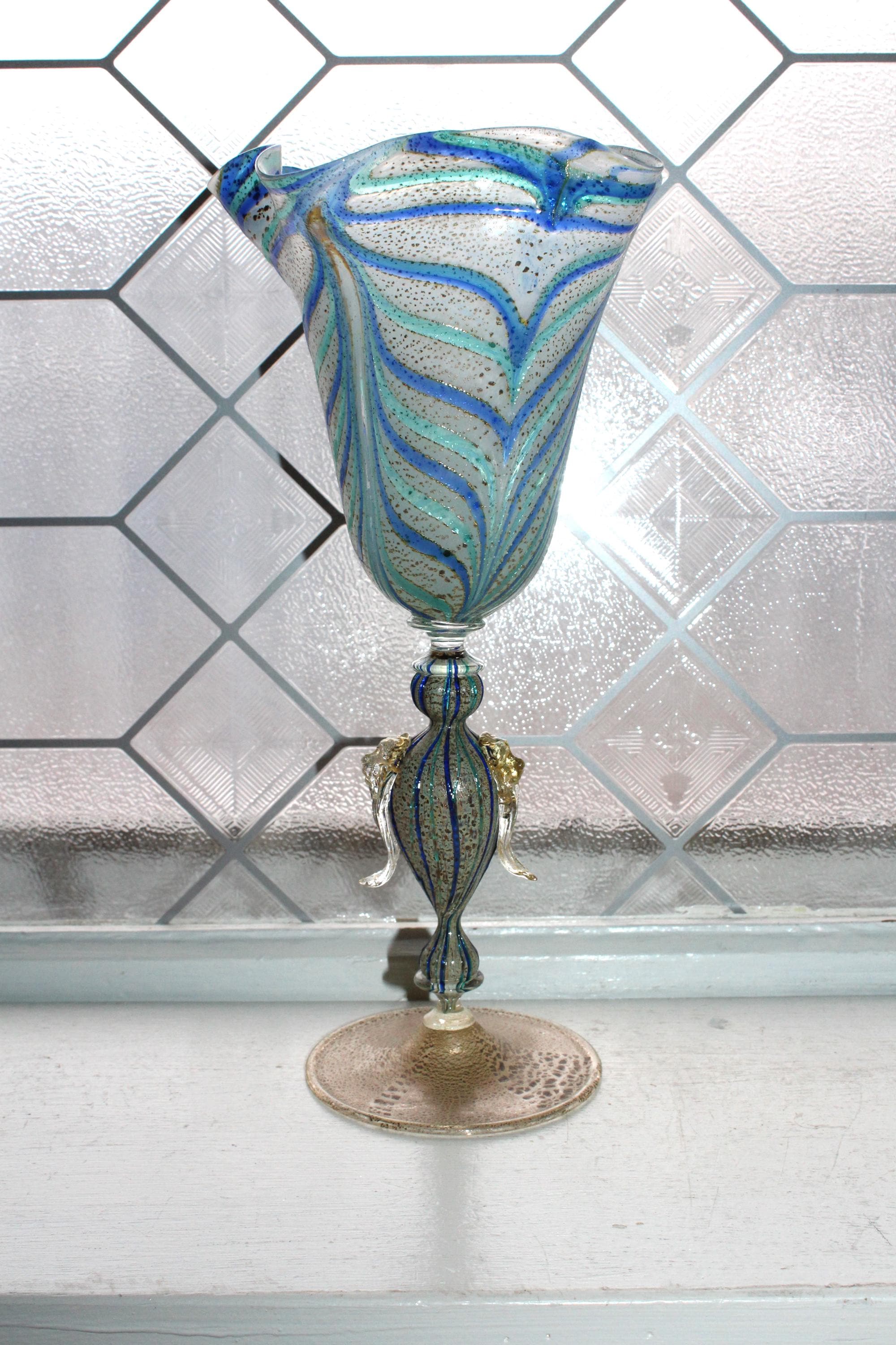Large vintage Italian Venetian Murano art glass trumpet vase or chalice featuring blue pulled feather with figural gilt lion stem, in excellent condition and perfect for use or display. It measures 10 1/2" high and has no damage or wear. Ready to use and appreciate. Enjoy!