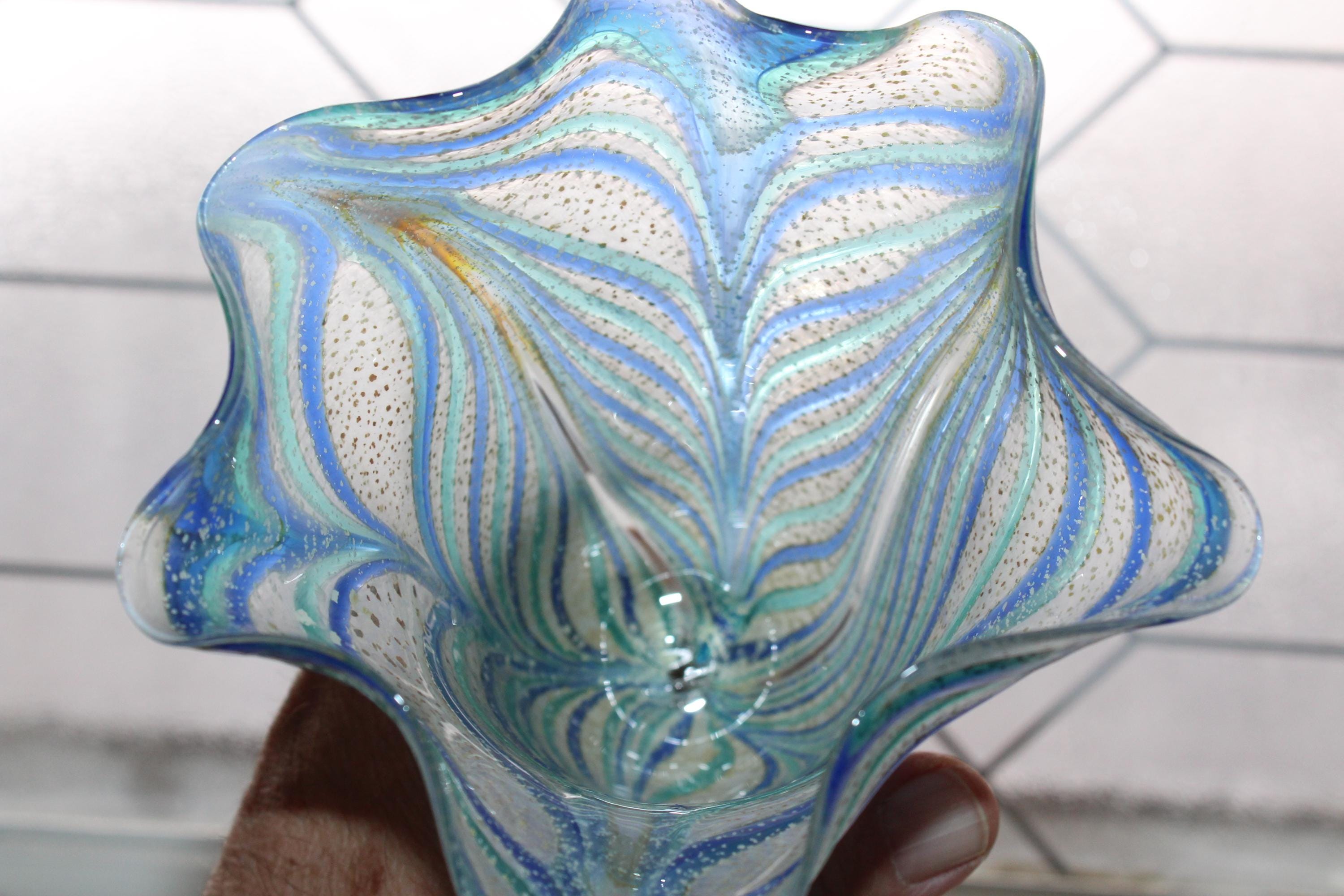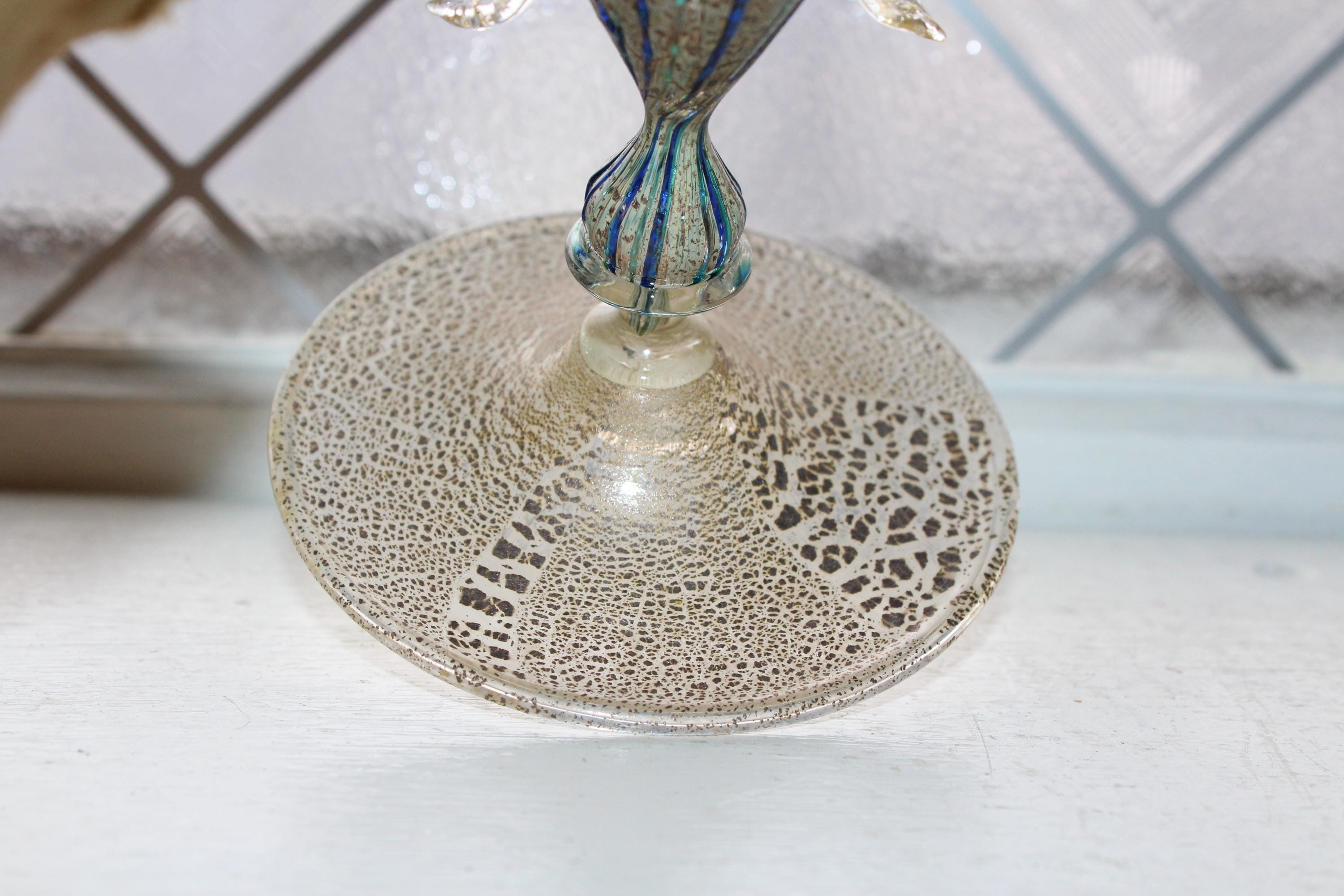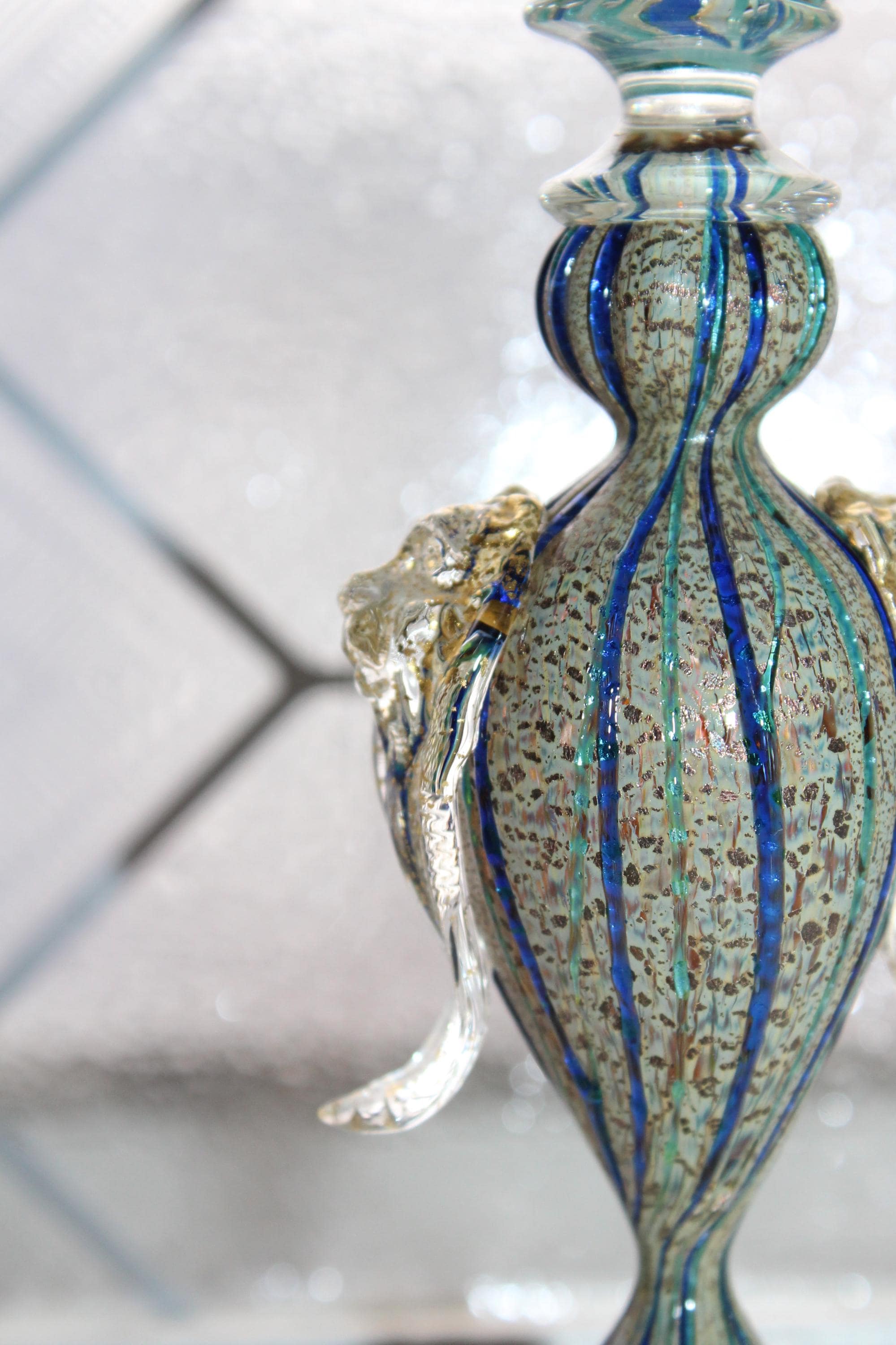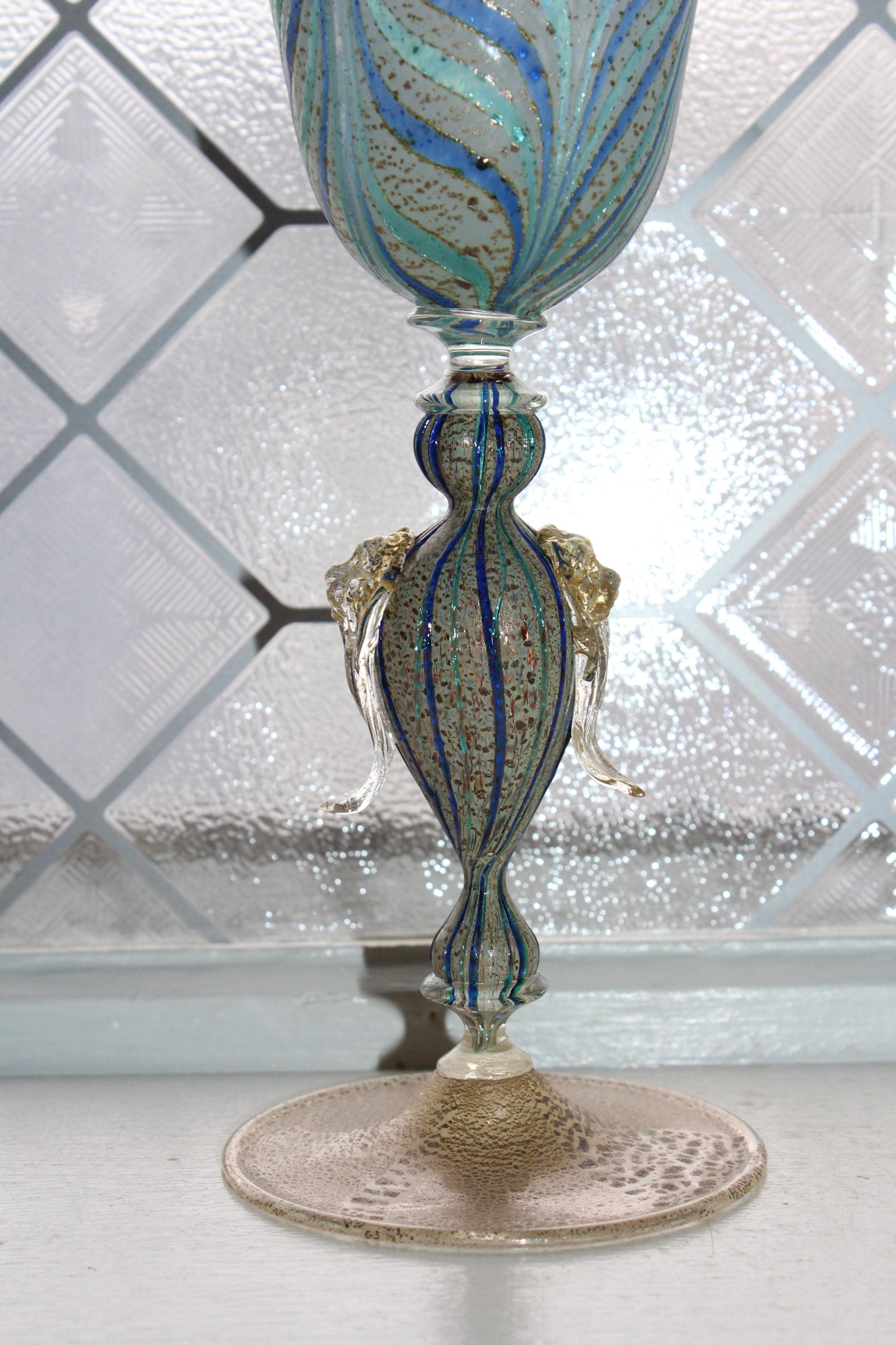 Large vintage Italian Venetian Murano art glass trumpet vase or chalice featuring blue pulled feather with figural gilt lion stem, in excellent condition and perfect for use or display. It measures 10 1/2" high and has no damage or wear. Ready to use and appreciate. Enjoy!