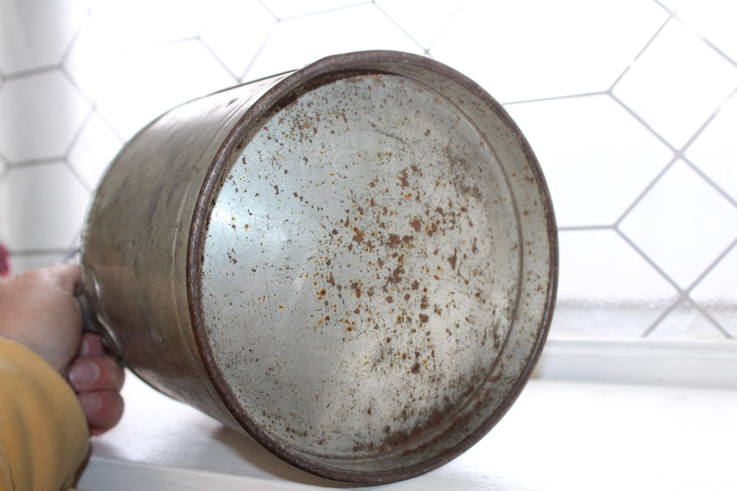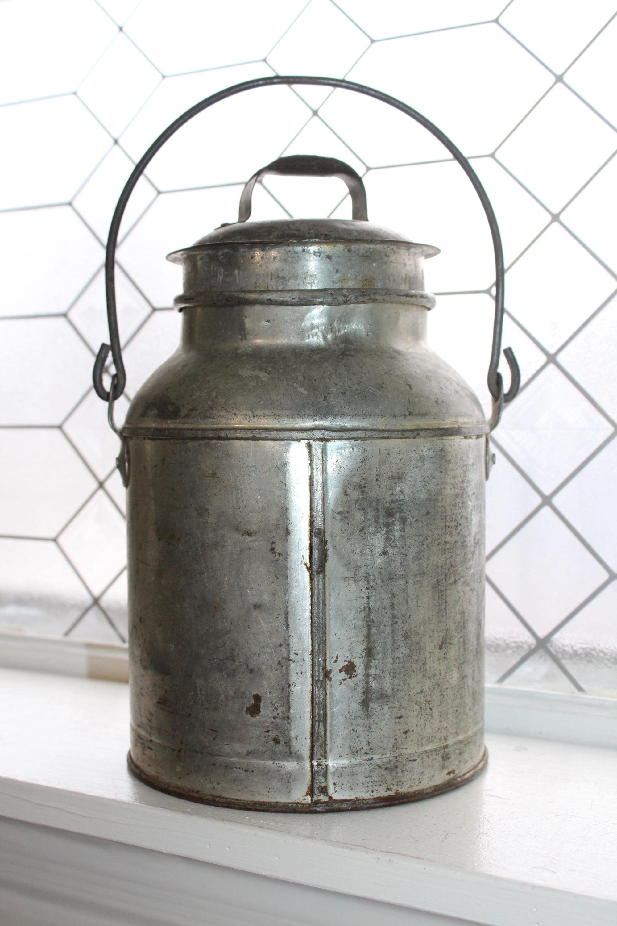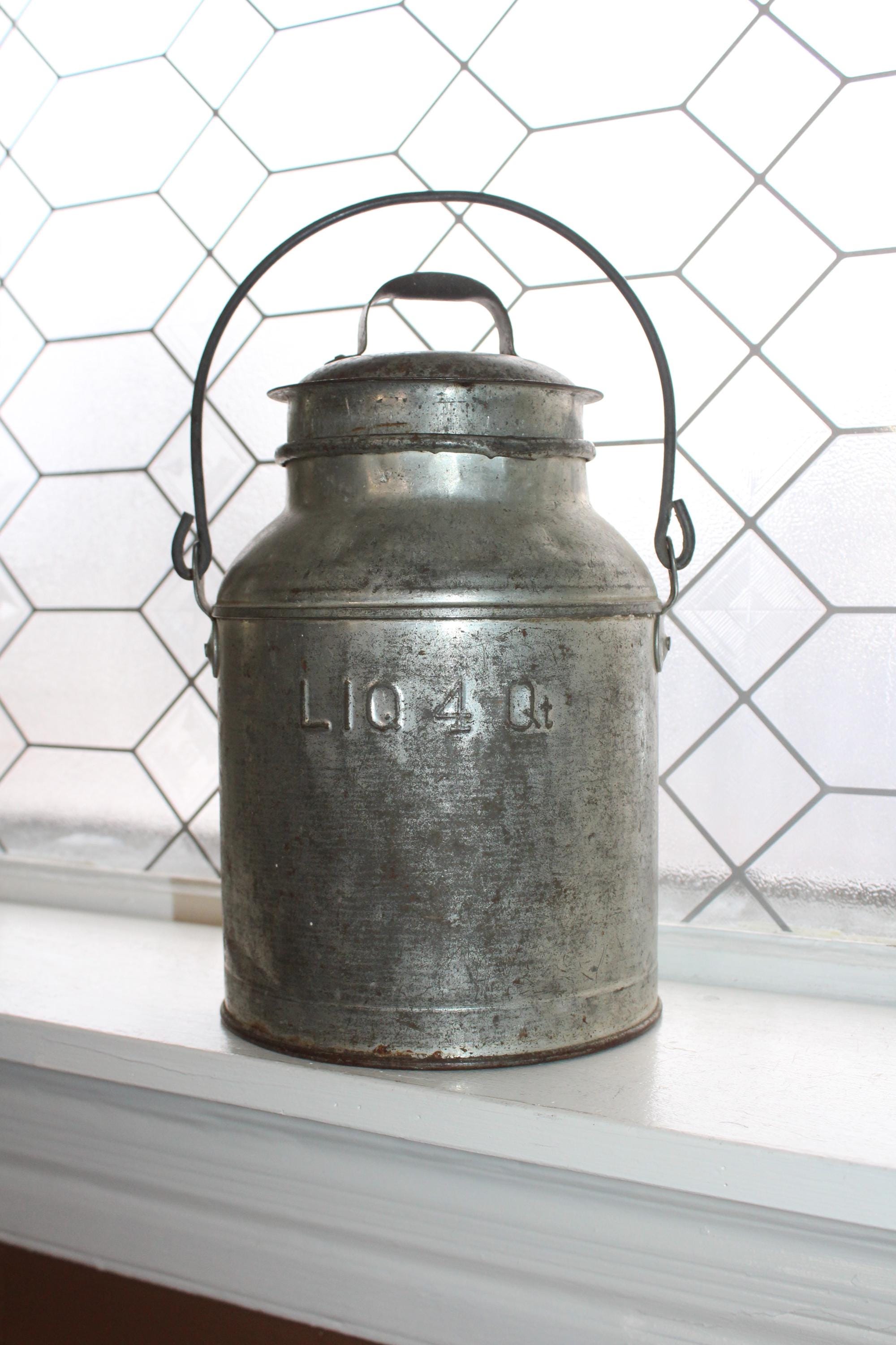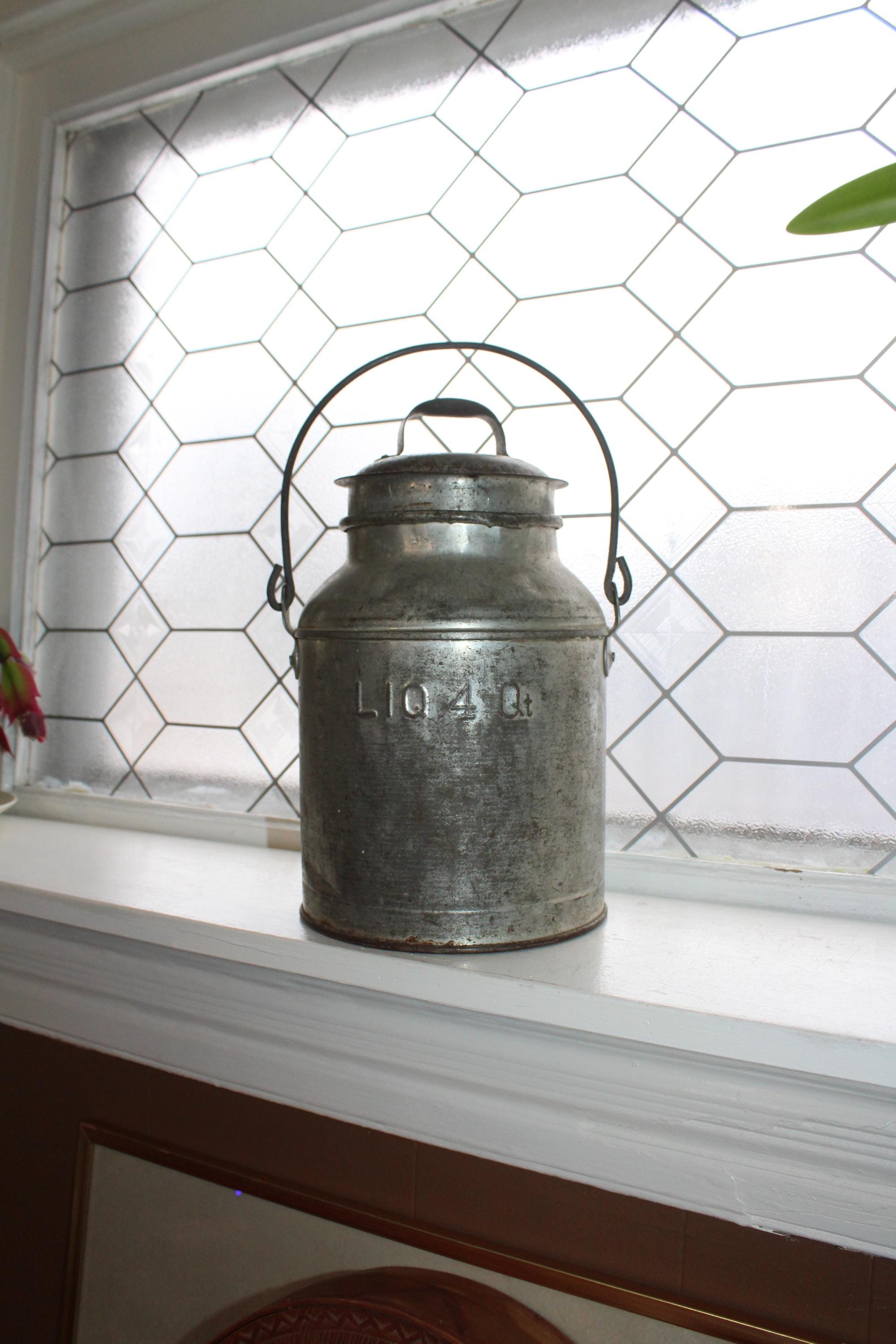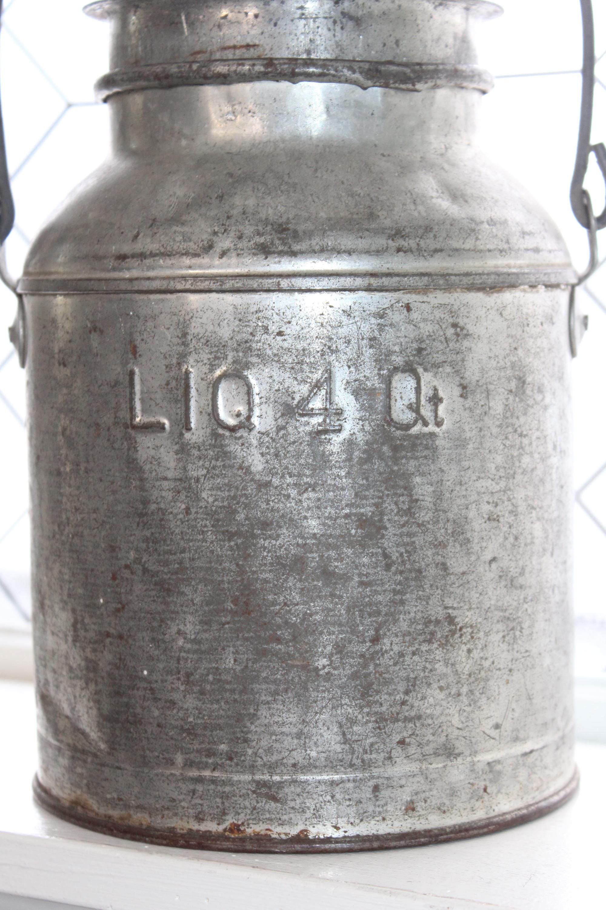 Vintage 4 quart metal cream can/small milk can with lid and swinging bale handle, in good condition and great for display in a country home. The can measures 11" high to the top of the lid handle. Age appropriate wear, displays very well. Enjoy!