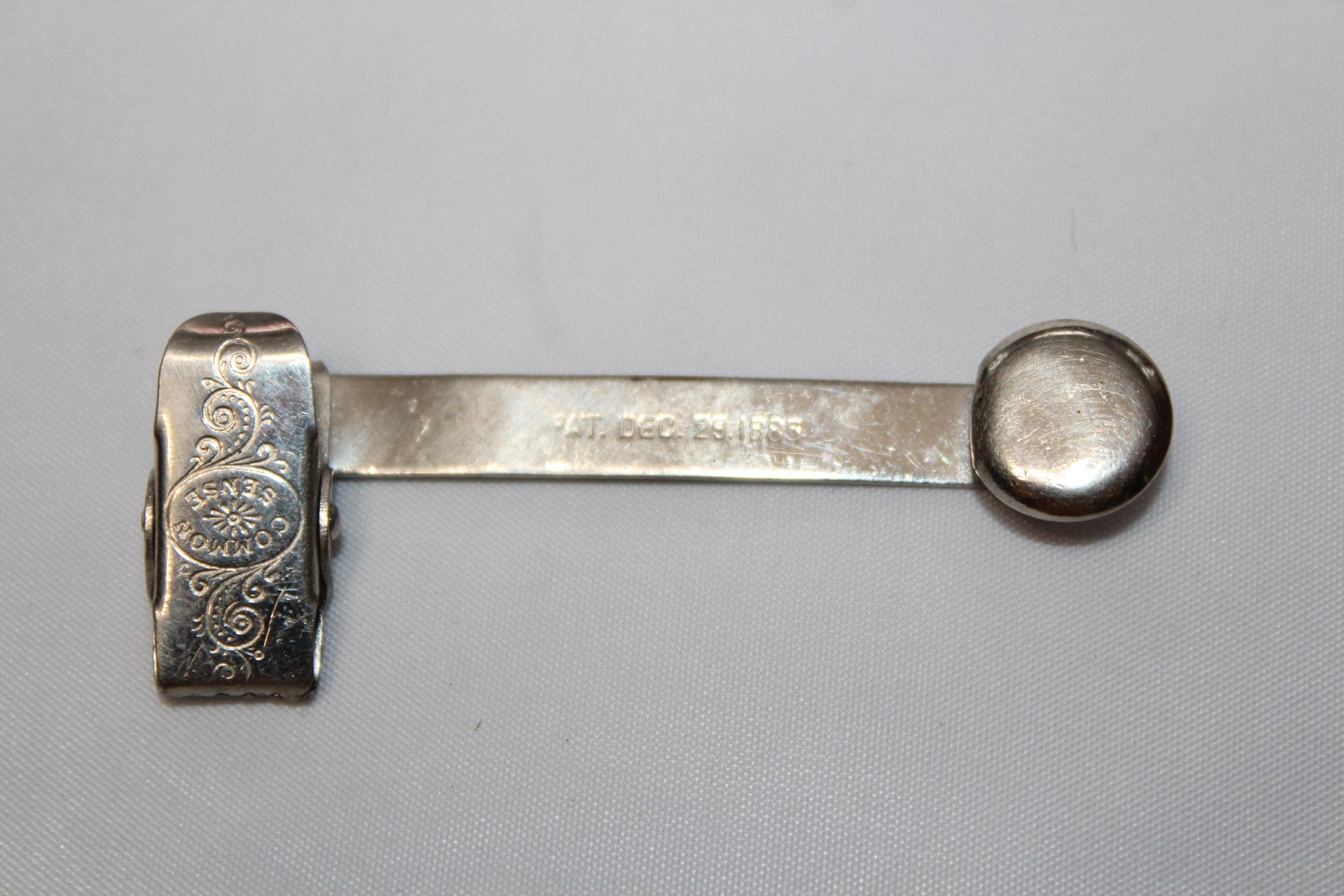 The antique Common Sense cheat cuff clip is a vintage card cheat tool from the past, patent date 1885, designed by the brand Common Sense and similar to the Wizard brand. Handy for gambling, magic tricks and more! It measures 2 1/2" long. Enjoy!