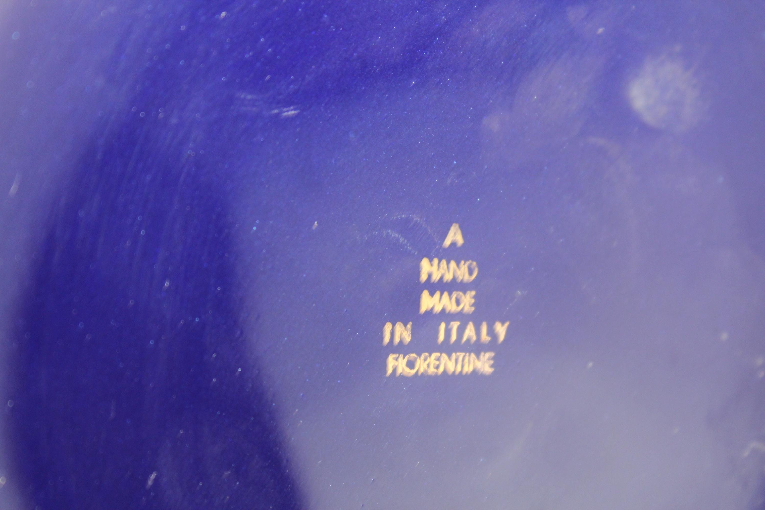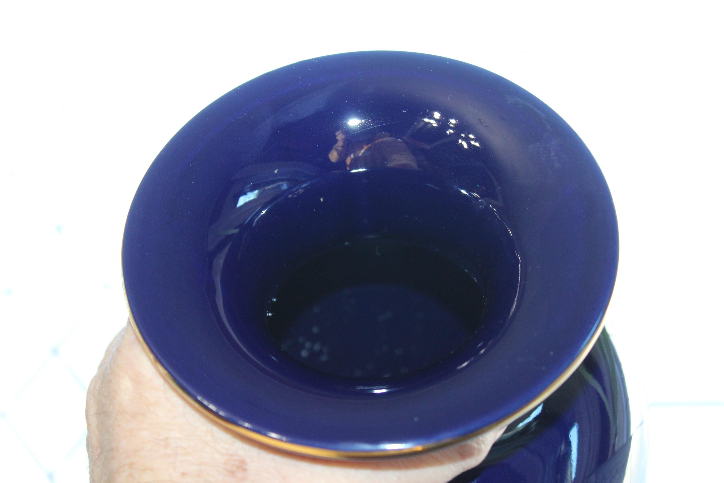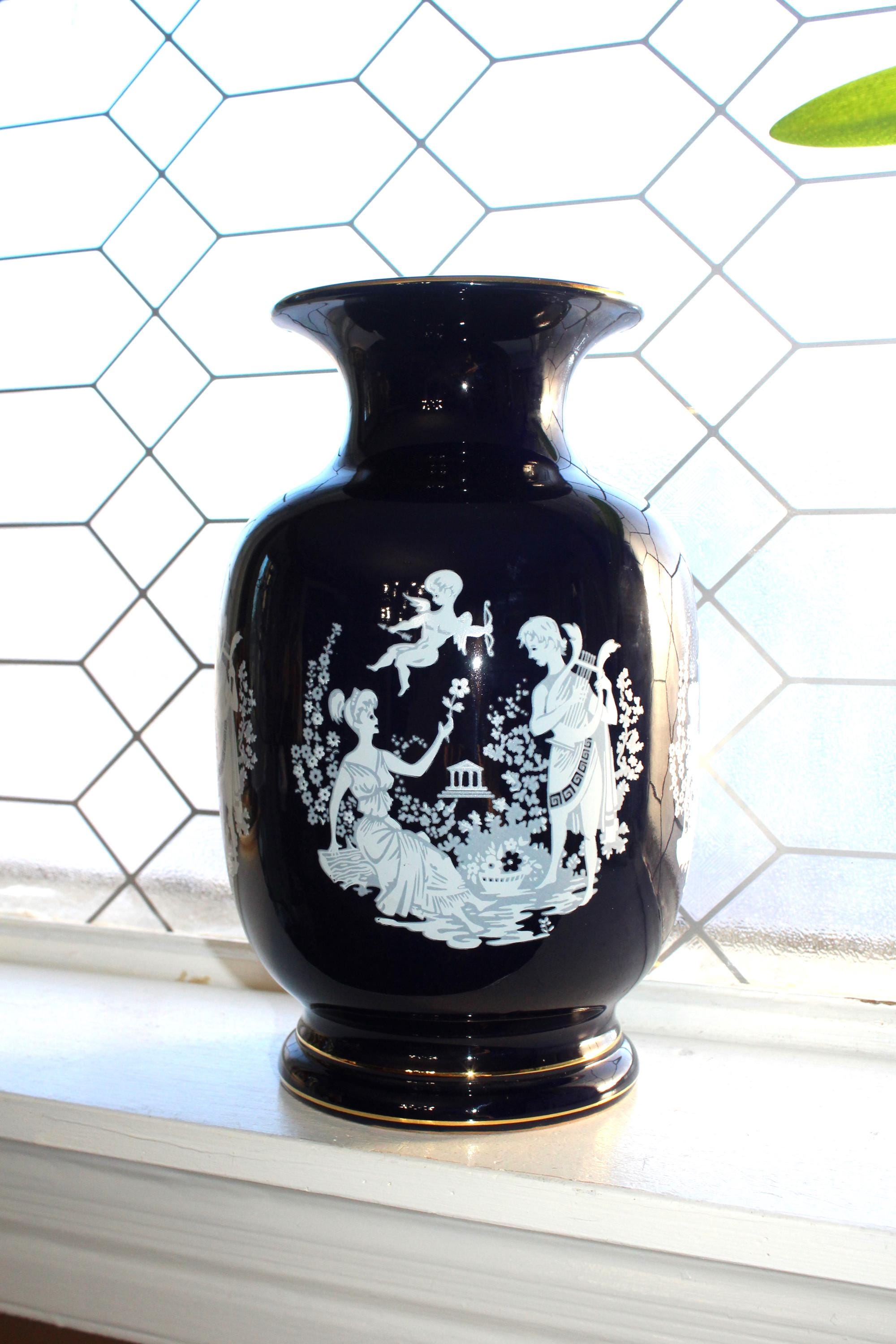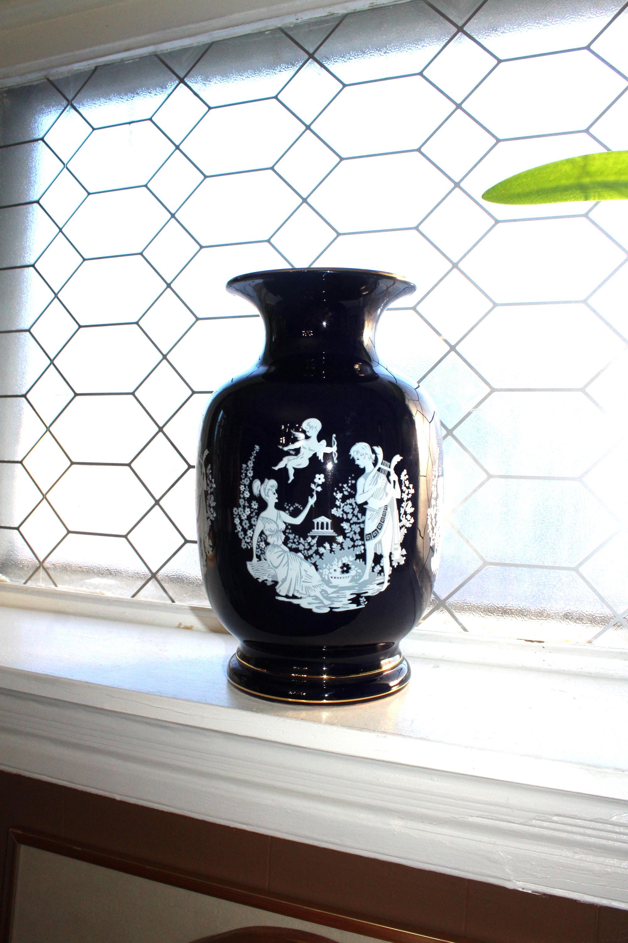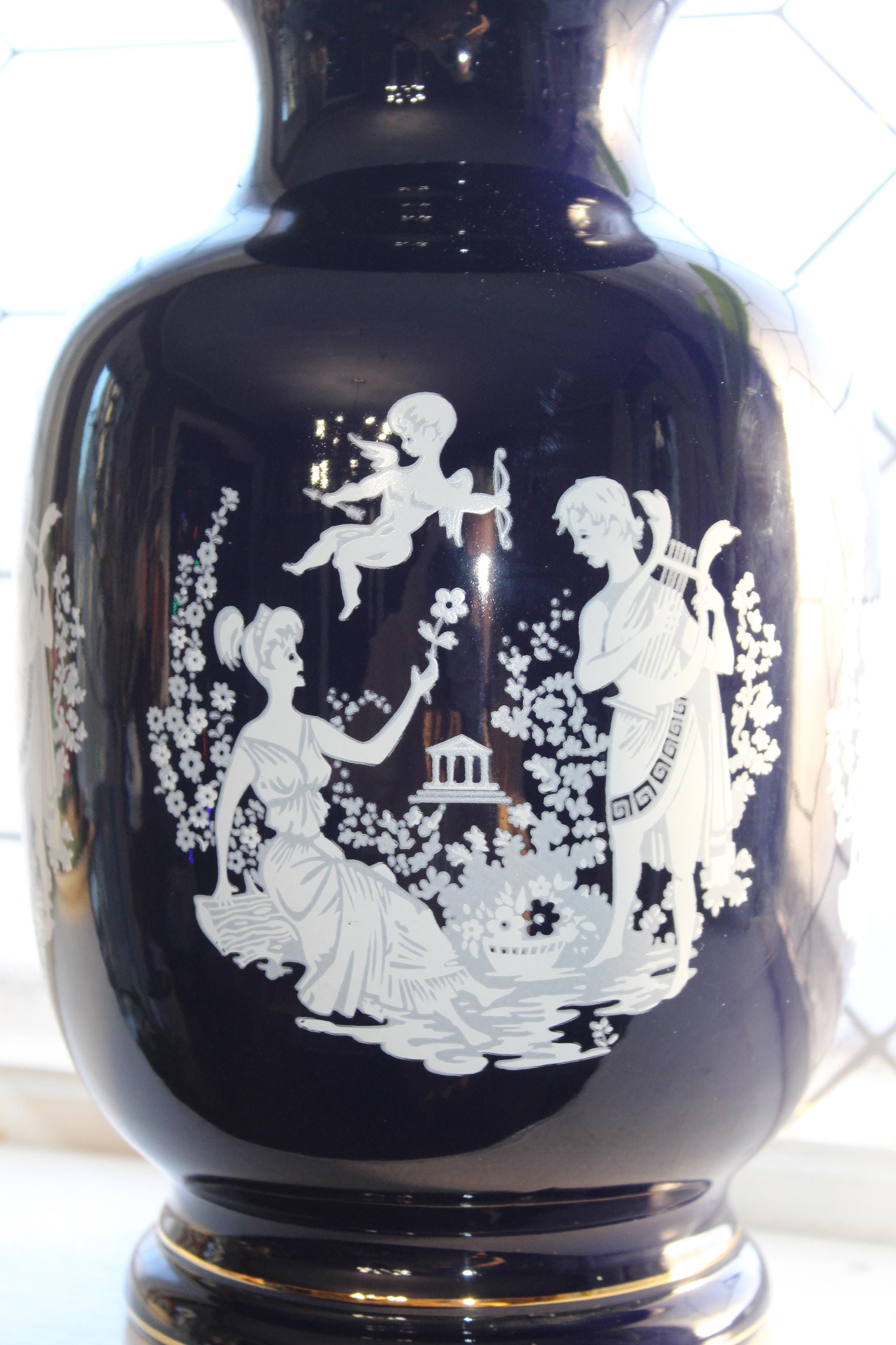 This is a large vintage Fiorentine Italy vase featuring a courtship scene with cupid in white on cobalt blue with gold trim, in excellent condition. It measures 12 1/4" high and weighs 5 1/4 lb. No chips or cracks, perfect for use or display. Enjoy!