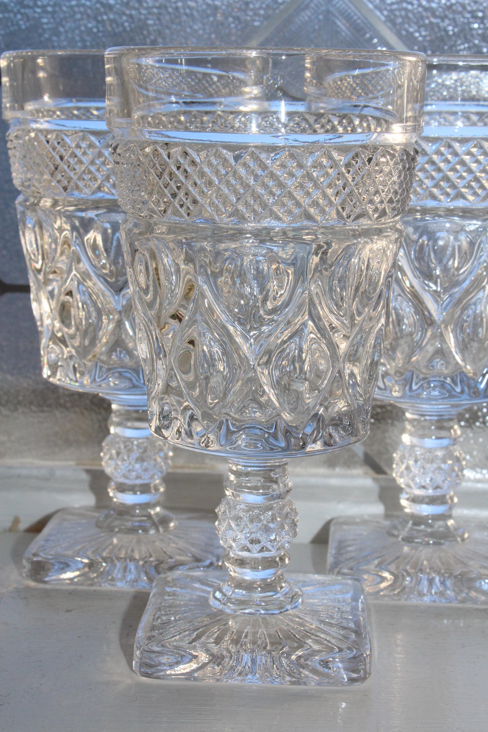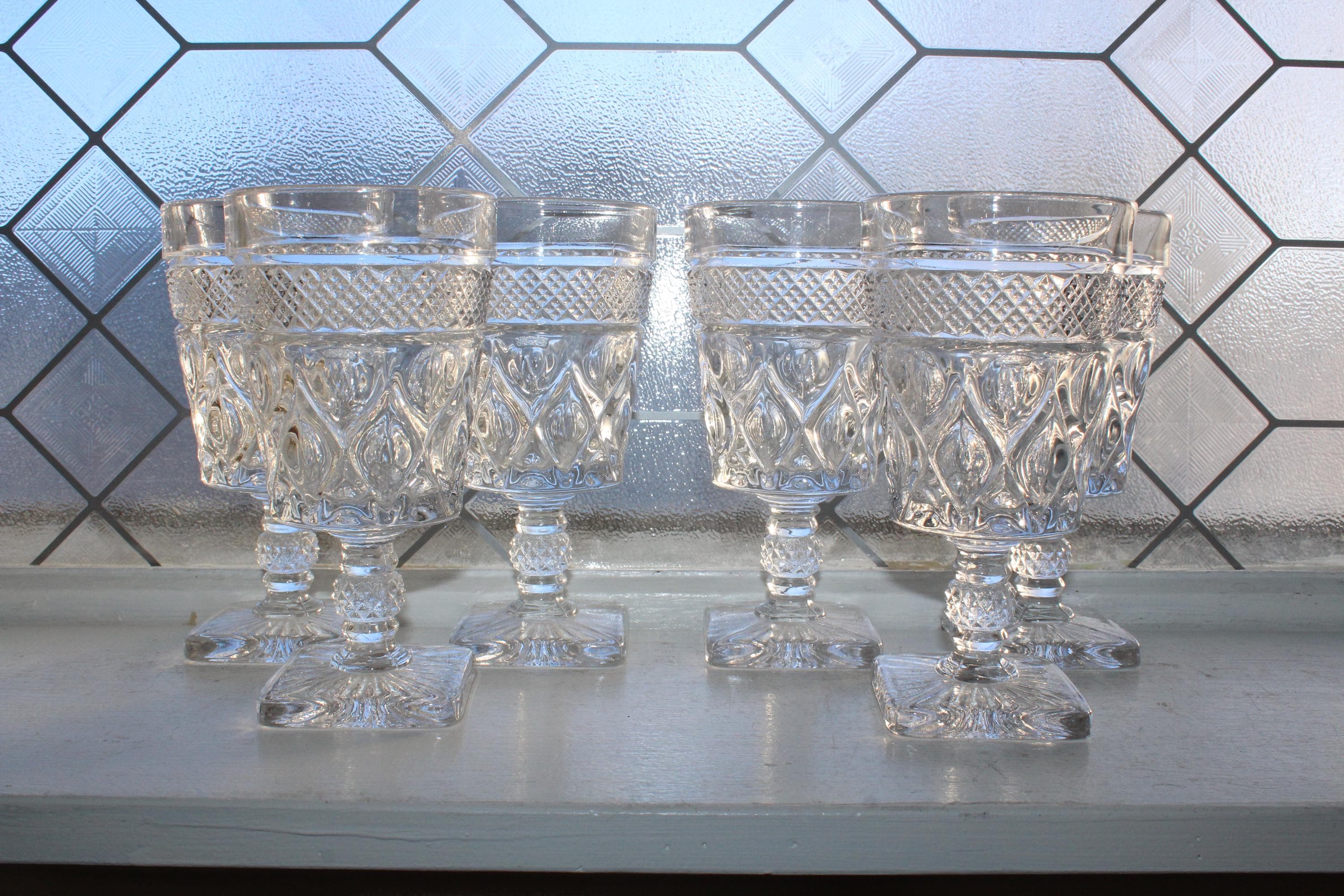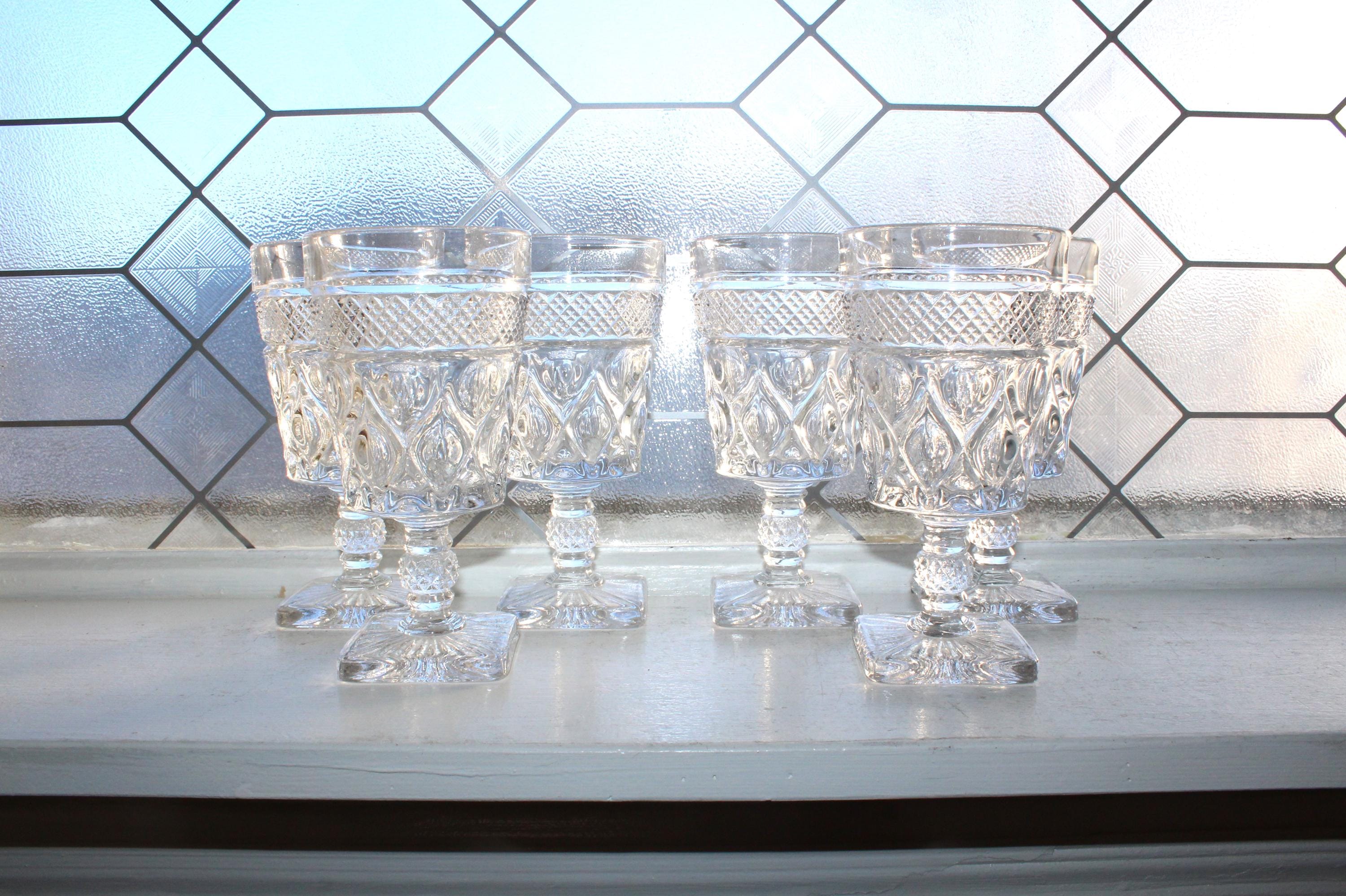 6 vintage glass water goblets in the Cape Cod pattern by Imperial Glass- Ohio, in excellent condition. They measure 6 1/4" high. No chips or cracks, great for use or display. Enjoy!