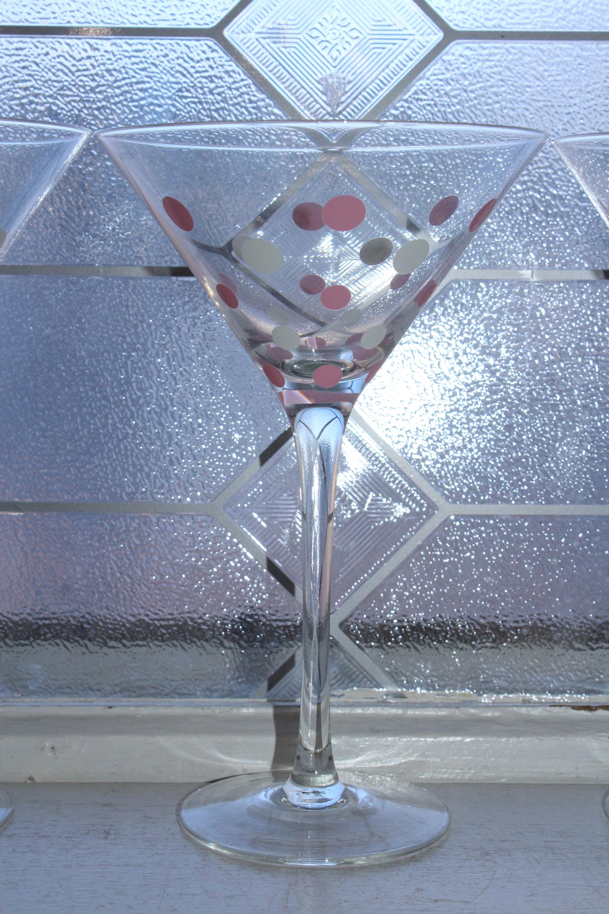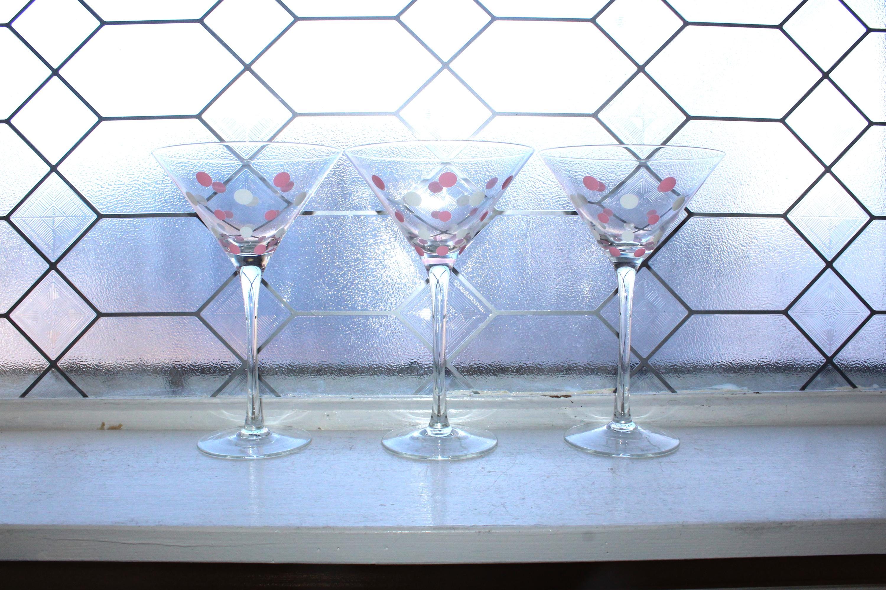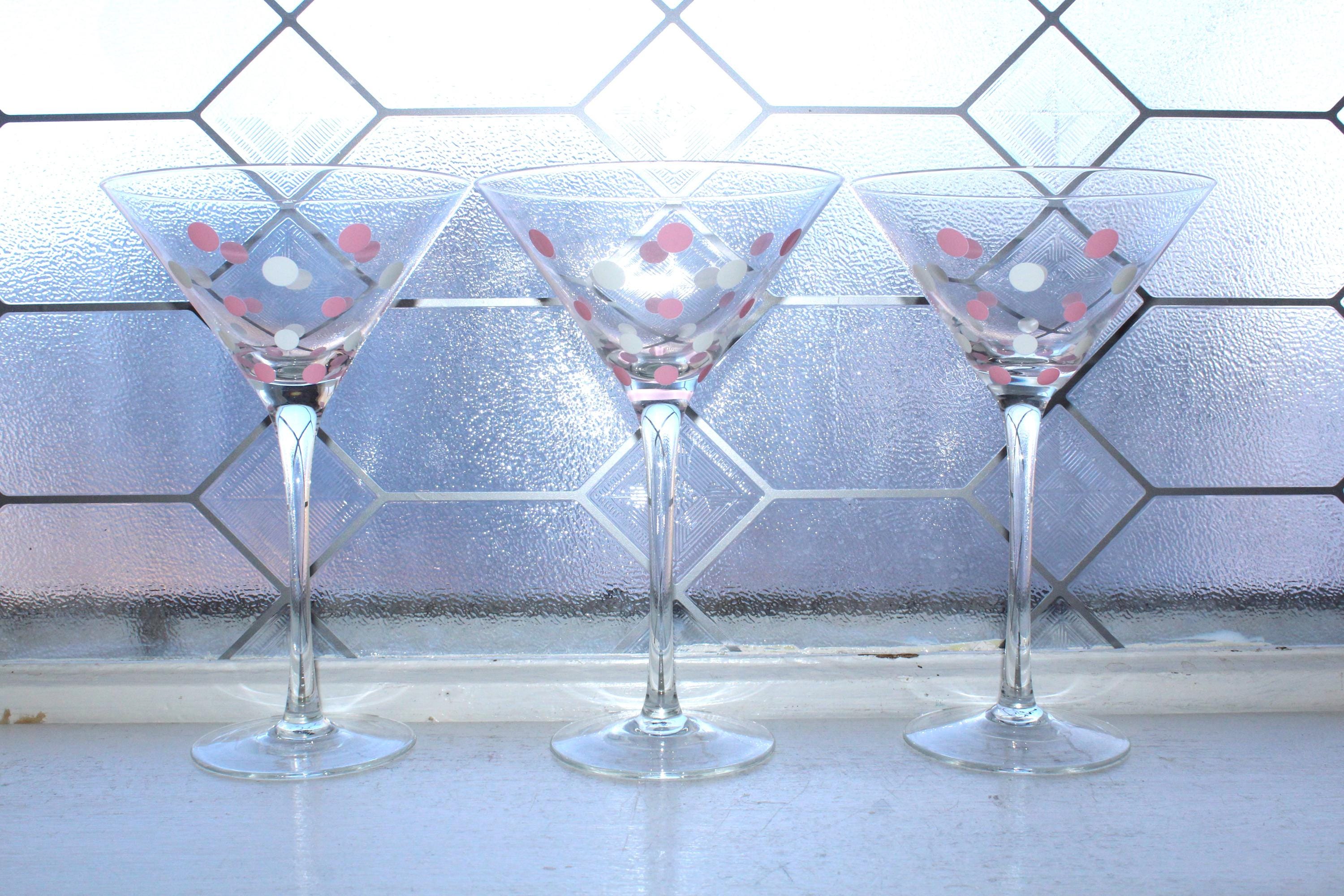 Set of 3 Pampered Chef pink and white polka dot oversized martini glasses, in excellent condition. Each glass measures 7 5/8" high. No chips or cracks, perfect for use or display. Enjoy!