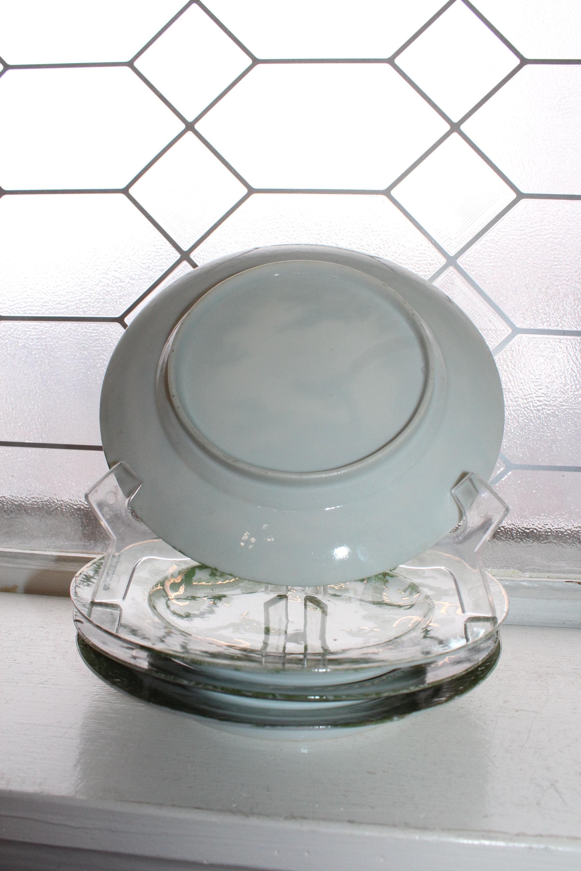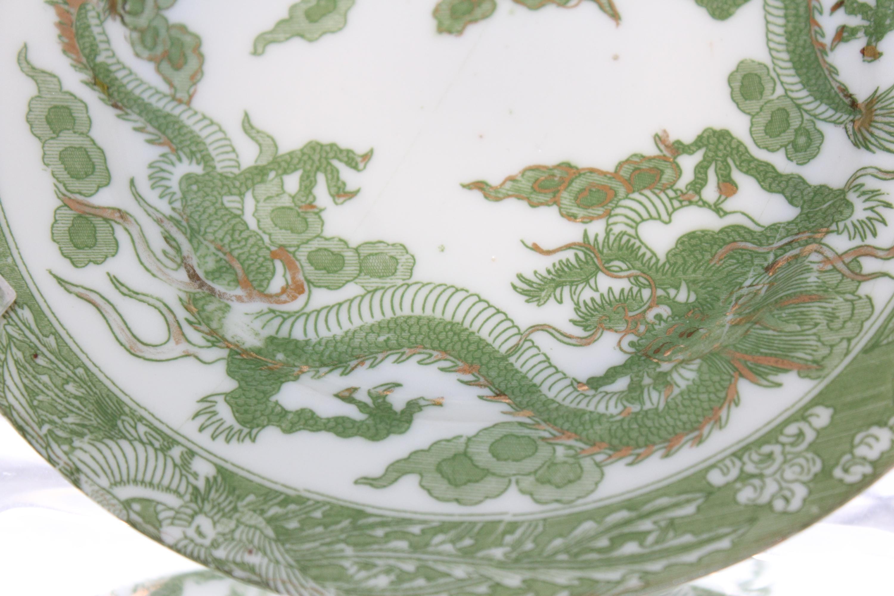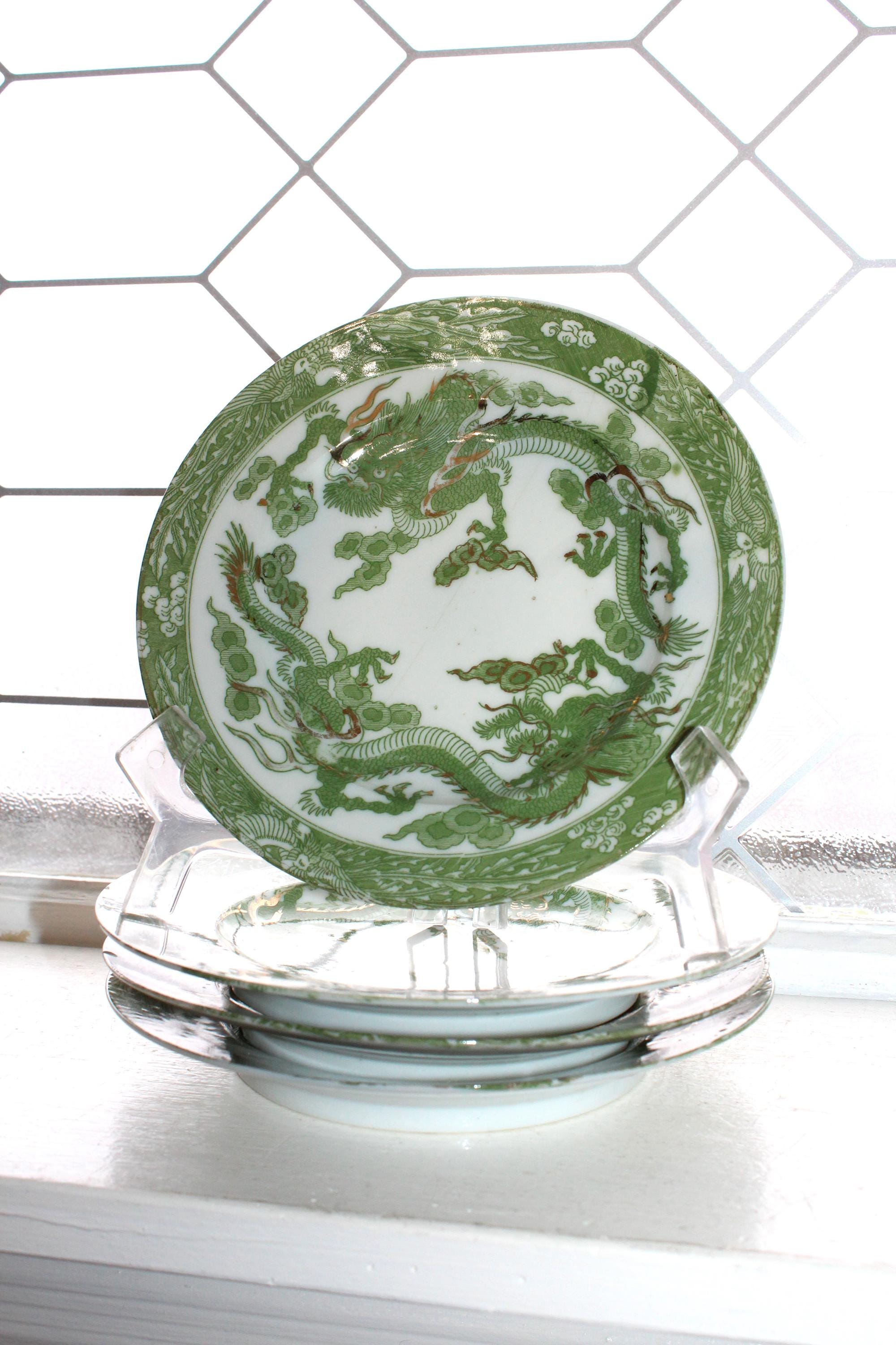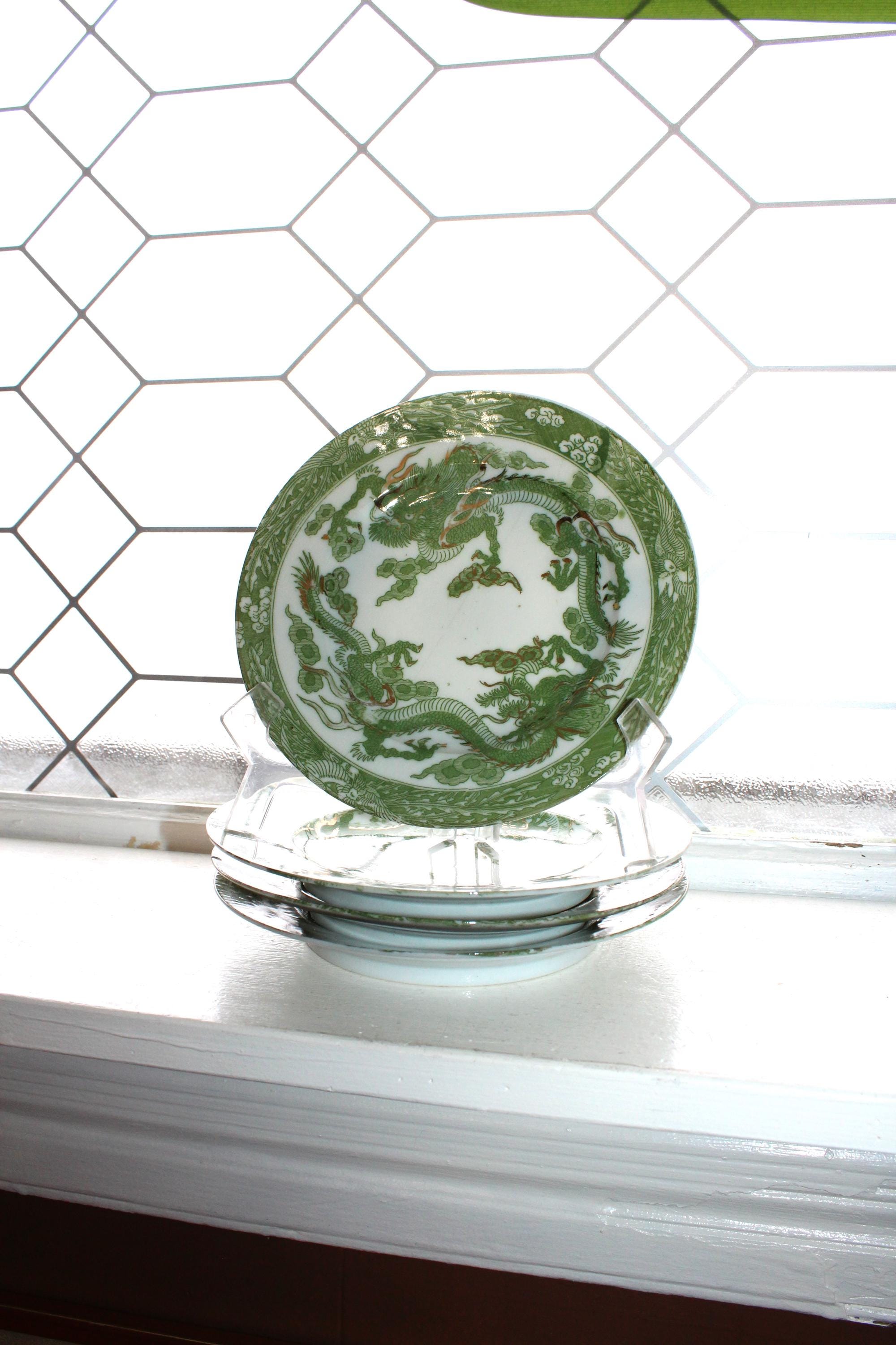 This is a set of 4 antique Japanese Dai Nippon Nakajima green dragonware porcelain plates dating from the late 1800s to pre 1921. Each one measures 7 1/4" wide. There are a couple of small rim chips as shown in the photos, not terribly distracting, and they display very well. Enjoy!