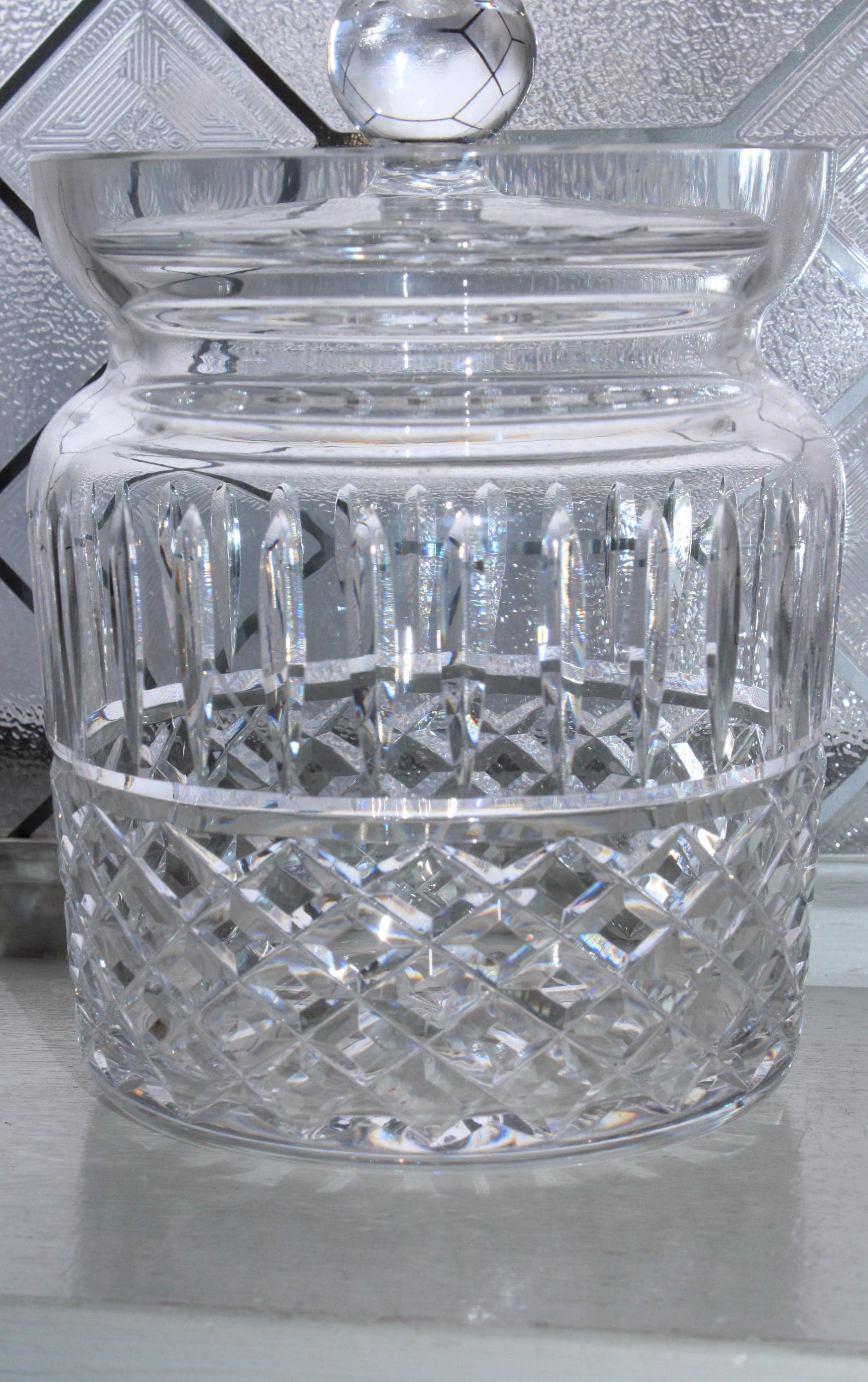 Waterford crystal Maeve biscuit barrel, in excellent condition. It measures 7" high and weighs 3 1/4 lbs. No chips or cracks, perfect for use or display. Enjoy!