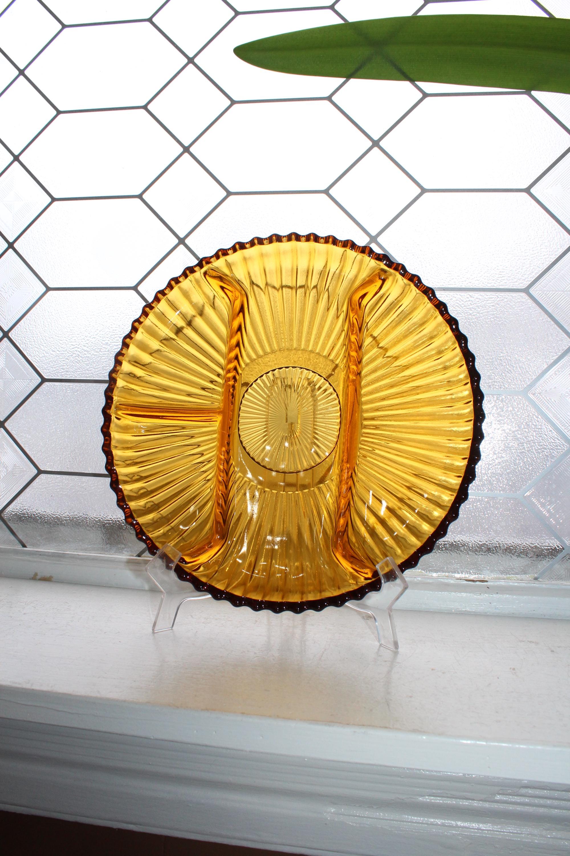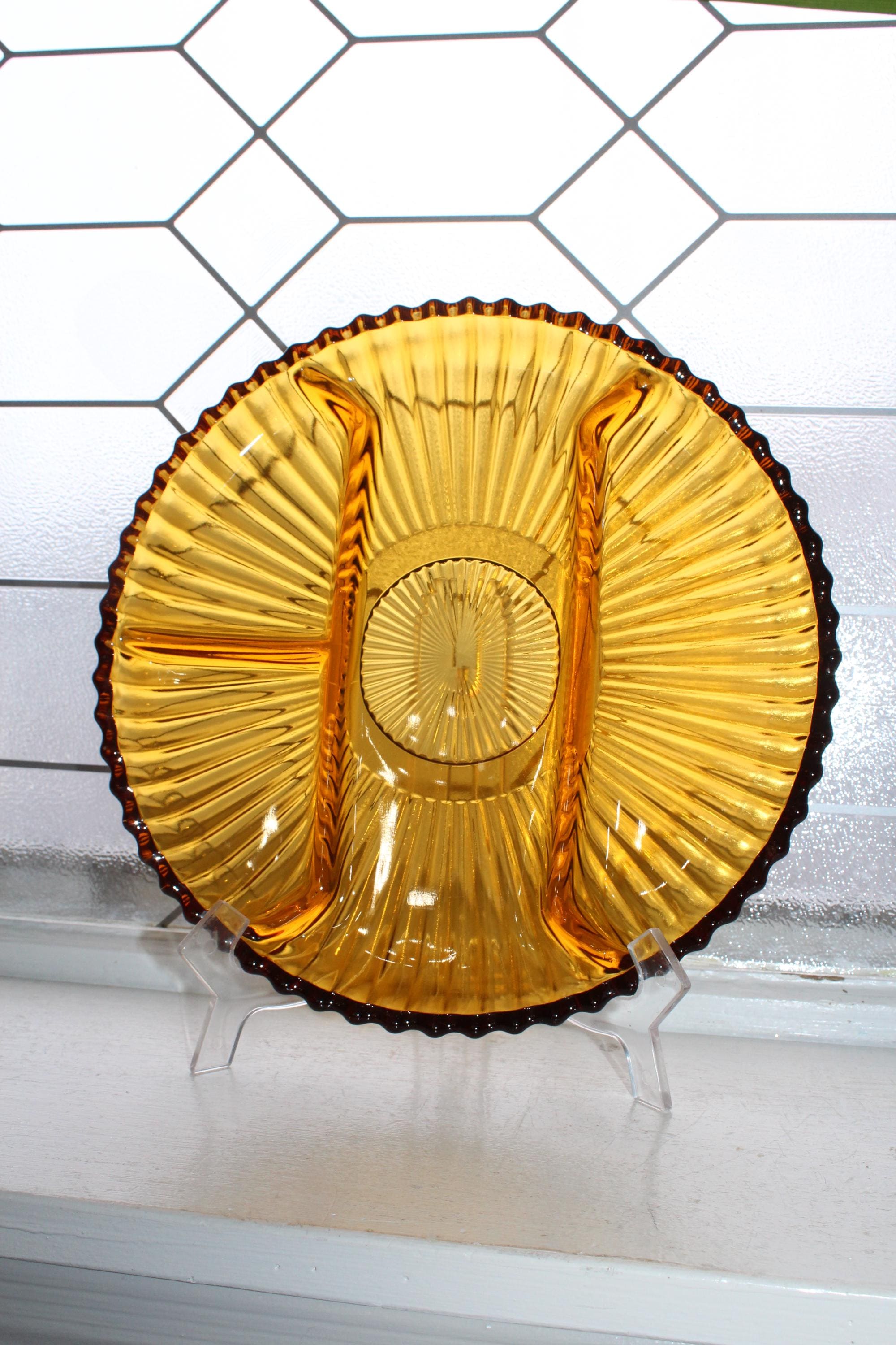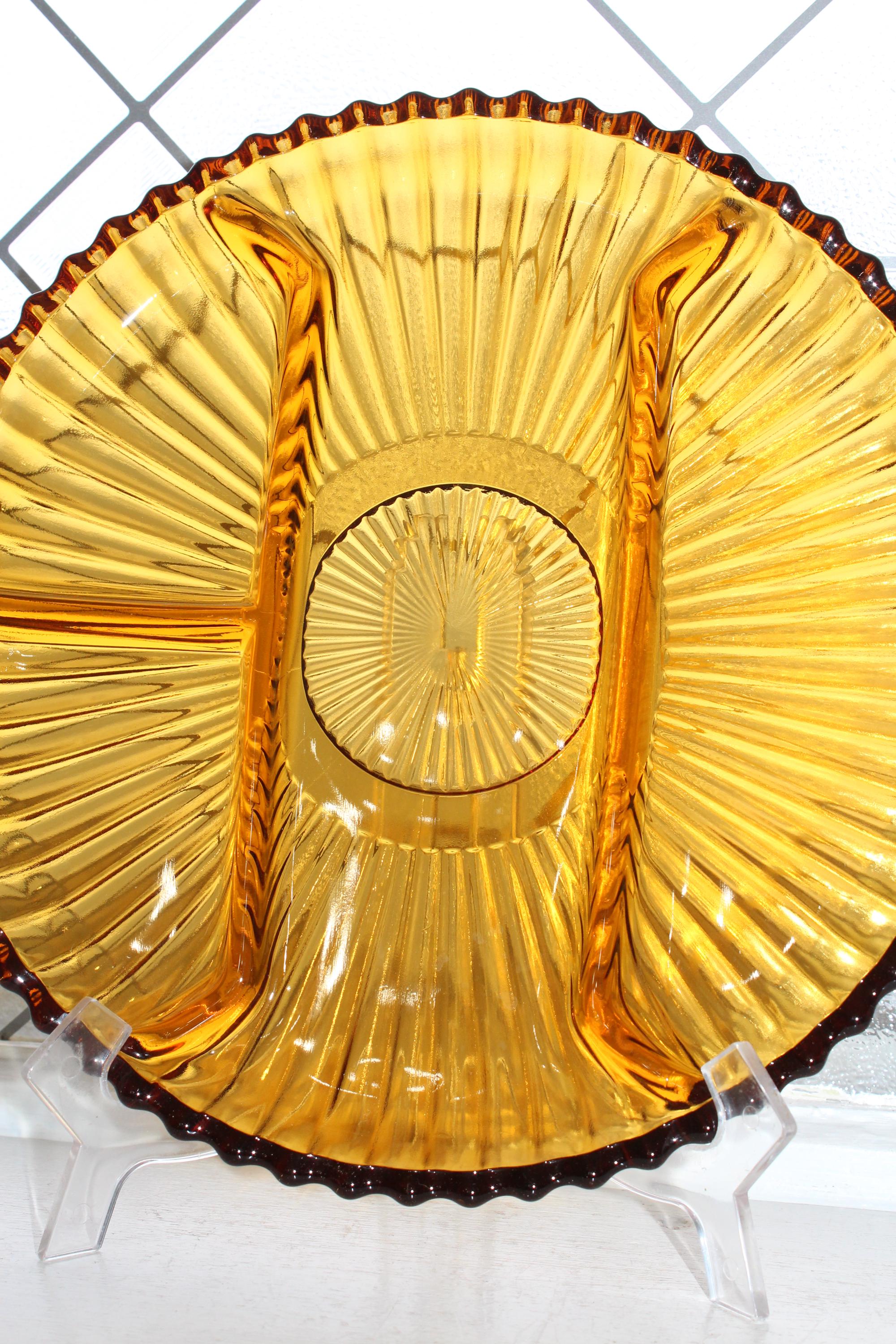 Vintage Indiana Glass amber ribbed 4-part divided relish dish, in excellent condition. It measures 10" wide and weighs just over 2 1/4 lbs. No chips or cracks, perfect for use or display. Enjoy!