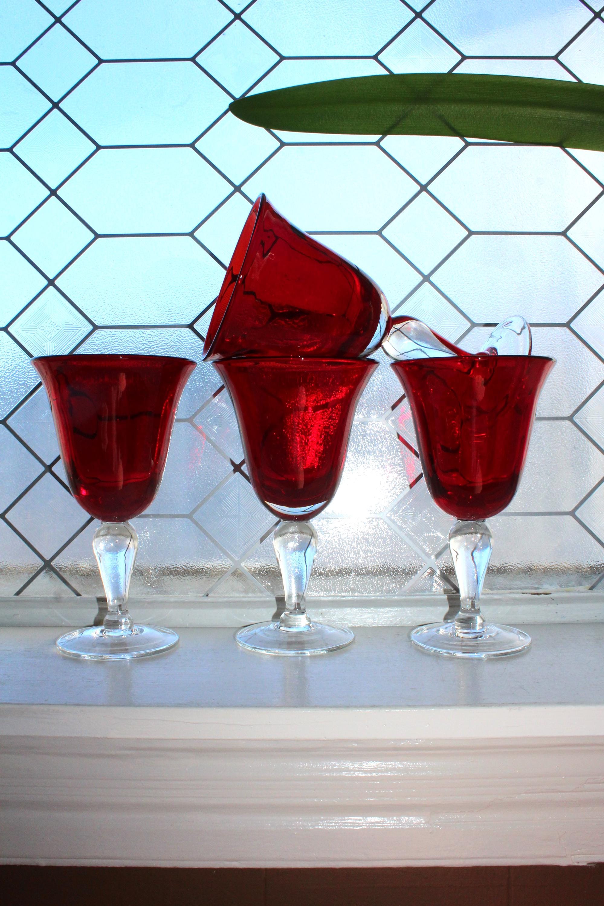 This is a set of 4 beautiful vintage Iris ruby red Artland glass oversized goblets, in excellent condition. Each measures 7 3/4" high x 4 5/8" wide at the rim and weighs just over 1 lb. No chips or cracks, excellent condition. THERE ARE 3 SETS OF 4 AVAILABLE VIA THE DROP DOWN BOX. Enjoy!