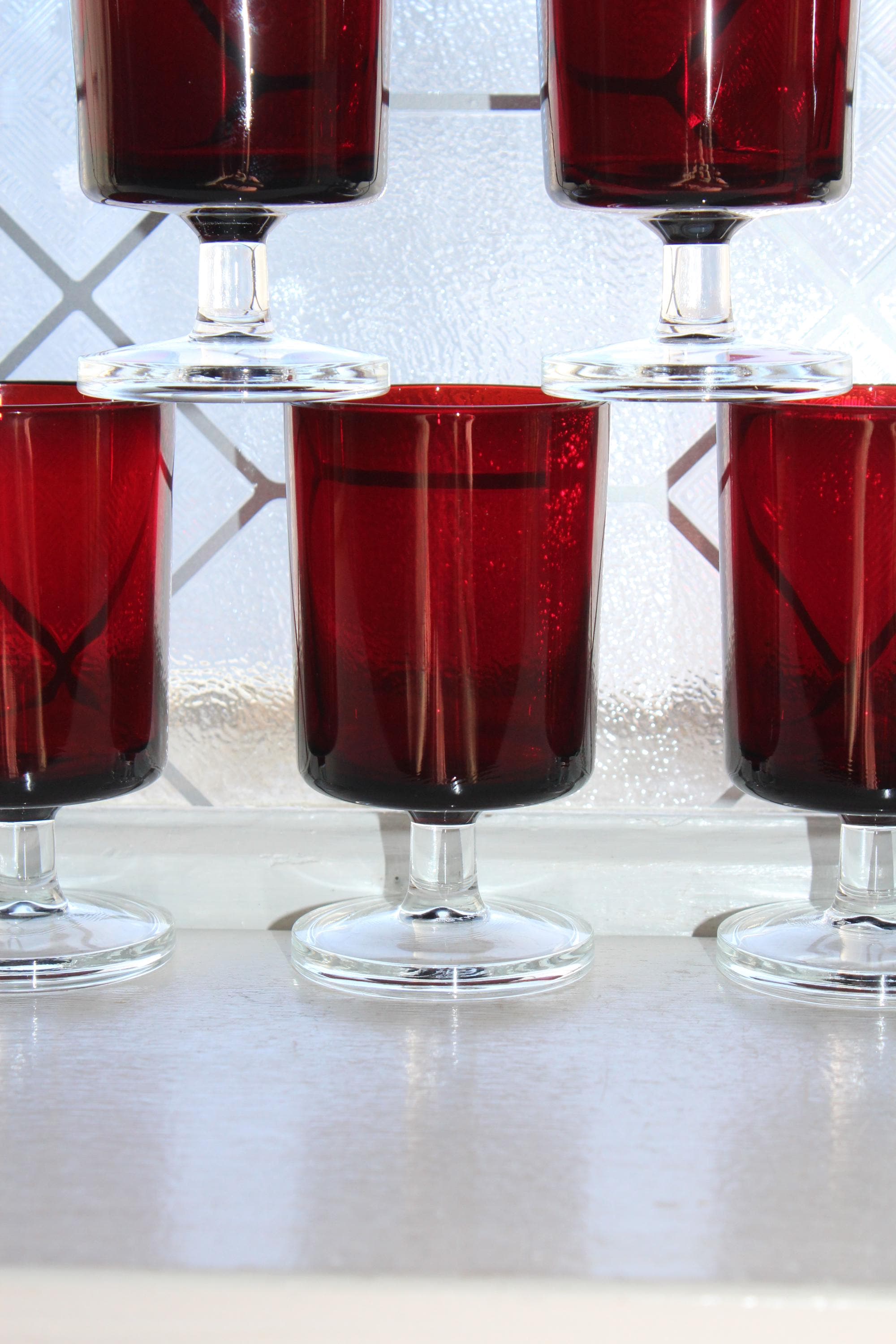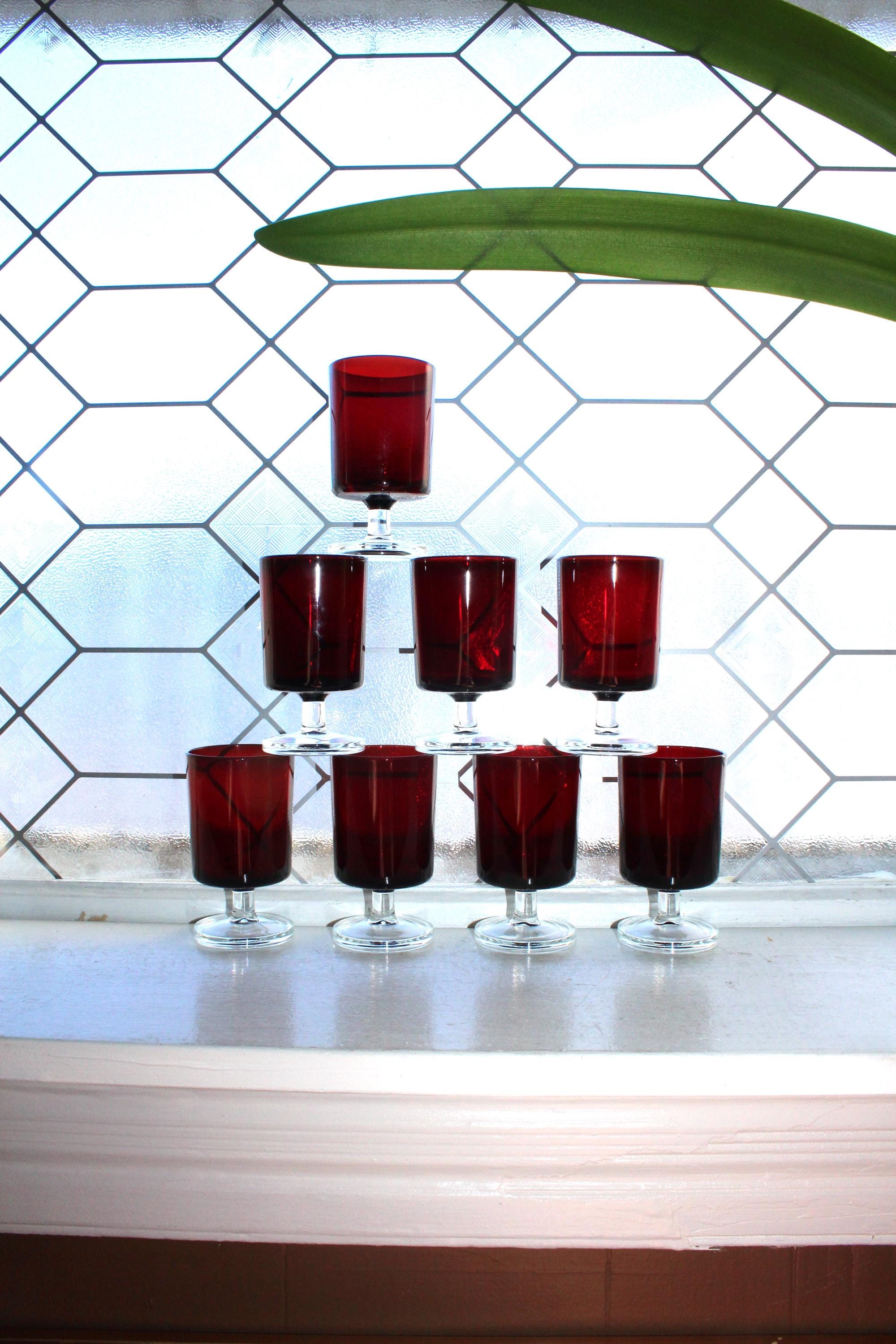 Set of 8 vintage French Luminarc Cavalier ruby red small wine glasses, in excellent condition. Each one measures 4 1/8" high. THERE ARE 2 SETS OF 8 AVAILABLE VIA THE DROP DOWN BOX. Enjoy!