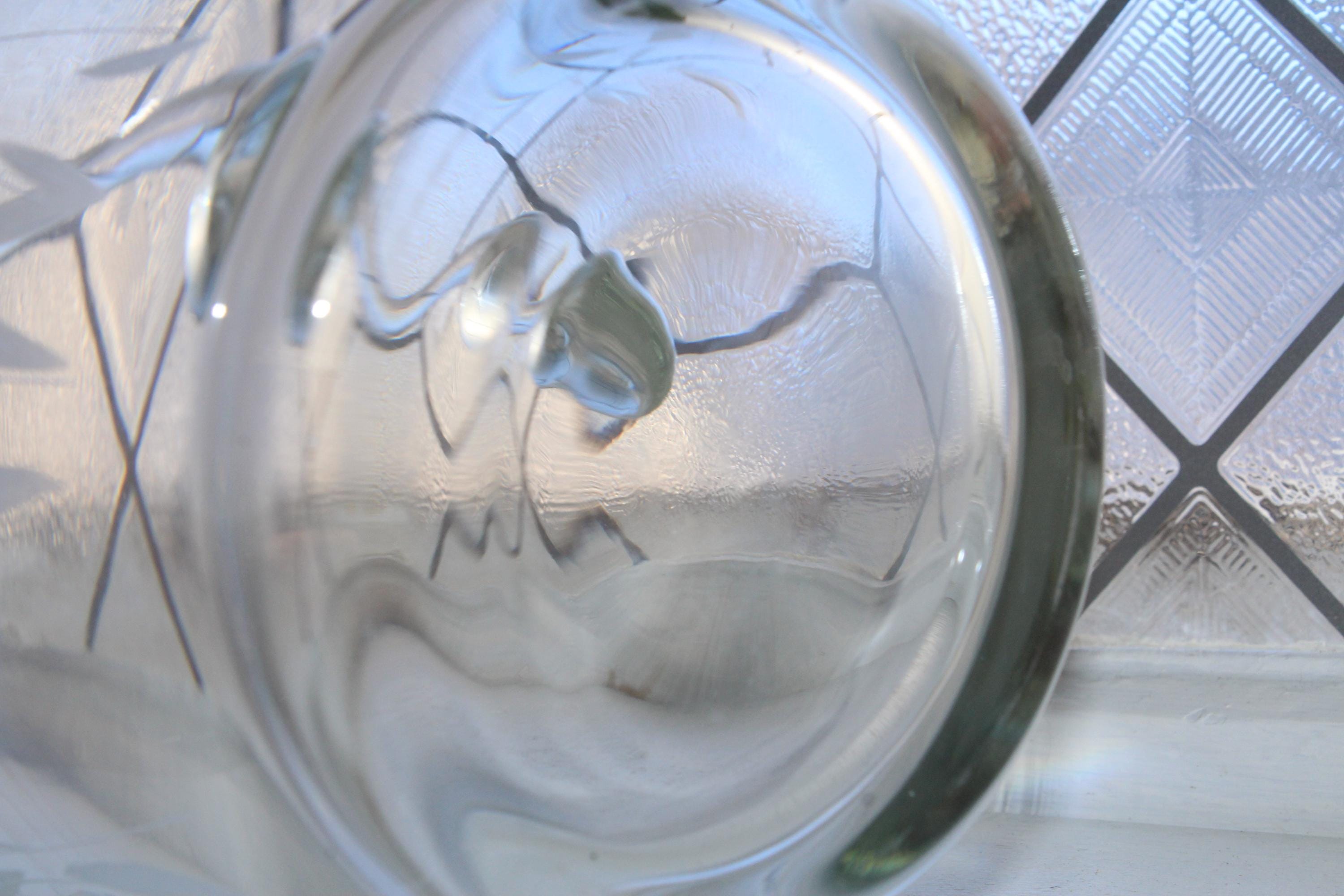This is a gorgeous Mid Century cut glass wine decanter with a retro floral cut pattern, in excellent condition. It measures 13 1/2" high to the top of the stopper. No chips or cracks, great for use and display. Enjoy!
