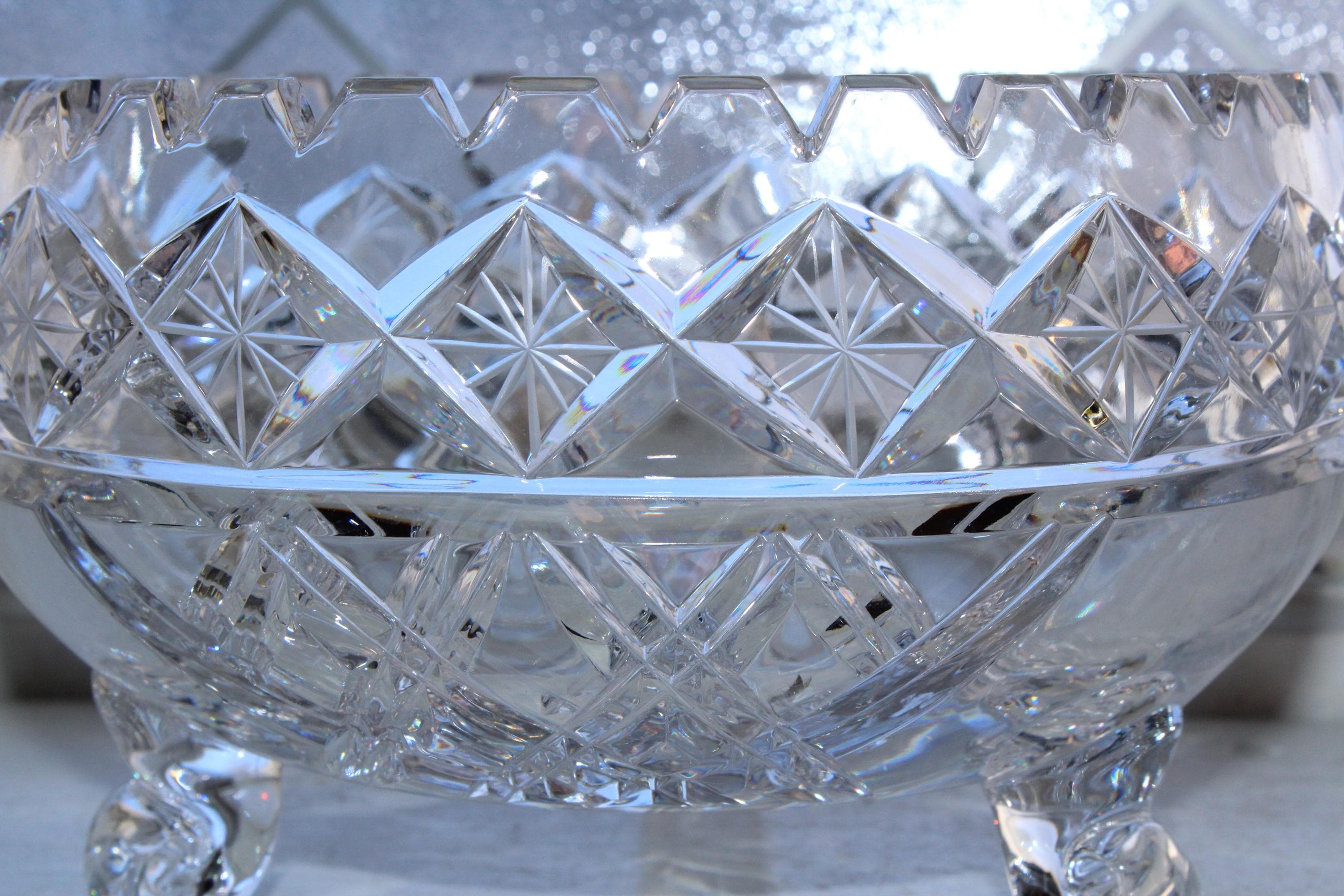 Elegant cut crystal footed bowl featuring a cut star and criss cross pattern with sawtooth rim, in excellent condition. It measures 4 1/8" high x 6 3/4" wide at the top and weighs just over 2 1/2 lbs. No chips or cracks, great for use or display. Enjoy!