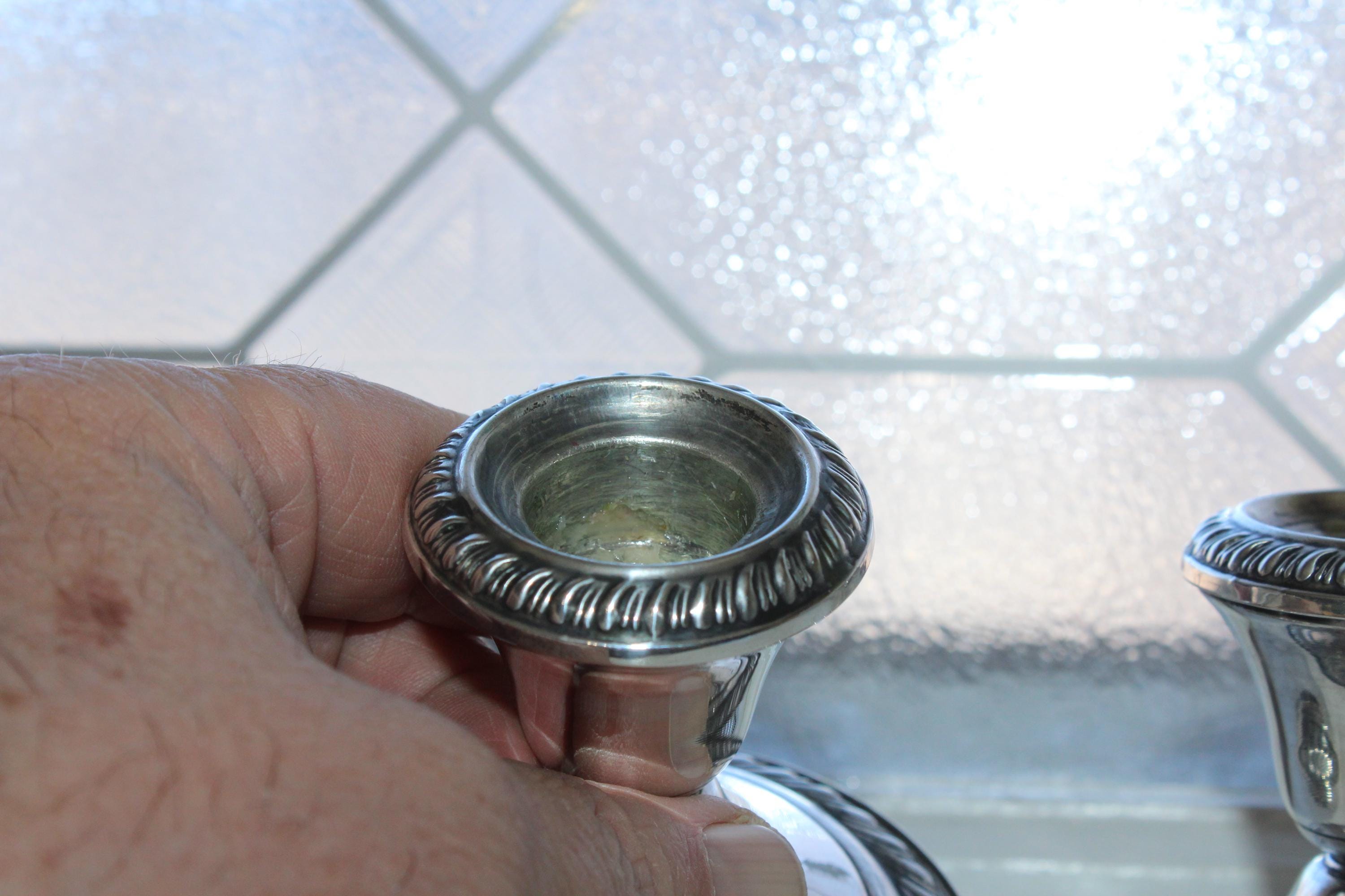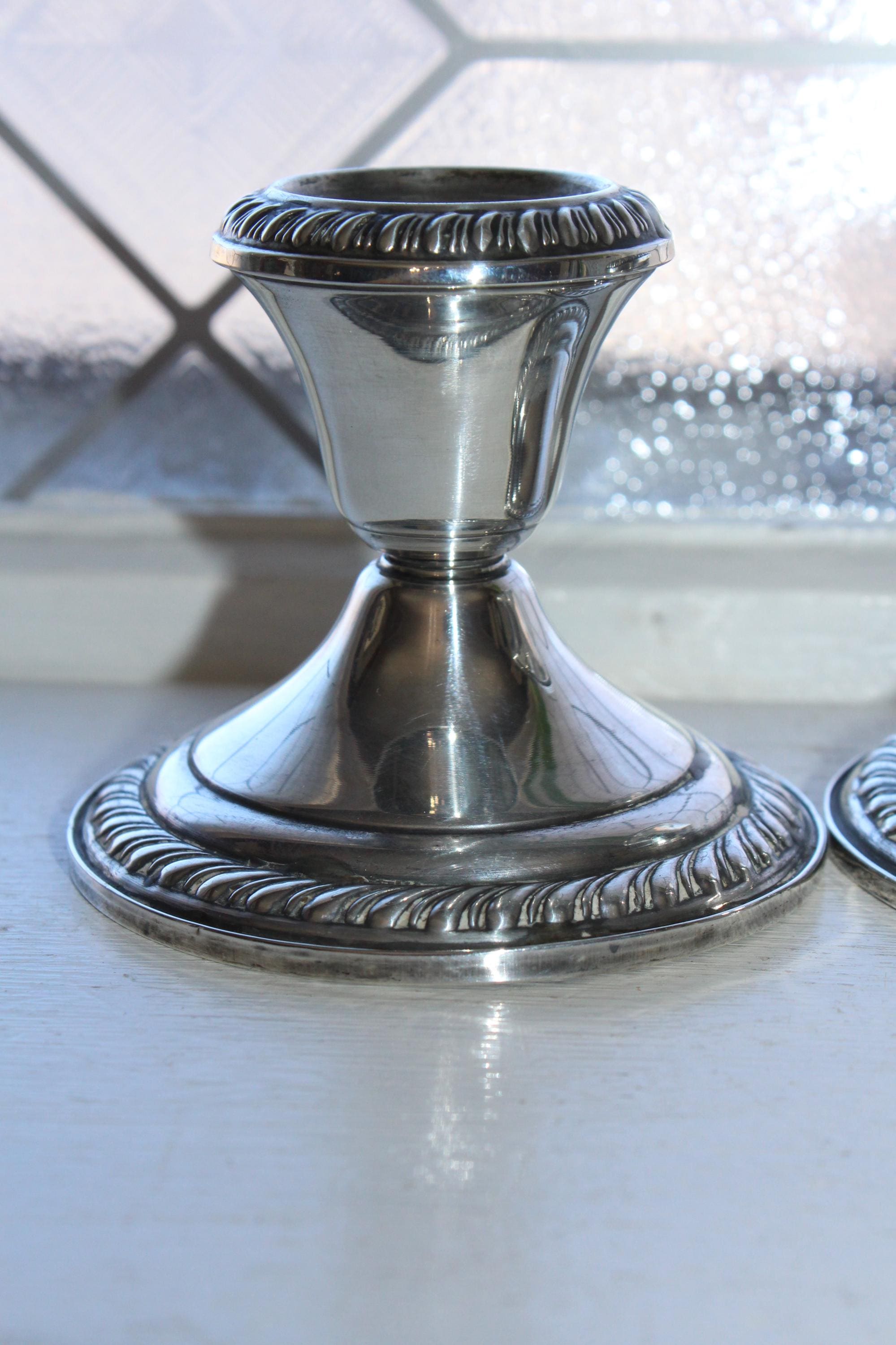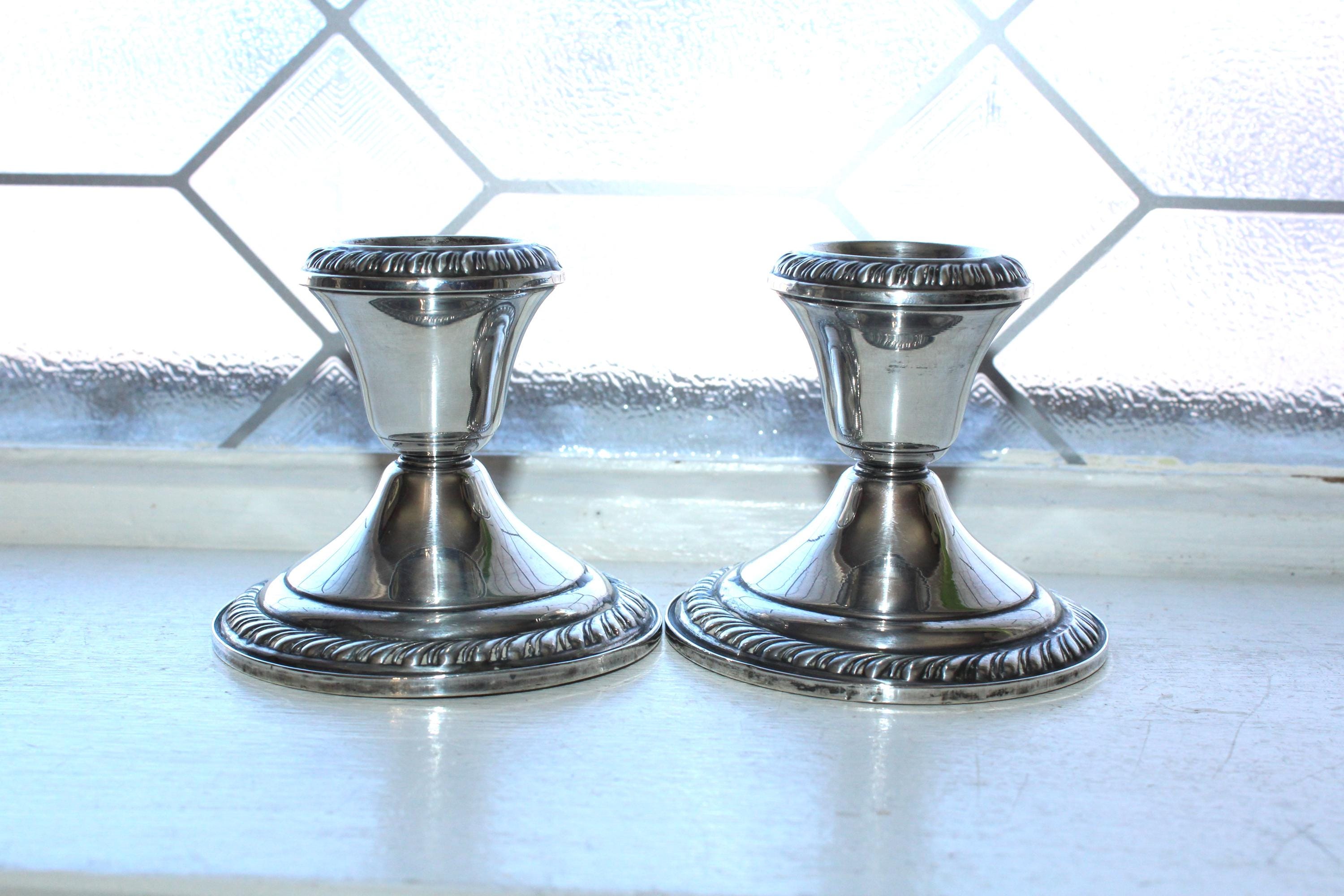 Vintage sterling silver weighted candlestick holder pair made by National, in good condition. Each one measures 3" high x 3 1/4" in diameter at the base. Condition as shown in the photos, they display very well. THERE ARE 2 PAIR AVAILABLE VIA THE DROP DOWN BOX. Enjoy!