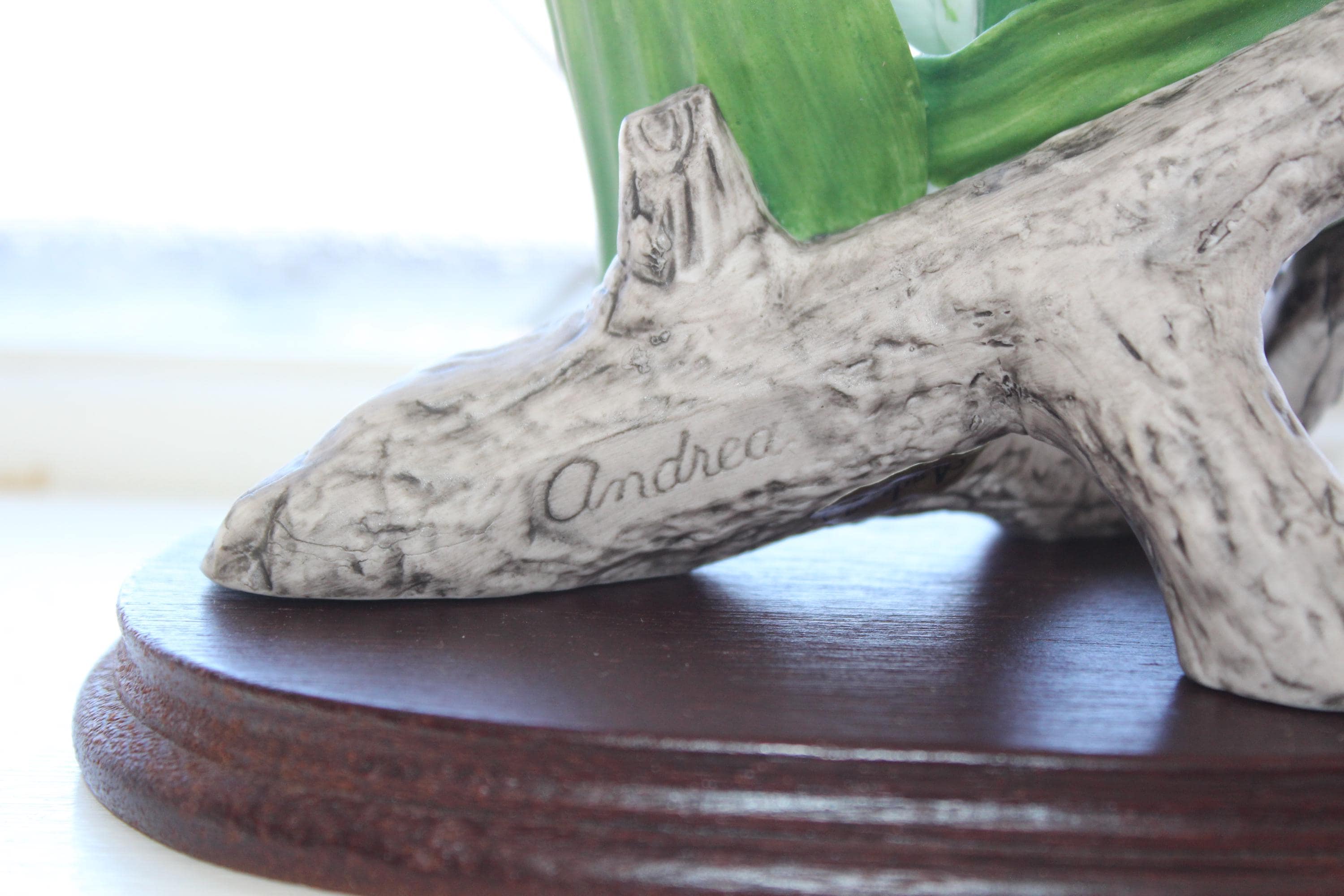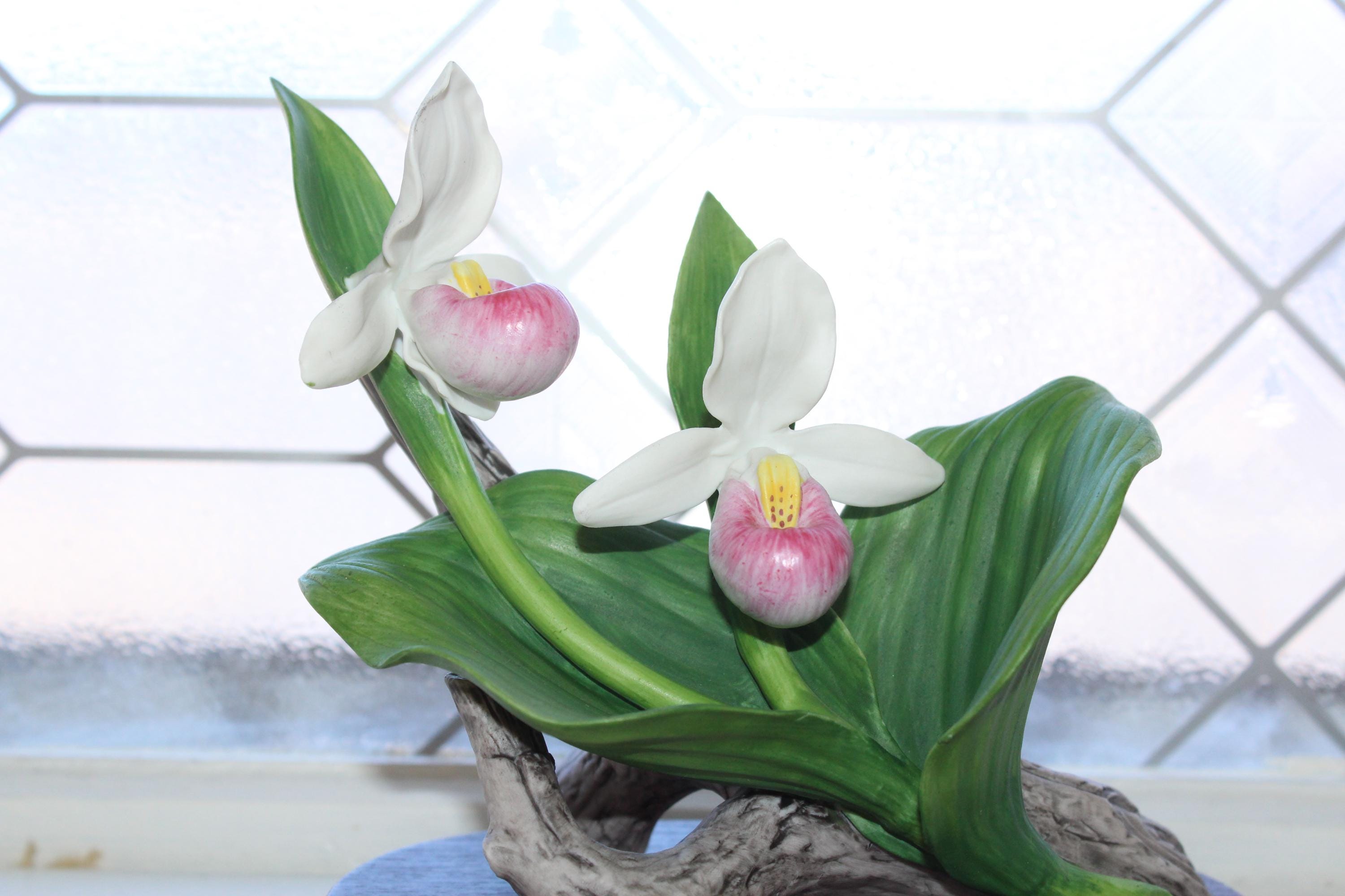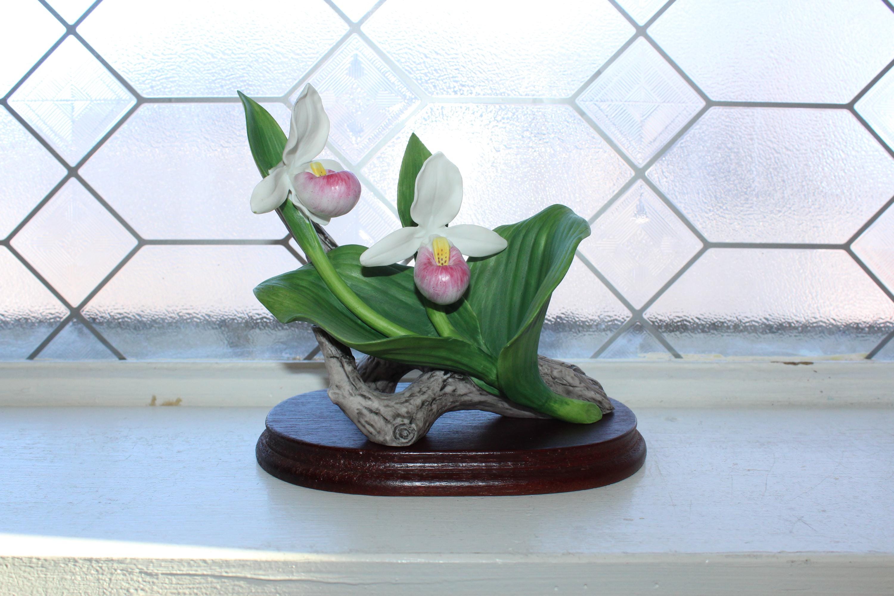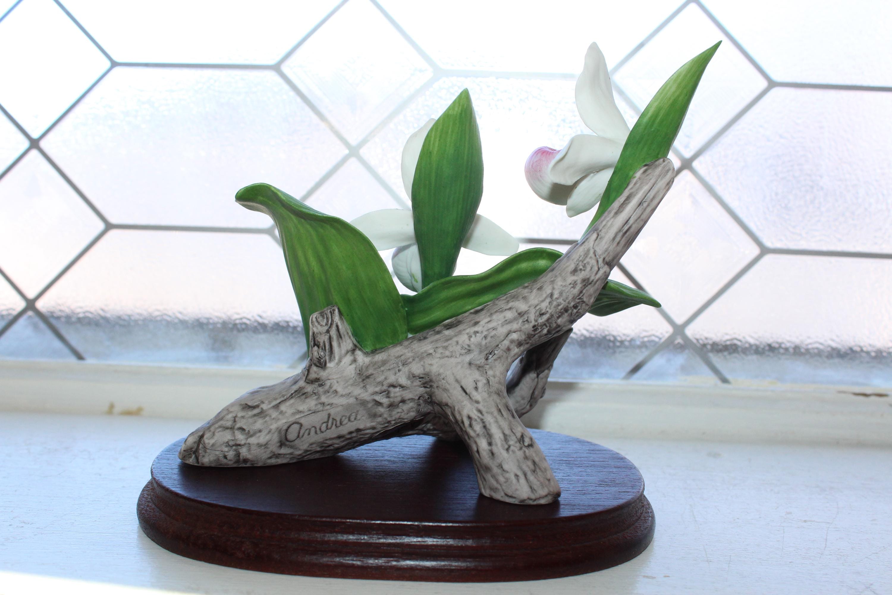 Large vintage porcelain Lady Slipper orchid flower figurine on wood base, marked Andrea by Sadek, in very good condition. It measures 6" high and has no chips or cracks other than a tiny nip on the tip of the highest leaf. Enjoy!