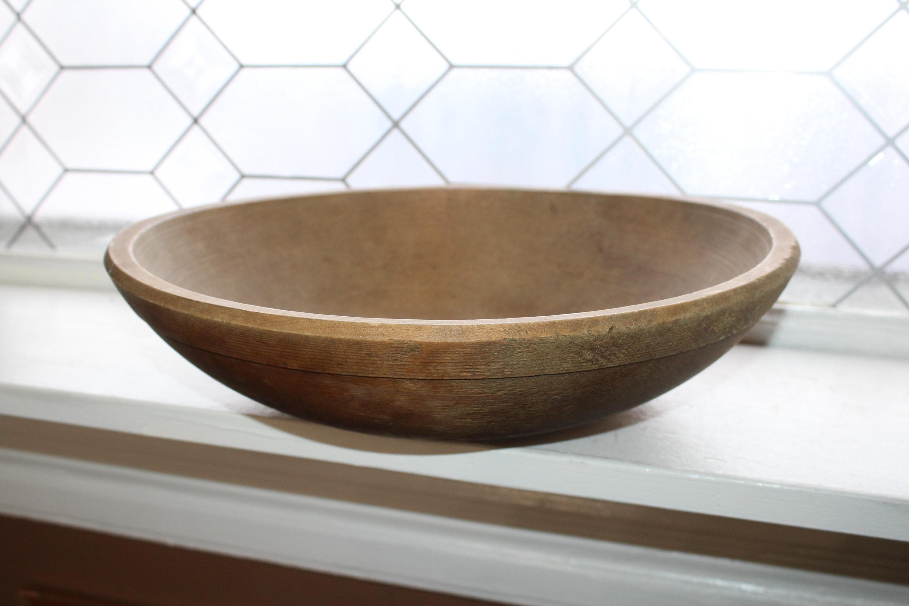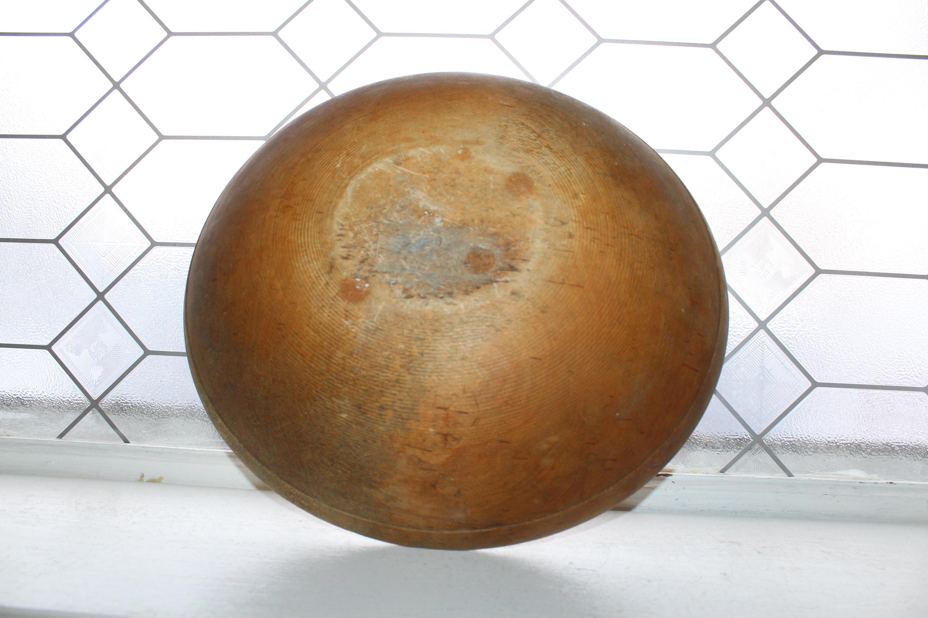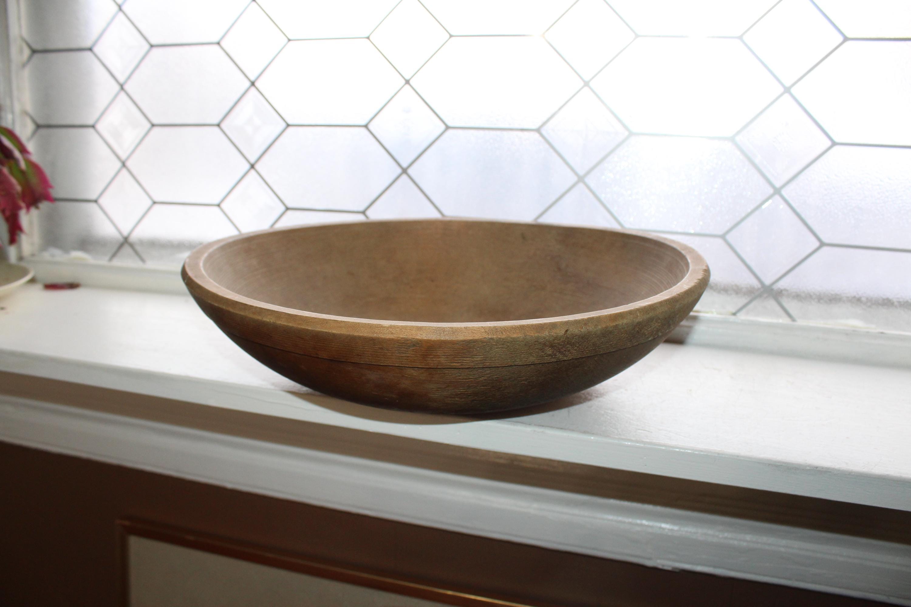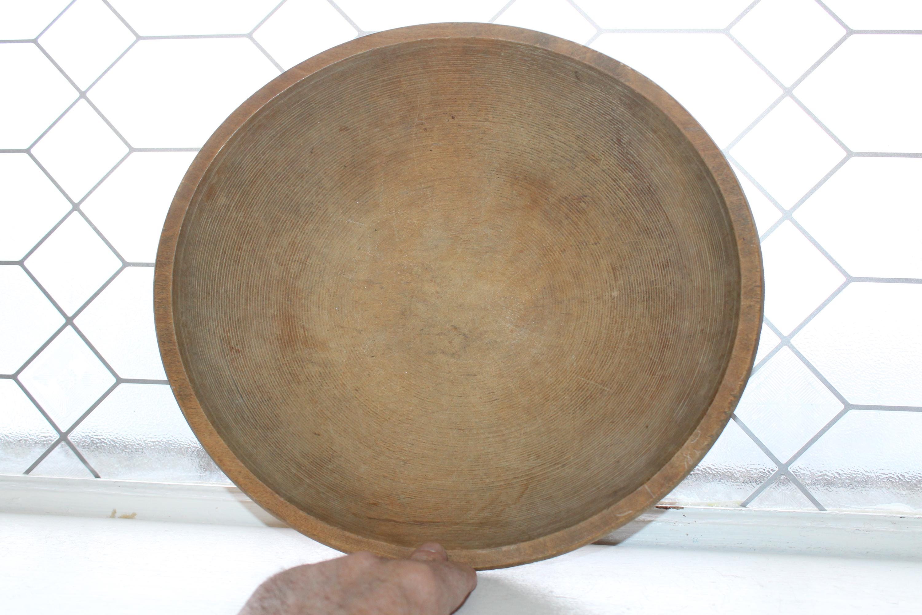 This large antique 1800s wooden bowl is great for display in a country kitchen. It's nicely out of round after 100+ years of age. I purchased this at a farm estate sale in western Minnesota. The bowl measures 13" at its widest x 3 1/2" high. No cracks, displays very well, with it's original patina. Enjoy!