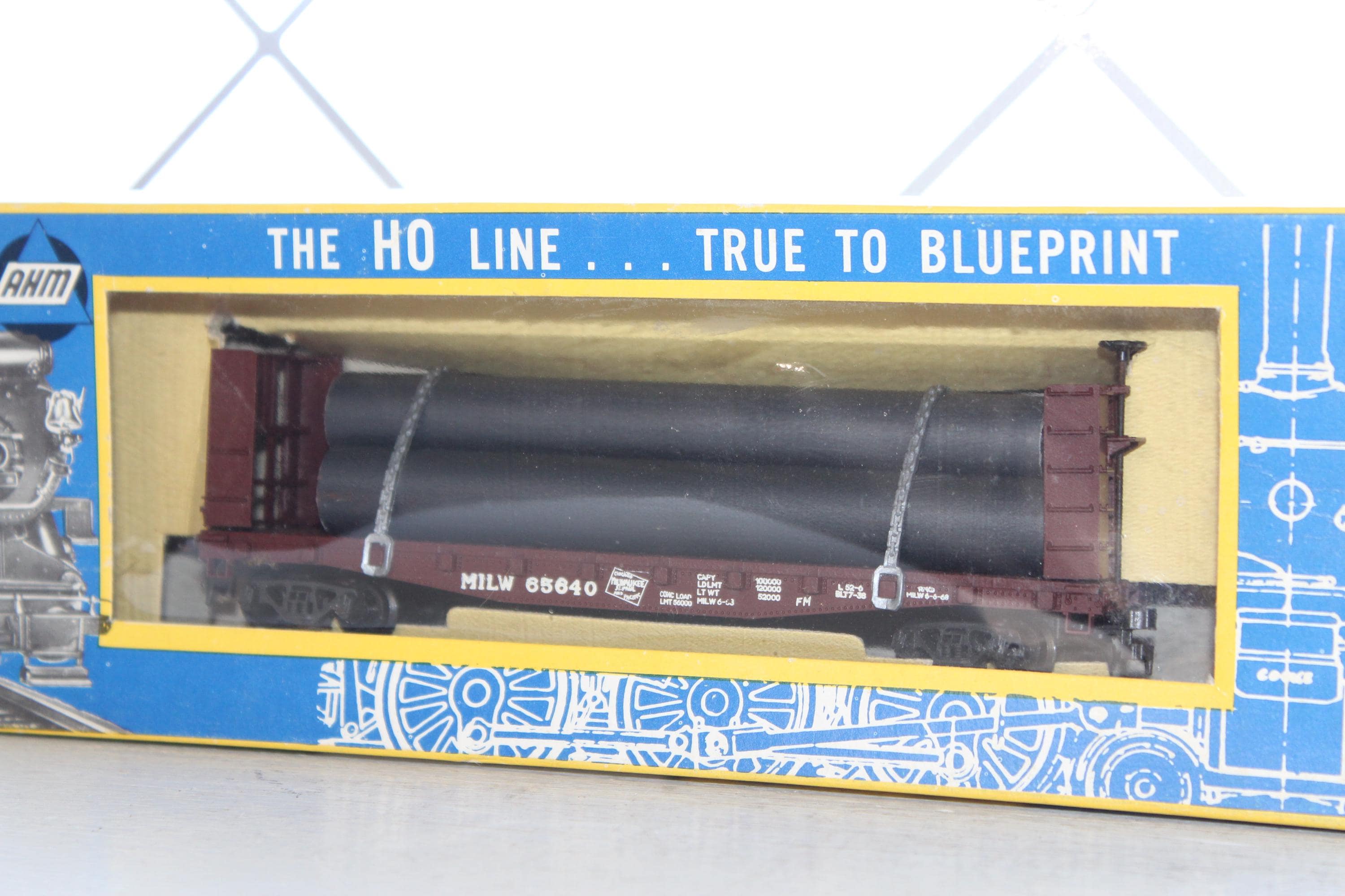This is a vintage AHM HO Scale Milwaukee Railroad flat car with pipes 65640, in very good condition with replacement box. Car is excellent, box shows wear. Enjoy!