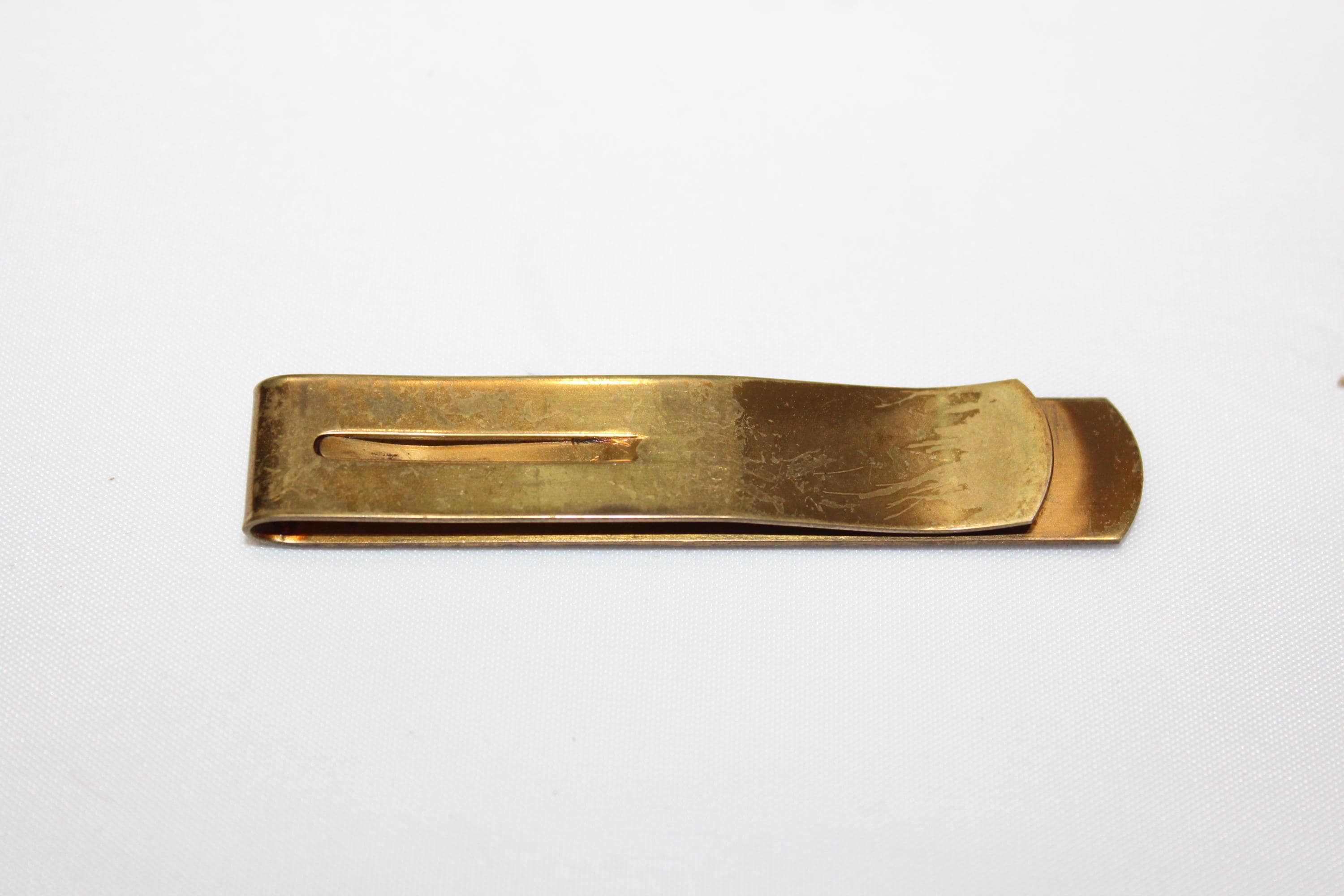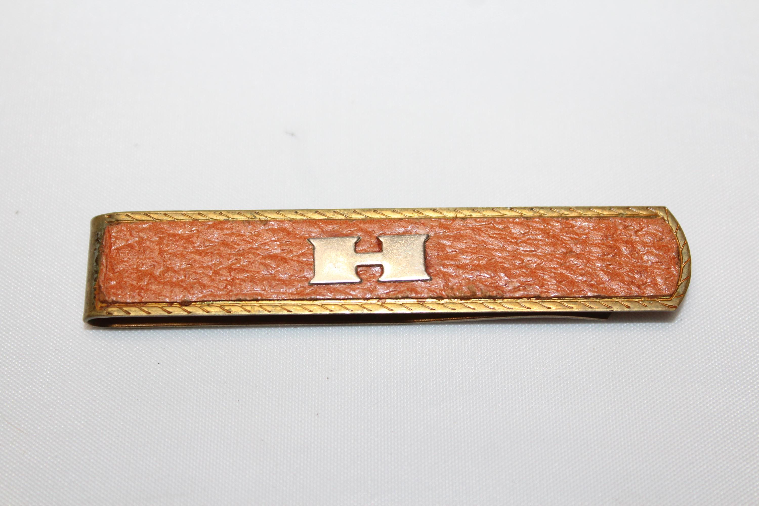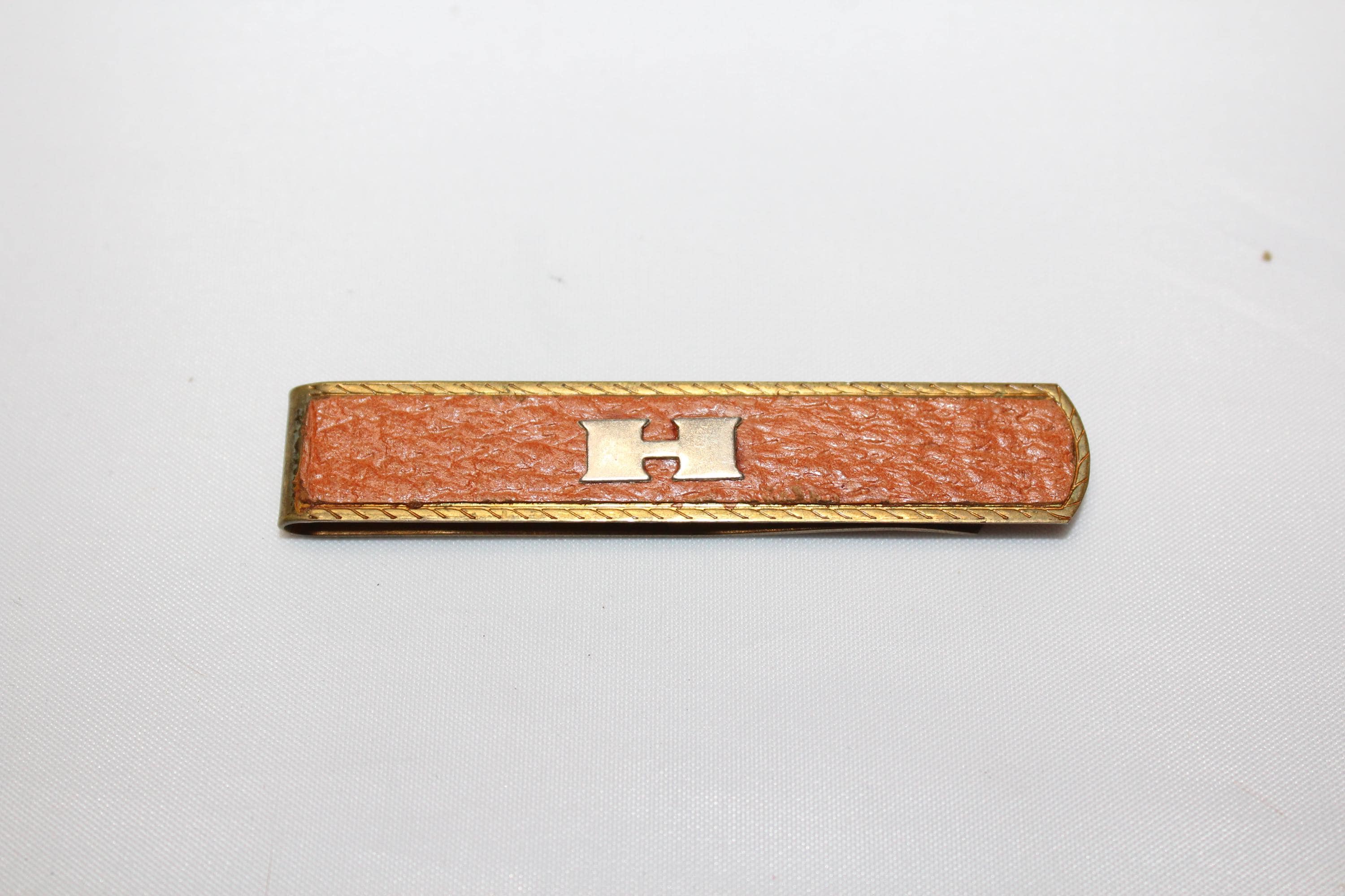 Vintage tie bar clip featuring brass and leather with an H monogram, in very good condition. It measures 2 3/4" wide. Enjoy!