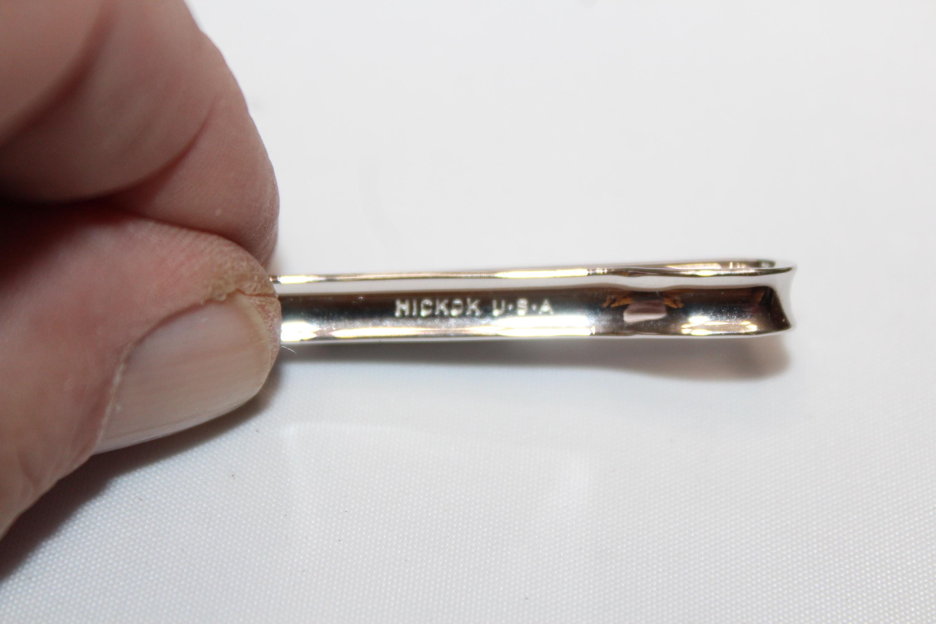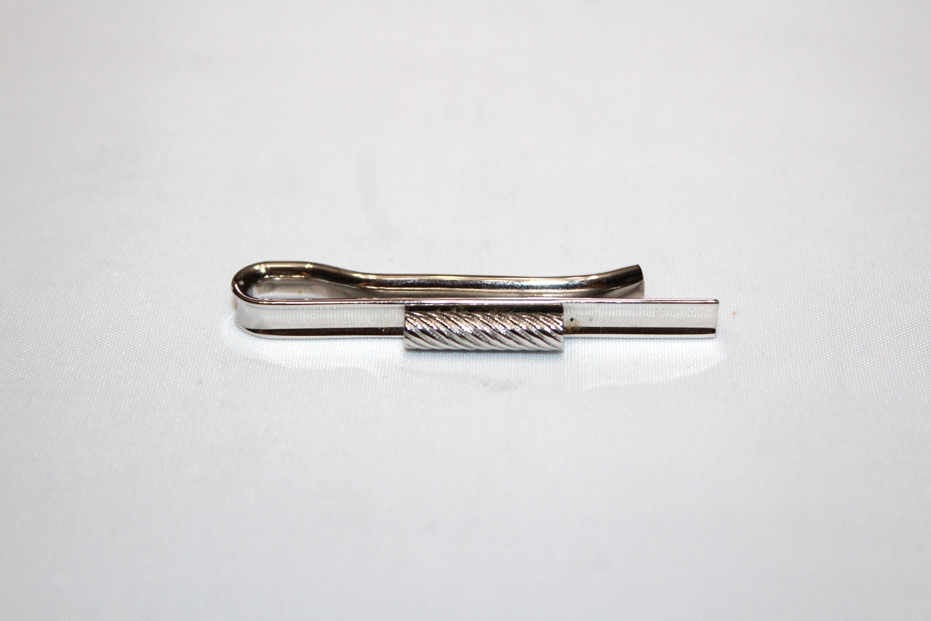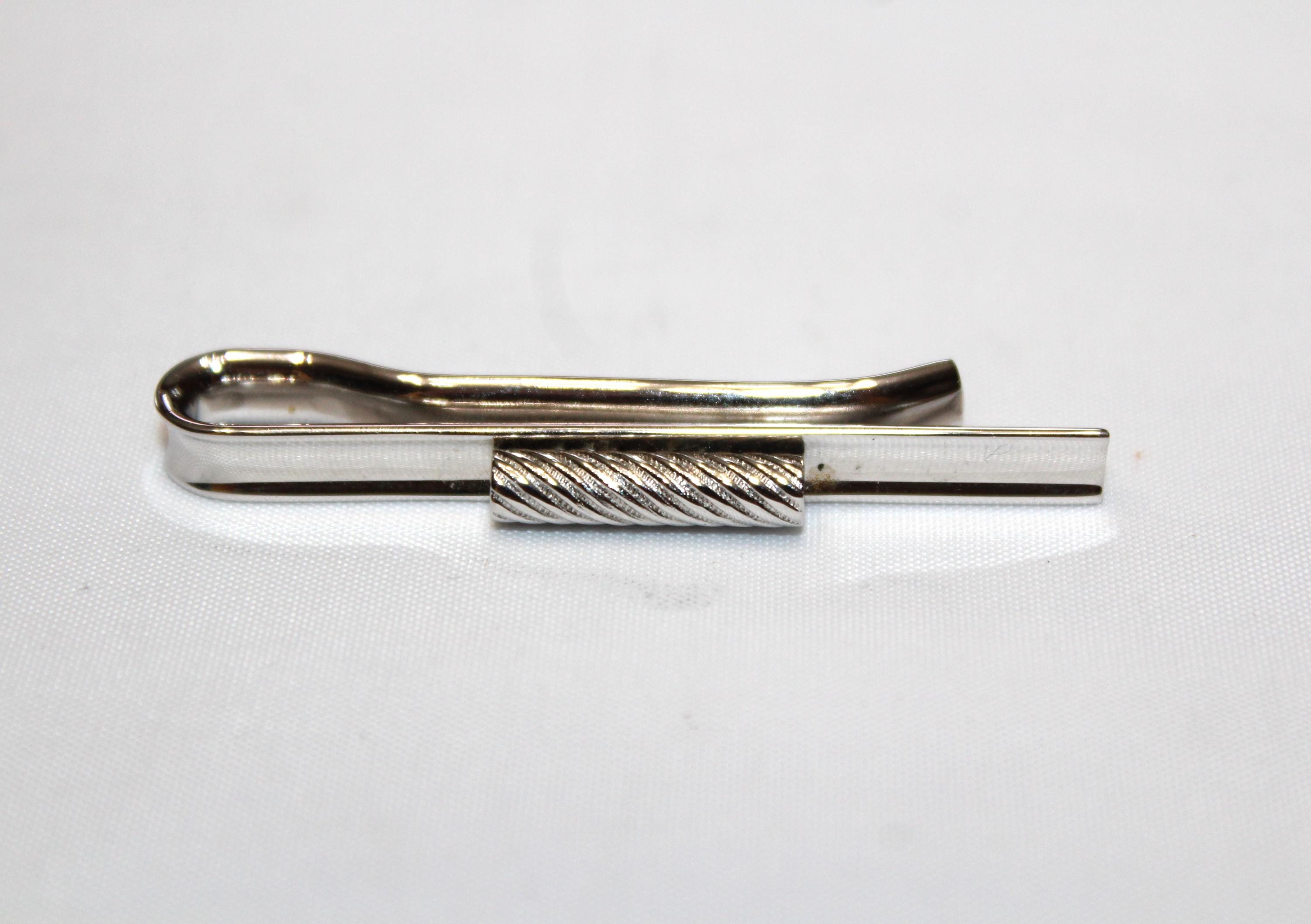 Vintage Hickock tie bar clip featuring a silver tone bar with rope twist center, in very good condition. It measures 2 1/8" wide. Enjoy!
