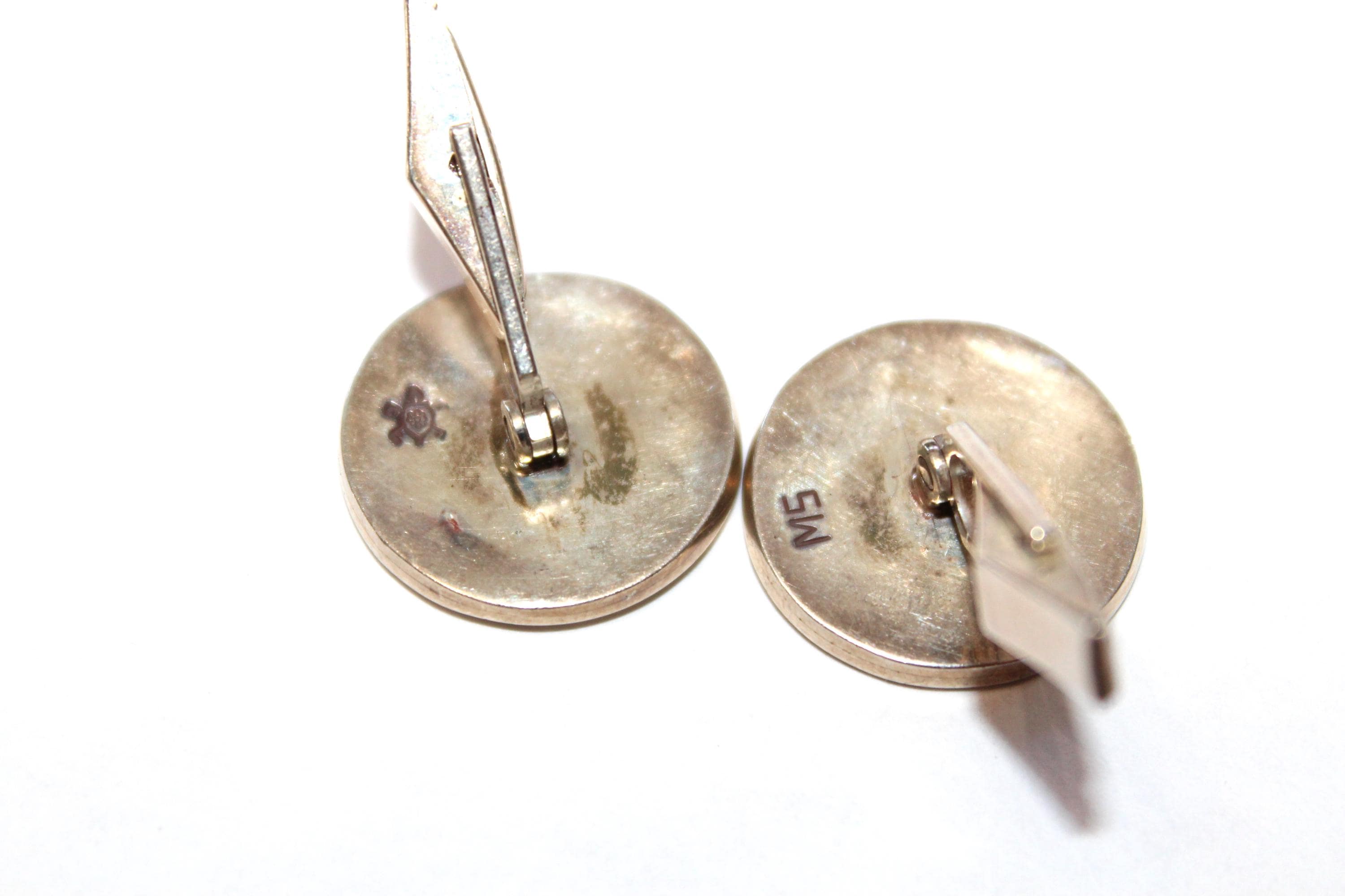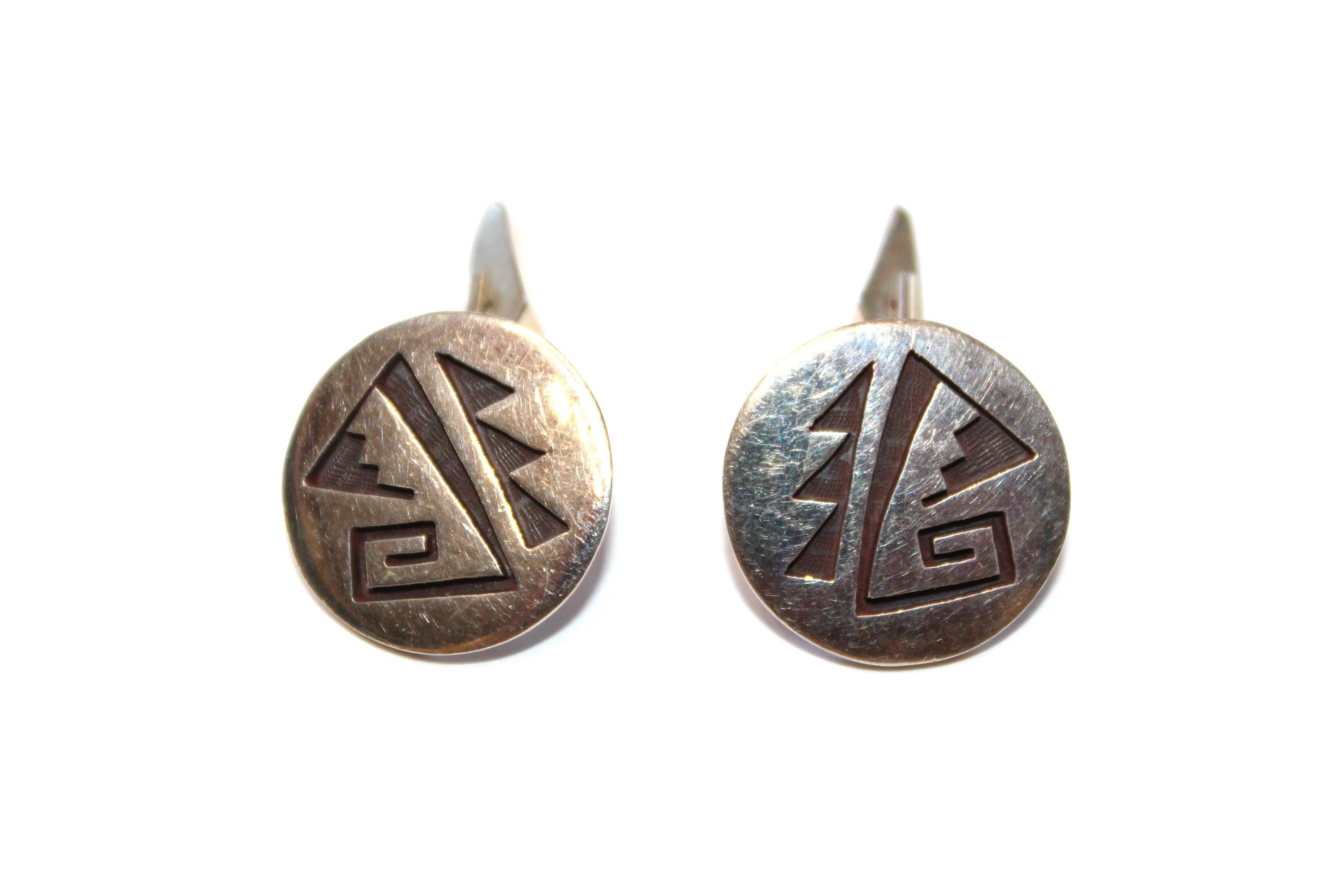 Vintage Mitchel Sockyma Native American Hopi sterling silver cuff links, in good condition. Marked with a turtle and the initials MS, they measure 3/4" wide. They are in good vintage condition with minor wear. Enjoy!