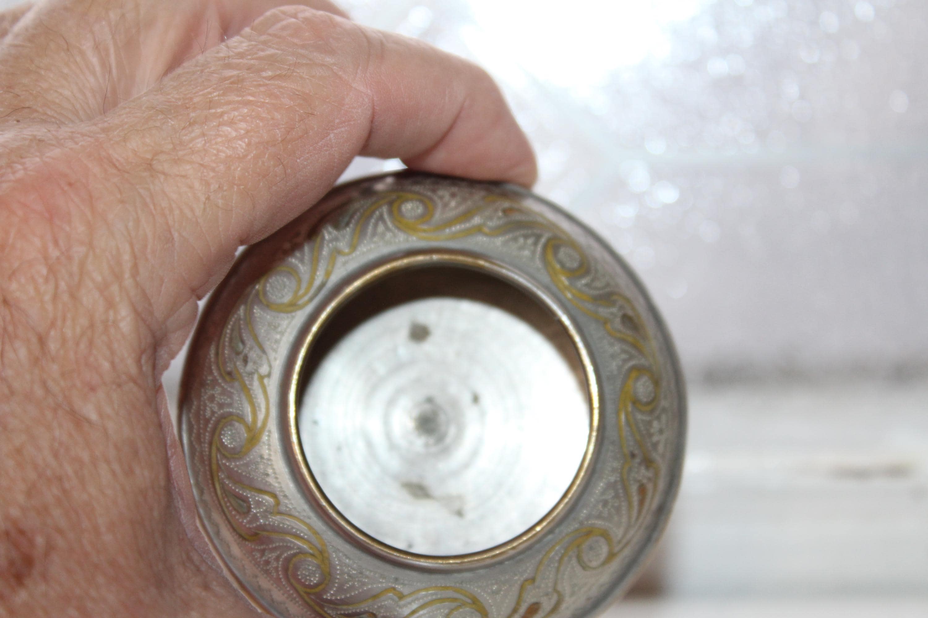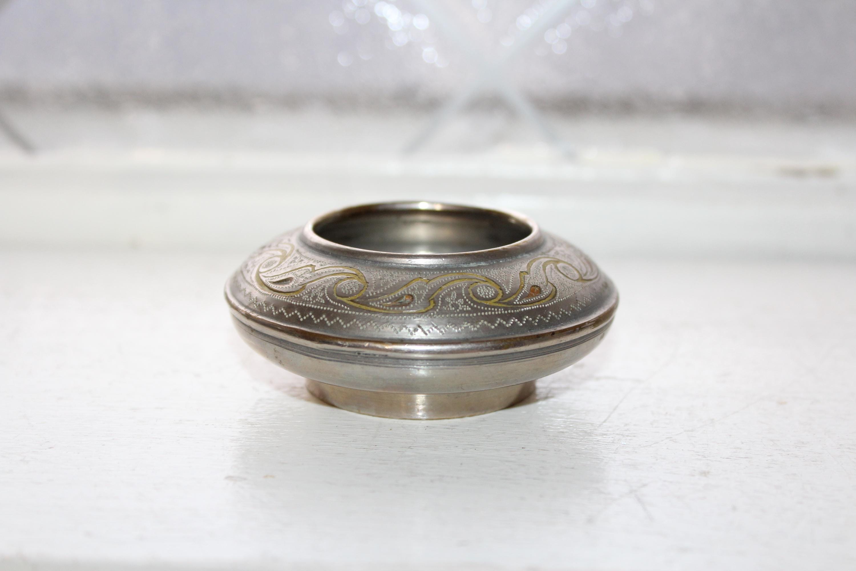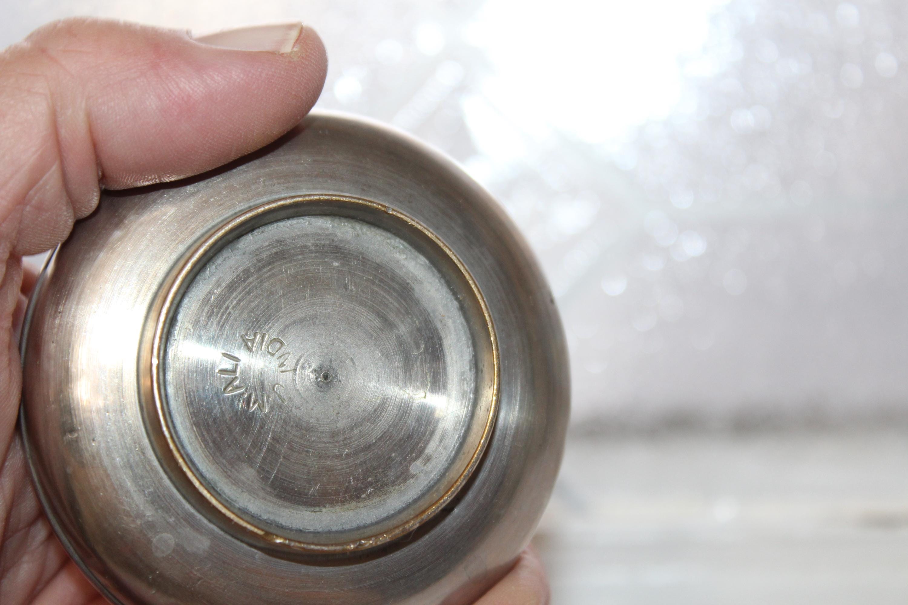 Small vintage silver over brass bowl by J. M. Ali of India, in very good condition with no damage. It measures 3" in diameter x 1 1/4" high. Perfect as a jewelry dish or incense burner. Enjoy!