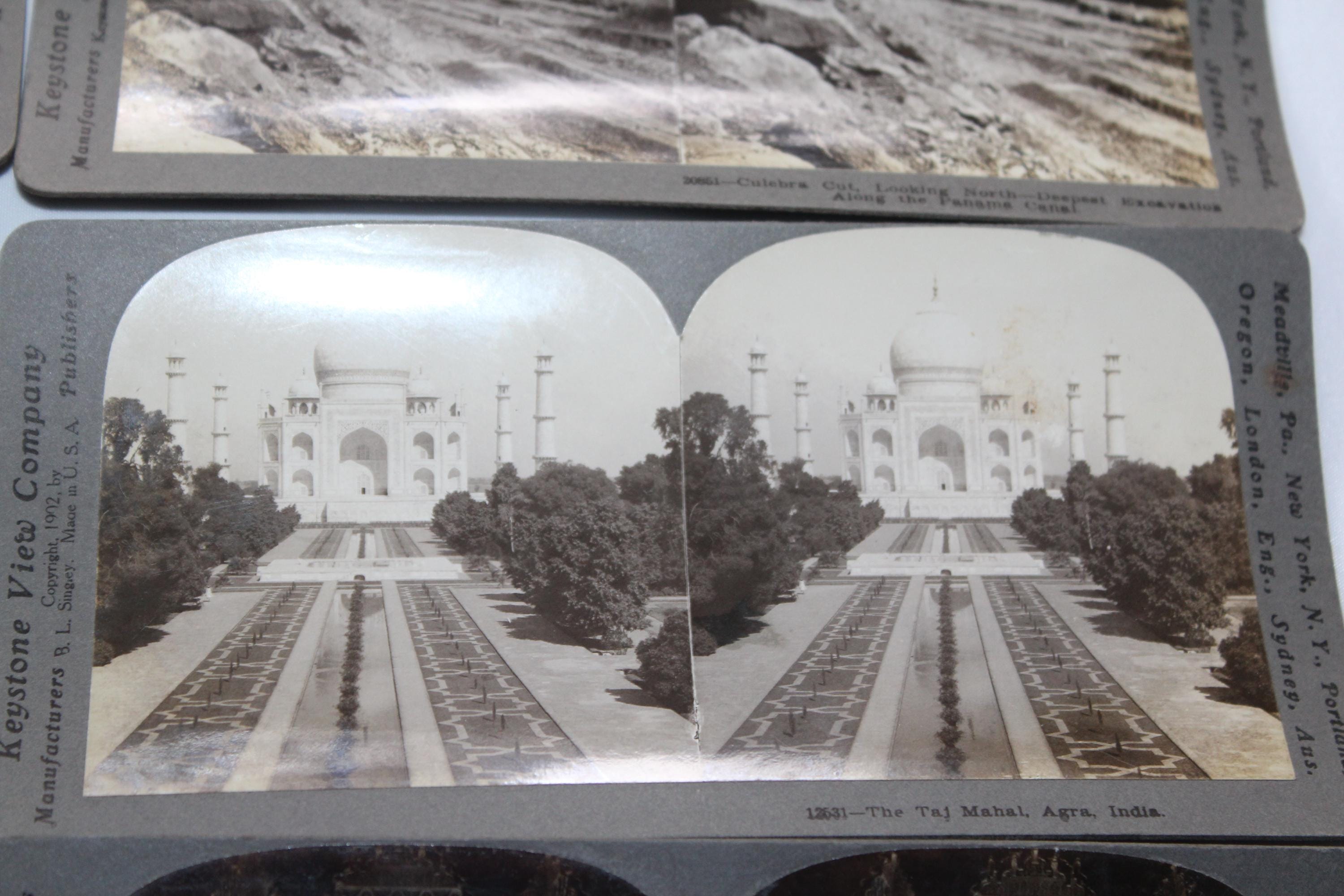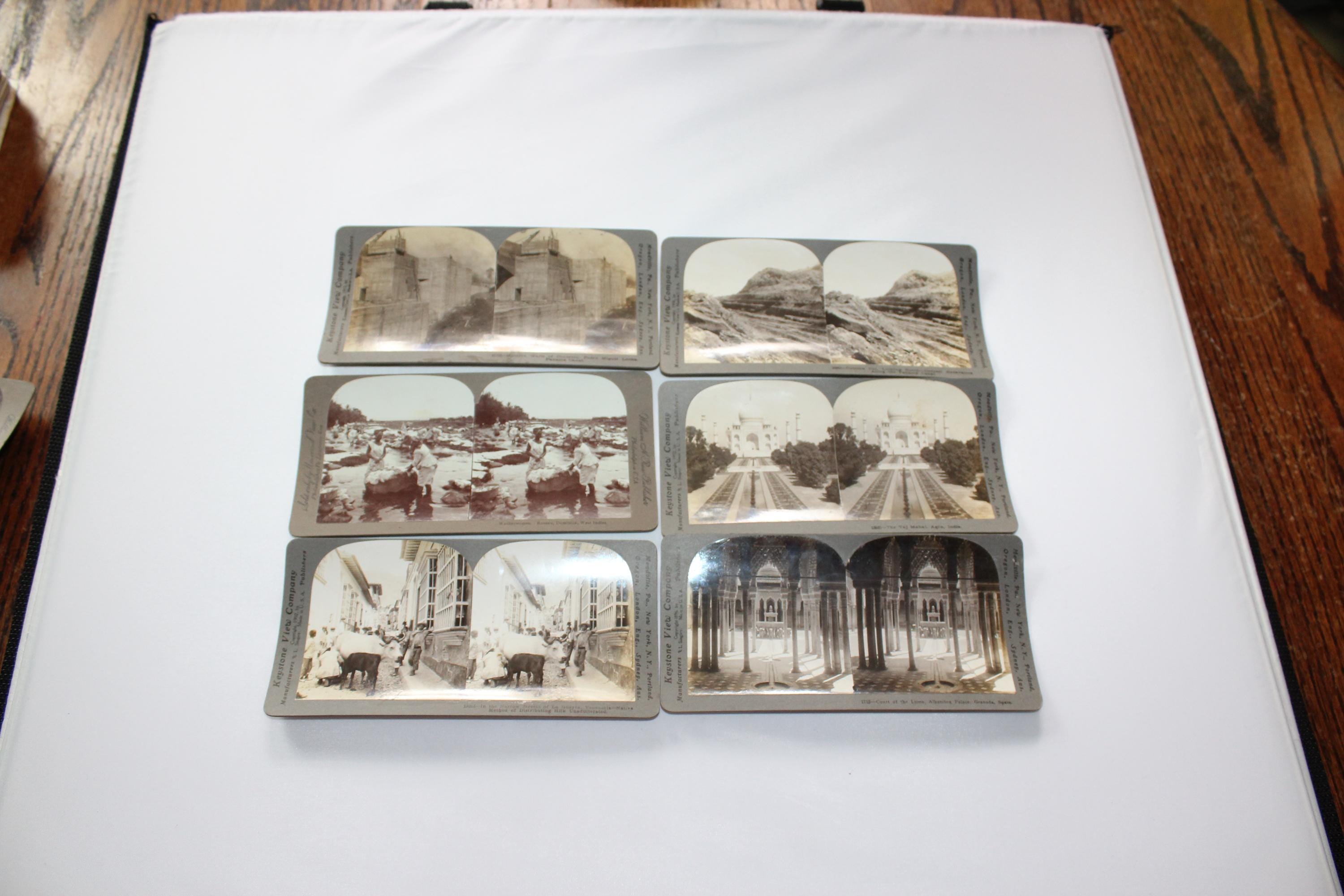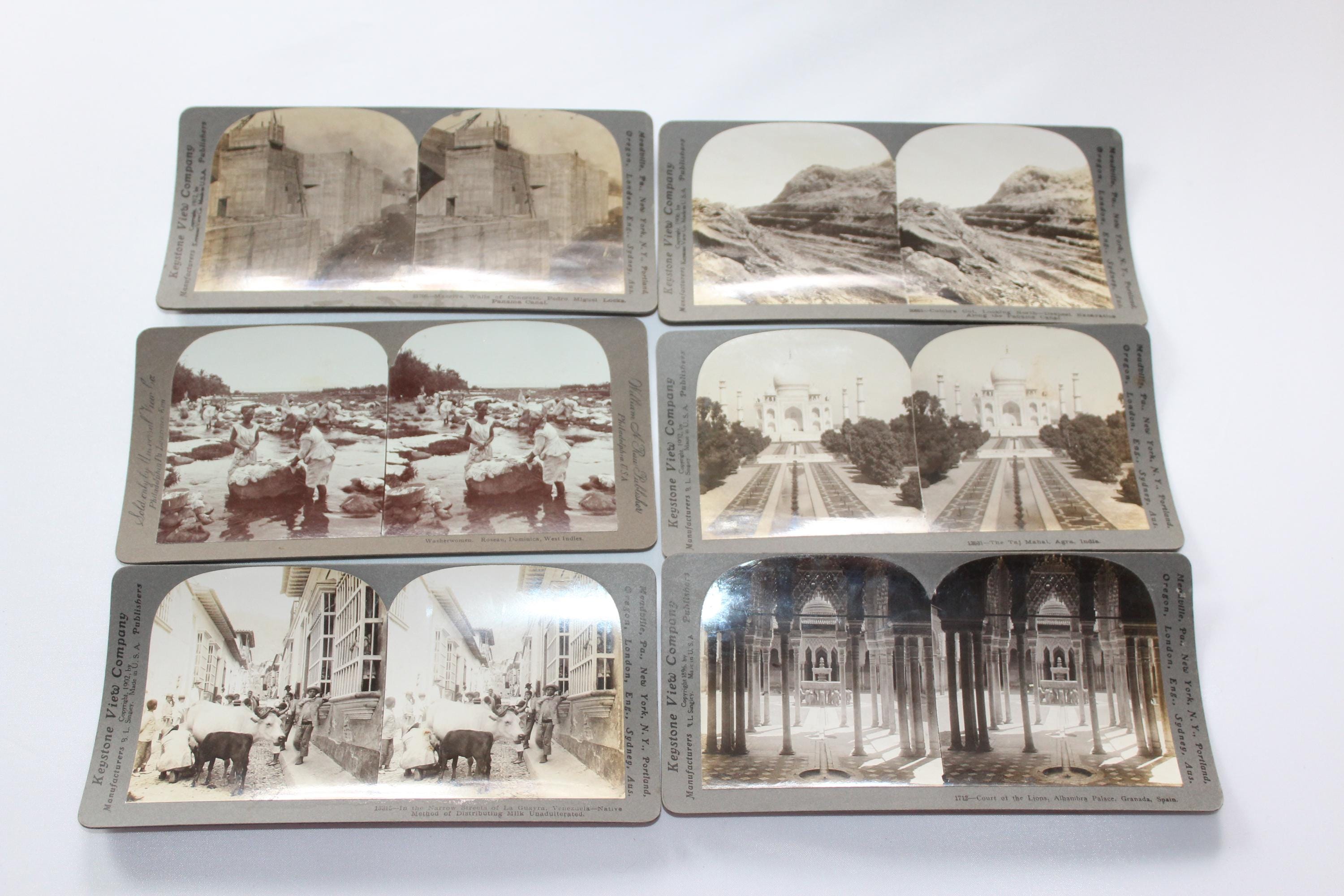 This is a collection of 6 antique Keystone and Universal stereoviews or stereograph cards from the late 1800s and early 1900s. They feature world scenes from the Panama Canal, washer women in the West Indies, Venezuela Court of the Lions in Spain, and the Taj Mahal in India, in very good condition. Enjoy!