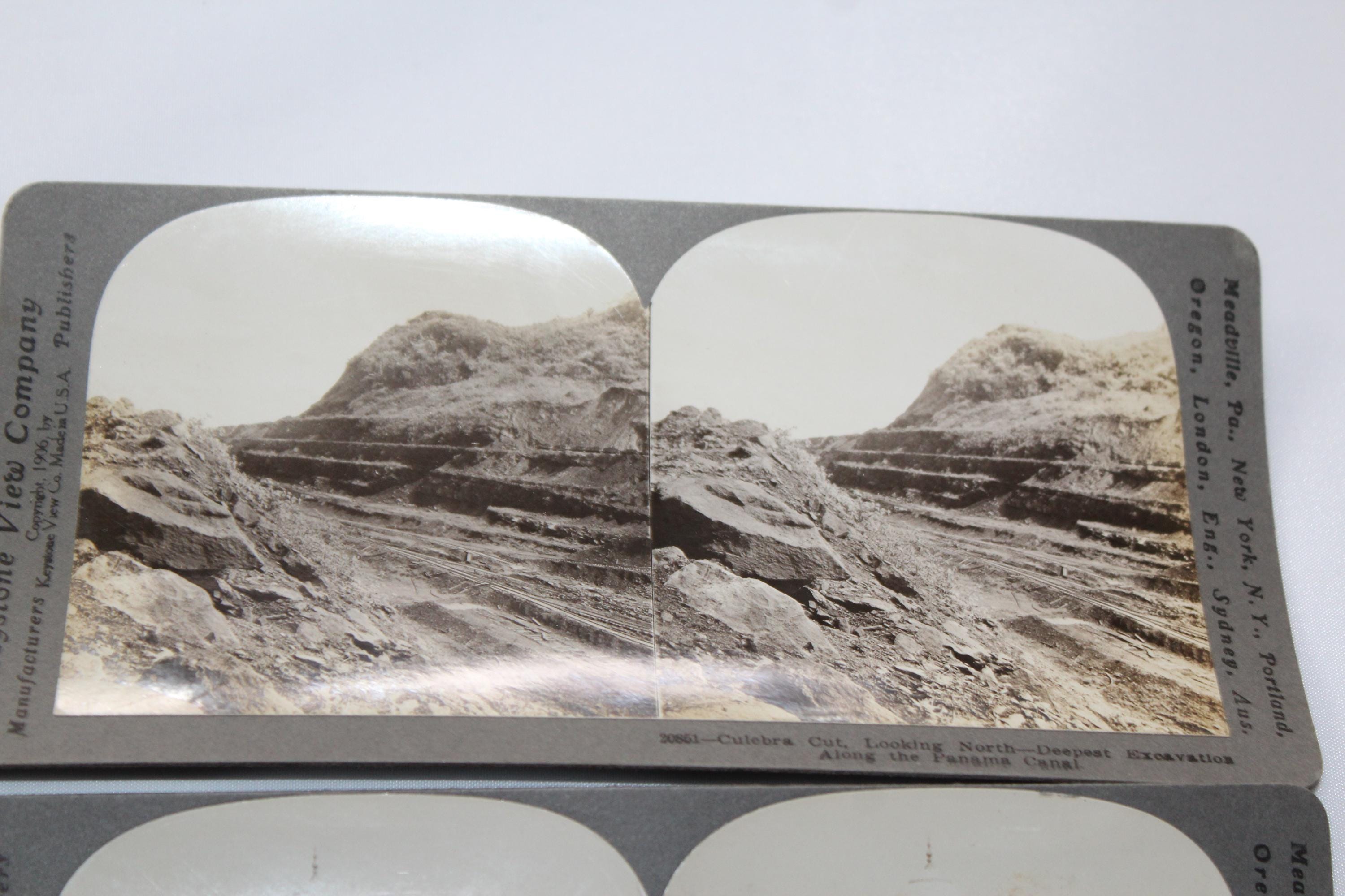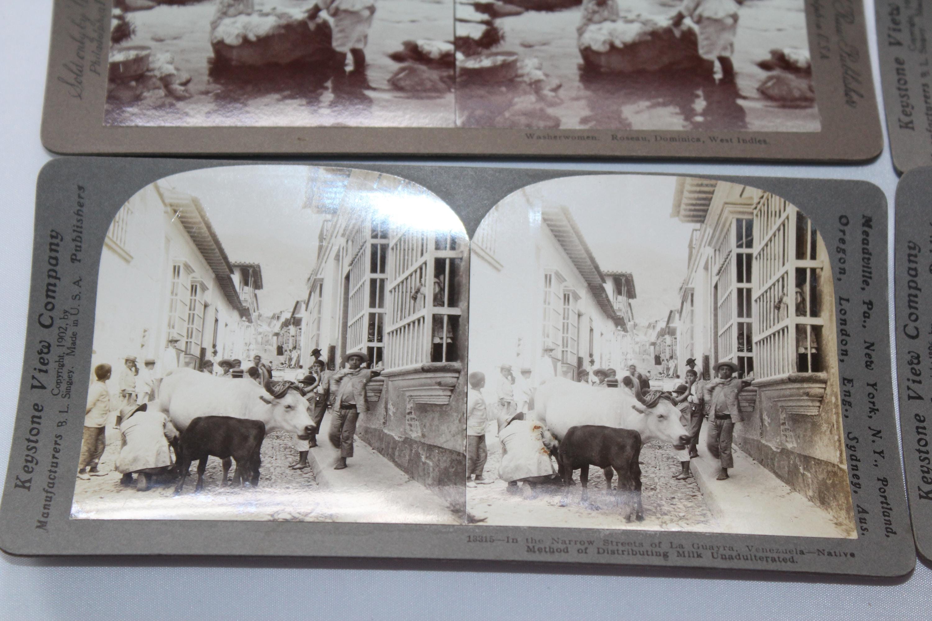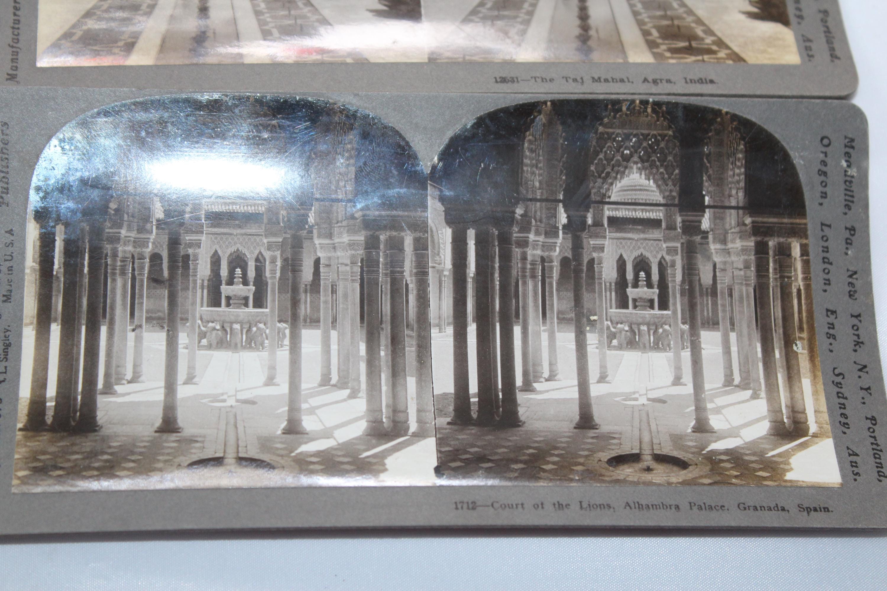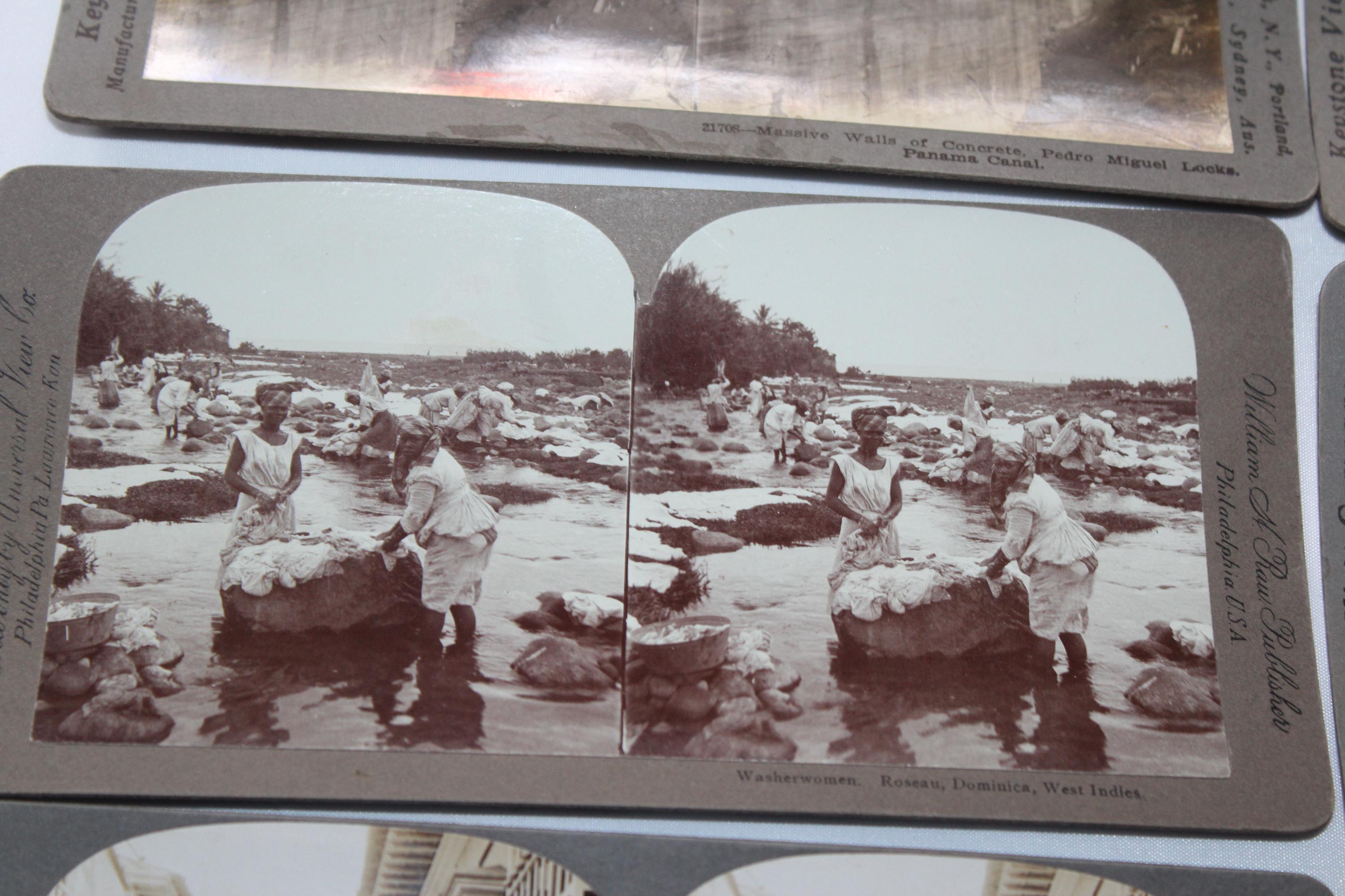 This is a collection of 6 antique Keystone and Universal stereoviews or stereograph cards from the late 1800s and early 1900s. They feature world scenes from the Panama Canal, washer women in the West Indies, Venezuela Court of the Lions in Spain, and the Taj Mahal in India, in very good condition. Enjoy!