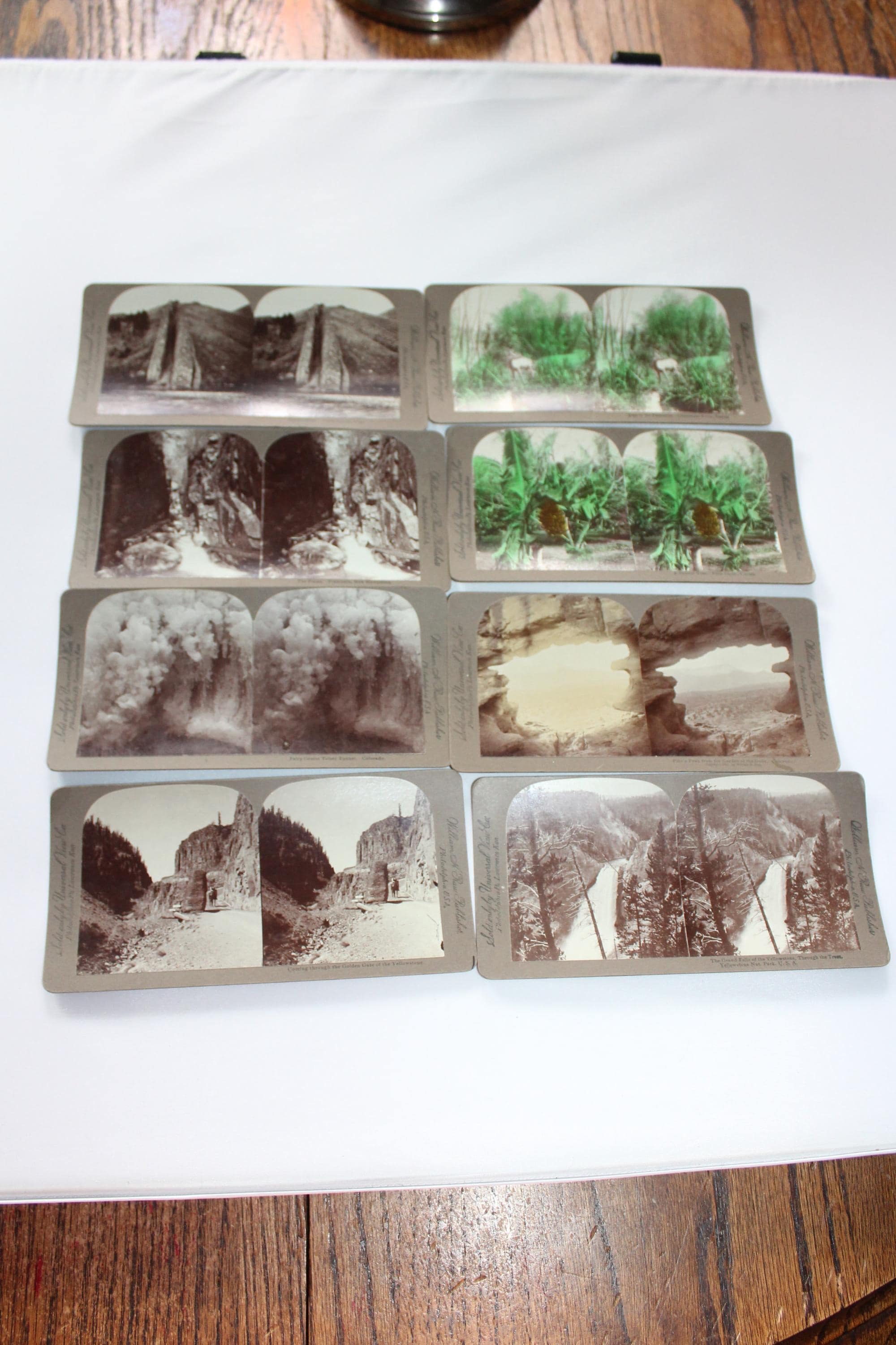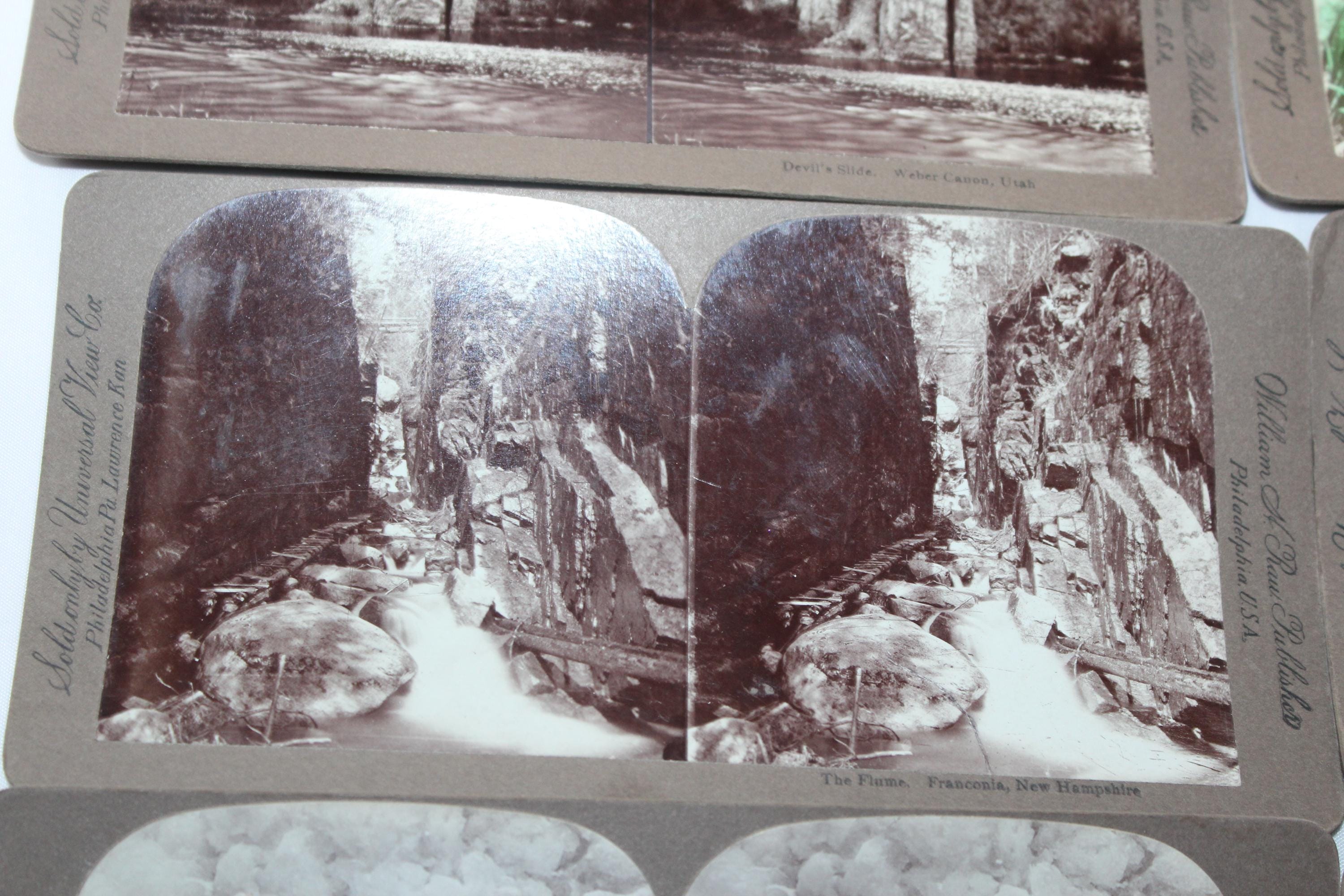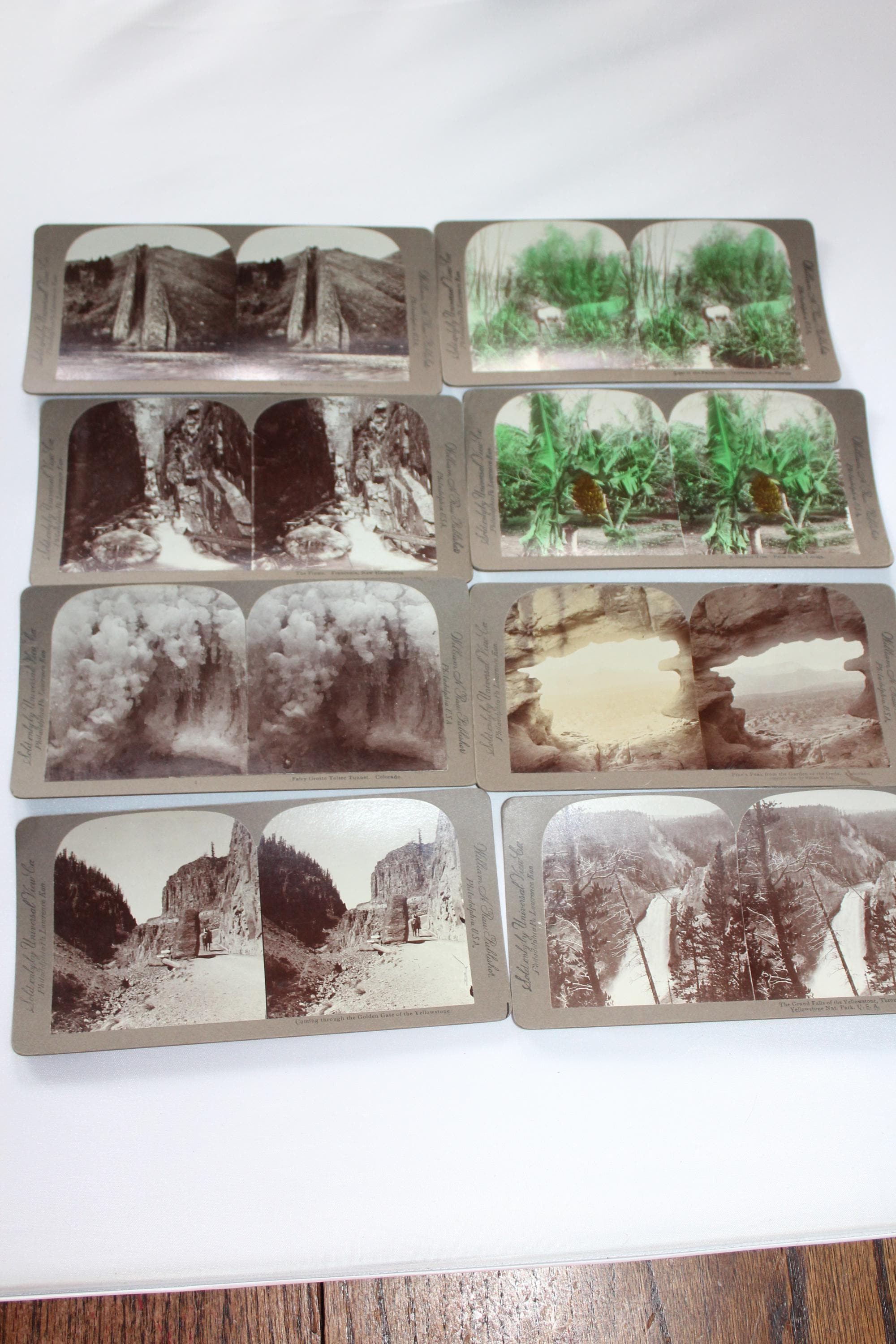 This is a collection of 8 antique Universal stereoviews or stereograph cards of USA scenes. They feature Yellowstone National Park, Pike's Peak from the Garden of the Gods in Colorado, Devil's Slide in Weber Canyon Utah, Fairy Grotto Toltec Tunnel in Colorado, The Flume in Franconia New Hampshire, and Florida scenes. Enjoy!