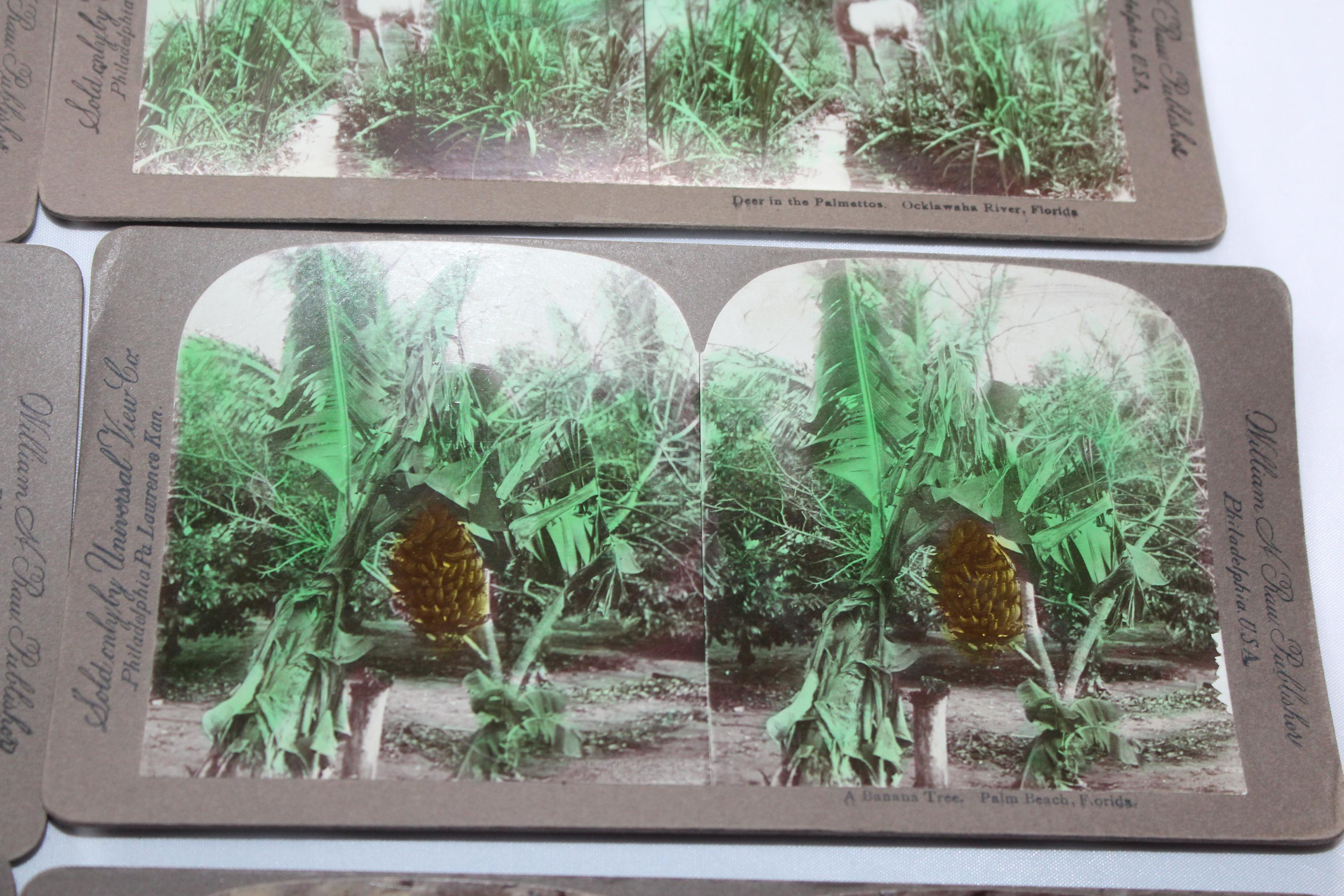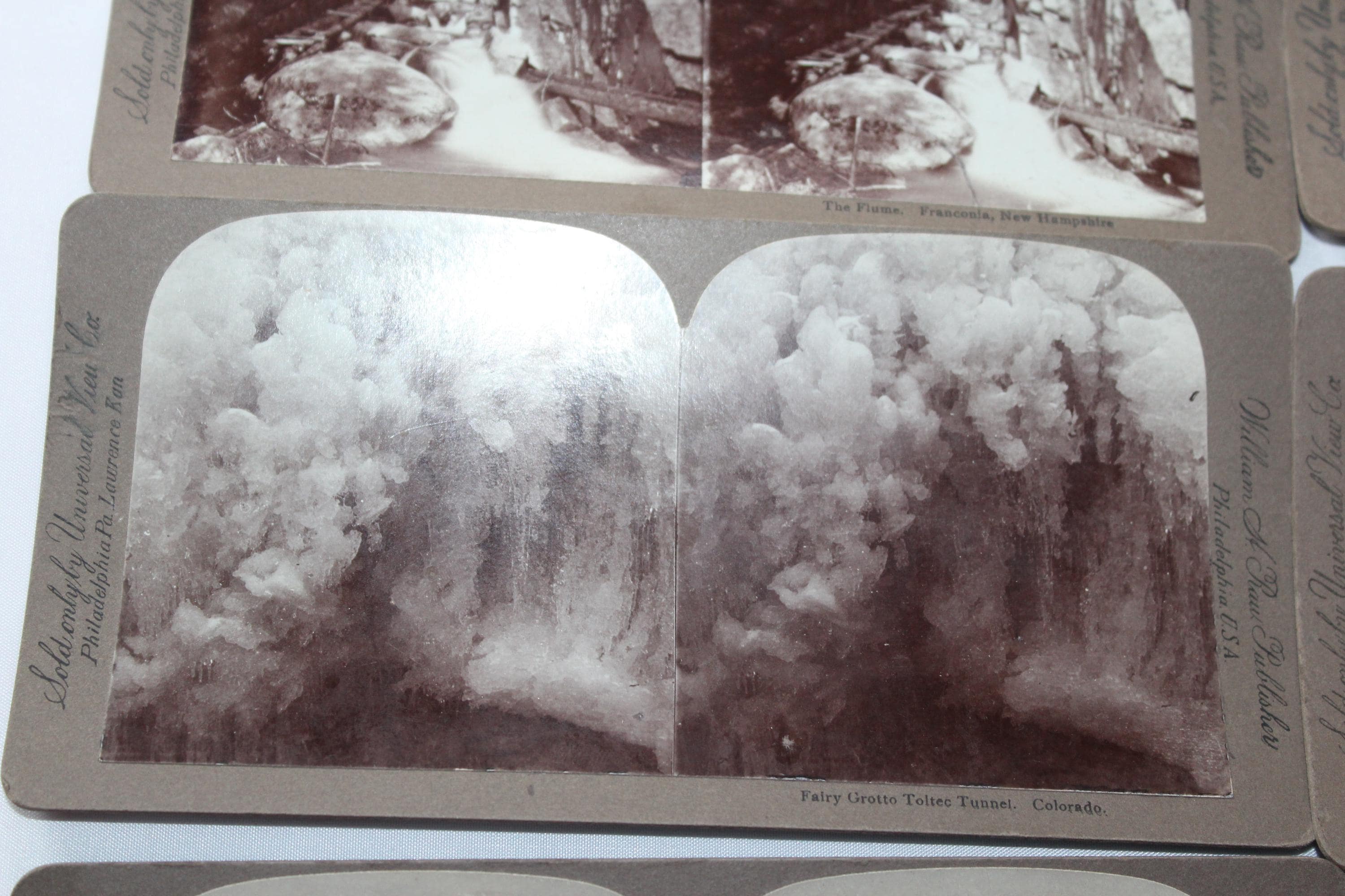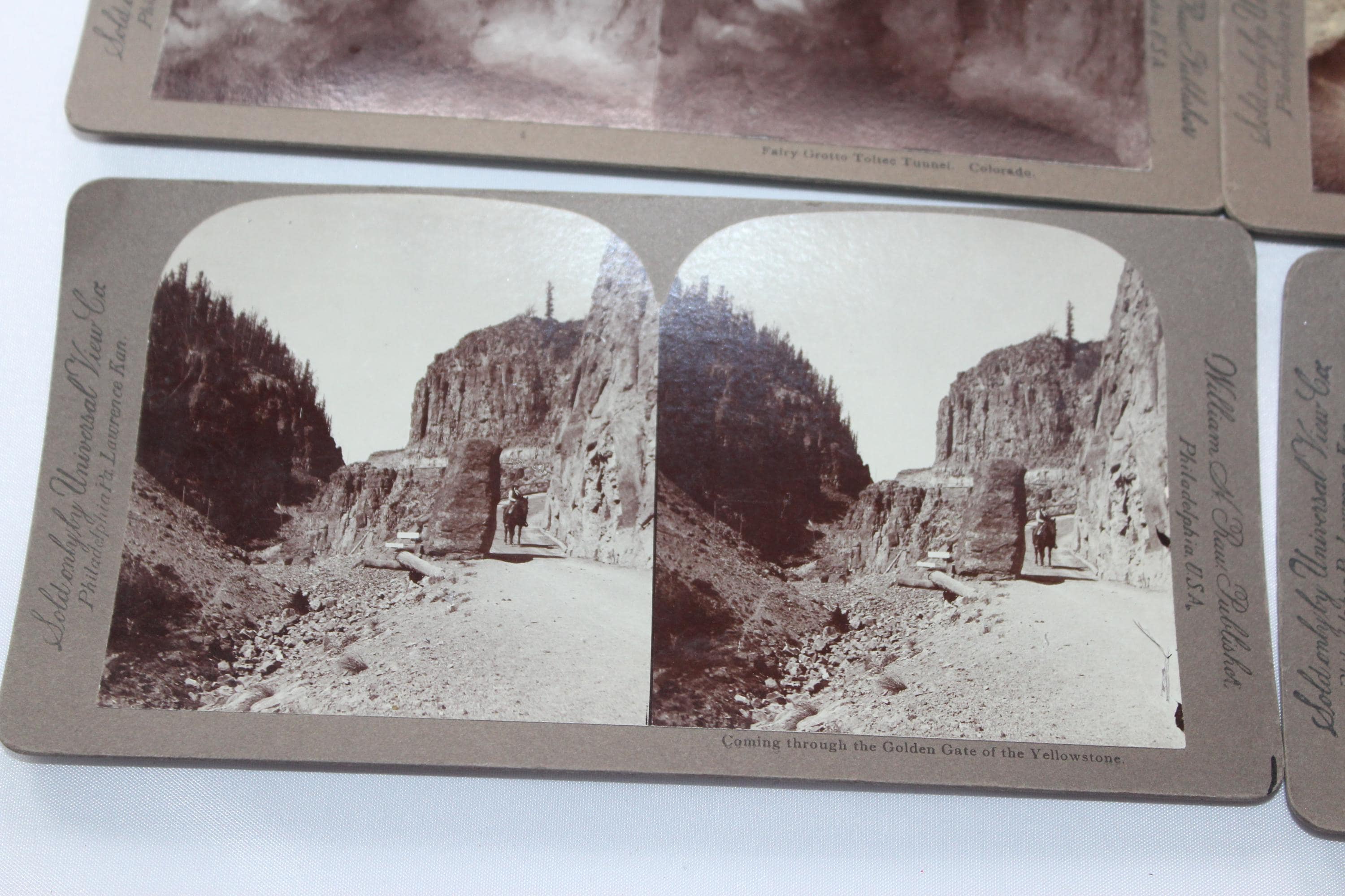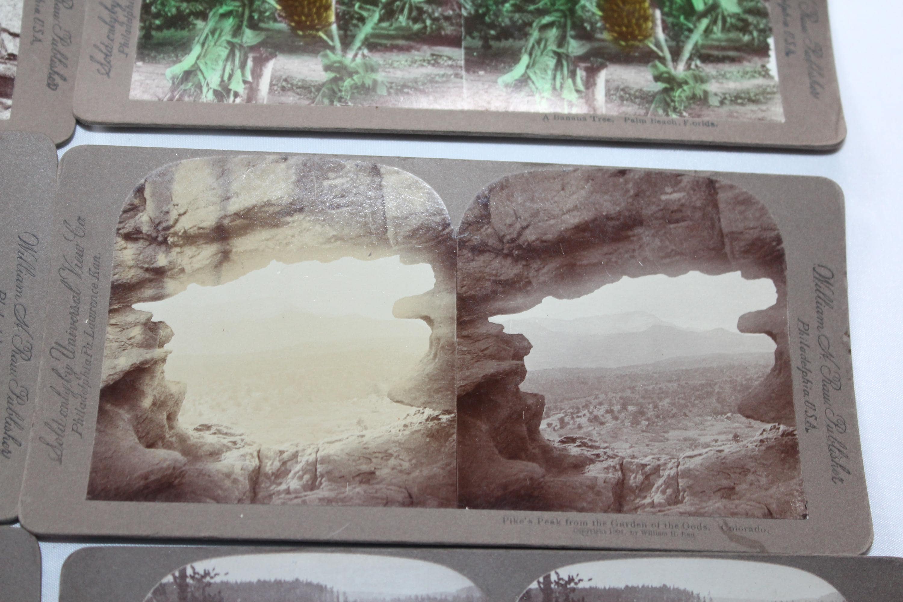 This is a collection of 8 antique Universal stereoviews or stereograph cards of USA scenes. They feature Yellowstone National Park, Pike's Peak from the Garden of the Gods in Colorado, Devil's Slide in Weber Canyon Utah, Fairy Grotto Toltec Tunnel in Colorado, The Flume in Franconia New Hampshire, and Florida scenes. Enjoy!