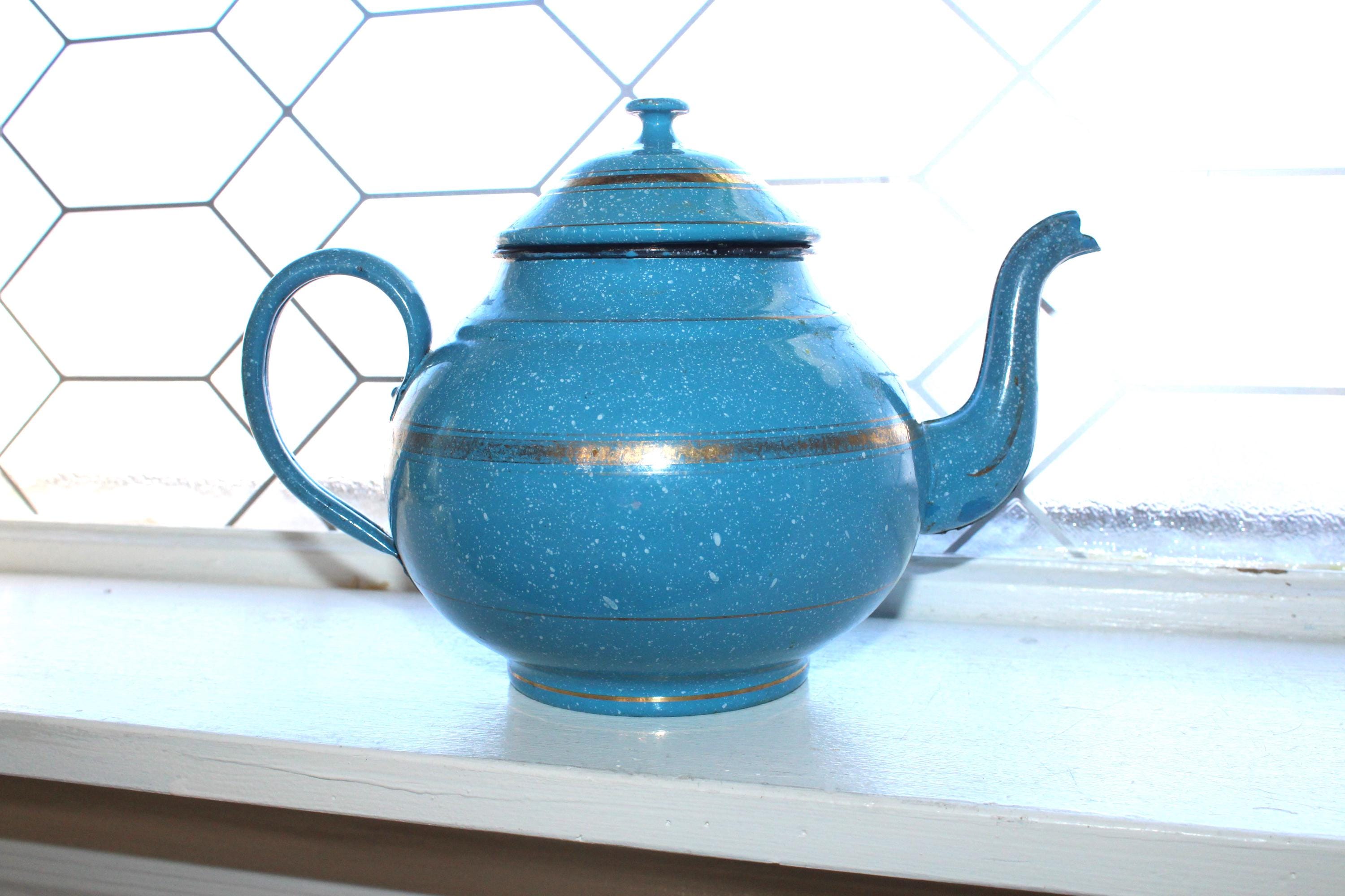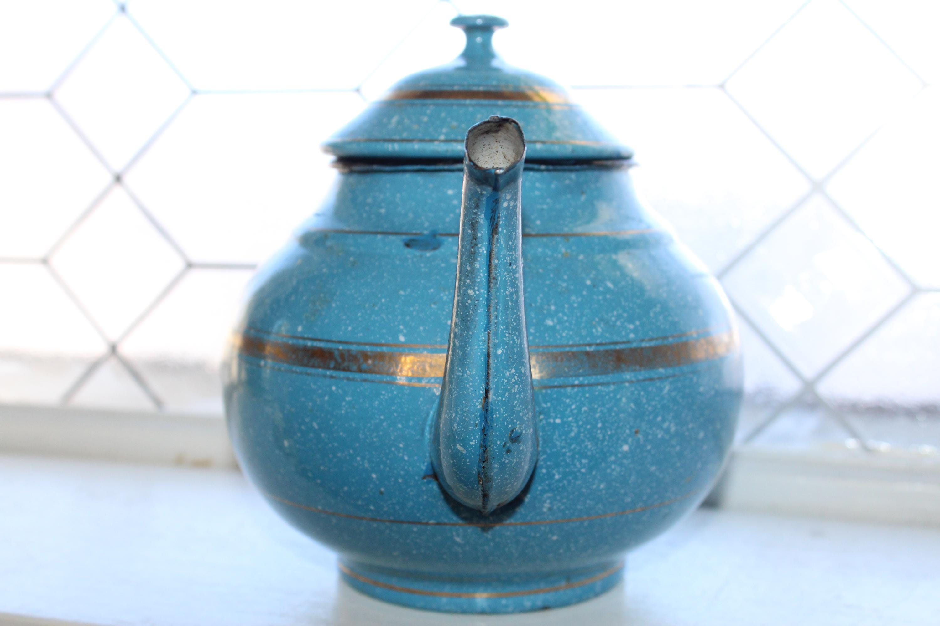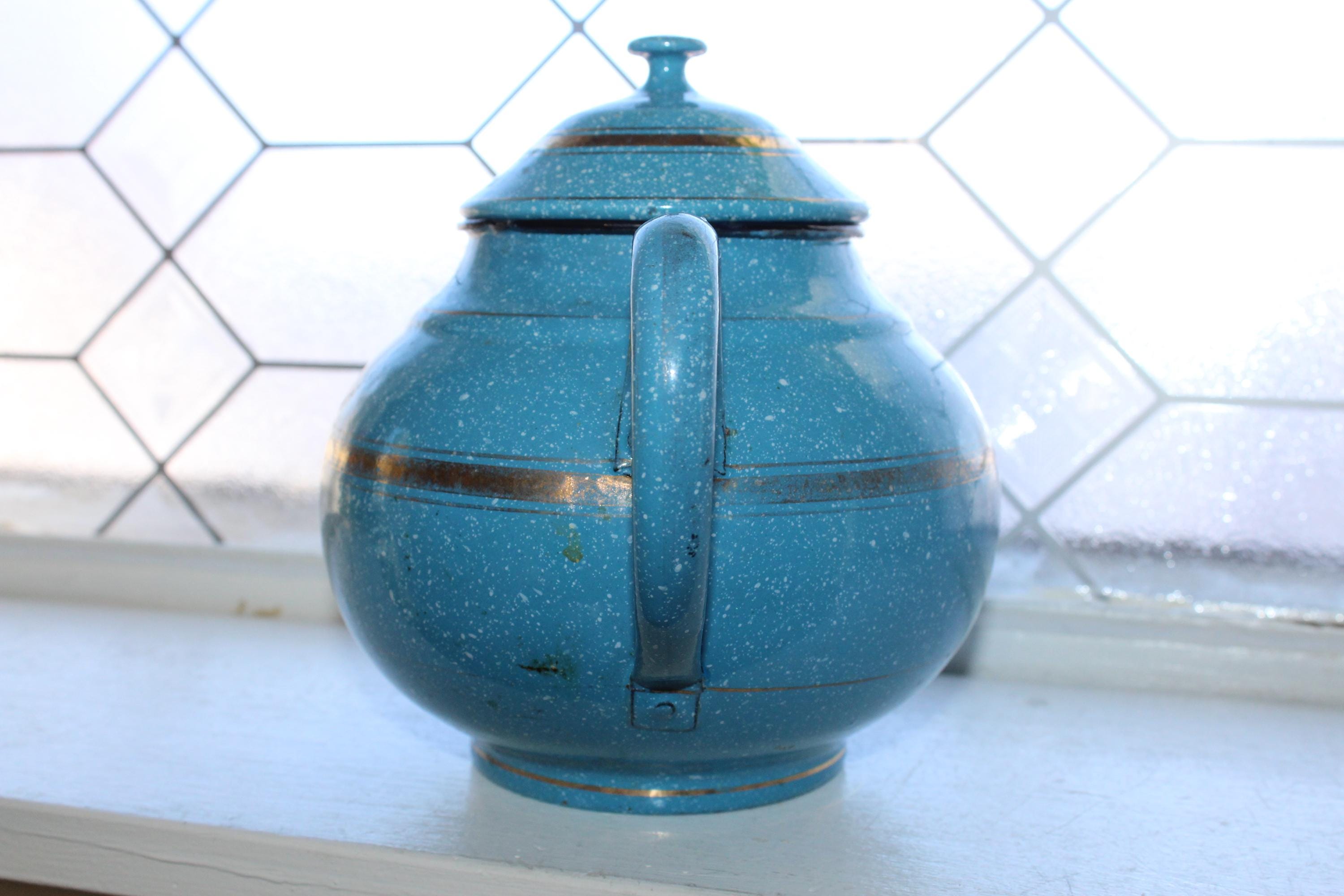 Antique robin's egg blue speckled enamelware metal teapot with gold trim, great for display in a country kitchen. This little charmer measures 10" from handle to spout and 7" high. It has some wear as shown in the photos but displays very well. Enjoy!