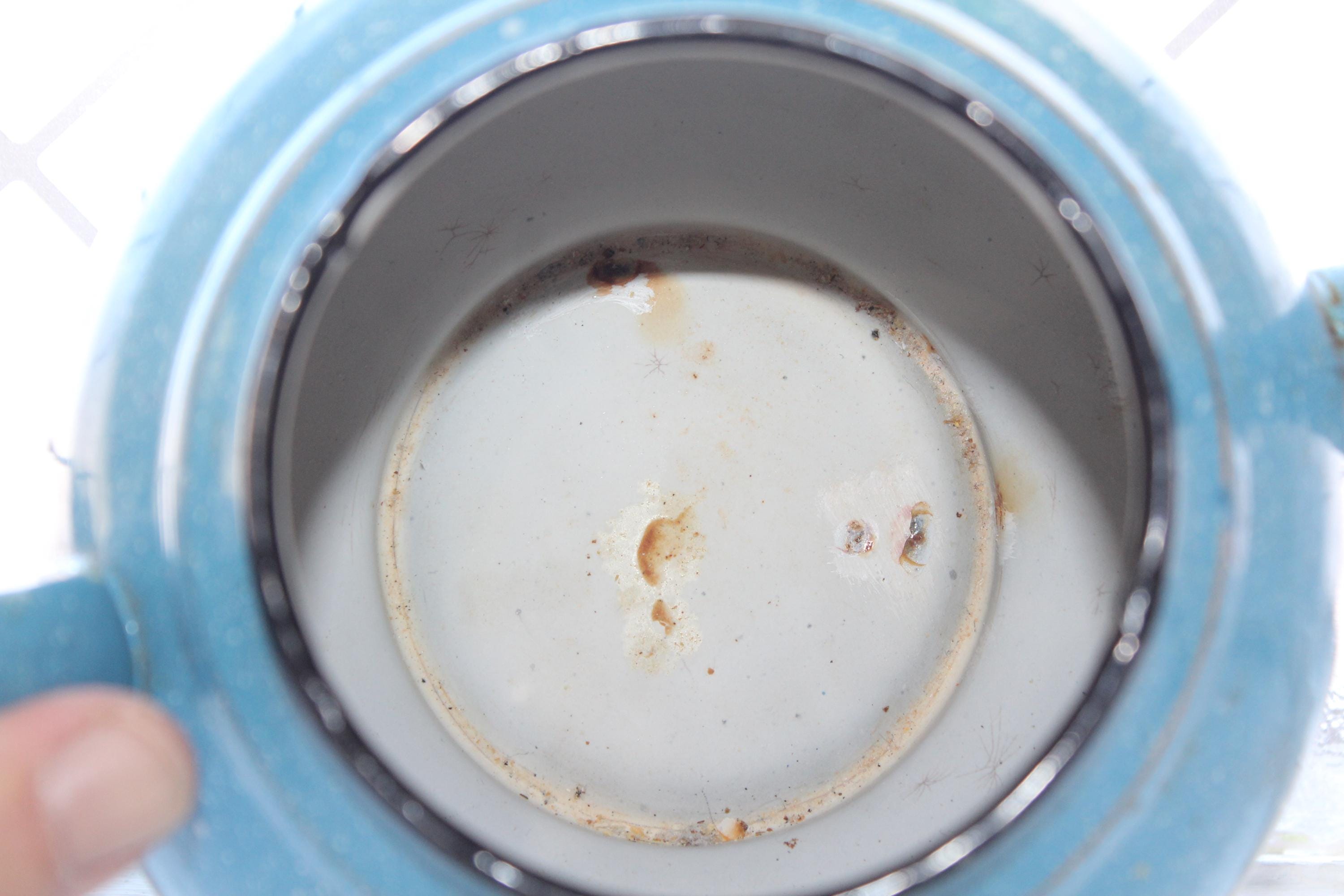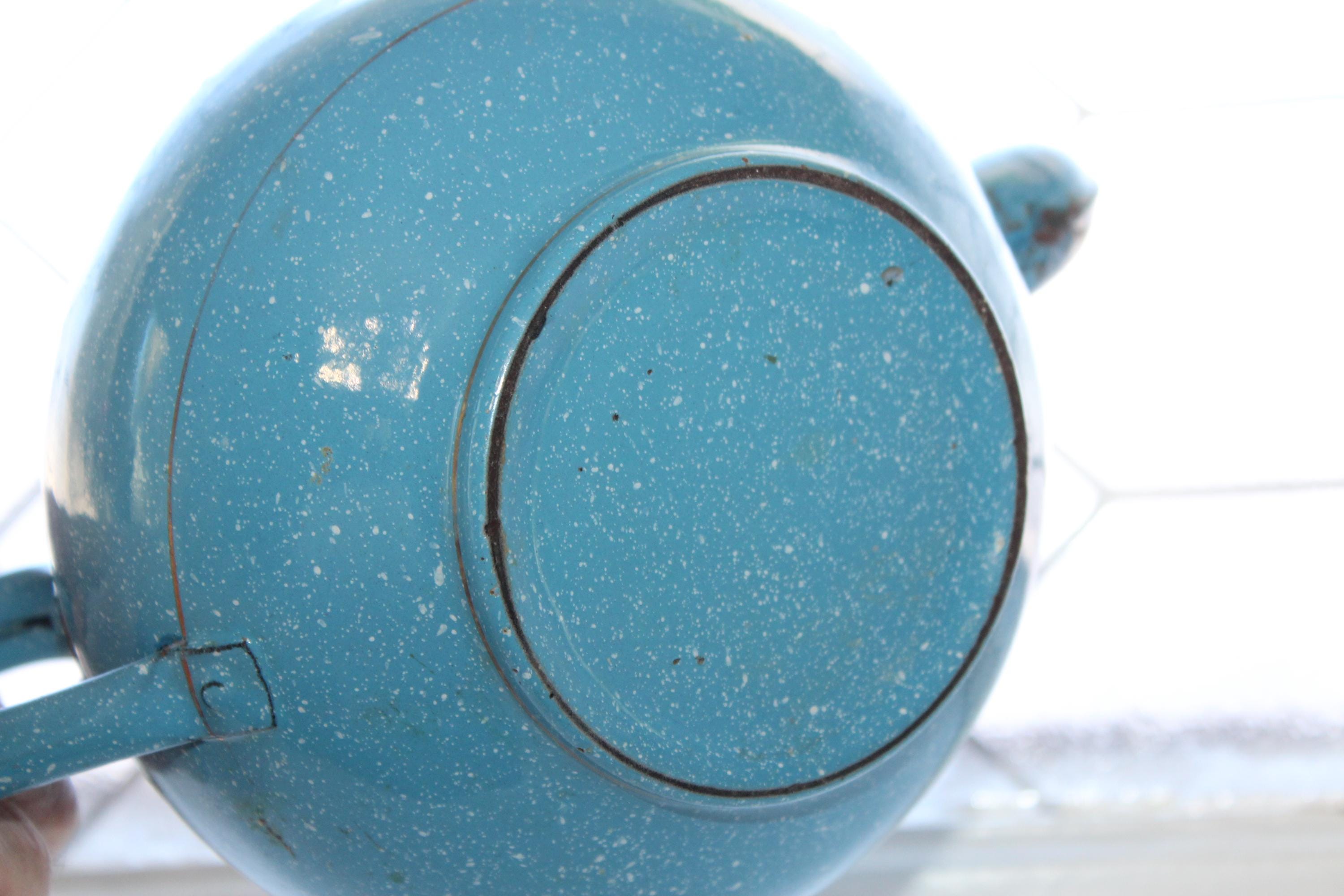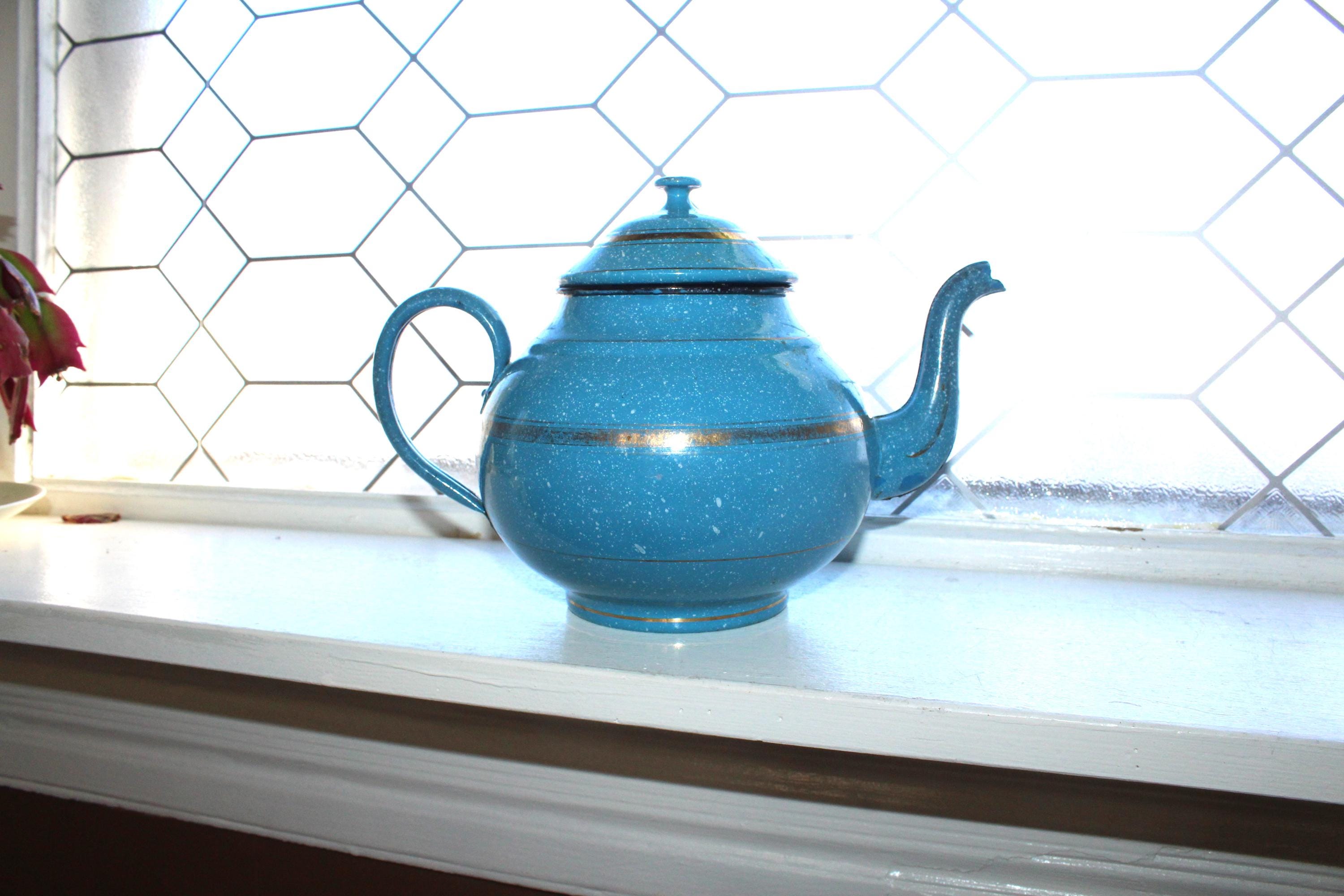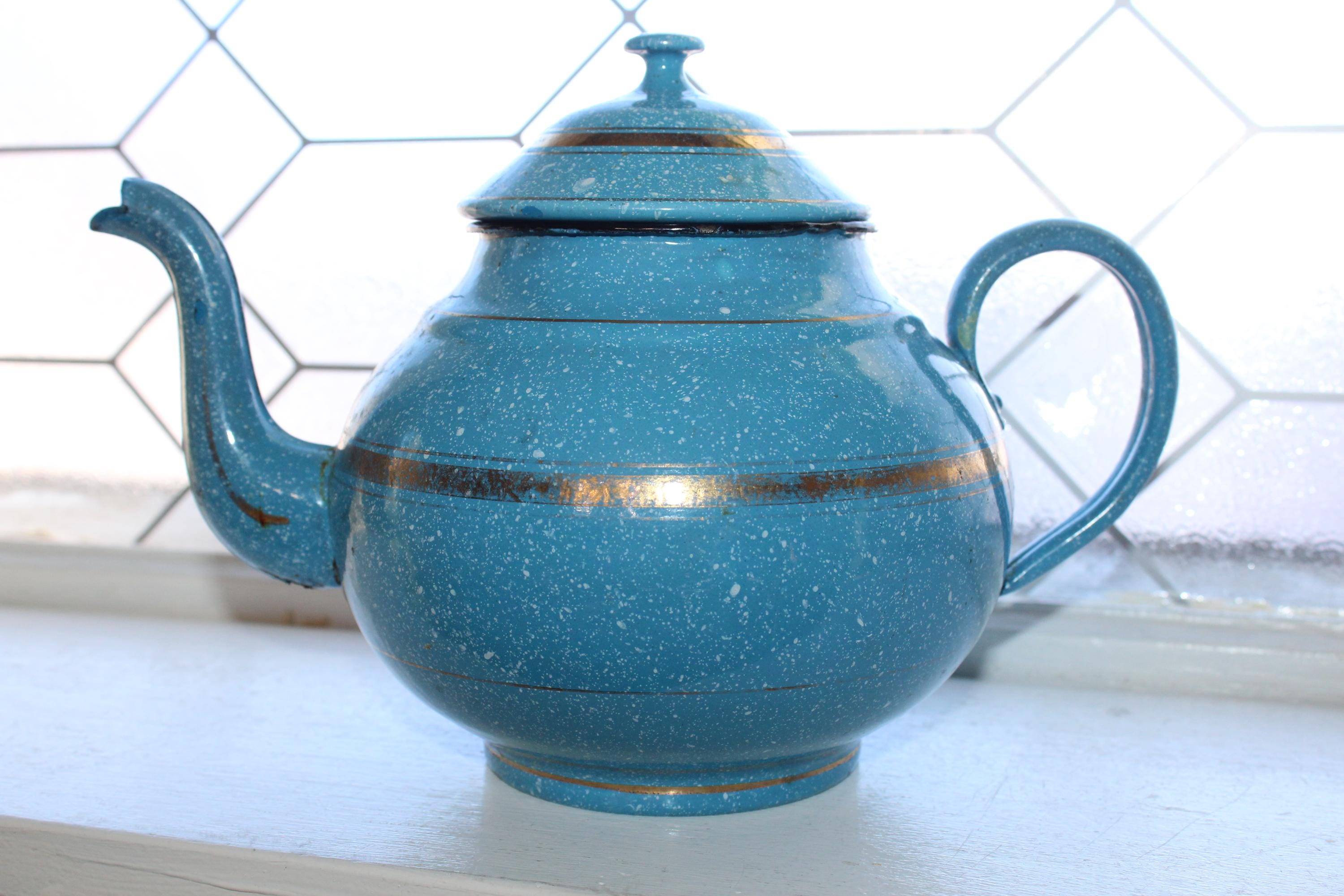 Antique robin's egg blue speckled enamelware metal teapot with gold trim, great for display in a country kitchen. This little charmer measures 10" from handle to spout and 7" high. It has some wear as shown in the photos but displays very well. Enjoy!