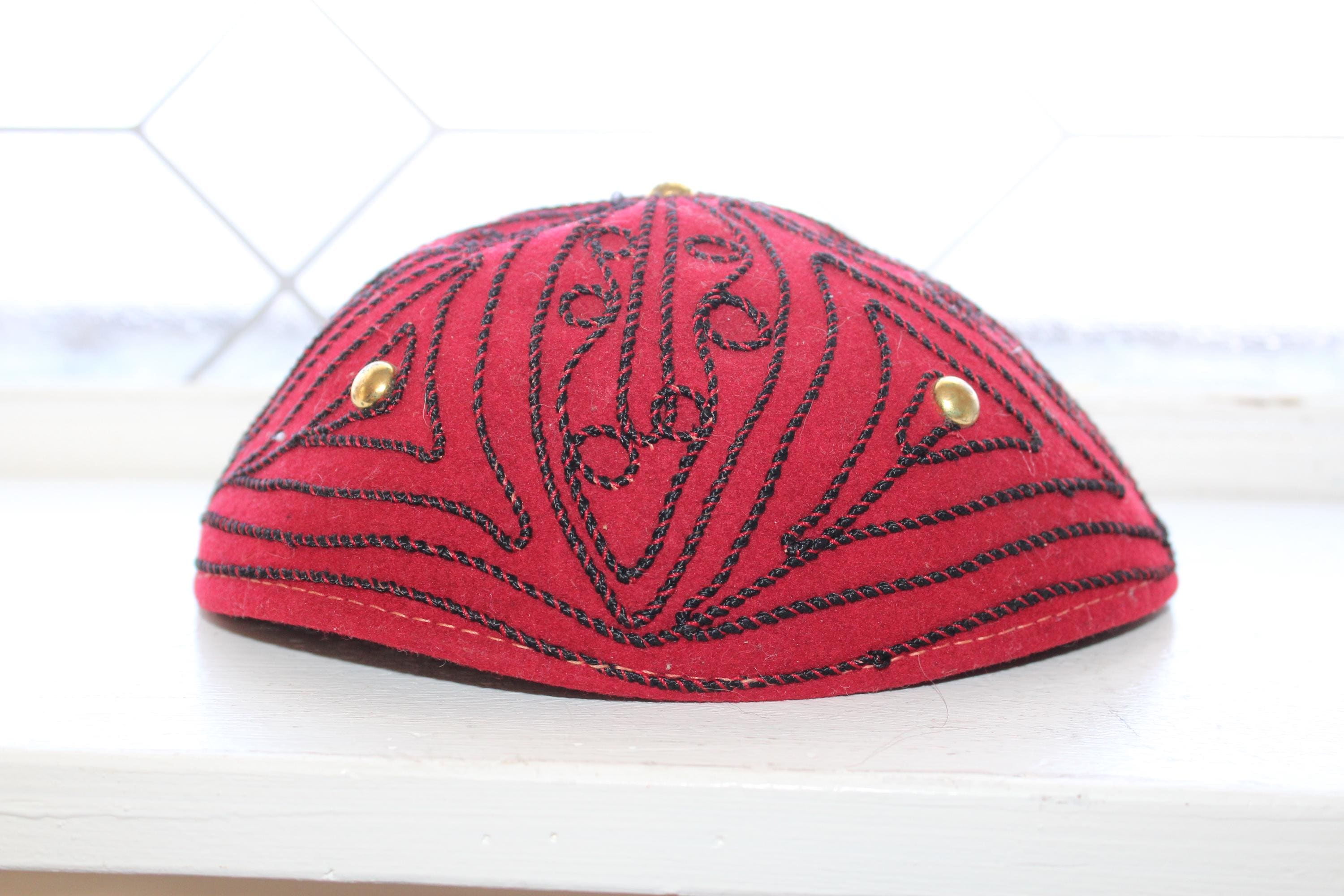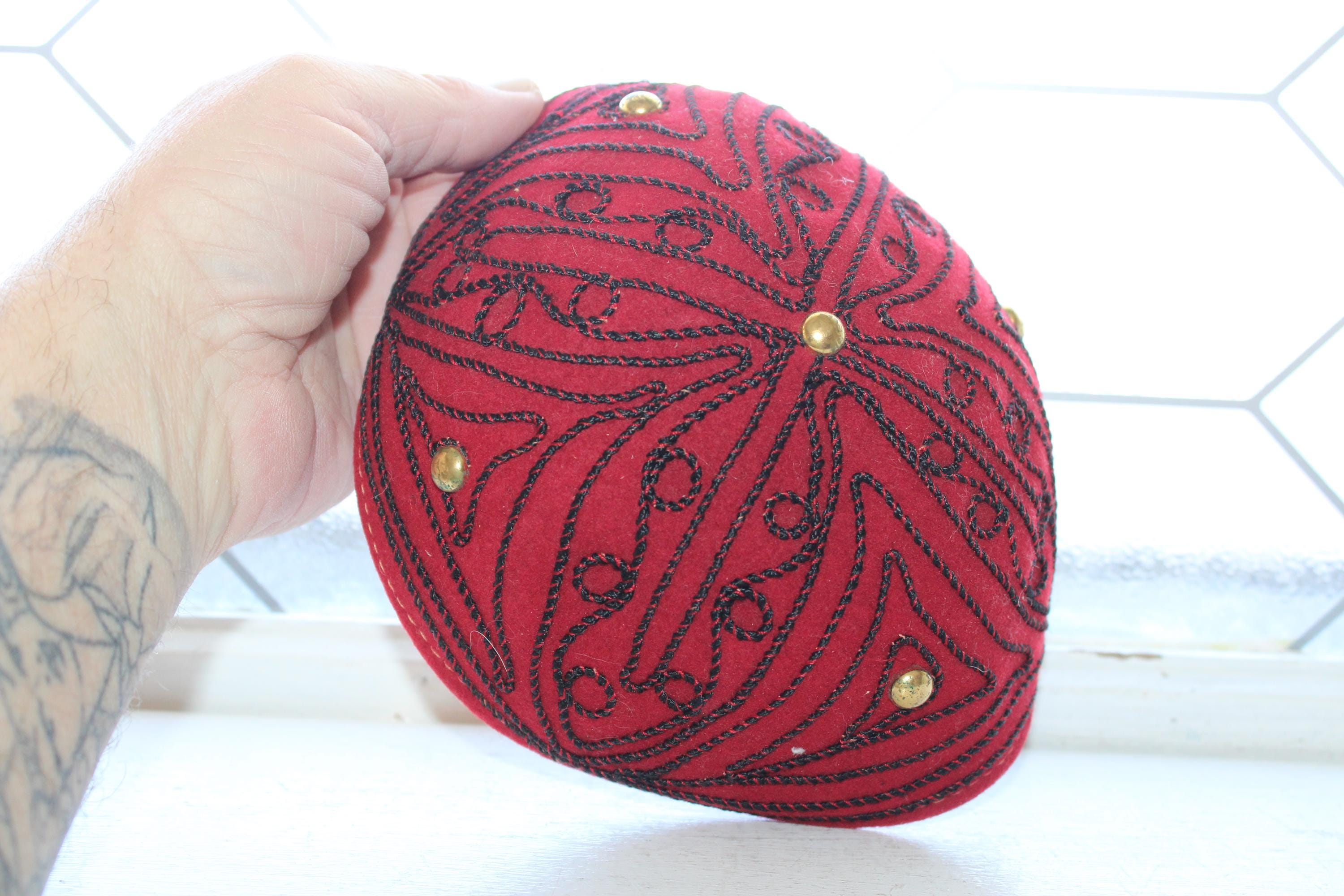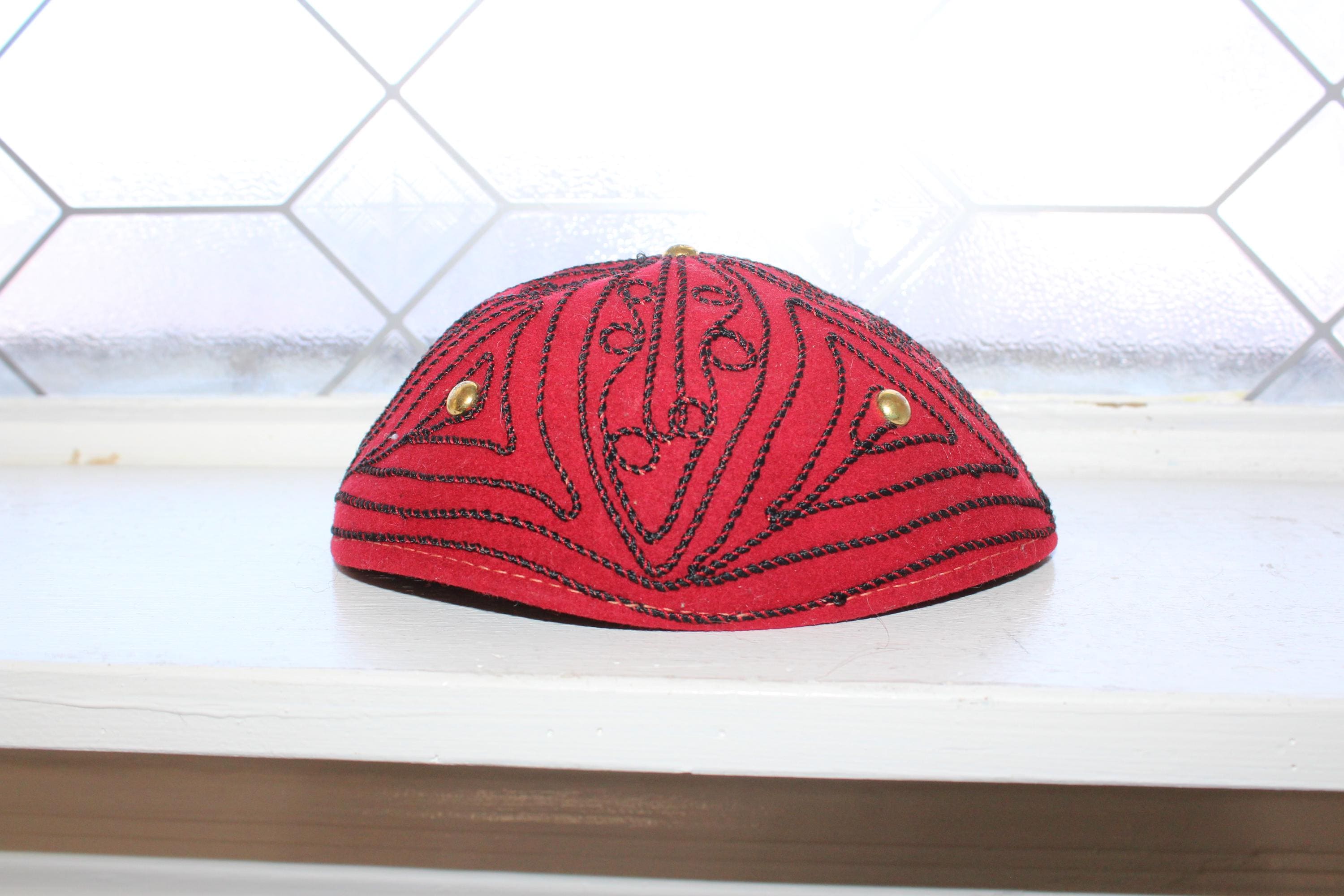 Vintage Henry Pollack wool hat with red and black embroidered design, in very good condition. The hat measures 7 1/2" x 6". I do not know the size. Enjoy!
