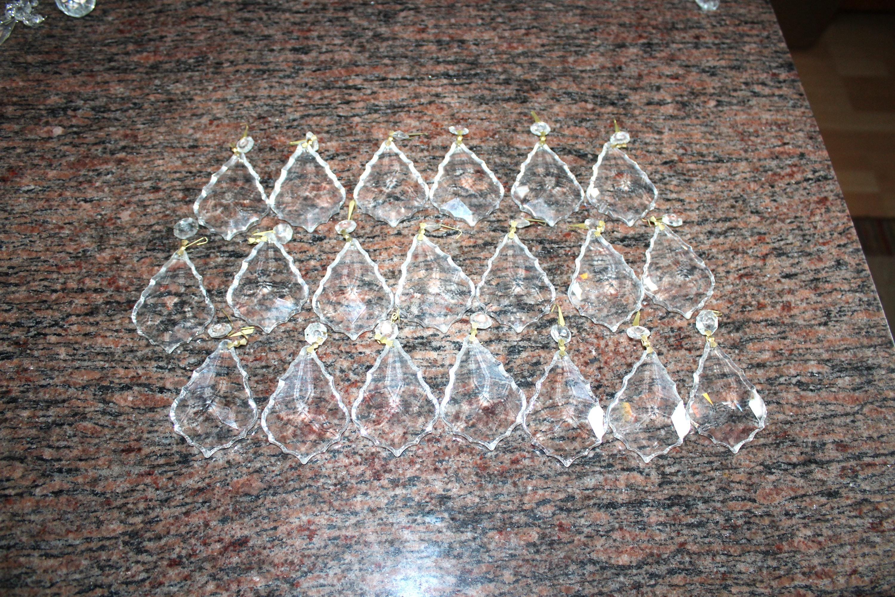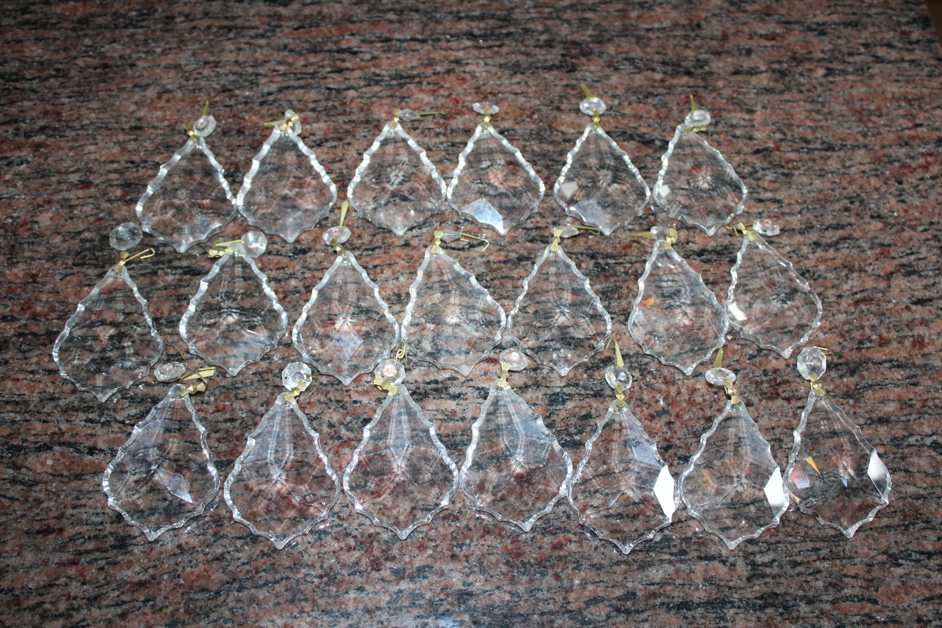 This is a collection of 20 of large antique Victorian faceted French cut pendalogue crystal prisms, in excellent condition. They are quite ornate and measure 3" long not including the smaller attached crystals. Enjoy!