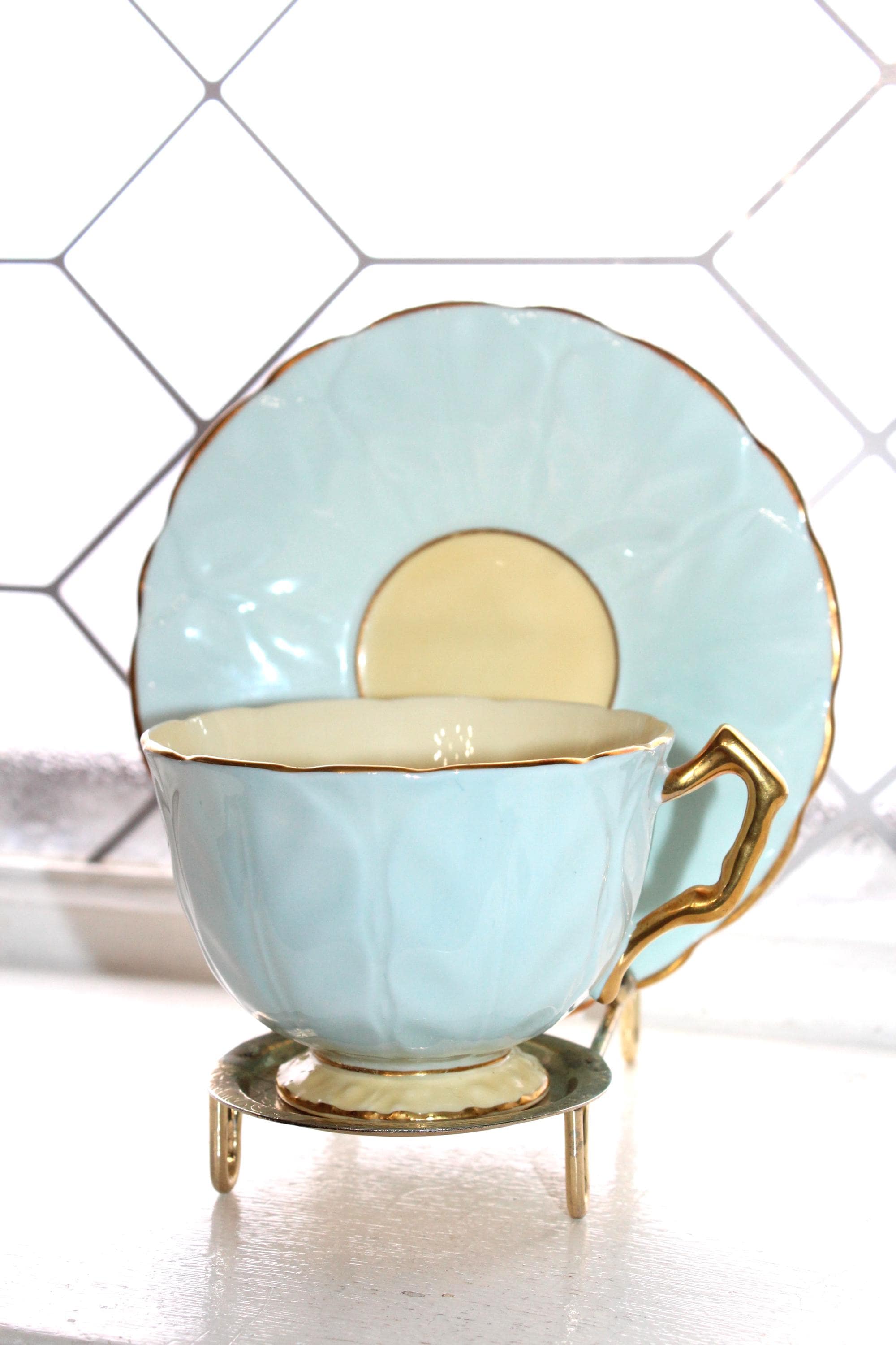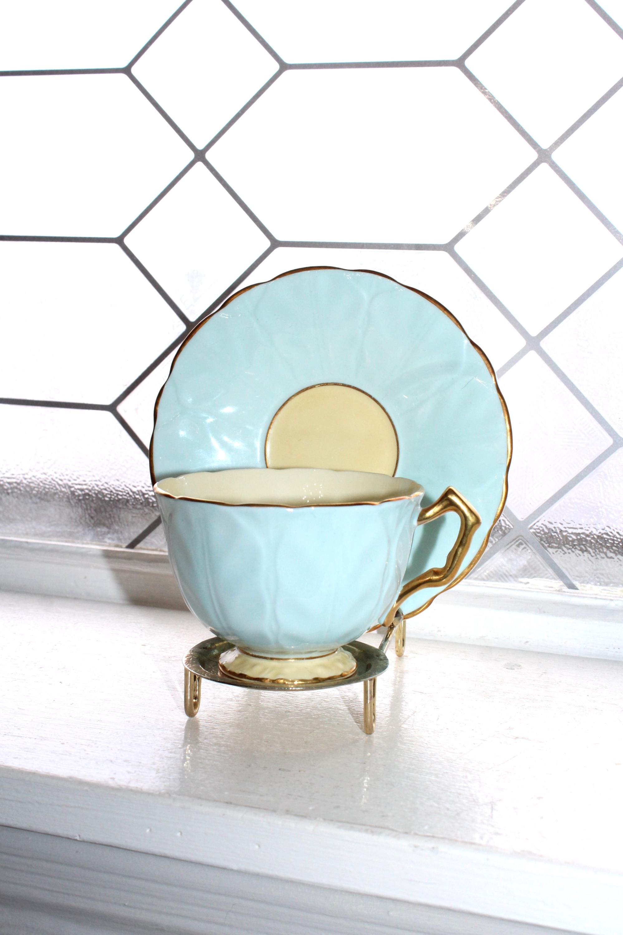 Vintage Aynsley bone china pastel blue Oleander teacup and saucer with yellow interior. The cup measures 3 1/2" in diameter x 2 1/2" high, and the saucer measures 5 1/2" in diameter. No chips or cracks but there is some wear on the saucer, displays very well. Enjoy!