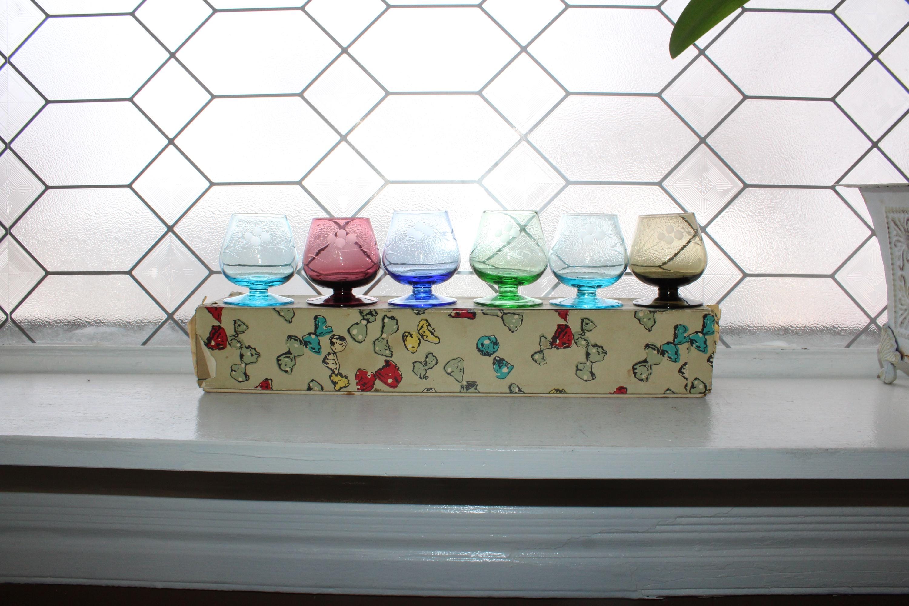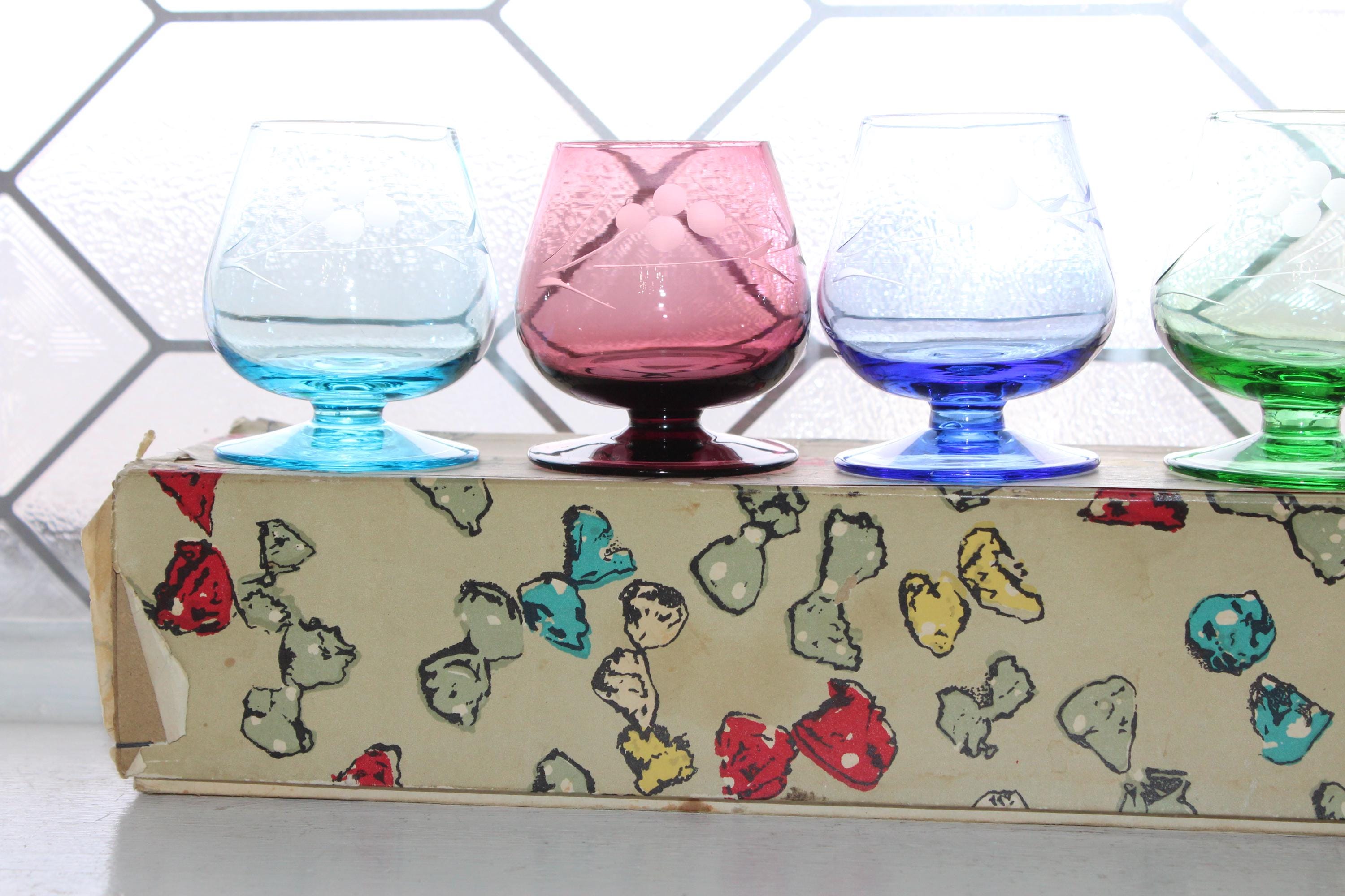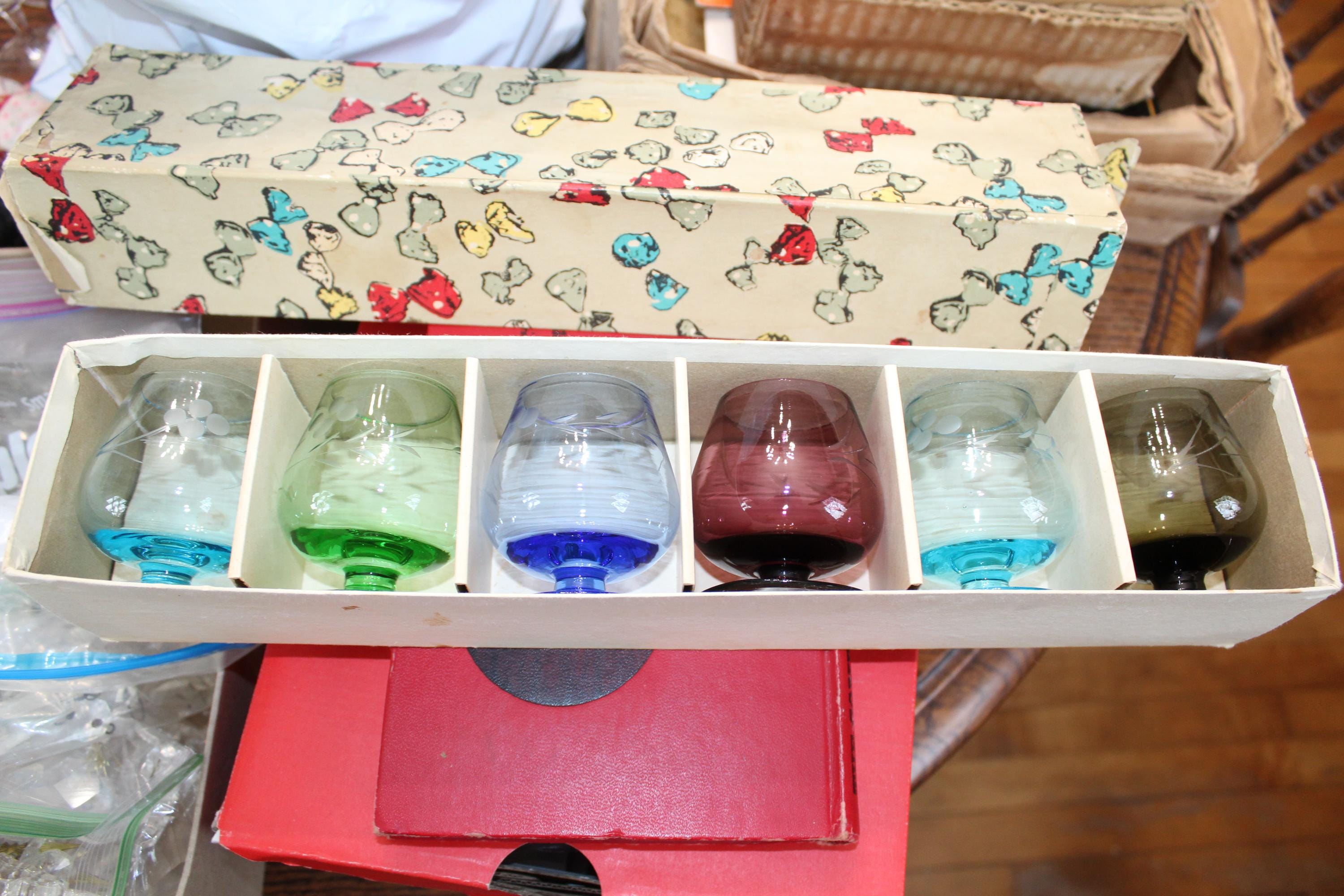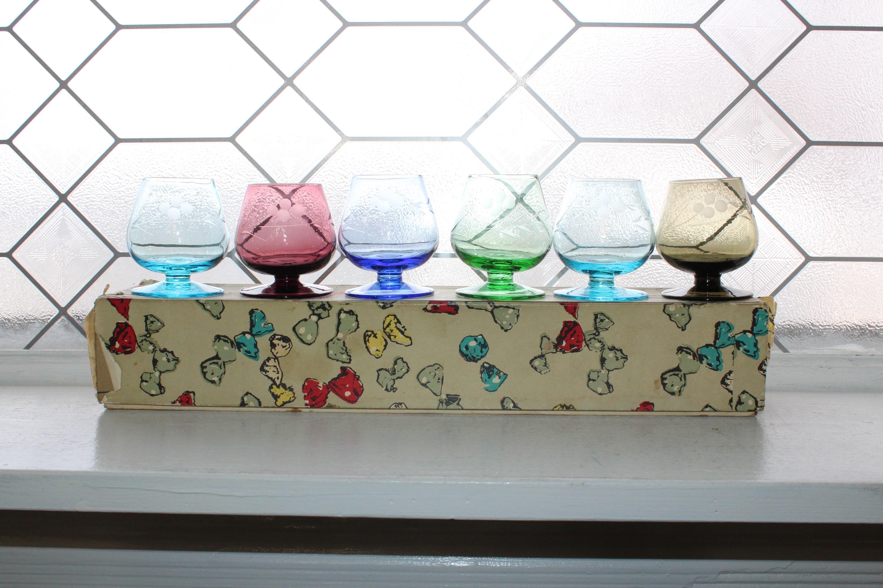 This is a gorgeous set of 6 vintage Mid Century liqueur or cordial glasses, multi colored with wheel cut decoration and original box. Each of the glasses measures 2 3/4" high. The green one has a crack, the rest are excellent and perfect for use or display. Enjoy!