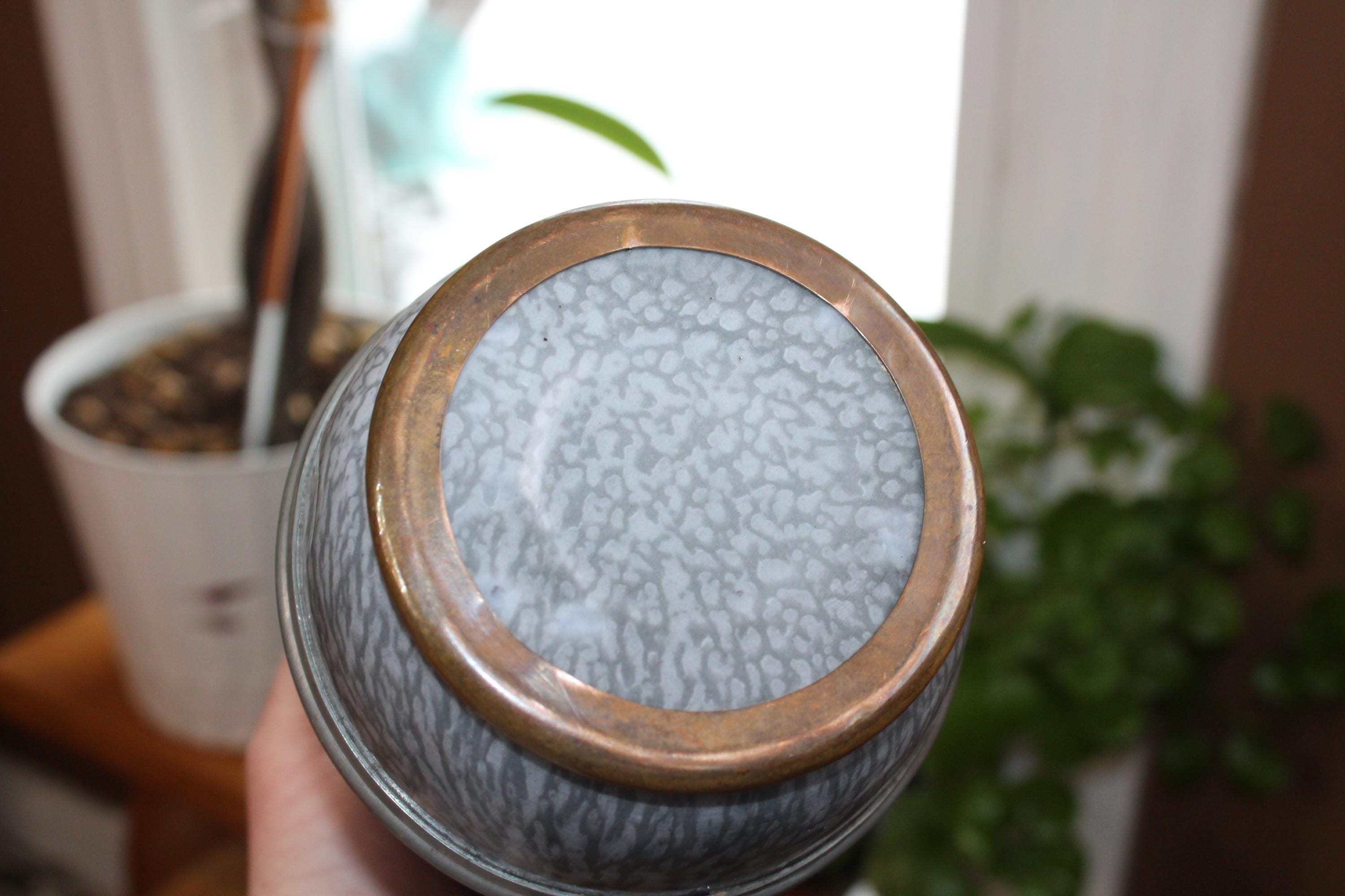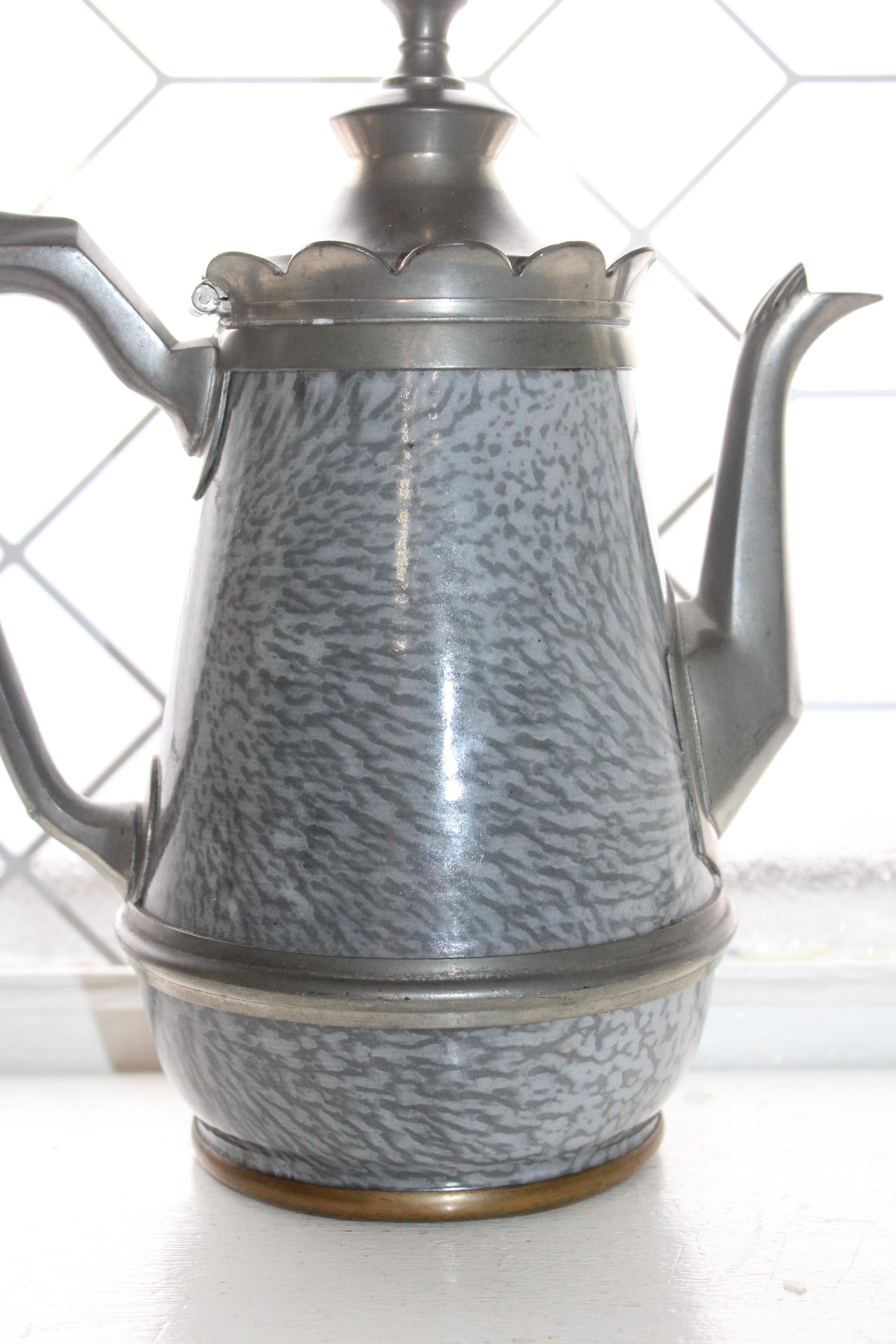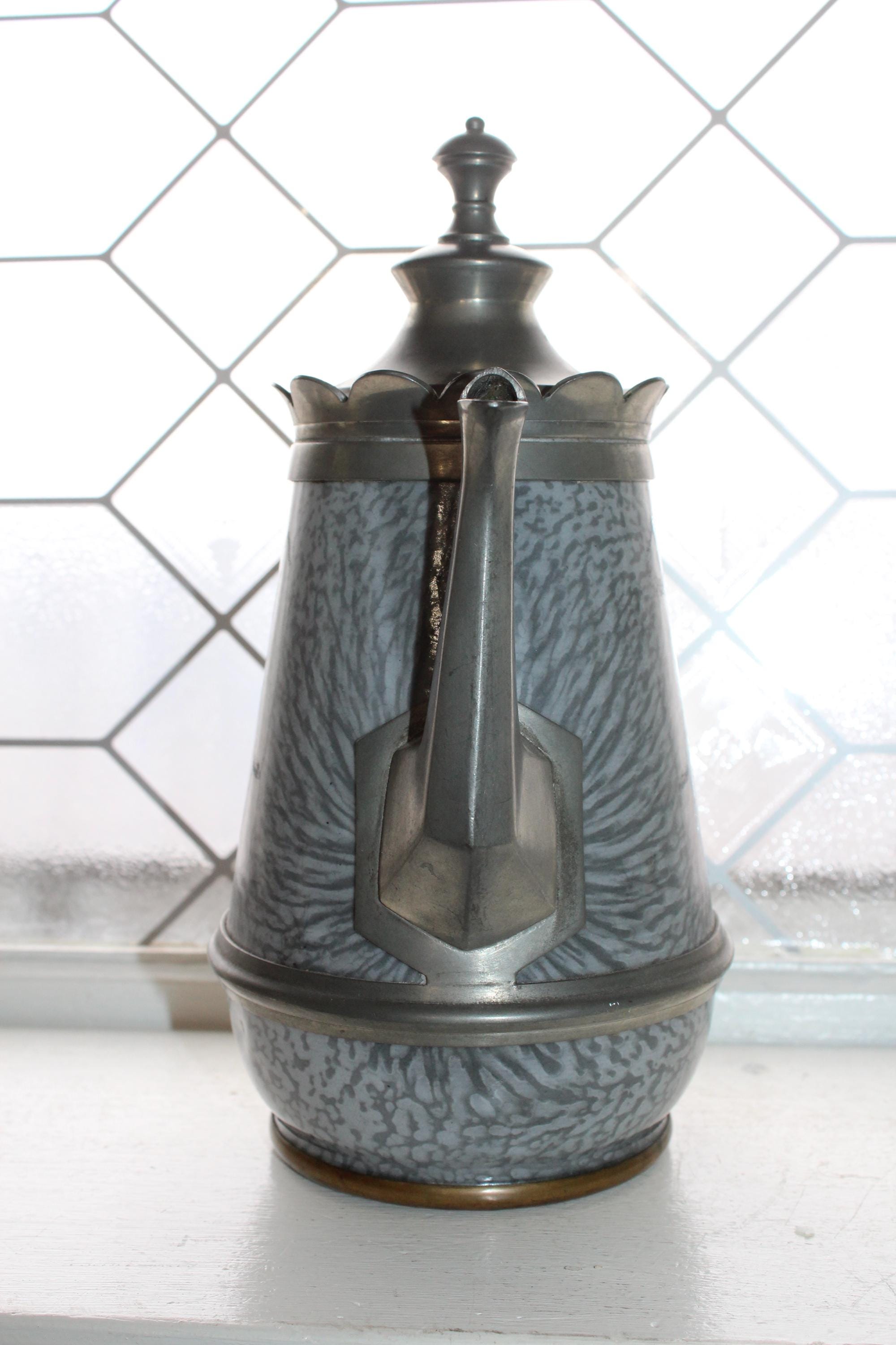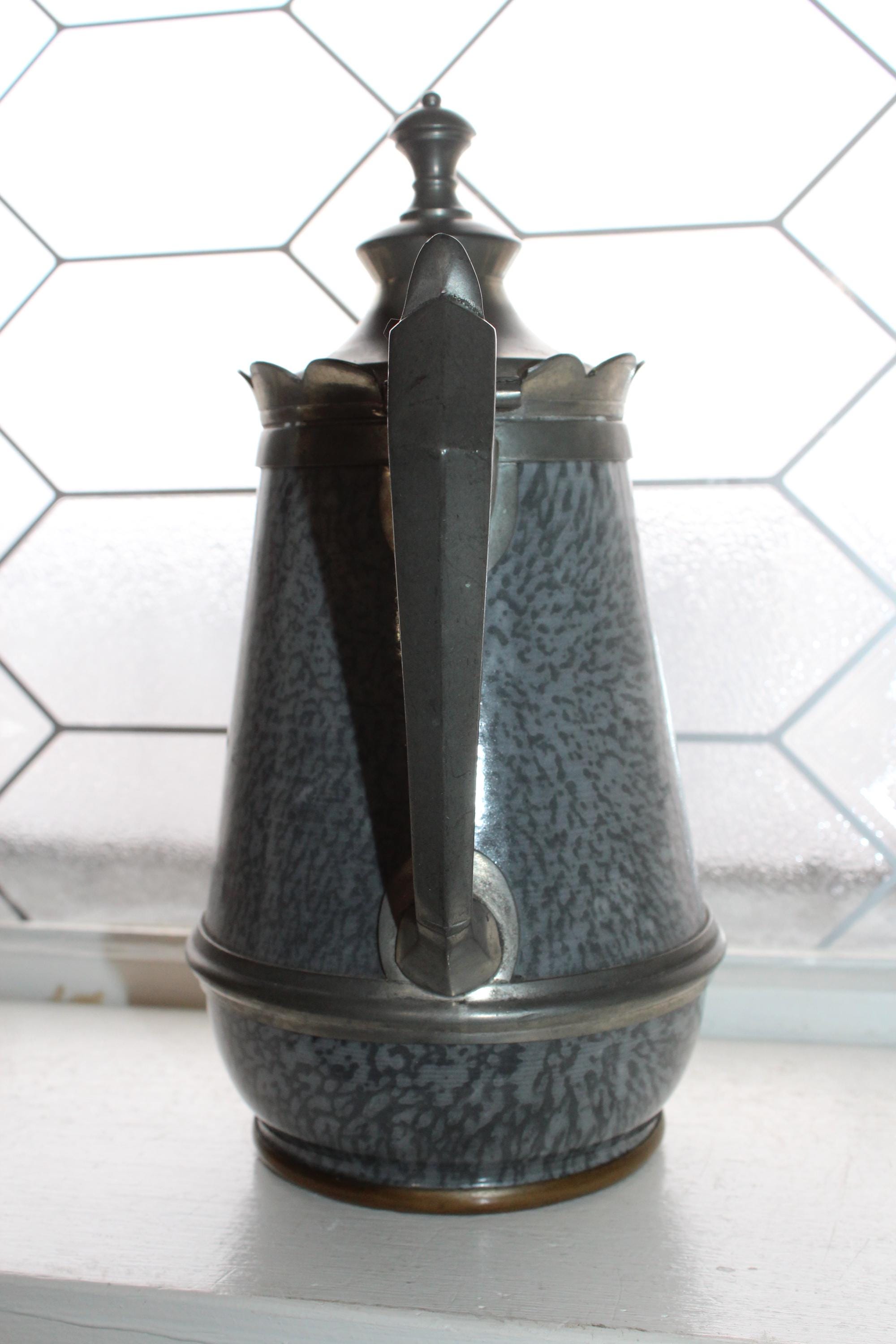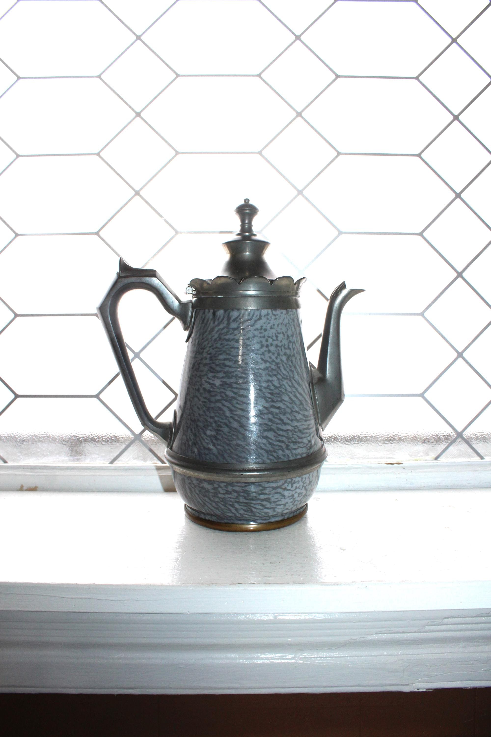This is an antique Victorian gray graniteware and pewter goose neck coffee pot. It measures 9 3/4" high and is a perfect addition to a country home. It displays very well, condition as shown in the photos. Enjoy!