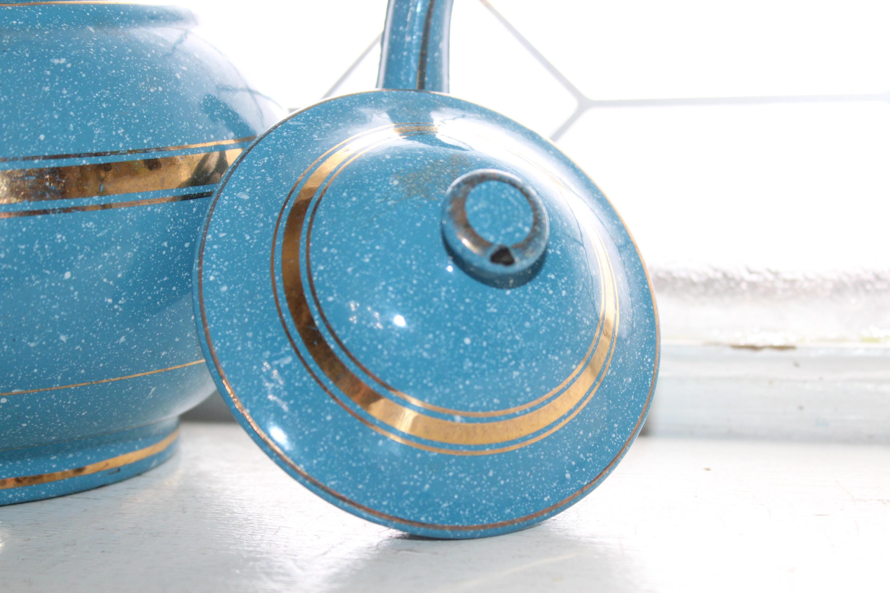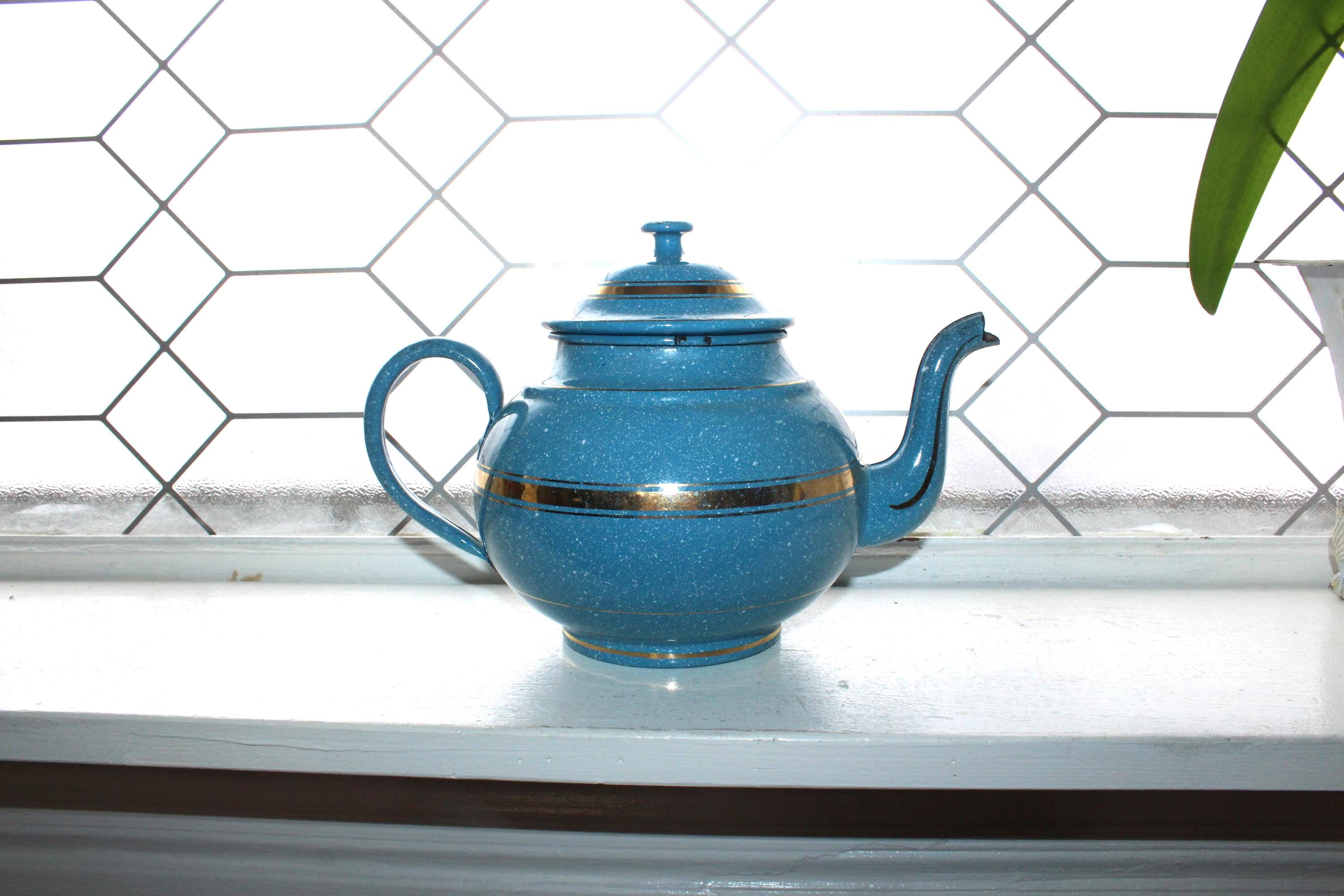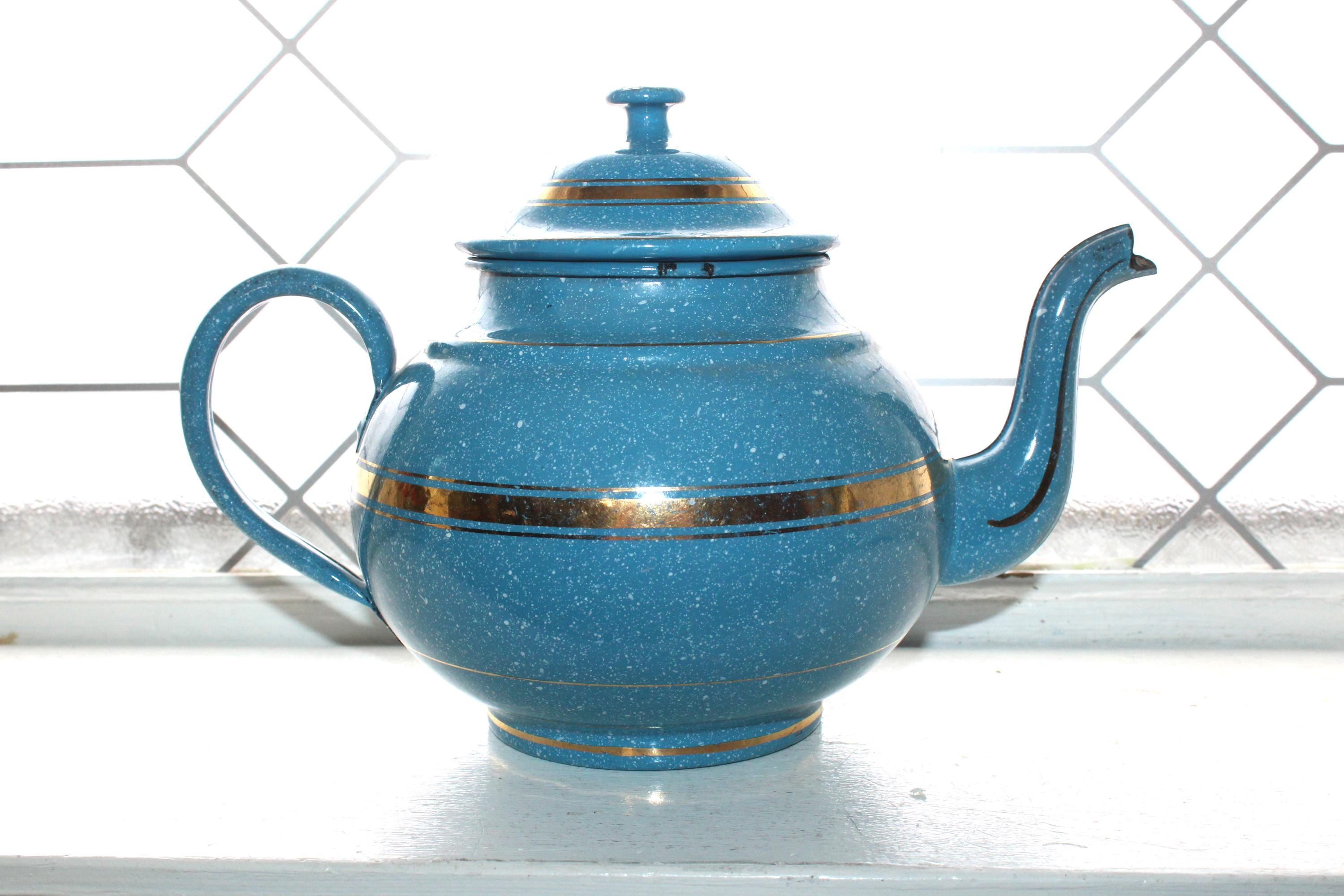 Antique robin's egg blue speckled enamelware metal teapot with gold trim, great for display in a country kitchen. This little charmer measures 10" from handle to spout and 7" high. It has some wear as shown in the photos but displays very well. Enjoy!